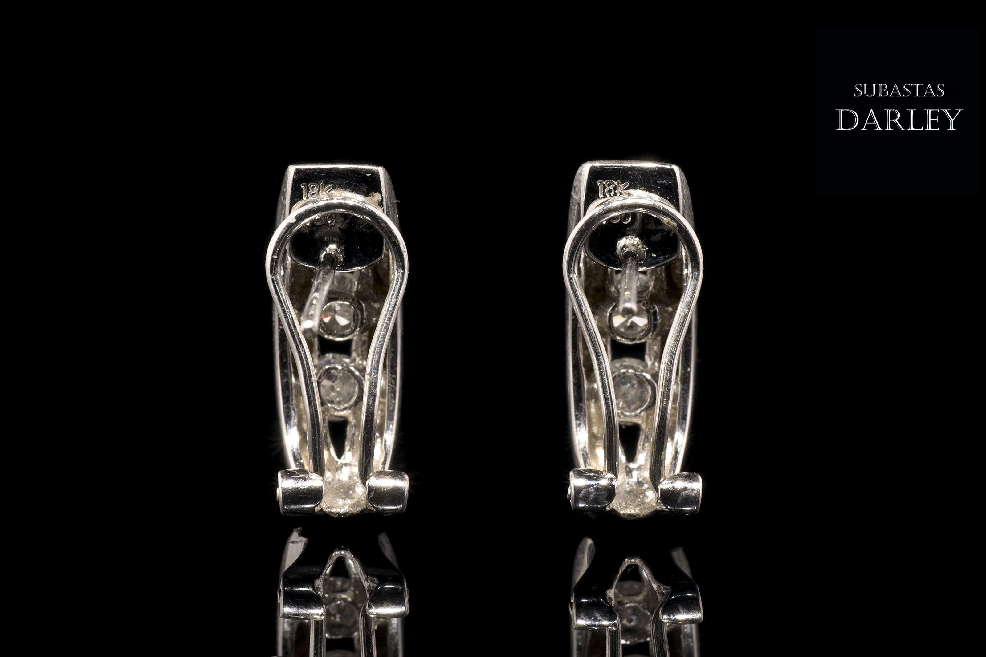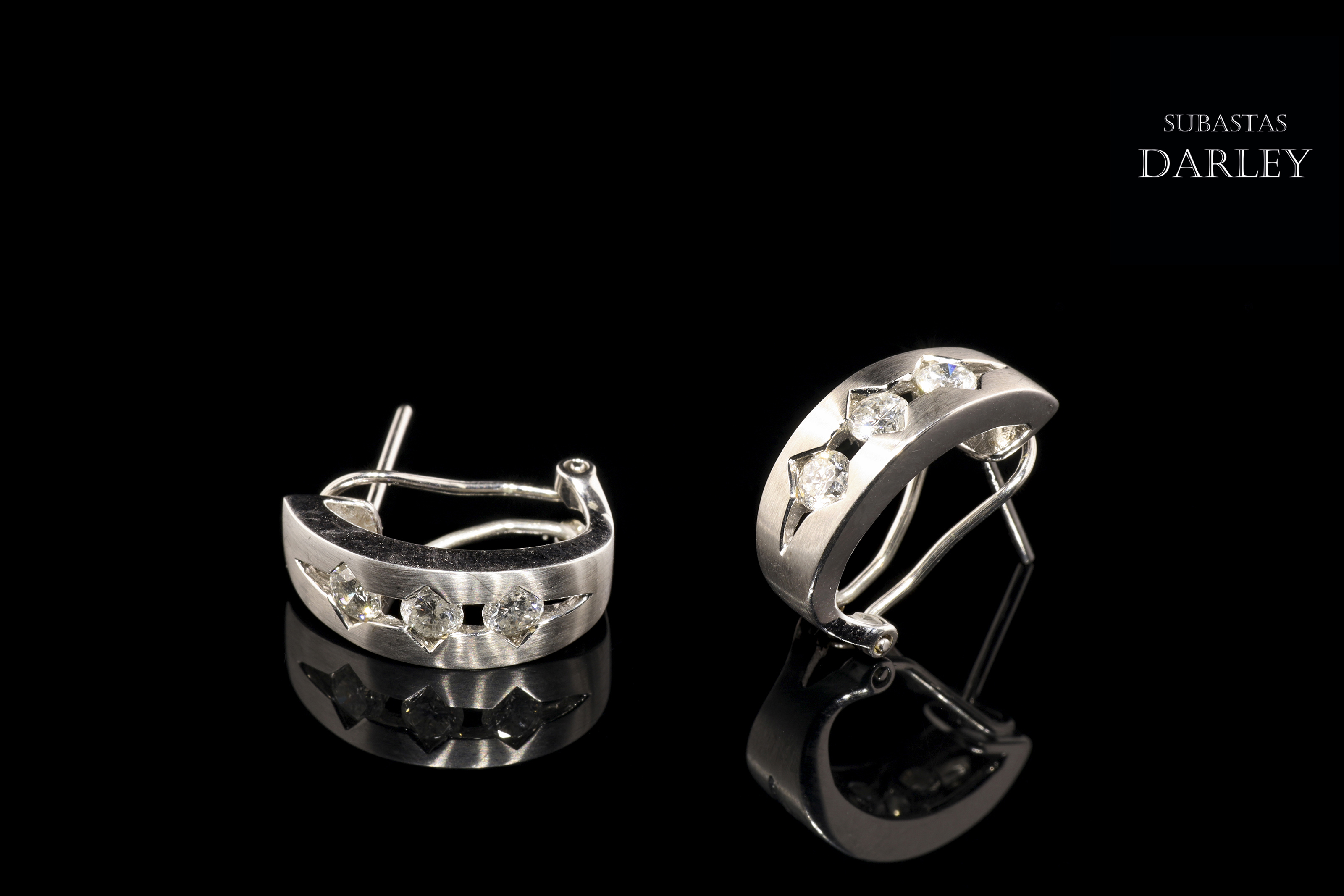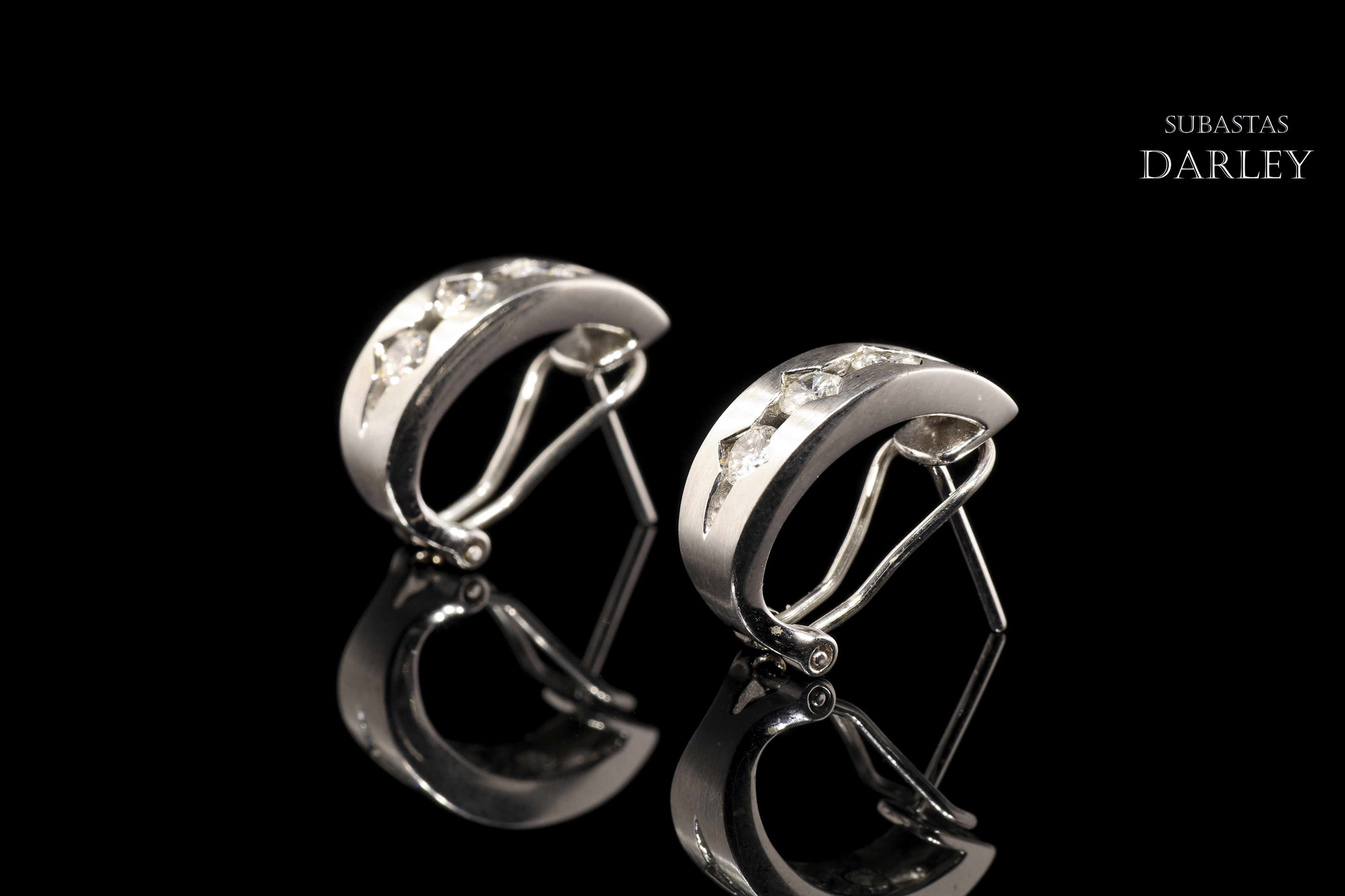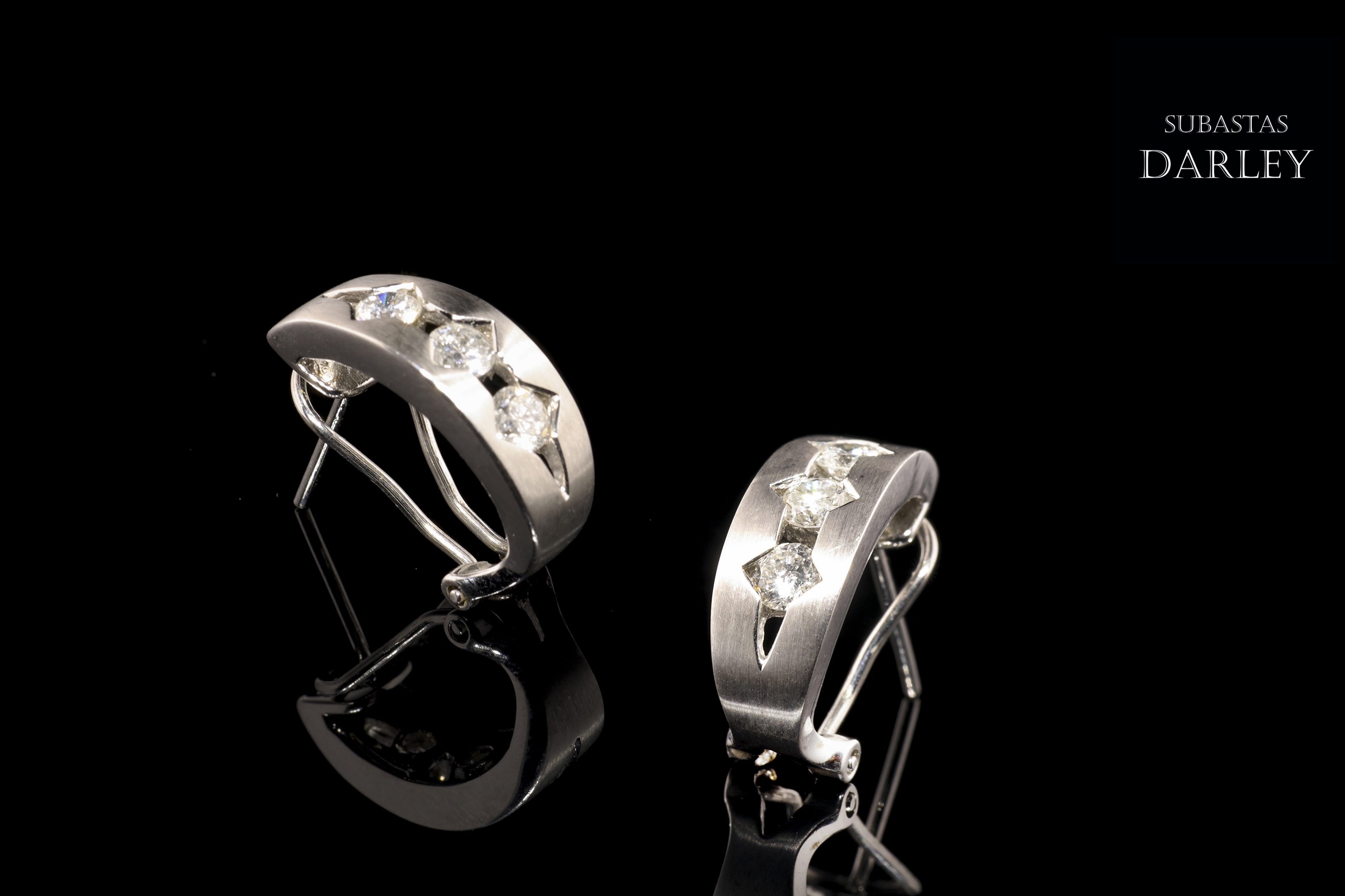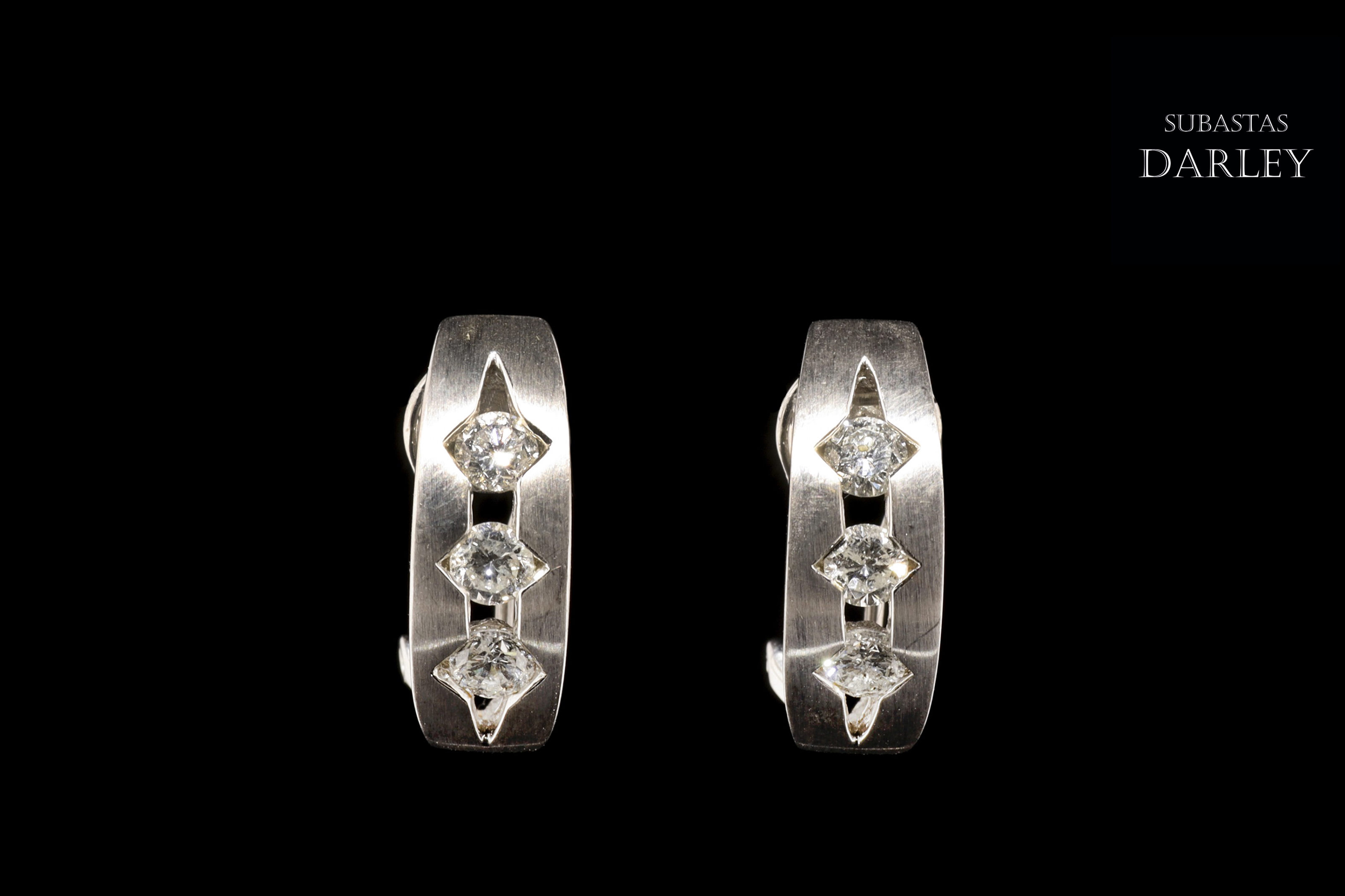 Modelo de oro blanco de 18k con frontis acriollado matizado que presenta un carril central con tres aperturas de estrella en cuyo interior se dispone un diamante, talla brillante, color H y calidad SI, siendo 6 en total, con un peso de 0,90 ct. Cierre de pala Omega.