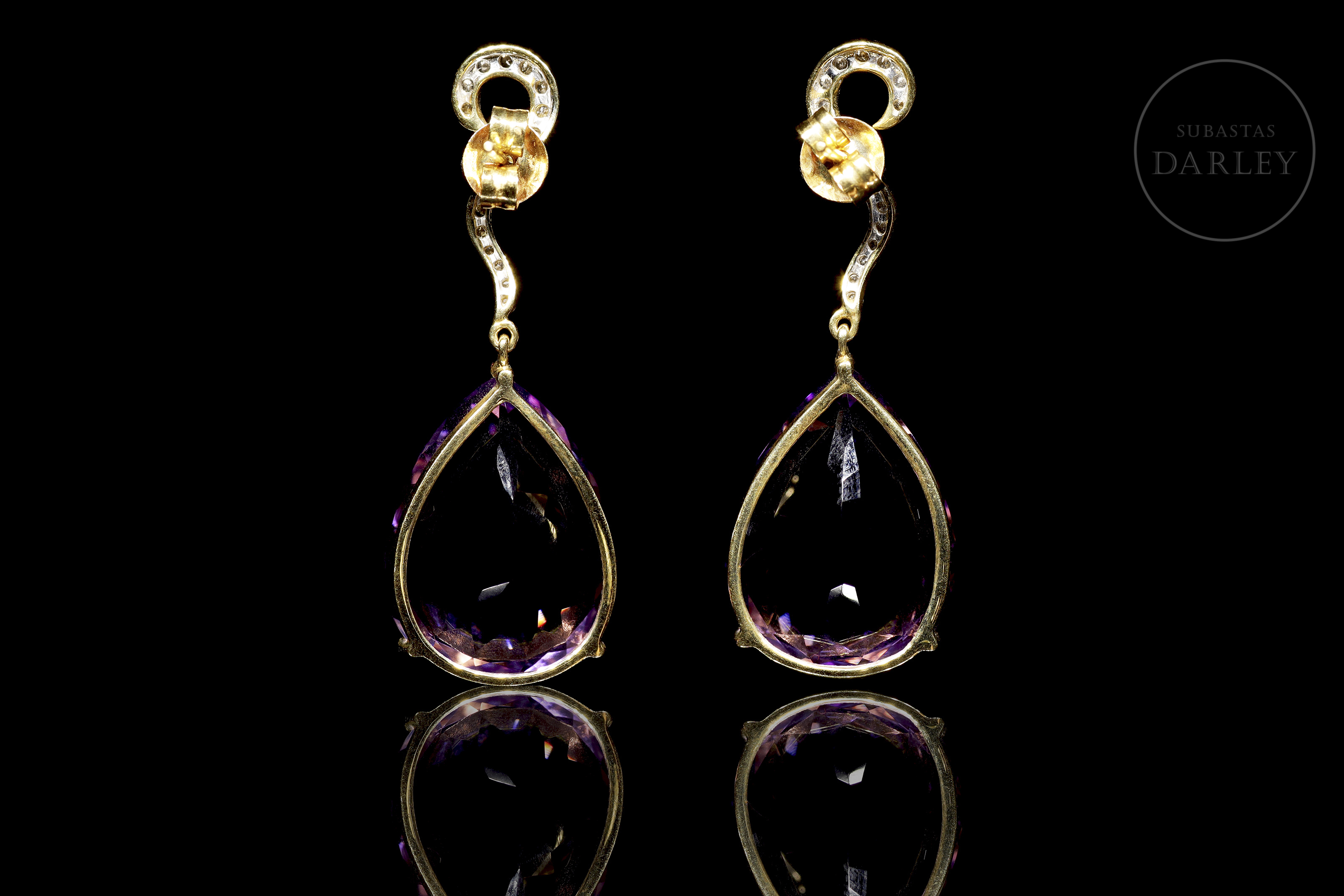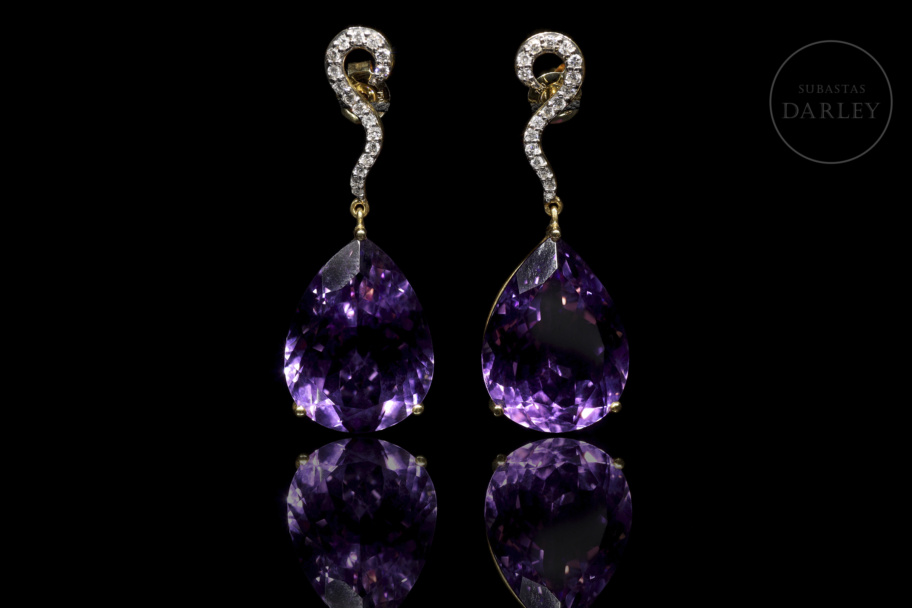 Pendientes largos en oro amarillo de 18k con motivo superior ondulado decorado con 34 diamantes talla brillante (0,35 ct en total). Suspenden amatistas talla pera, color violeta intenso, engarzadas “al aire”, con un peso total de 29,75 ct. Cierre de presión