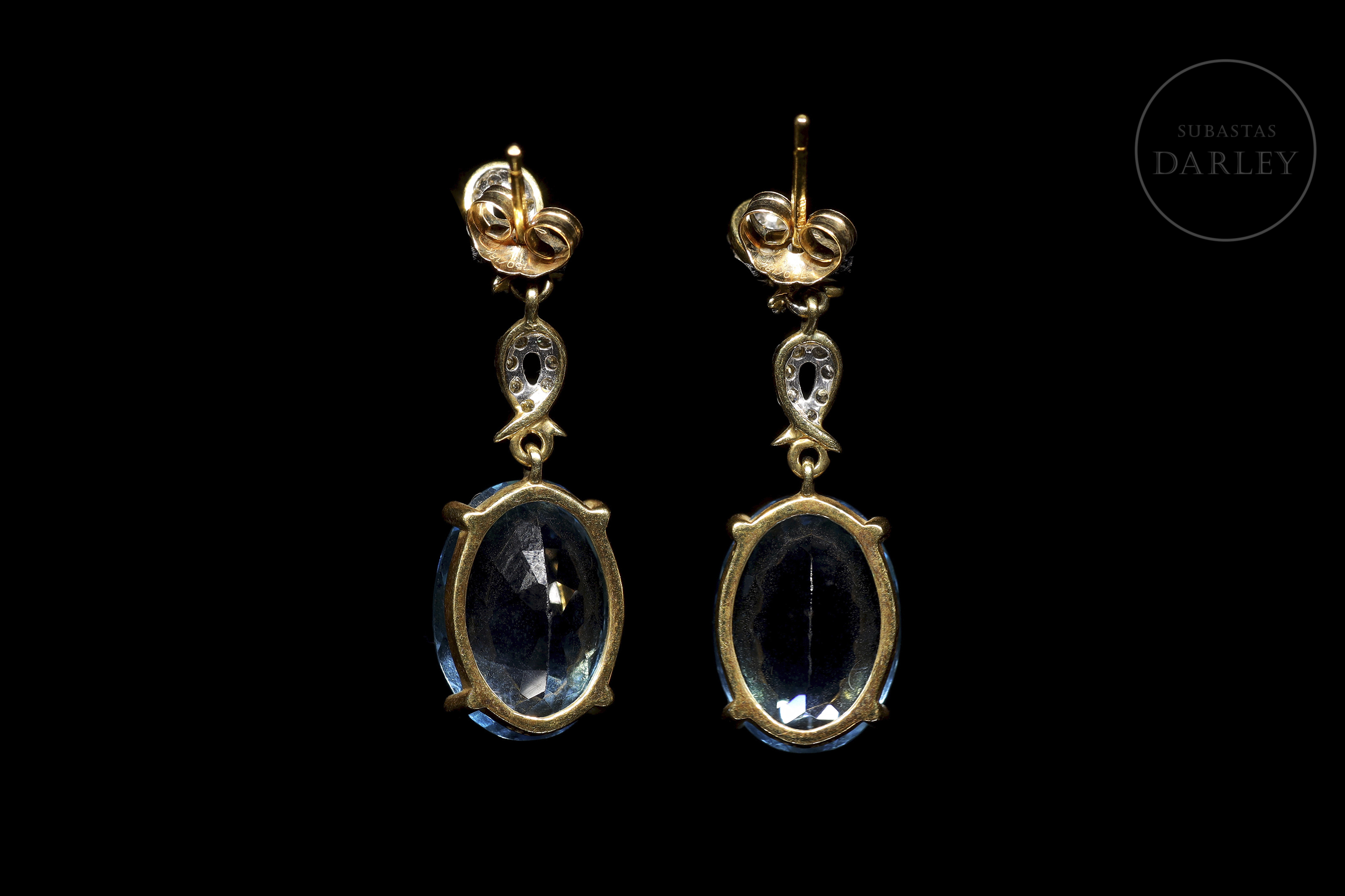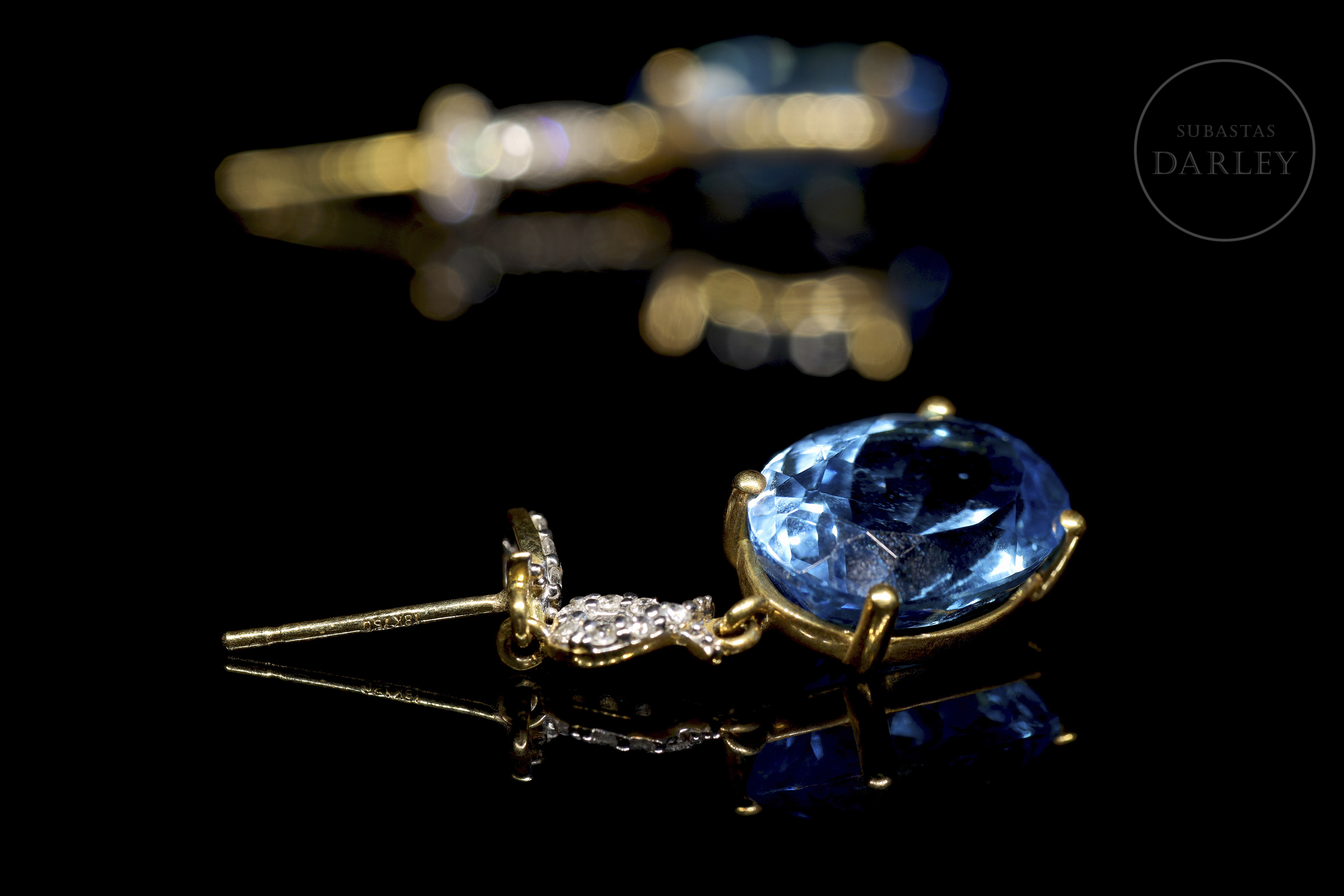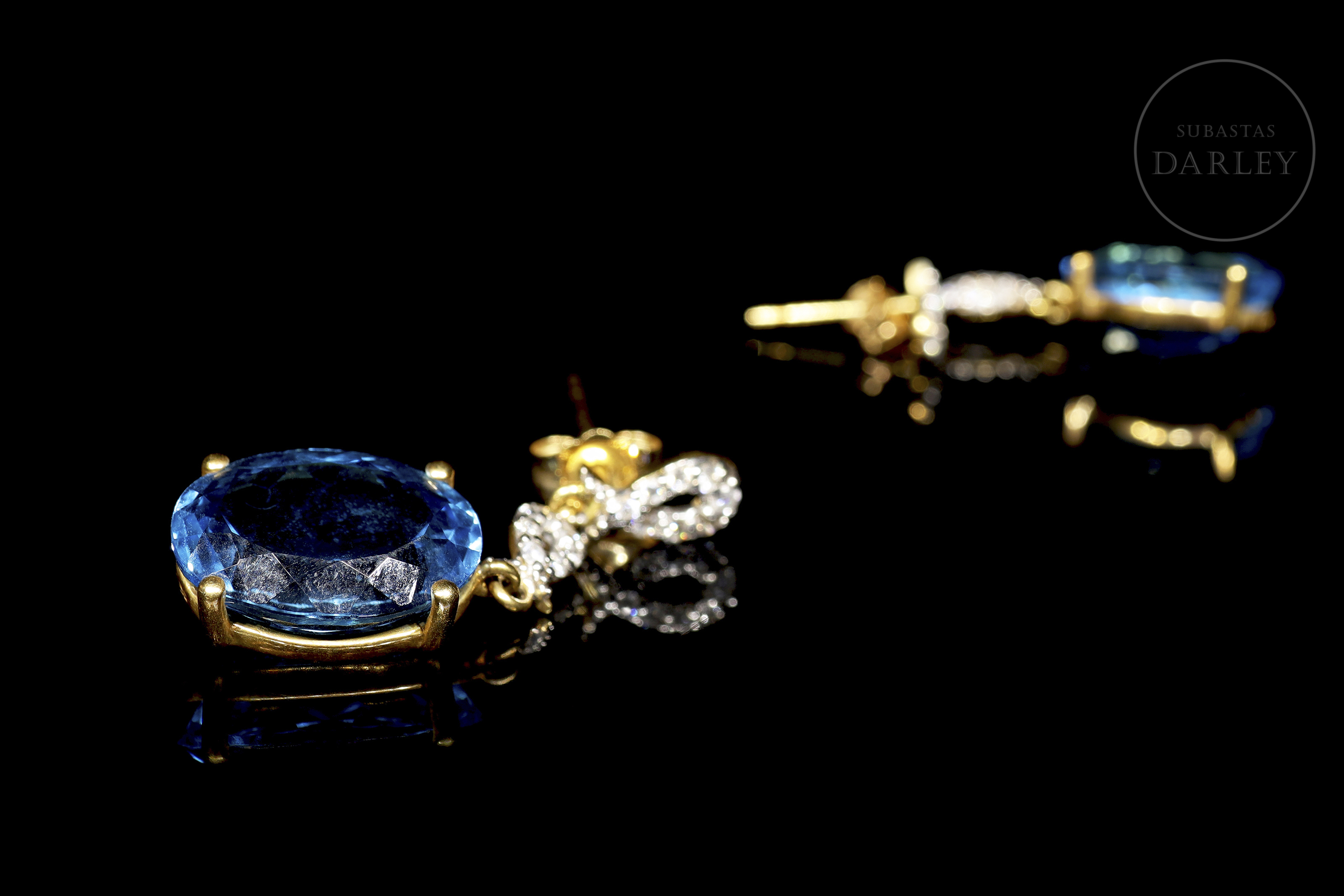 Oro amarillo de 18k con frontis en vista rodio y diamantes, de talla brillante, con un peso total de 0,26 ct. Modelo rematado con topacios de color azul, talla oval facetada, de peso total de 15,03 ct, que se engarzan "al aire" con cuatro garras rectas de punto. Cierre de presión.