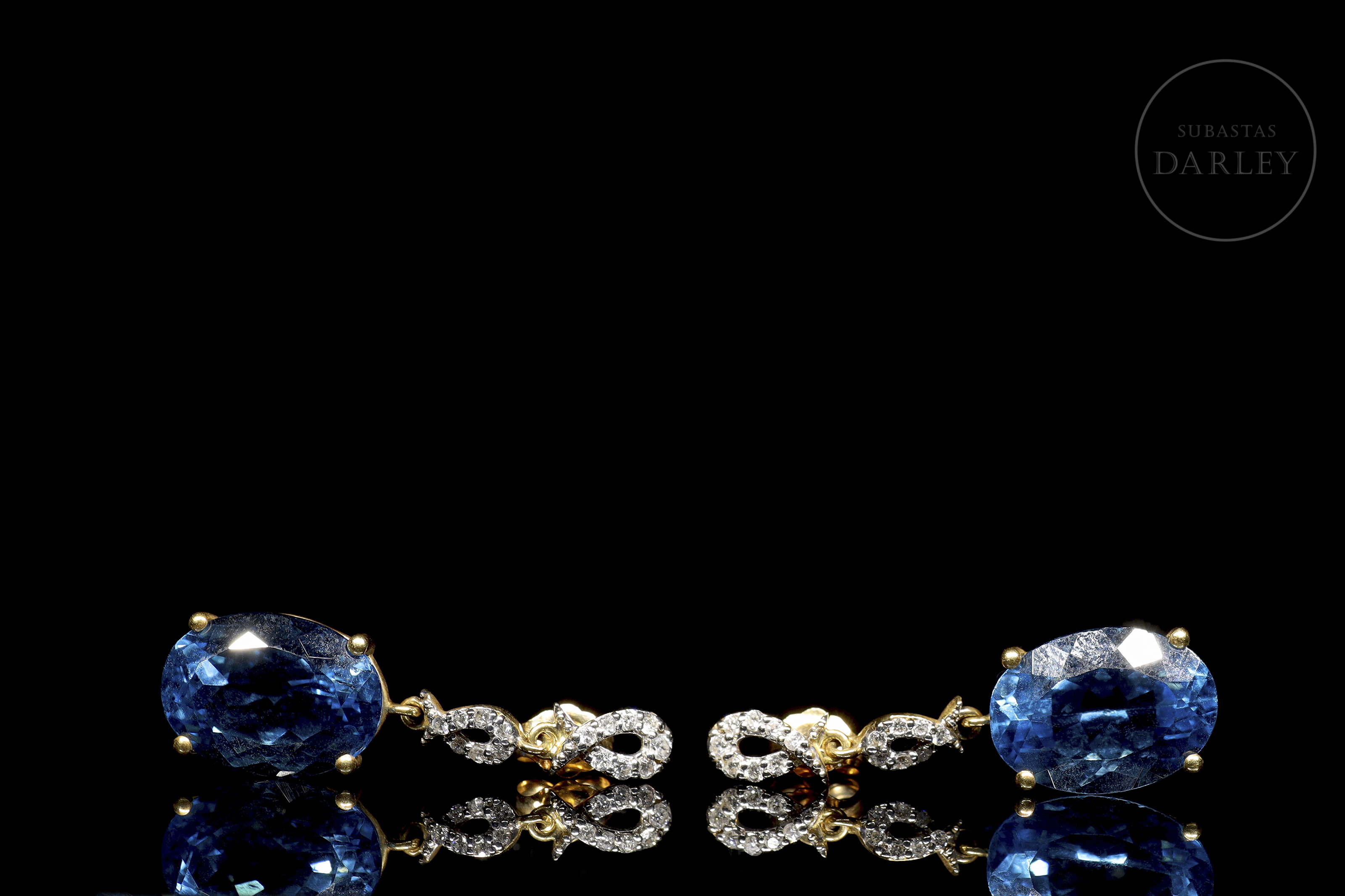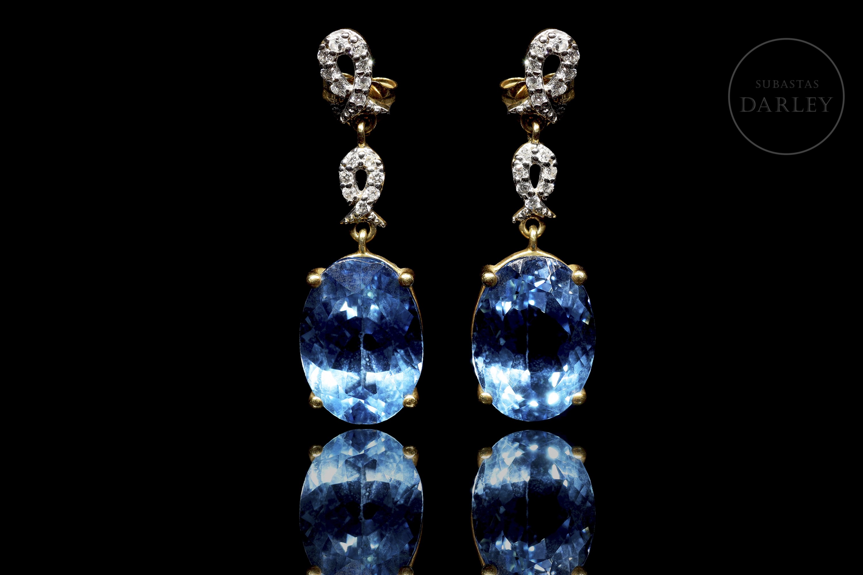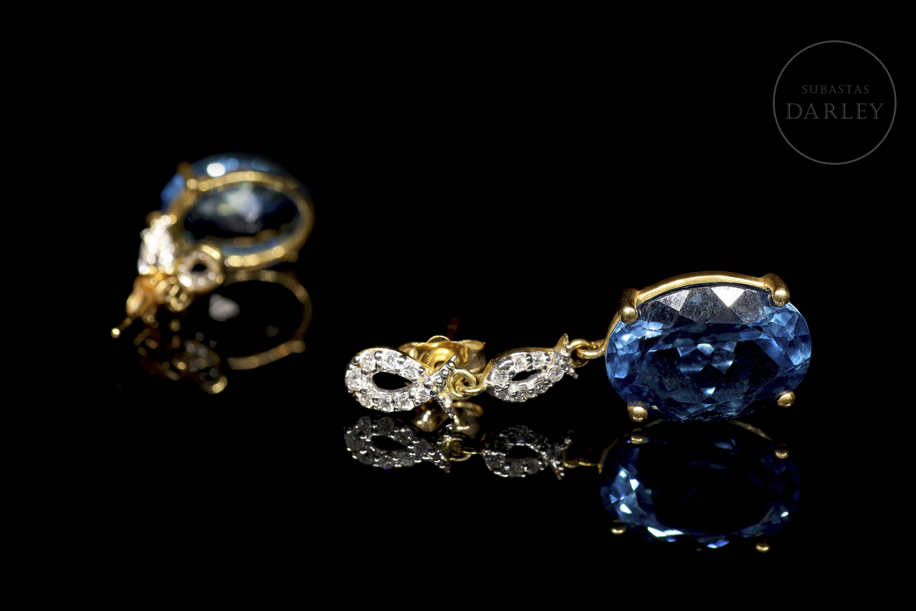Oro amarillo de 18k con frontis en vista rodio y diamantes, de talla brillante, con un peso total de 0,26 ct. Modelo rematado con topacios de color azul, talla oval facetada, de peso total de 15,03 ct, que se engarzan "al aire" con cuatro garras rectas de punto. Cierre de presión.