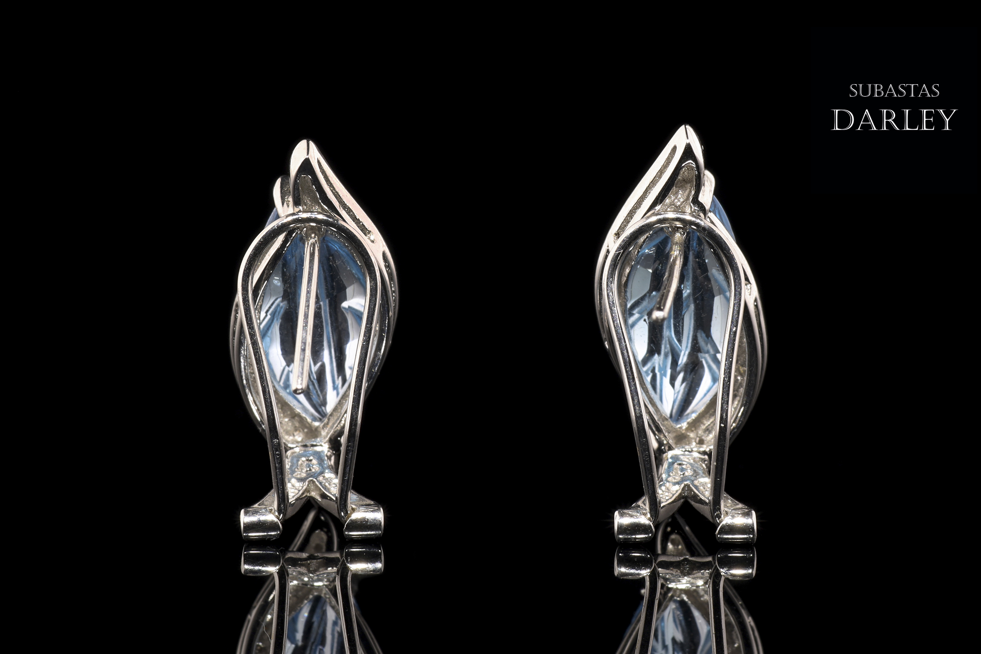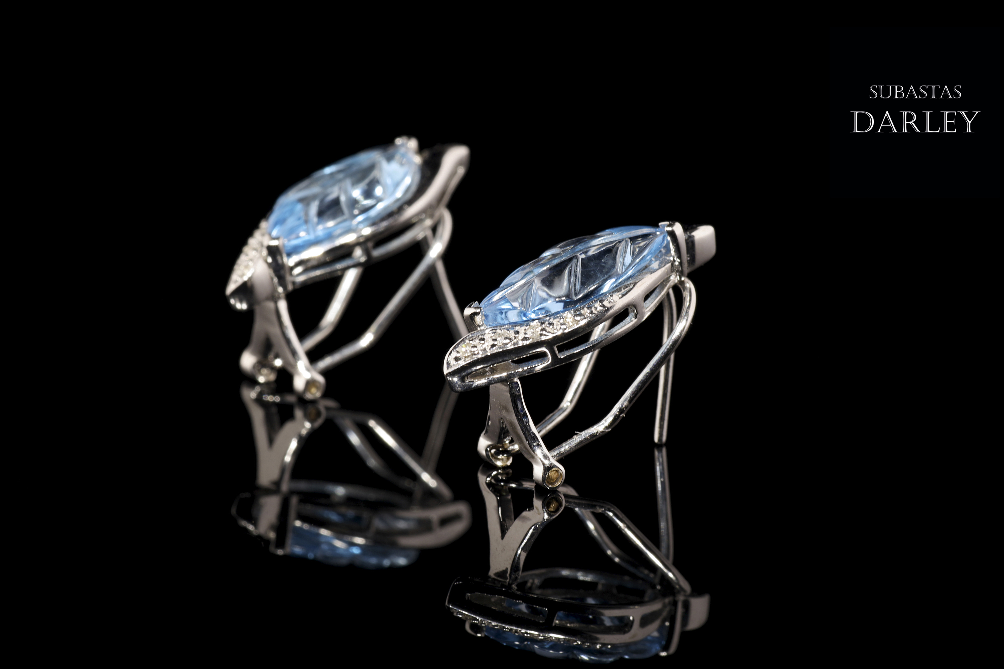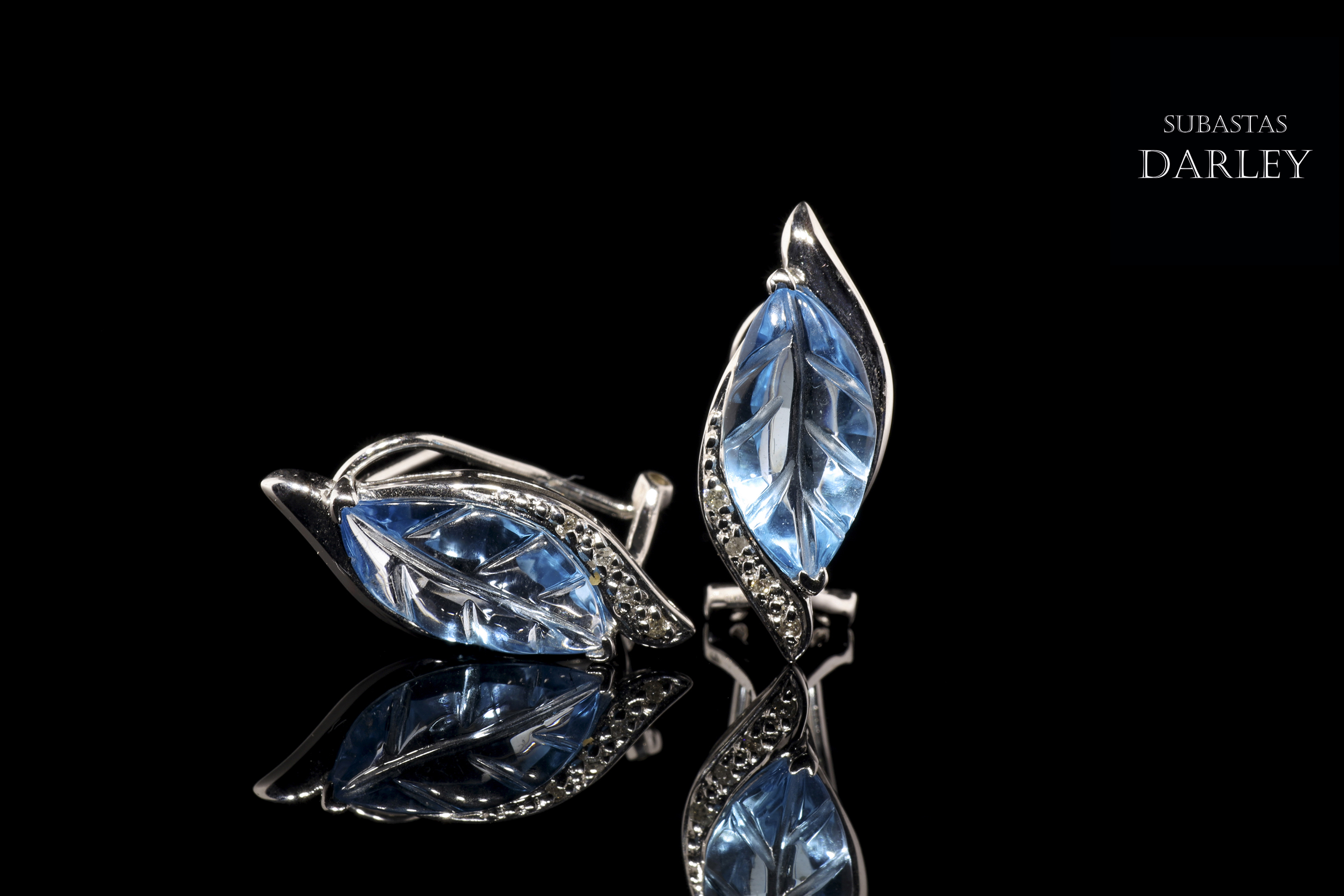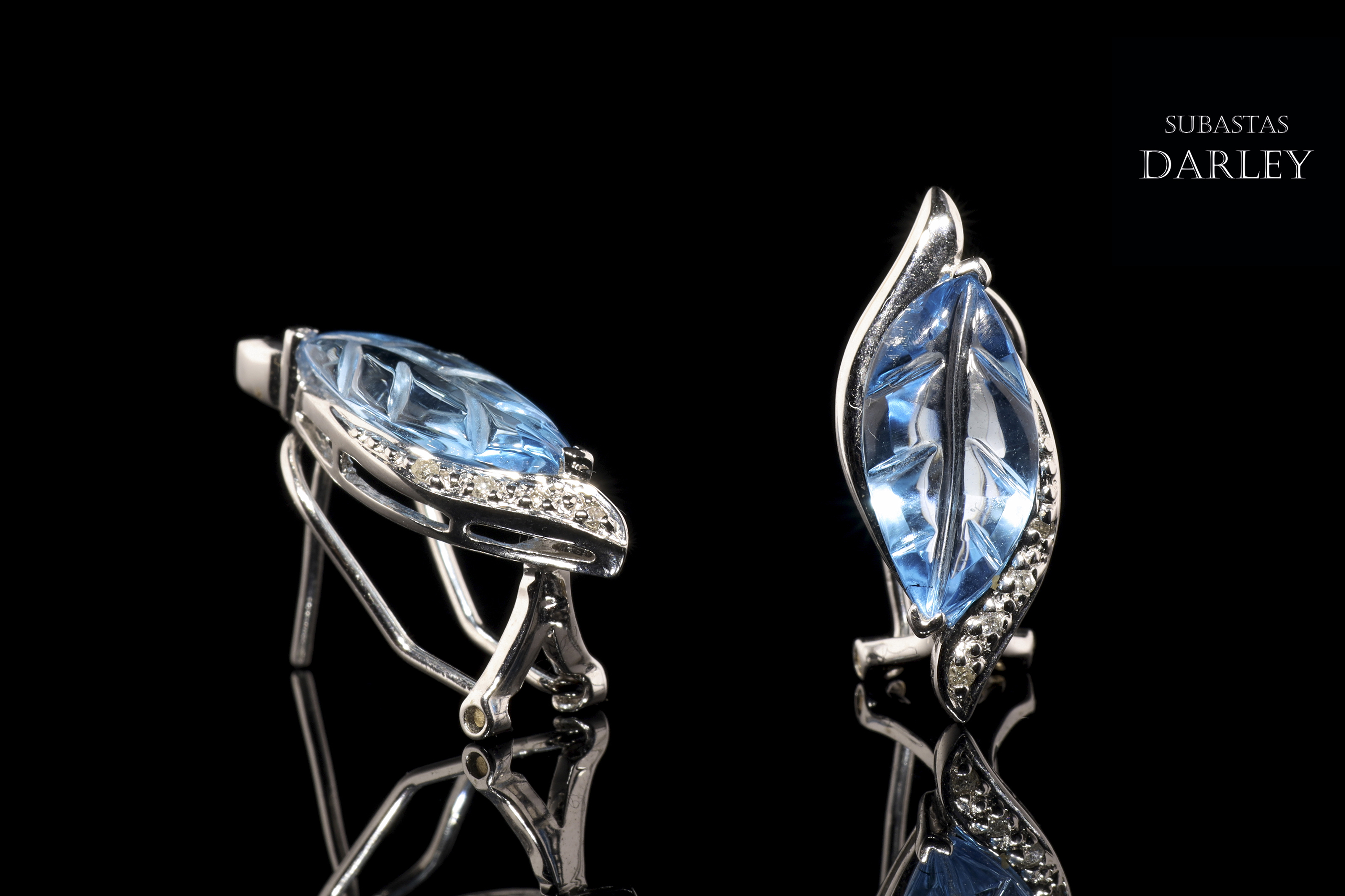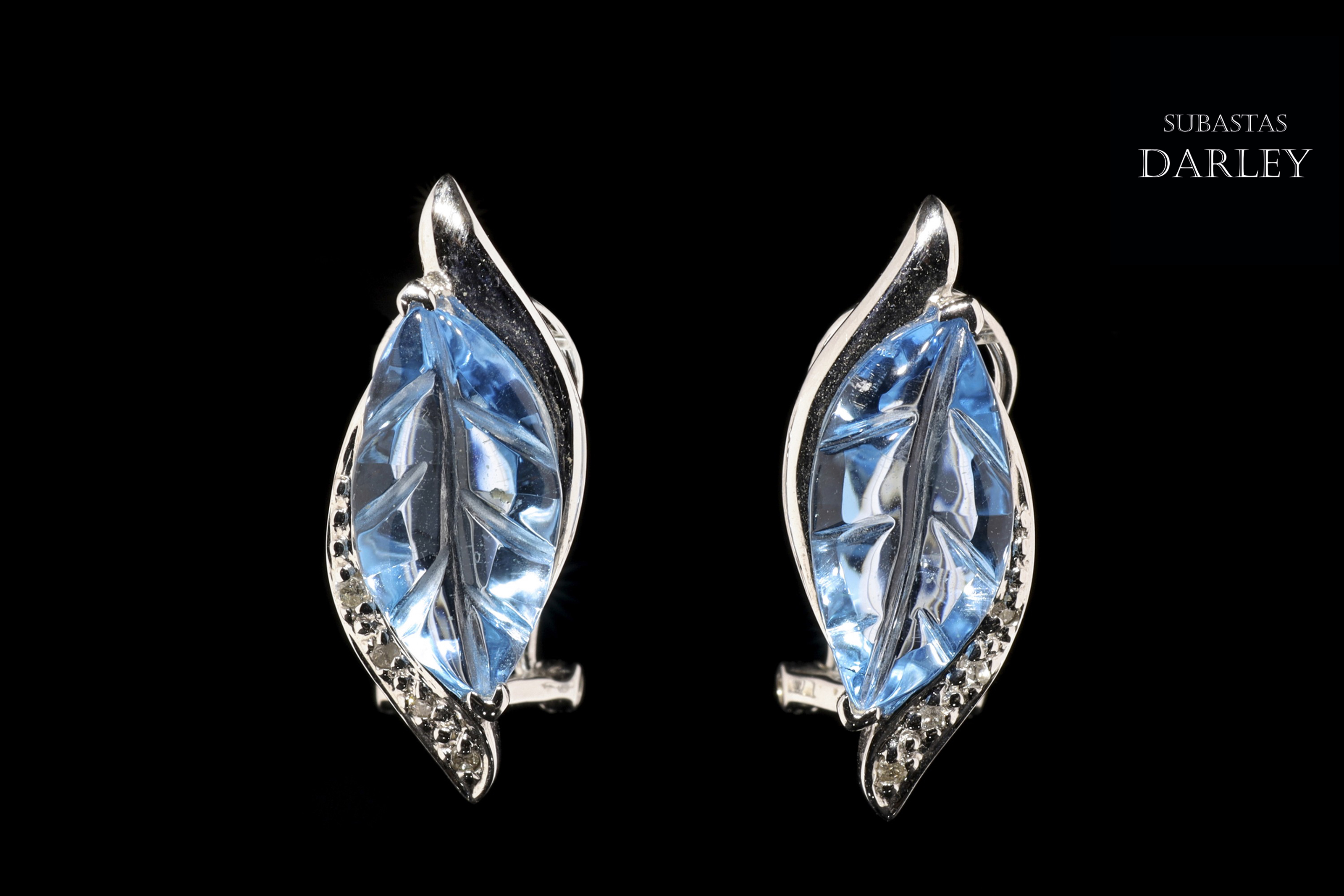 Pendientes de oro blanco de 18k con forma de hoja. Muestra dos topacios de, azul intenso y peso total de 6,67 ct, engarzados en dos garras. Decorado con diamantes de talla brillante, engarzados en grané. Cierre tipo Omega.