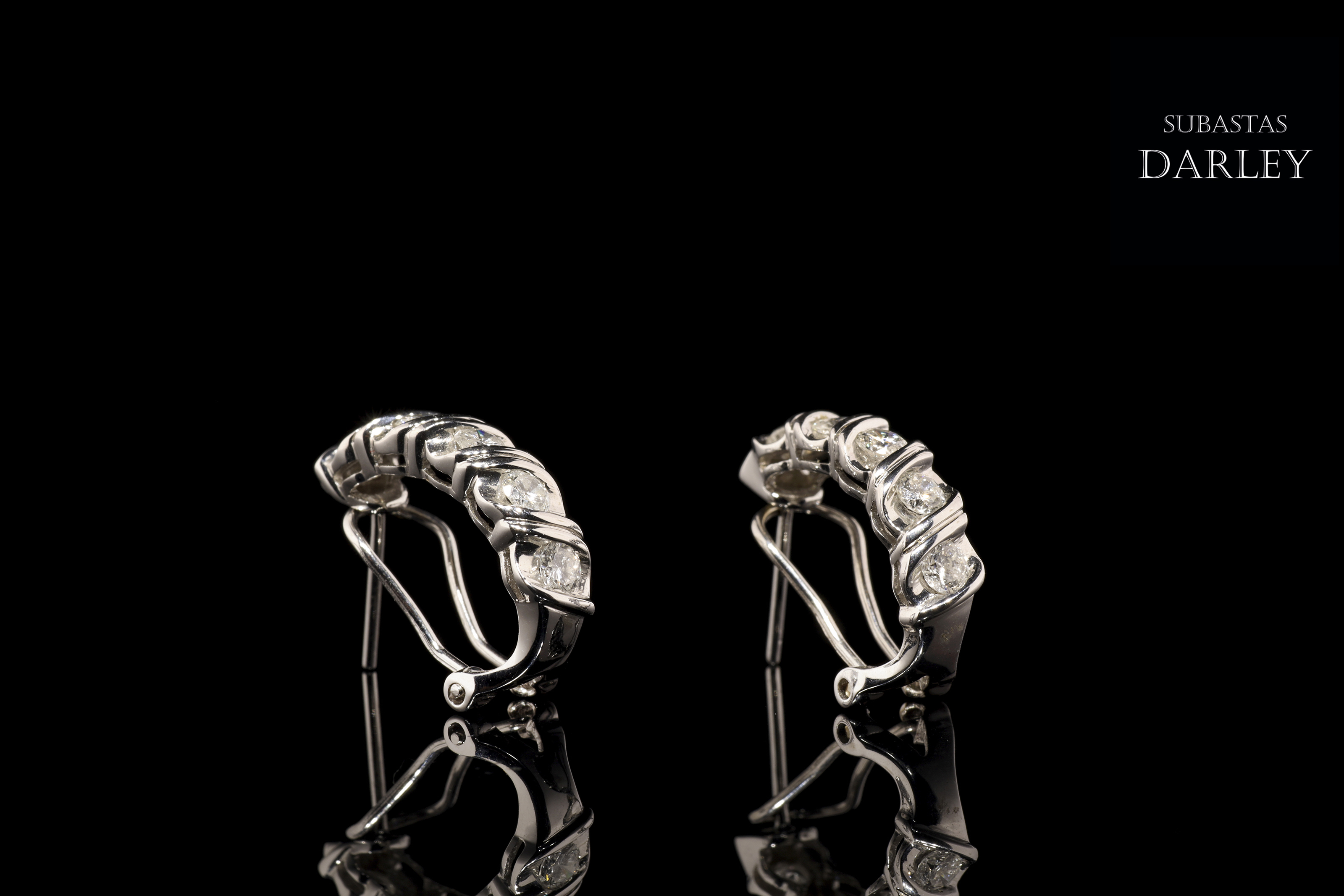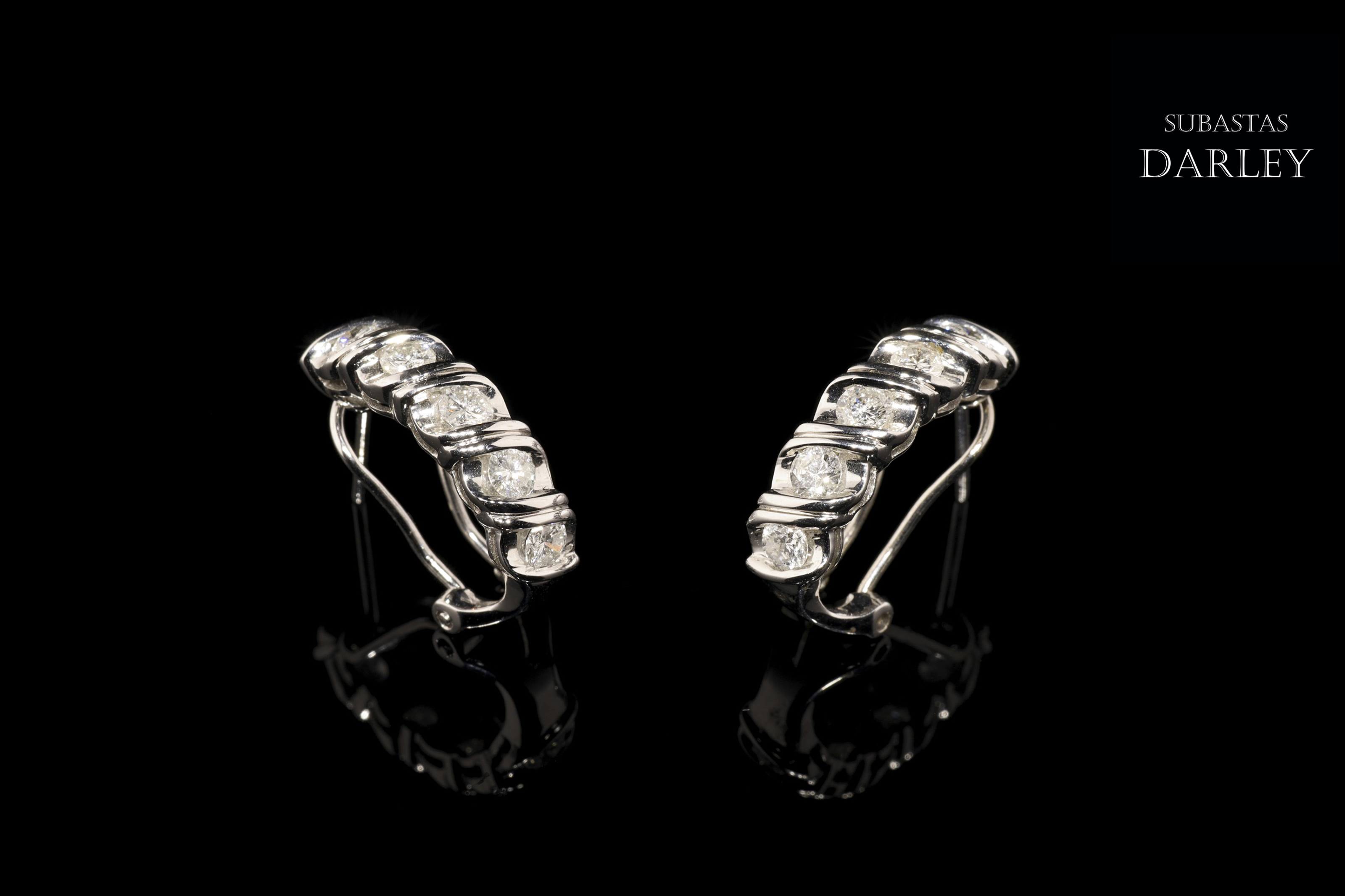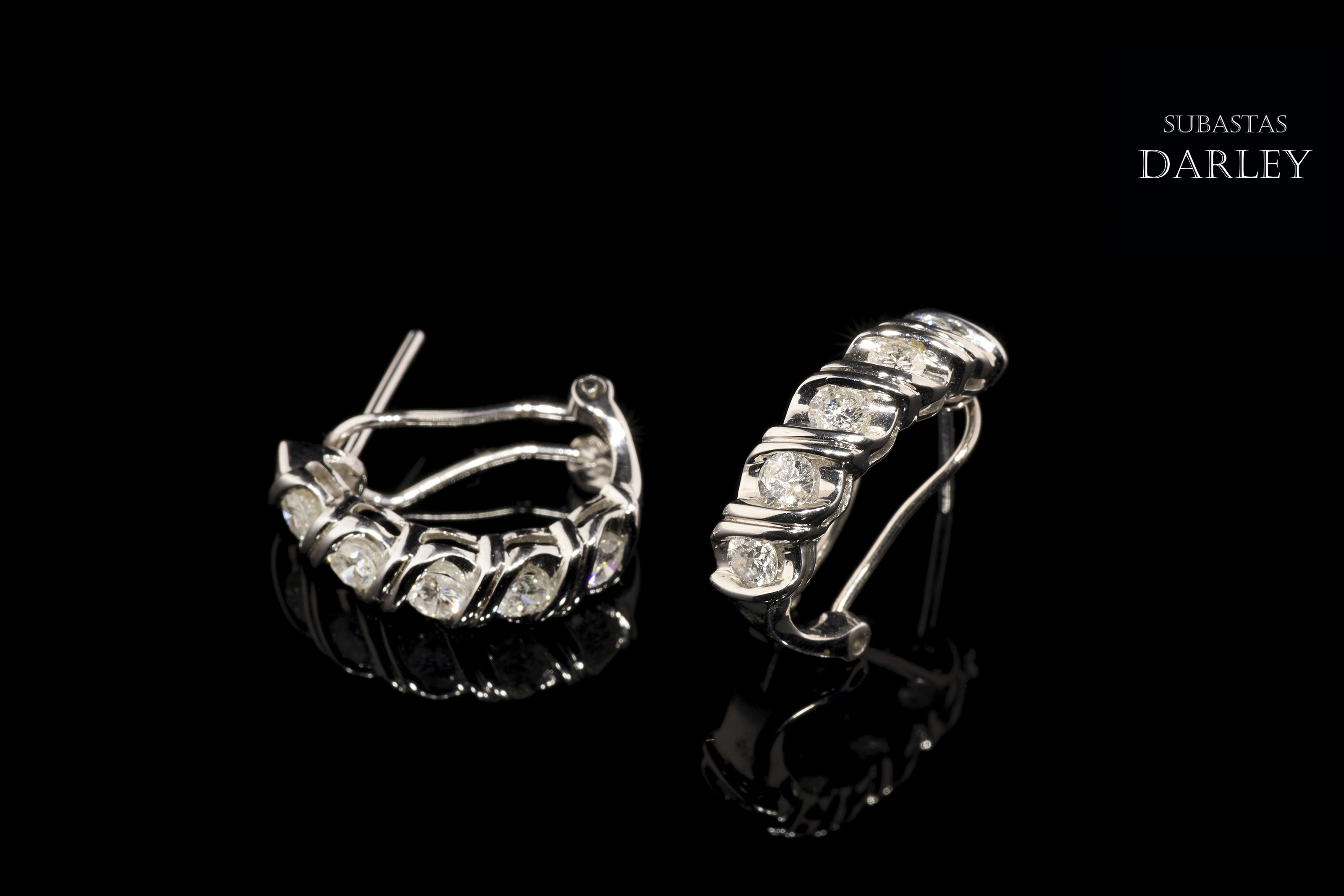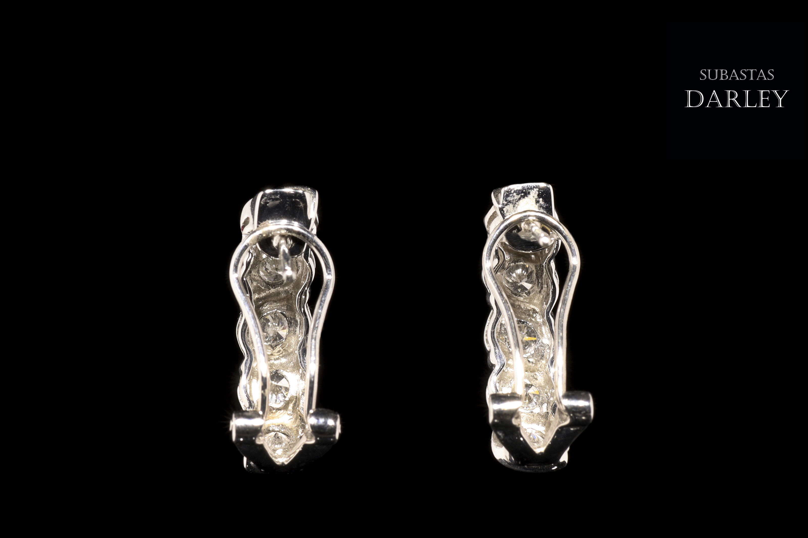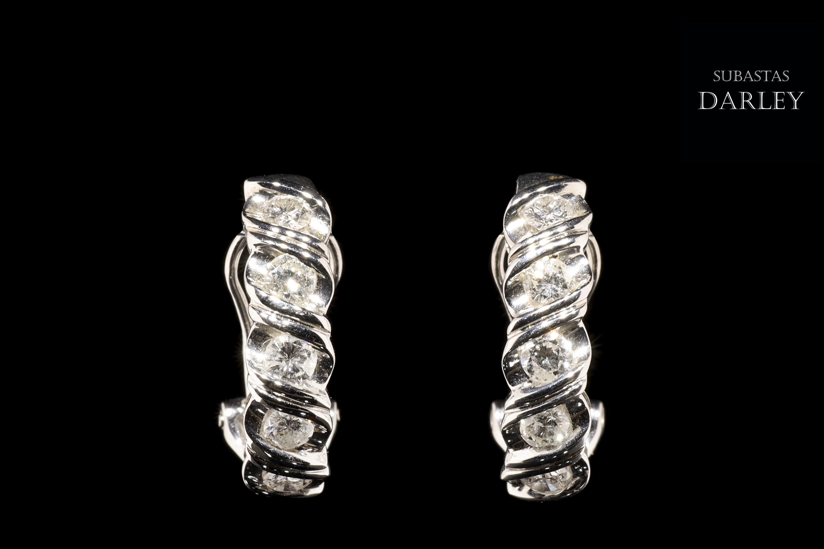 Pendientes modelo criolla en oro blanco de 18k, adornados con 10 diamantes, talla brillante, separados por un doble bisel; con un peso total de 1 ct. Cierre de pala omega.