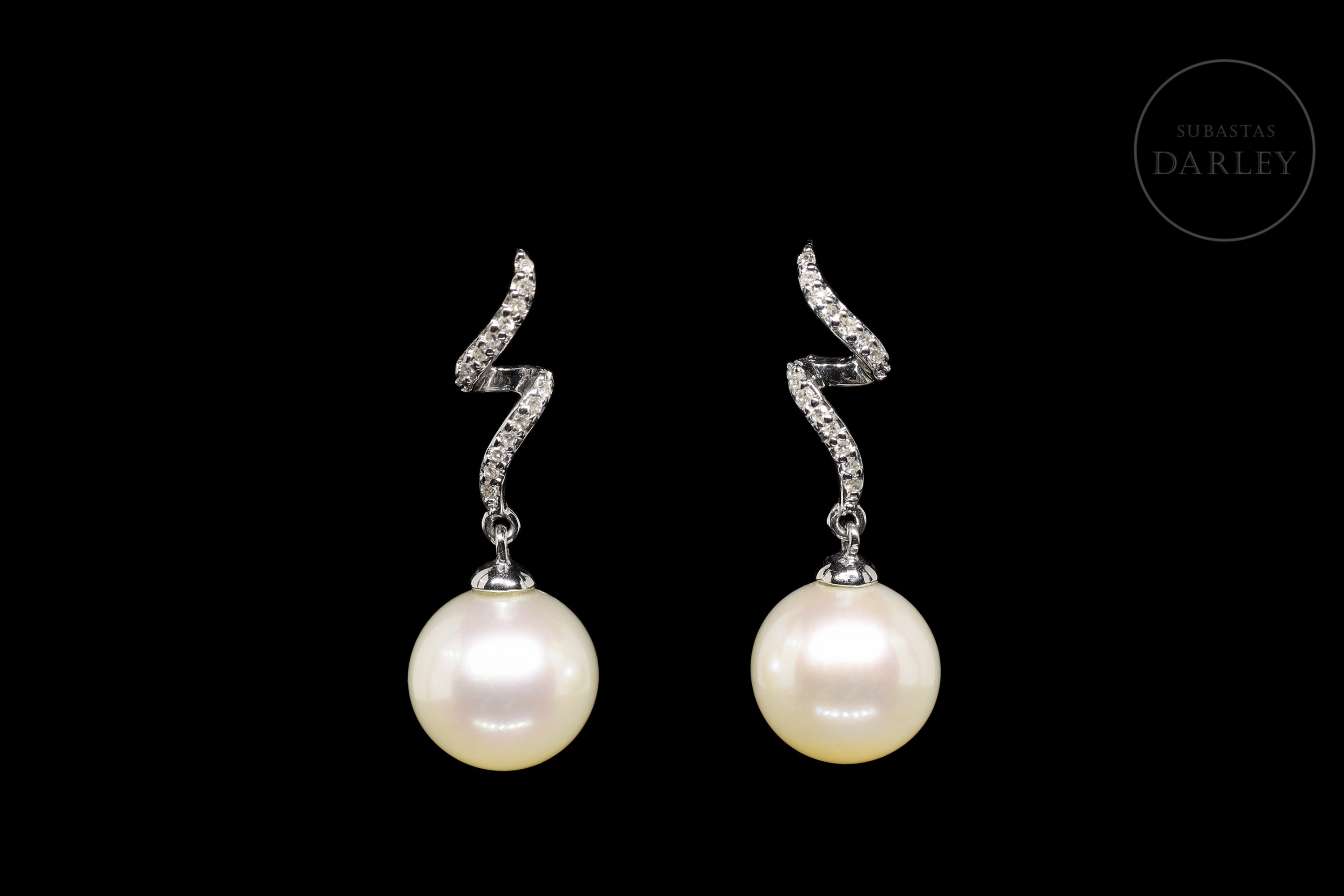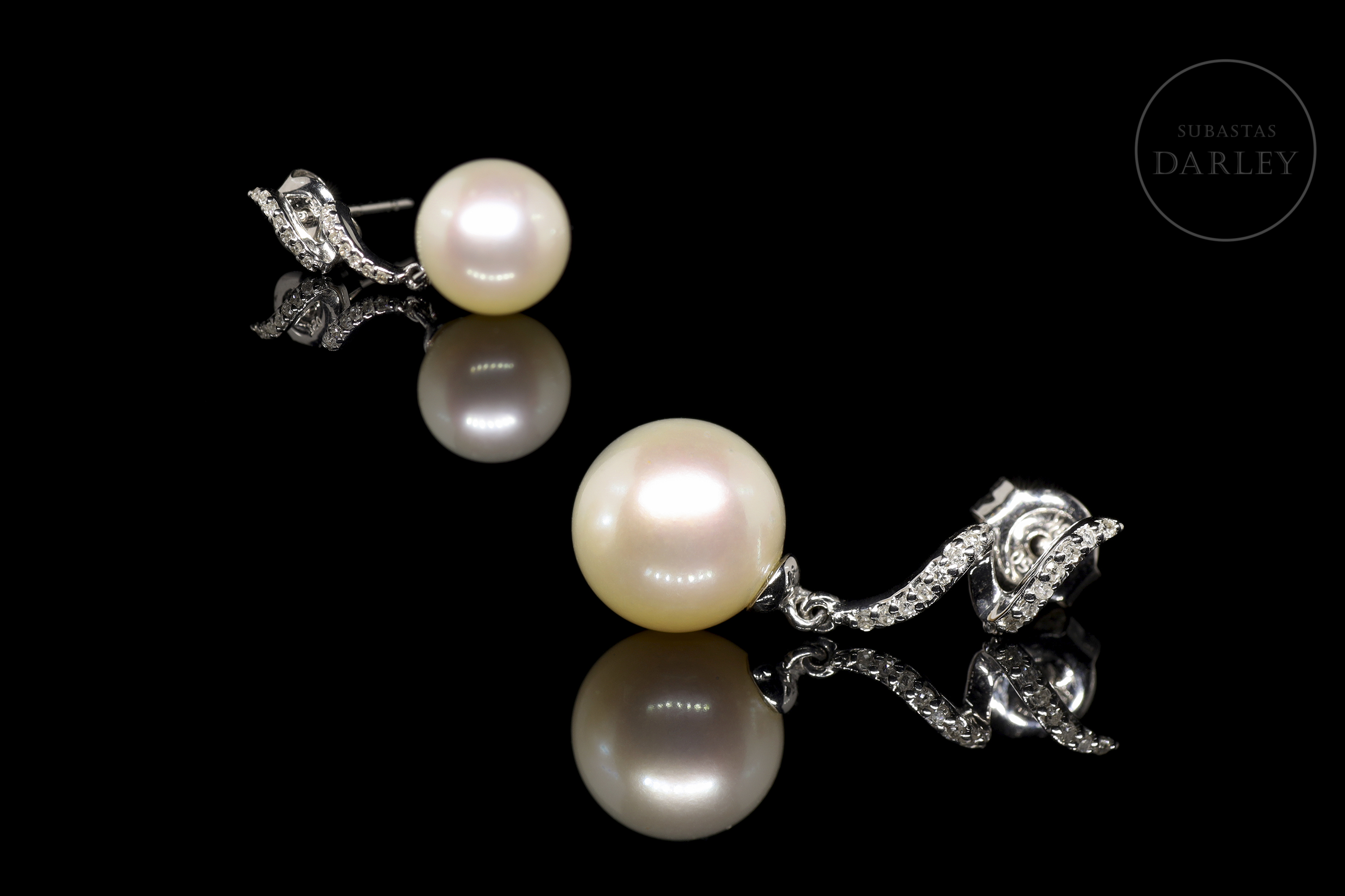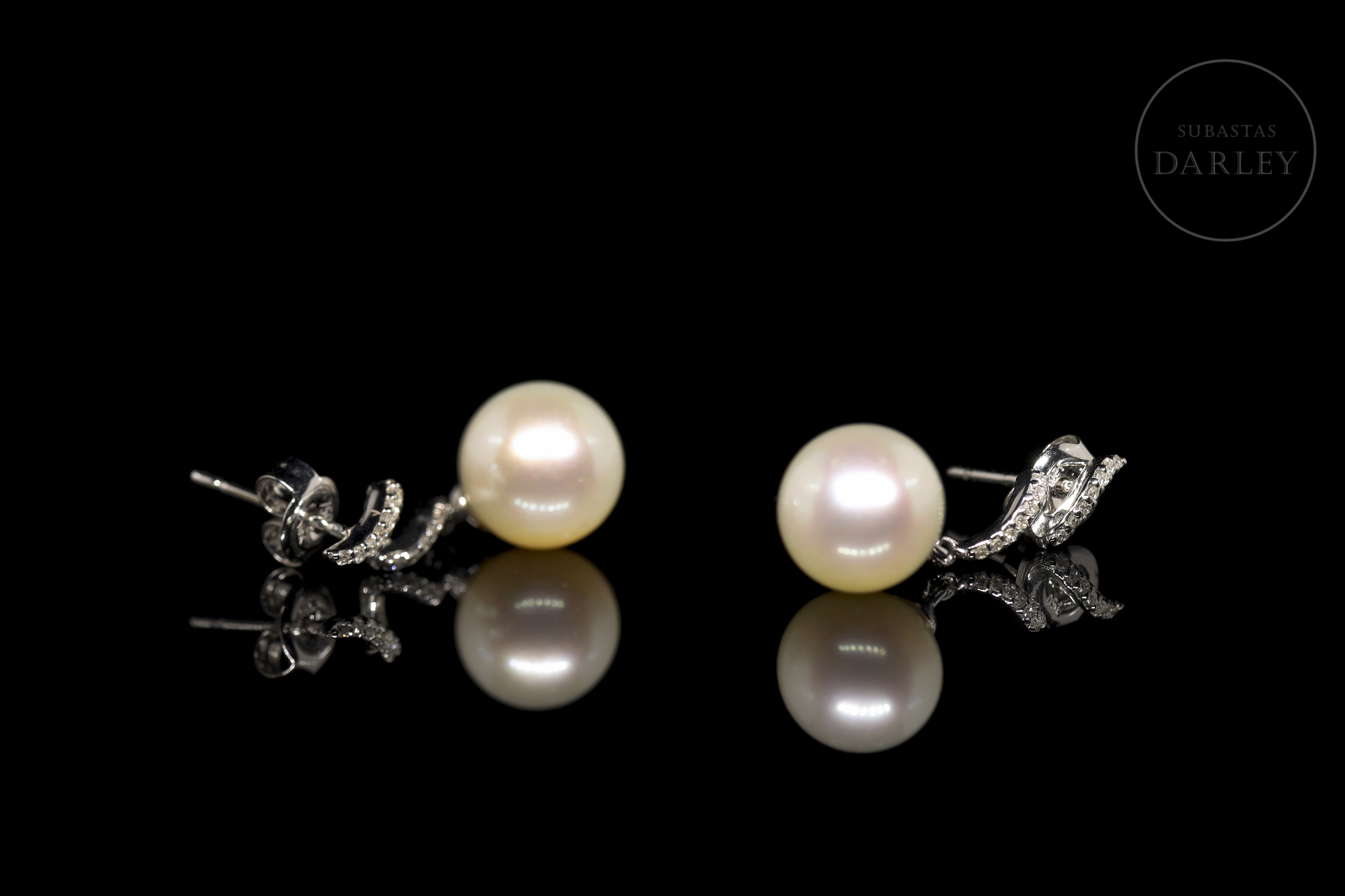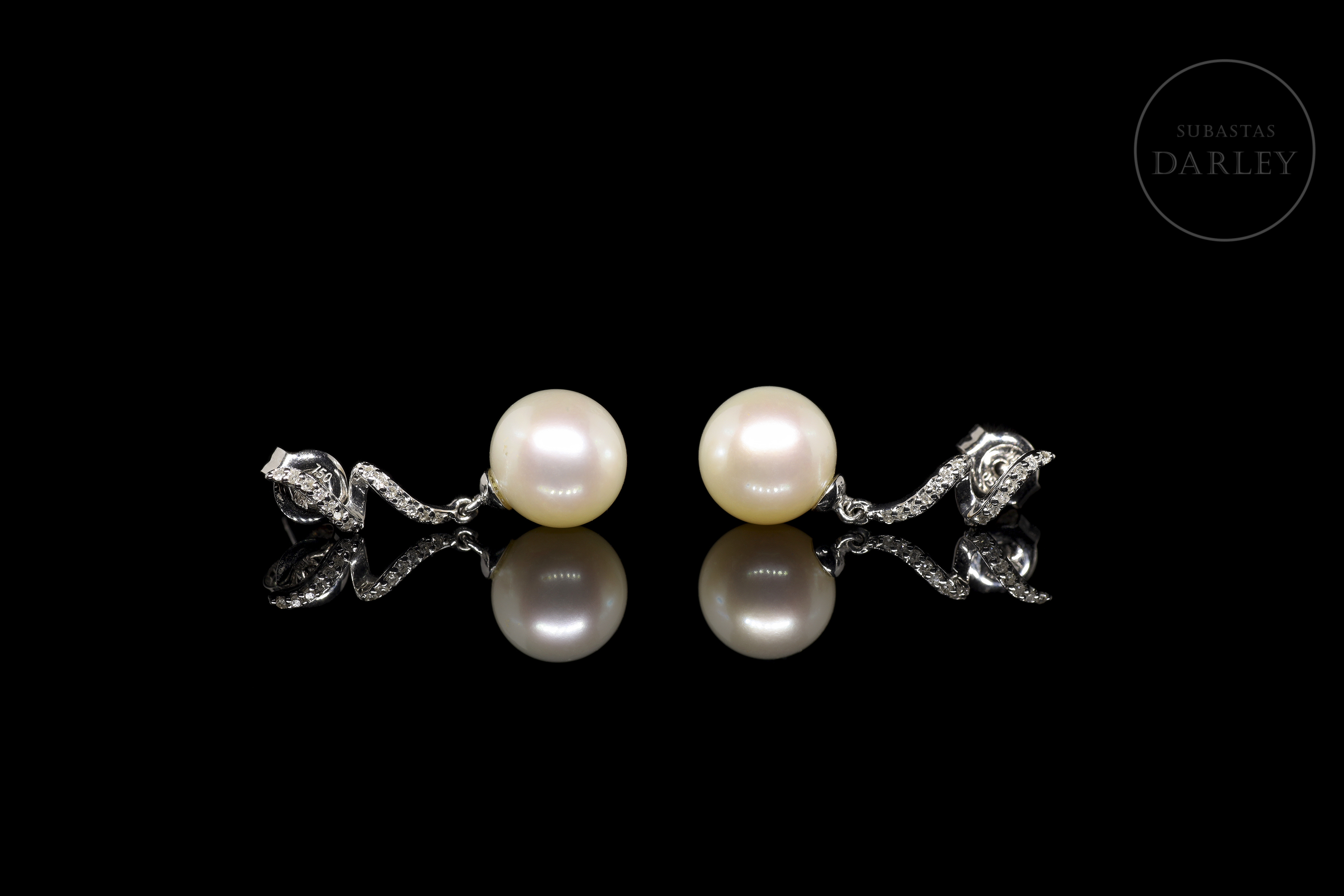 Pareja de pendientes con movimiento, Forman el frontis dos perfiles en línea curva y misma dirección que coincide en un solo punto y que se presentan forradas de diamantes, talla brillante, engarzados en garra. De ellas pende una perla esférica de 8,5 – 9 mm (aprox.) en color blanco, cultivada. Cierre de presión.