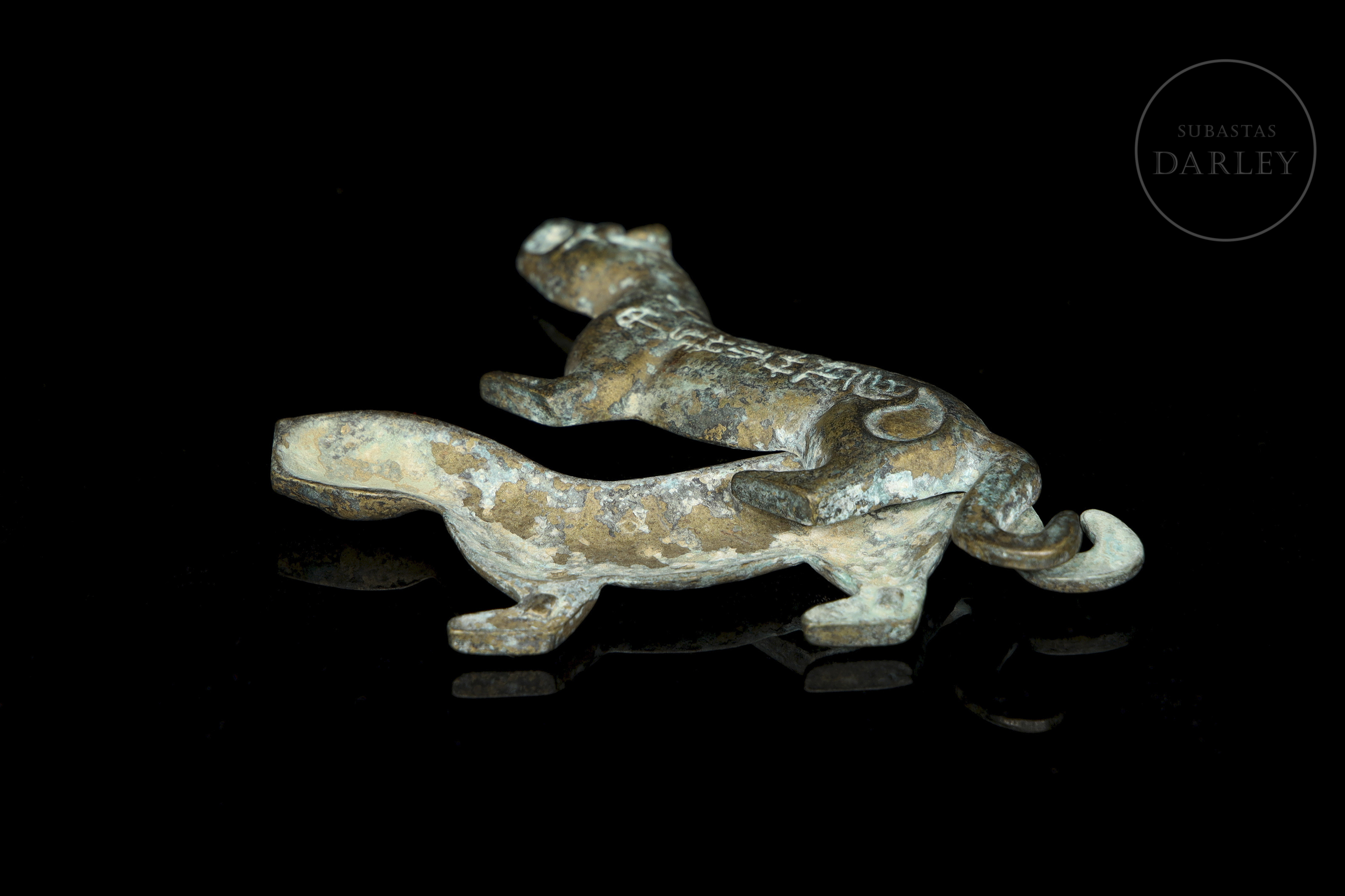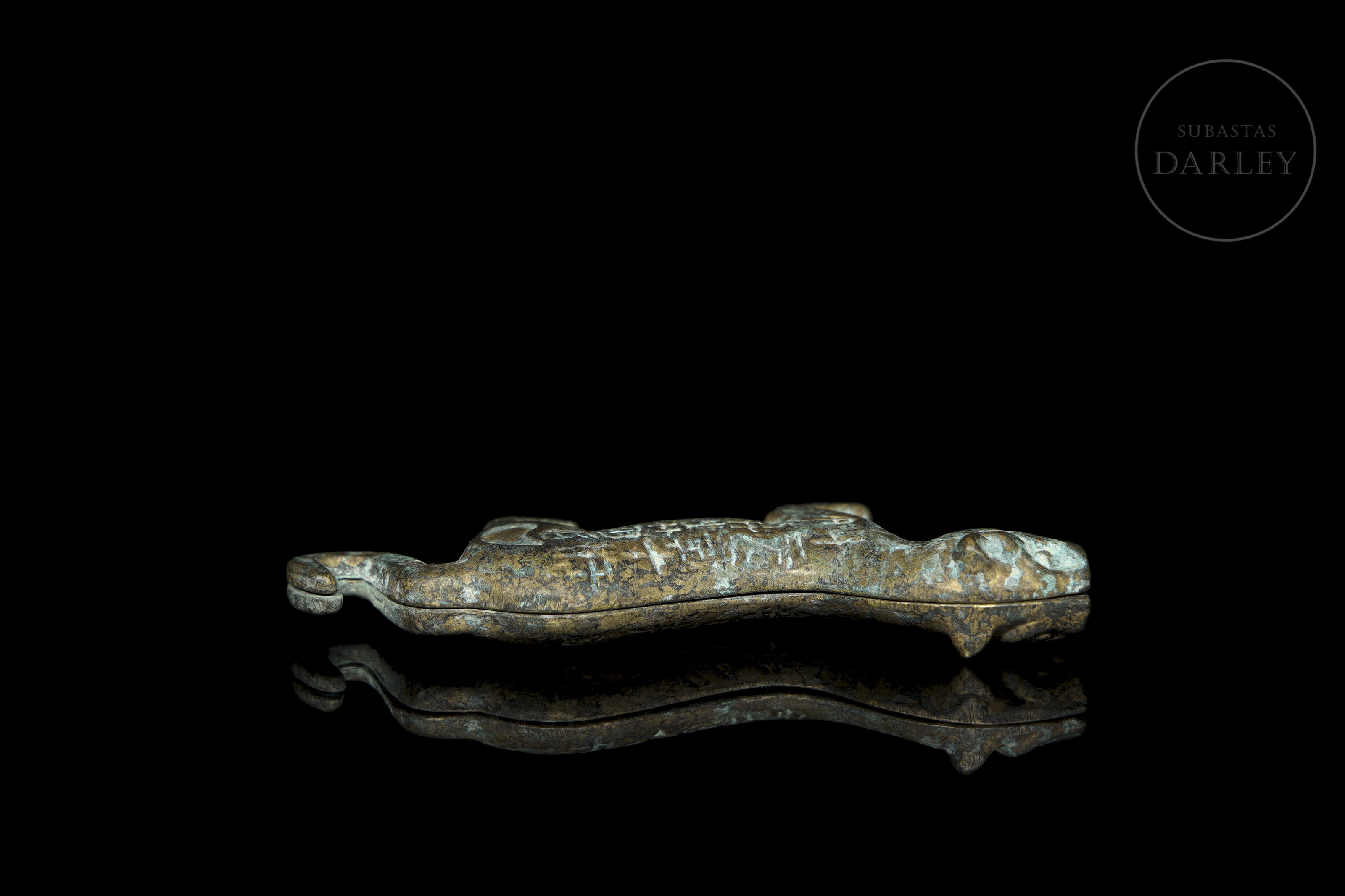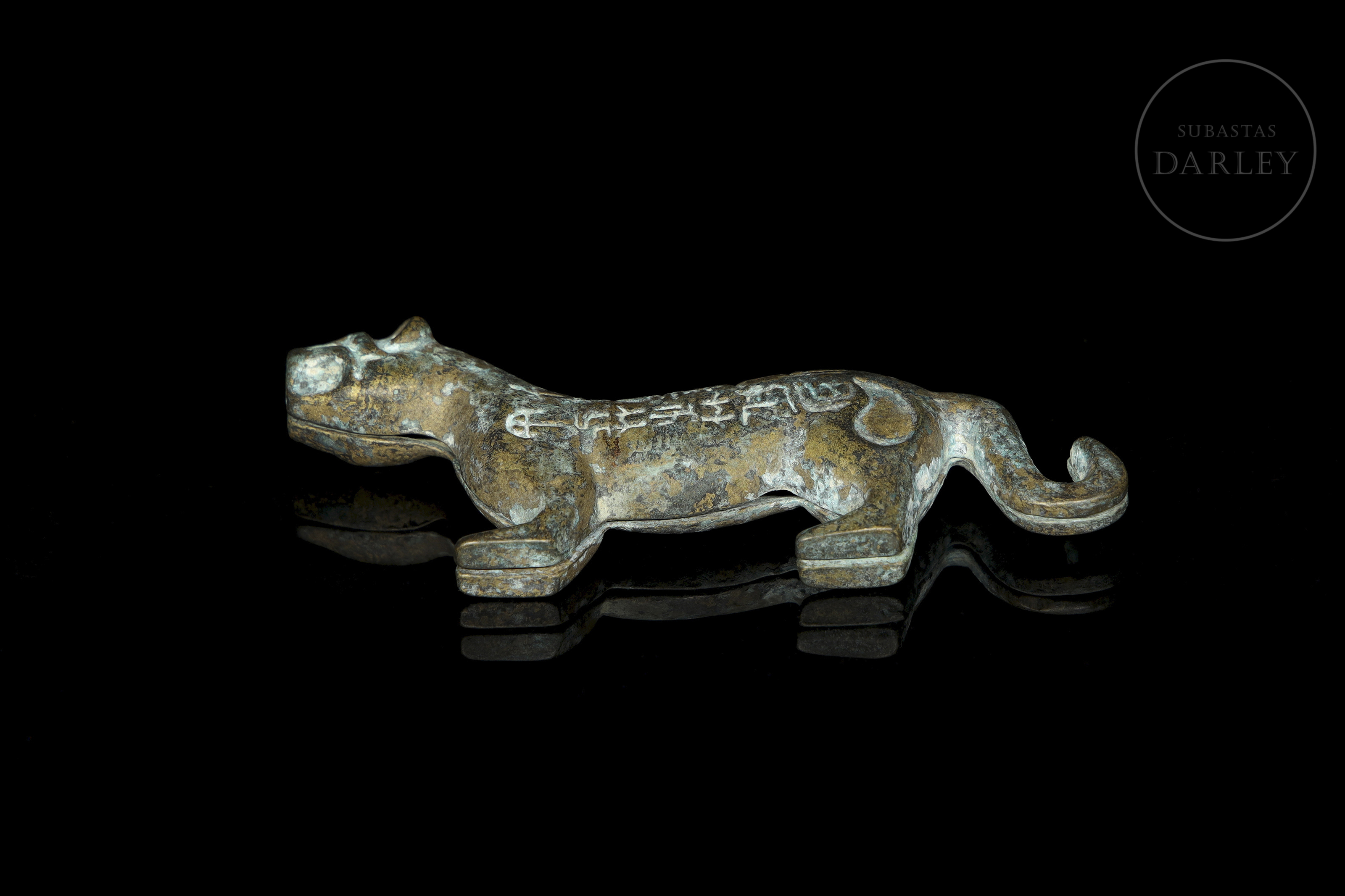 Pequeña caja de bronce con tapa, realizada en un estilo arcaico que evoca la dinastía Han. La pieza presenta una forma zoomorfa compacta y estilizada, representando un tigre o felino en posición agazapada, y se apoya sobre cuatro patas cortas. Exterior está cubierto caracteres incisos y pátina de óxido verdoso.