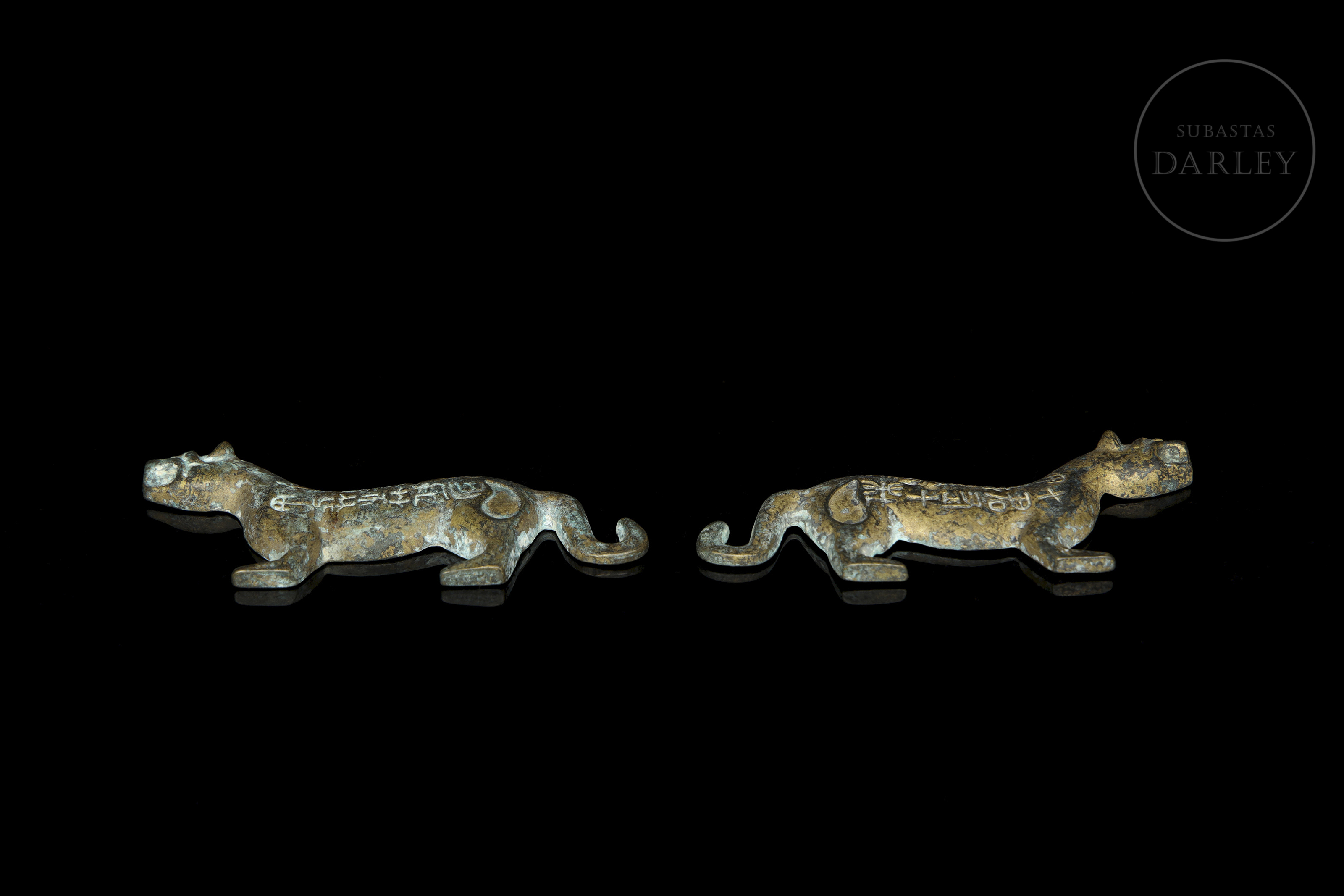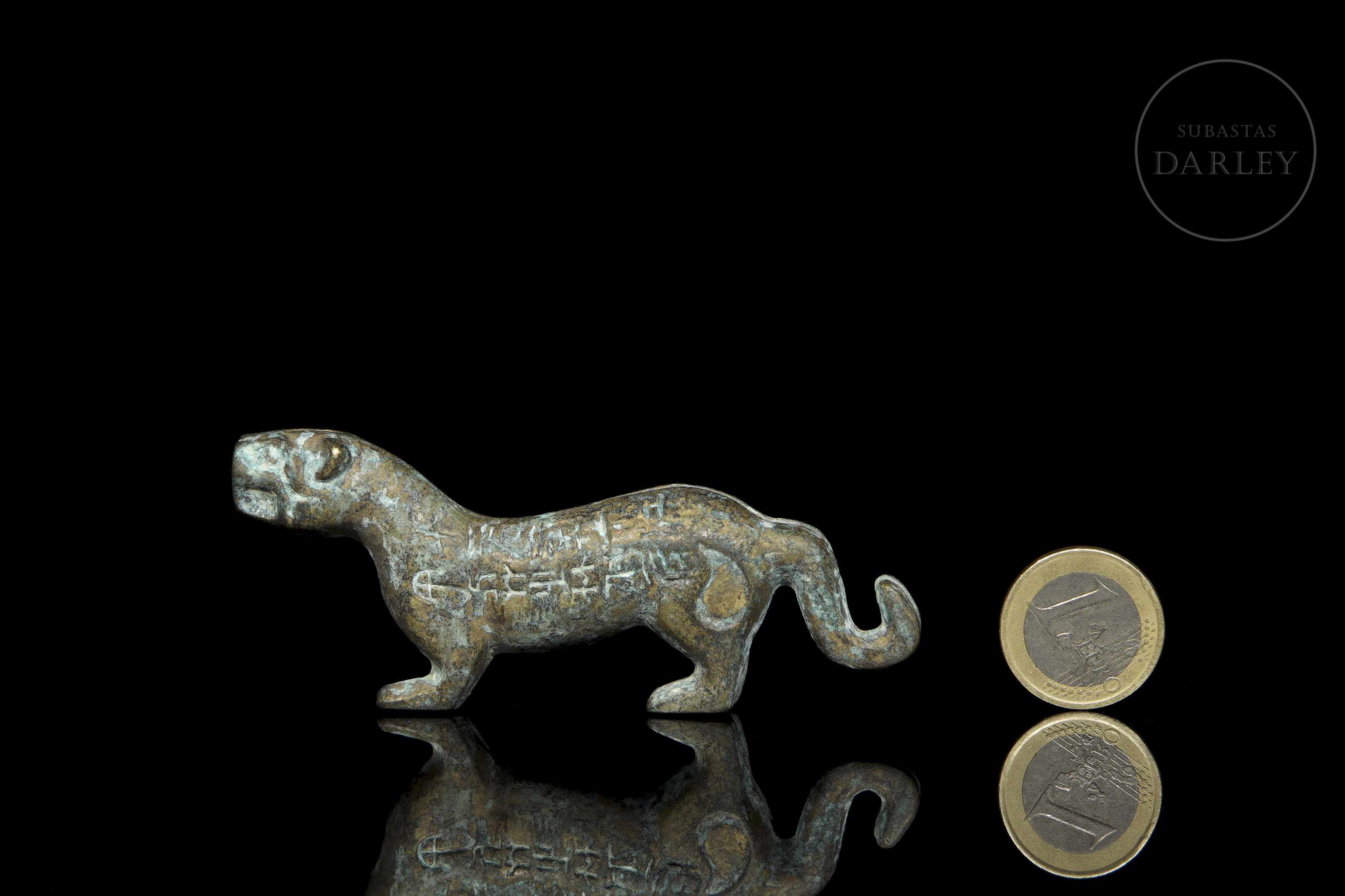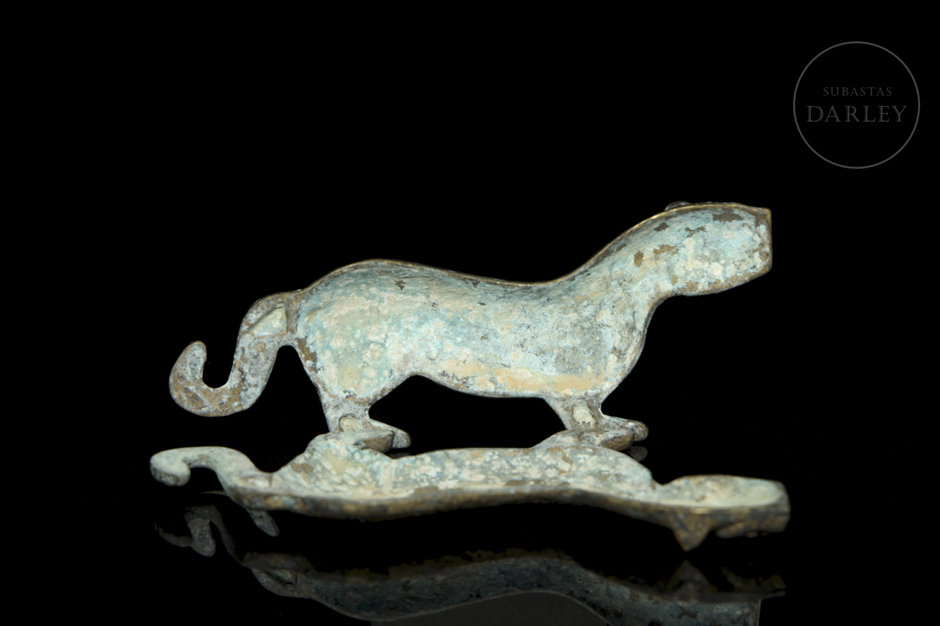 Pequeña caja de bronce con tapa, realizada en un estilo arcaico que evoca la dinastía Han. La pieza presenta una forma zoomorfa compacta y estilizada, representando un tigre o felino en posición agazapada, y se apoya sobre cuatro patas cortas. Exterior está cubierto caracteres incisos y pátina de óxido verdoso.