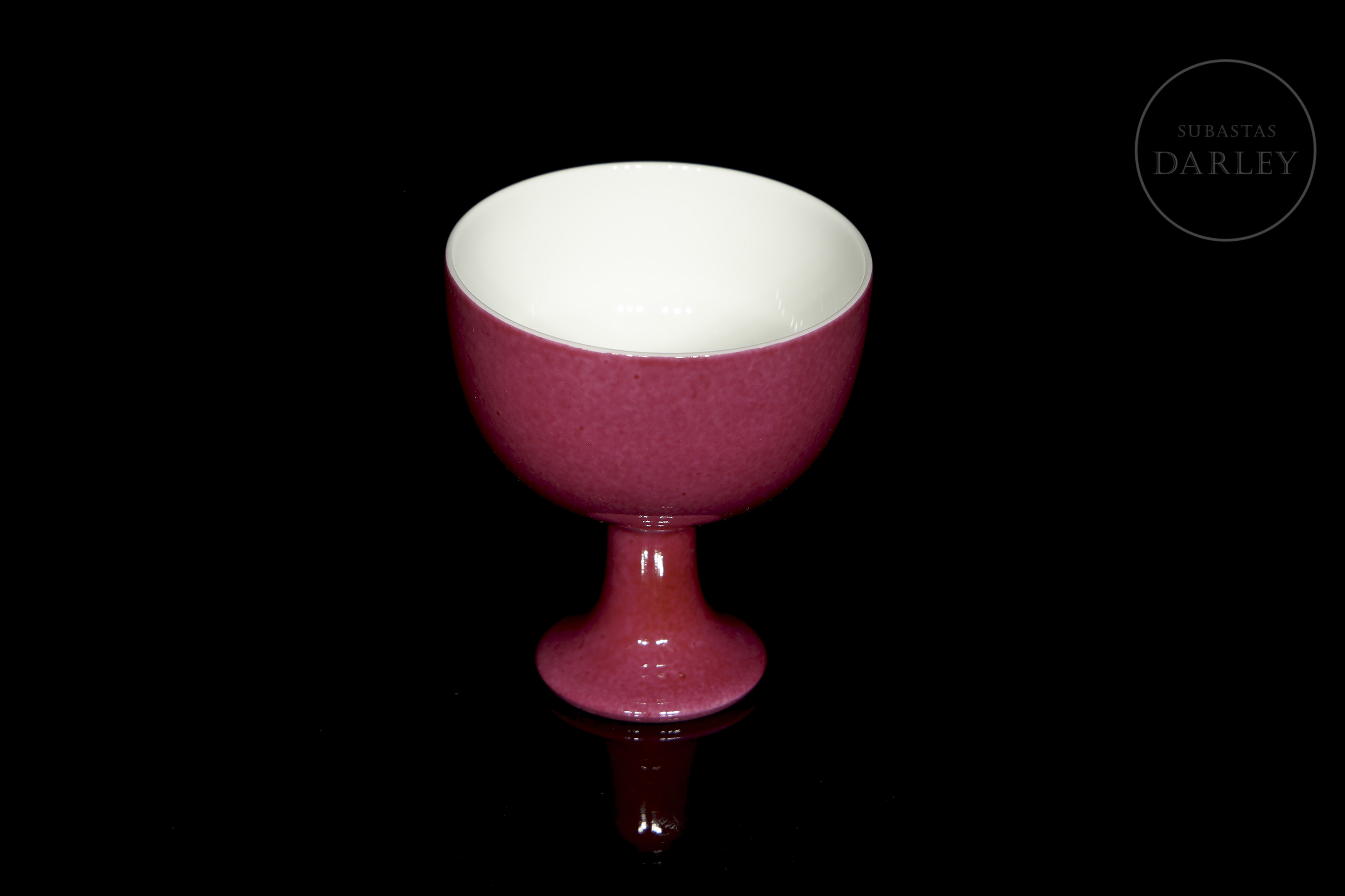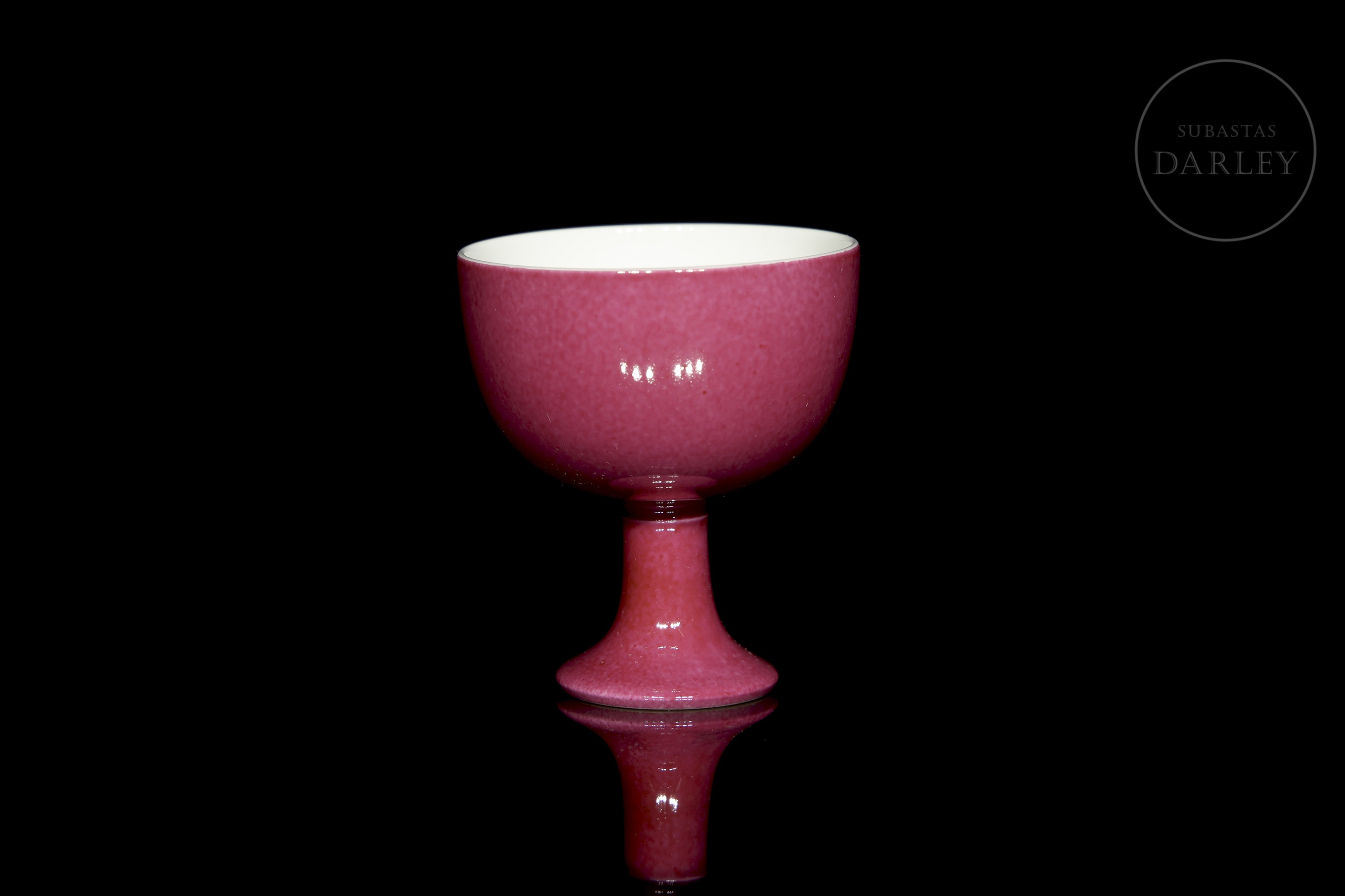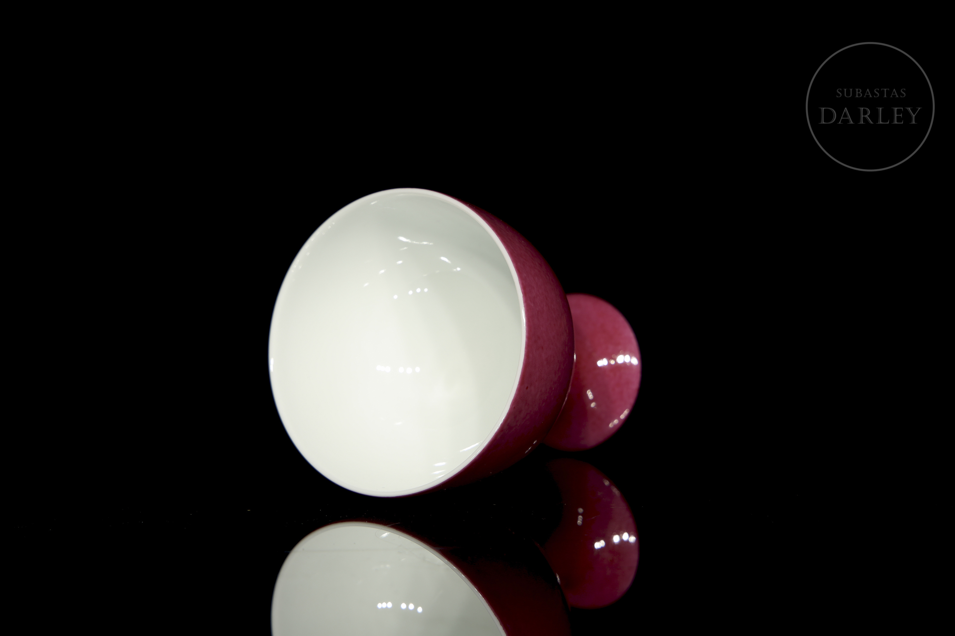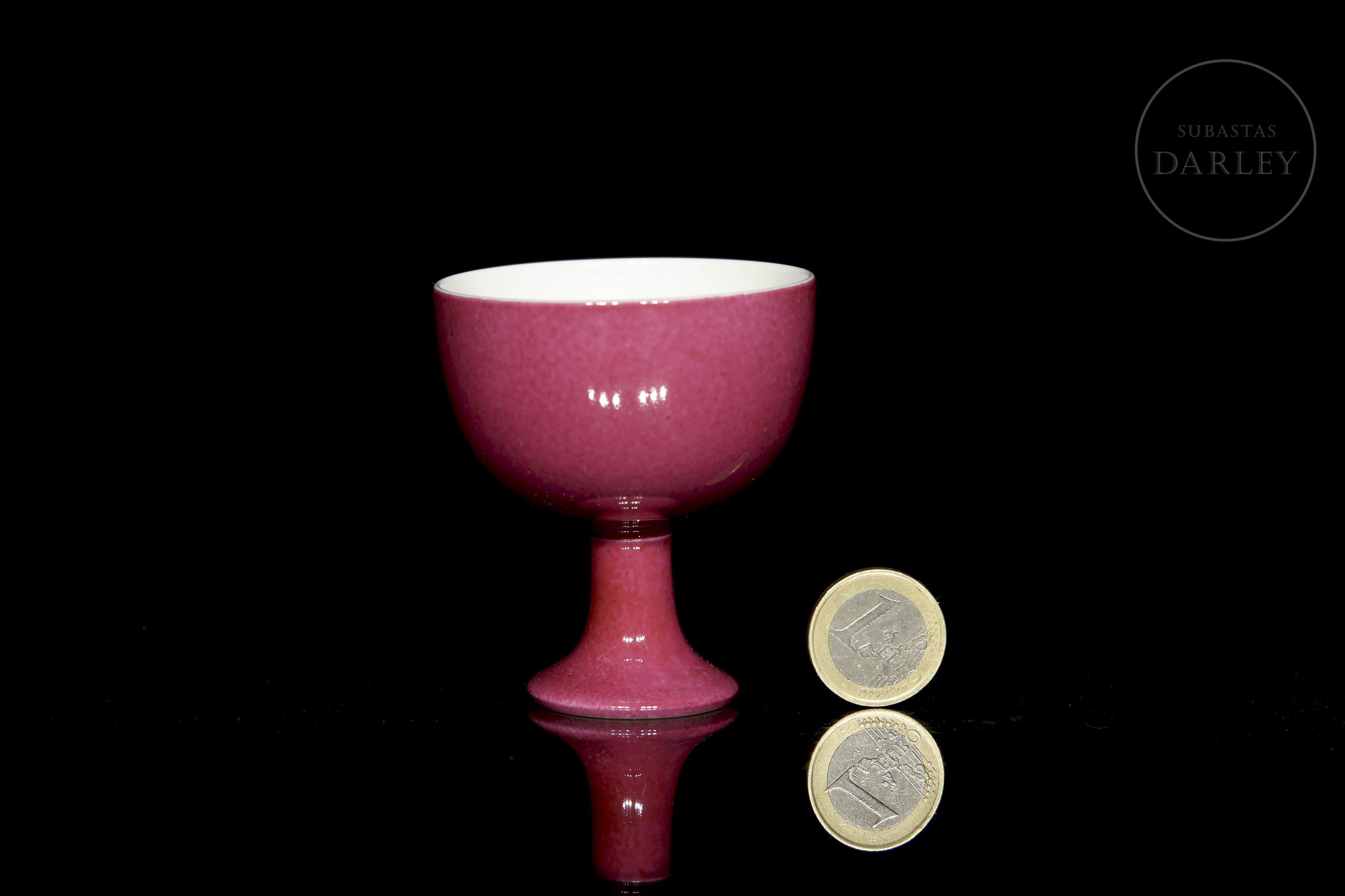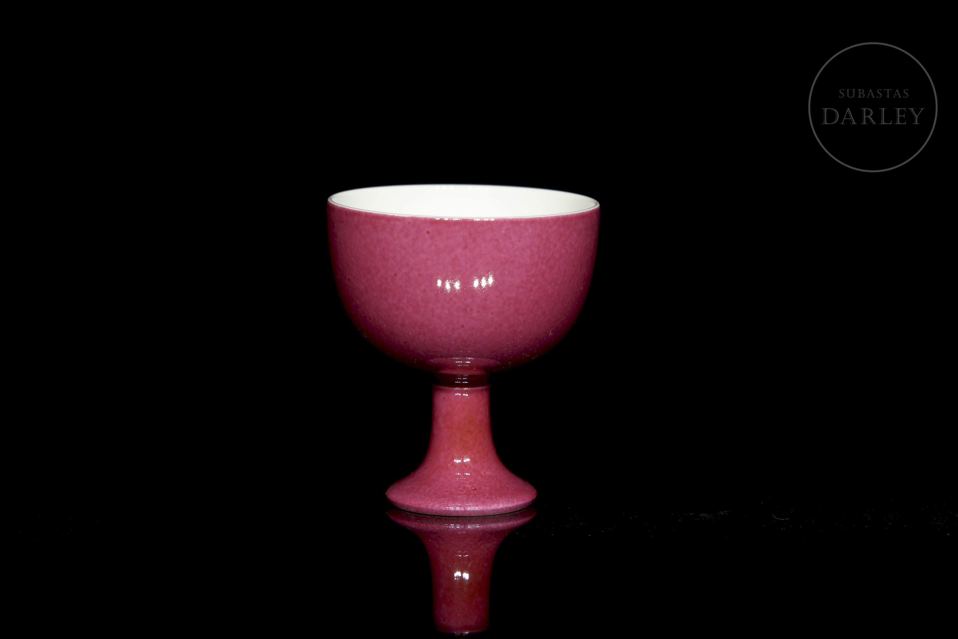 Pequeña copa de porcelana esmaltada con decoración sobre vidriado en blanco y esmalte "Familia Rosa". Posee una morfología de copa profunda con paredes acampanadas que se extienden sobre un pie alto y esbelto. Está decorada decorado de manera sobria, con el exterior cubierto de esalte rosa intenso, que contrasta con el interior blanco puro. En la base se dispone un sello bajo vidriado "大清雍正年制" en azul.