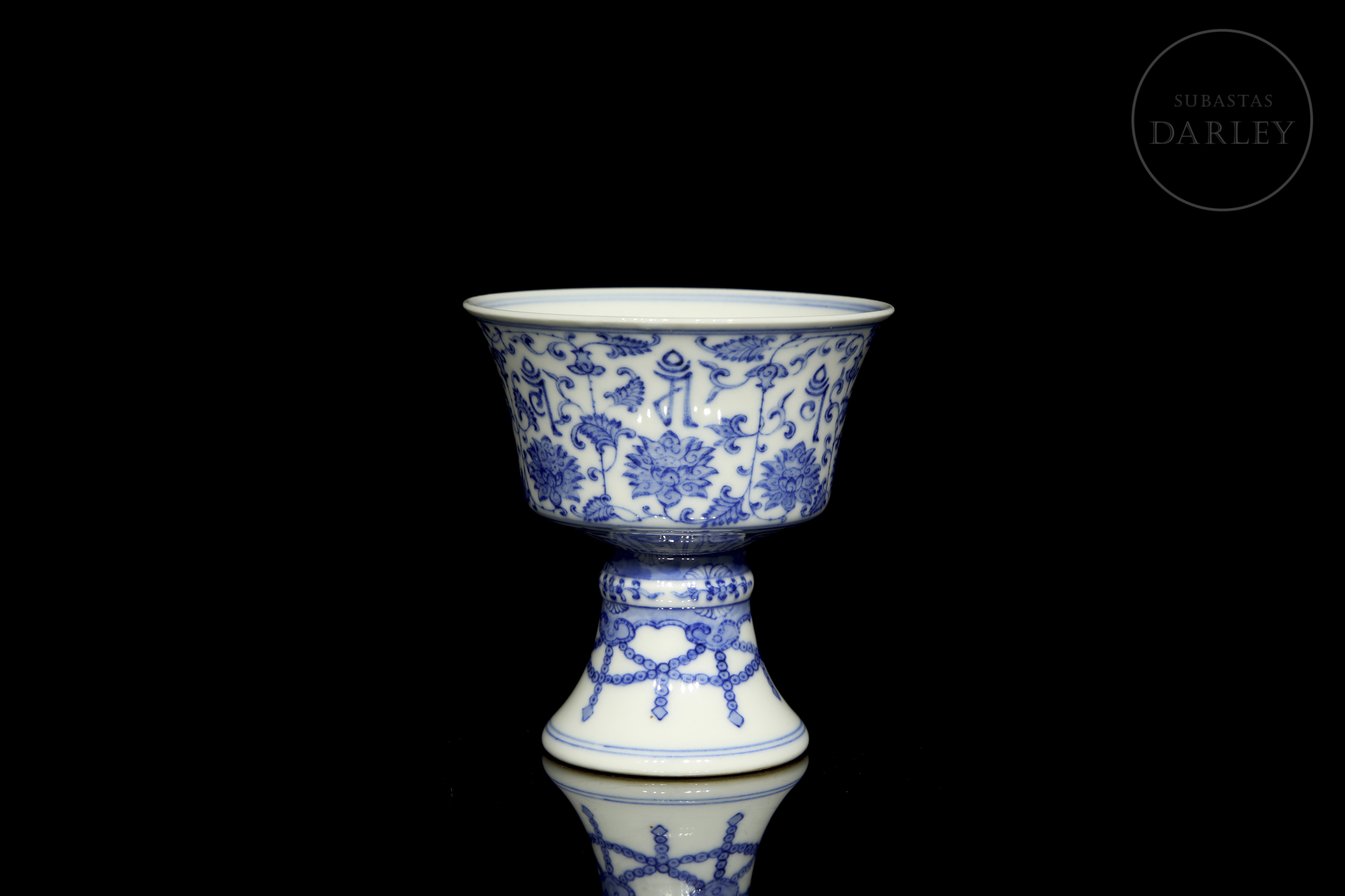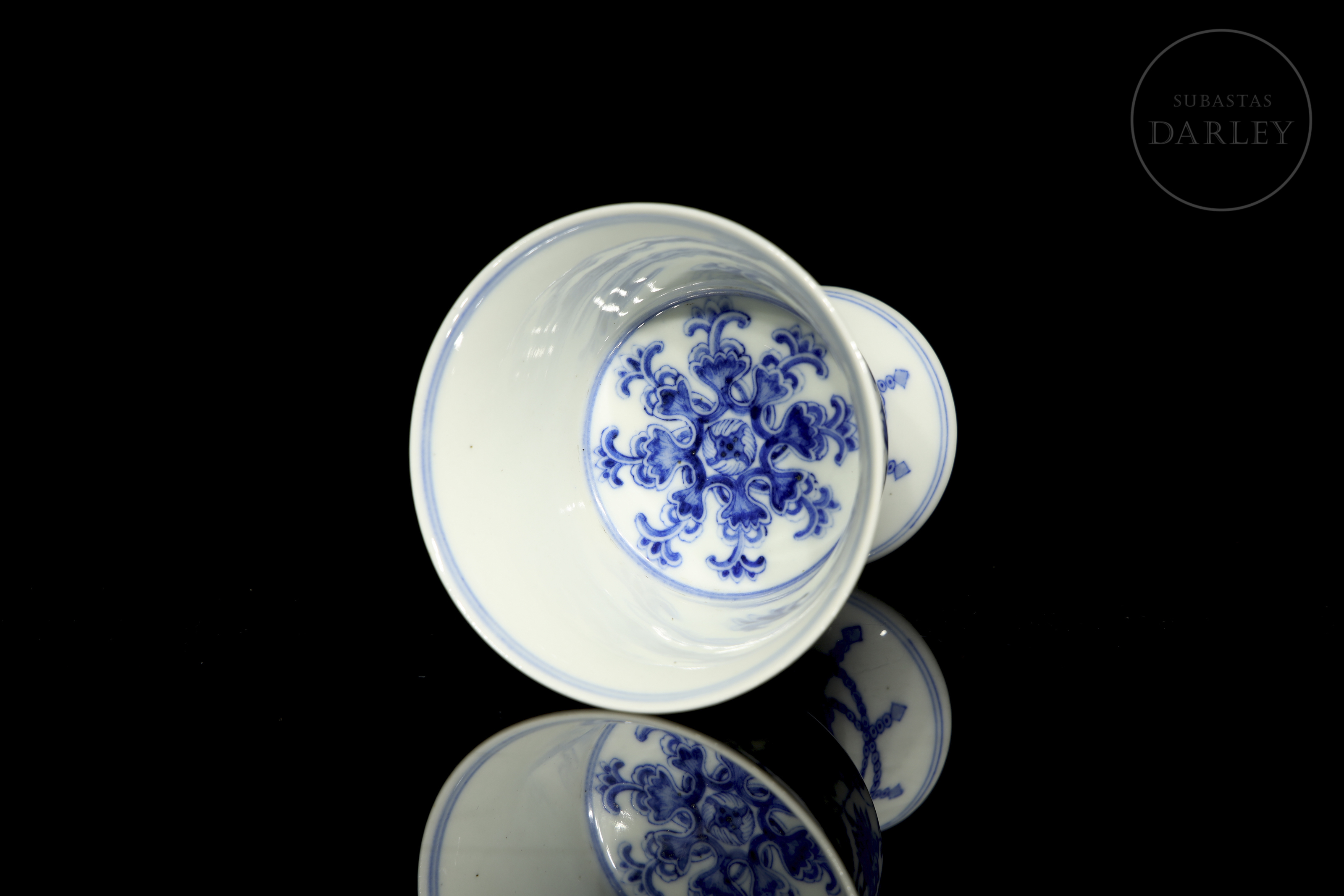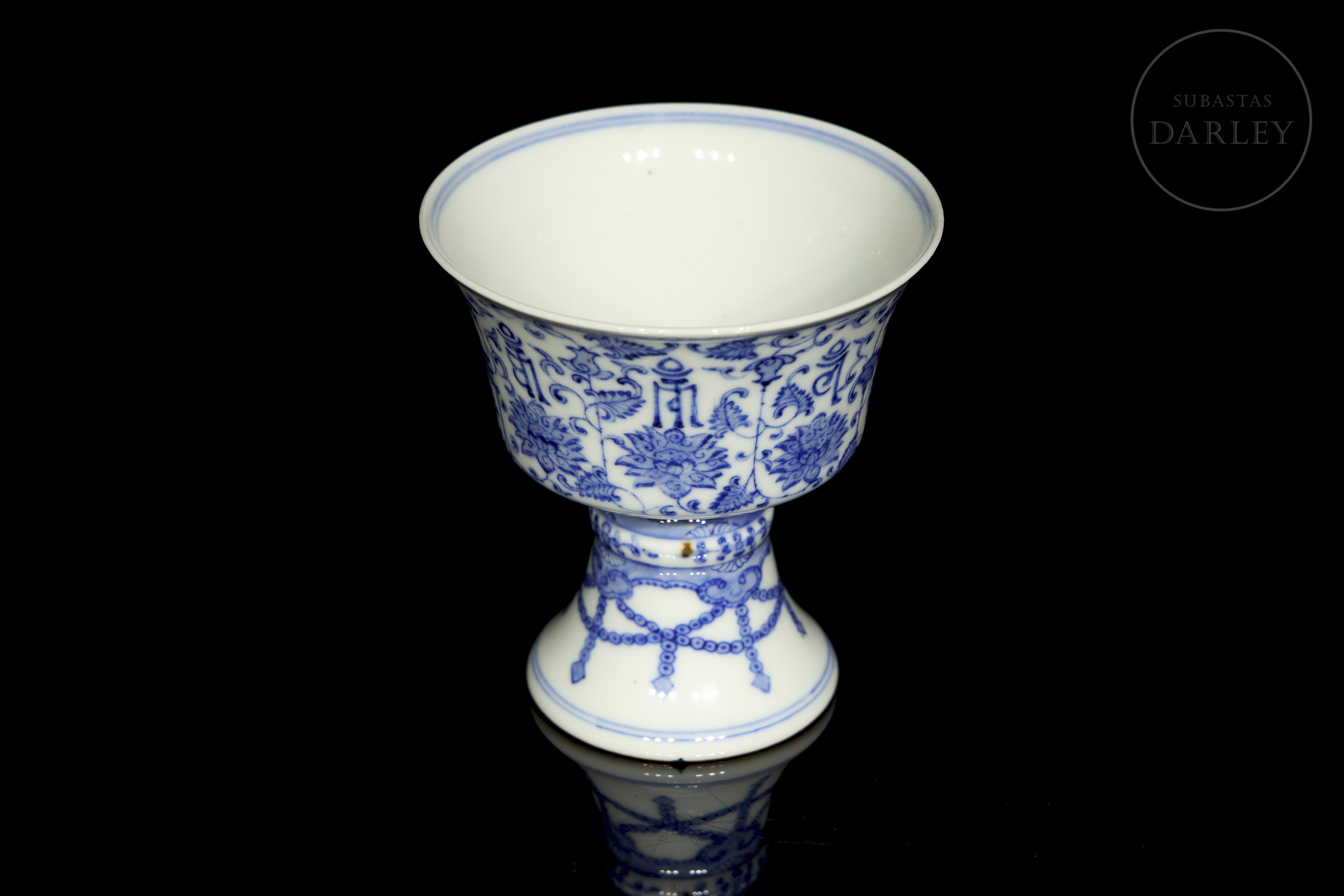 Pequeña copa de porcelana esmaltada en azul y blanco bajo vidriado. Posee una morfología de copa profunda con paredes acampanadas, asentada sobre un pie alto y esbelto de forma ligeramente bulbosa. Está decorada en el exterior con motivos de flor de loto, colgantes, ruyis y caracteres auspiciosos, mientras que el interior está esmaltado en blanco liso. En la base se dispone un sello bajo vidriado "大清嘉庆年制" en azul.