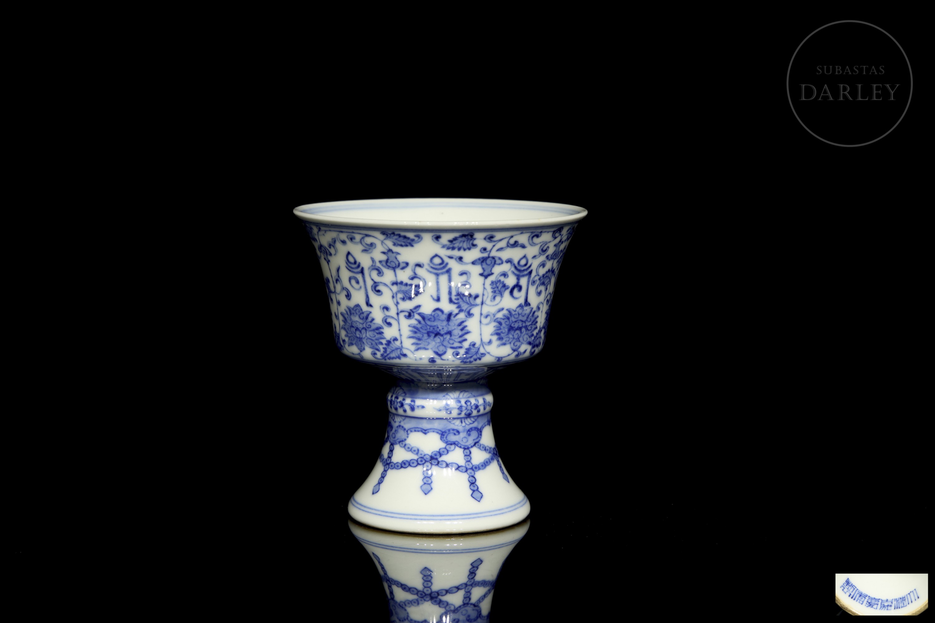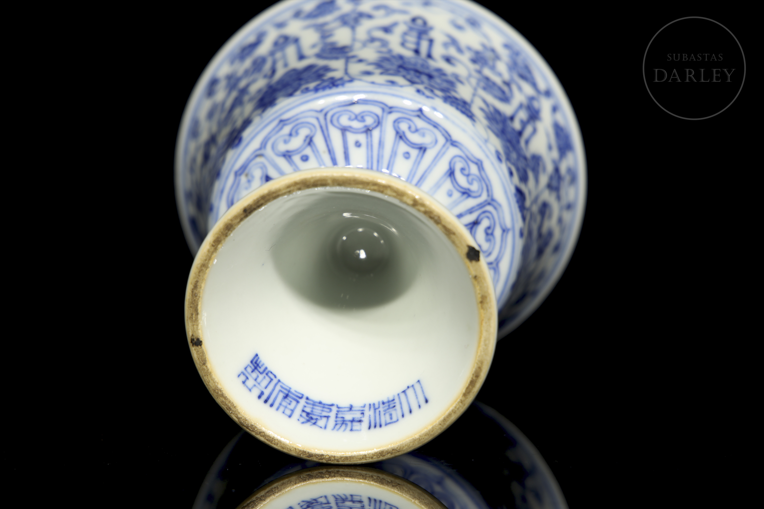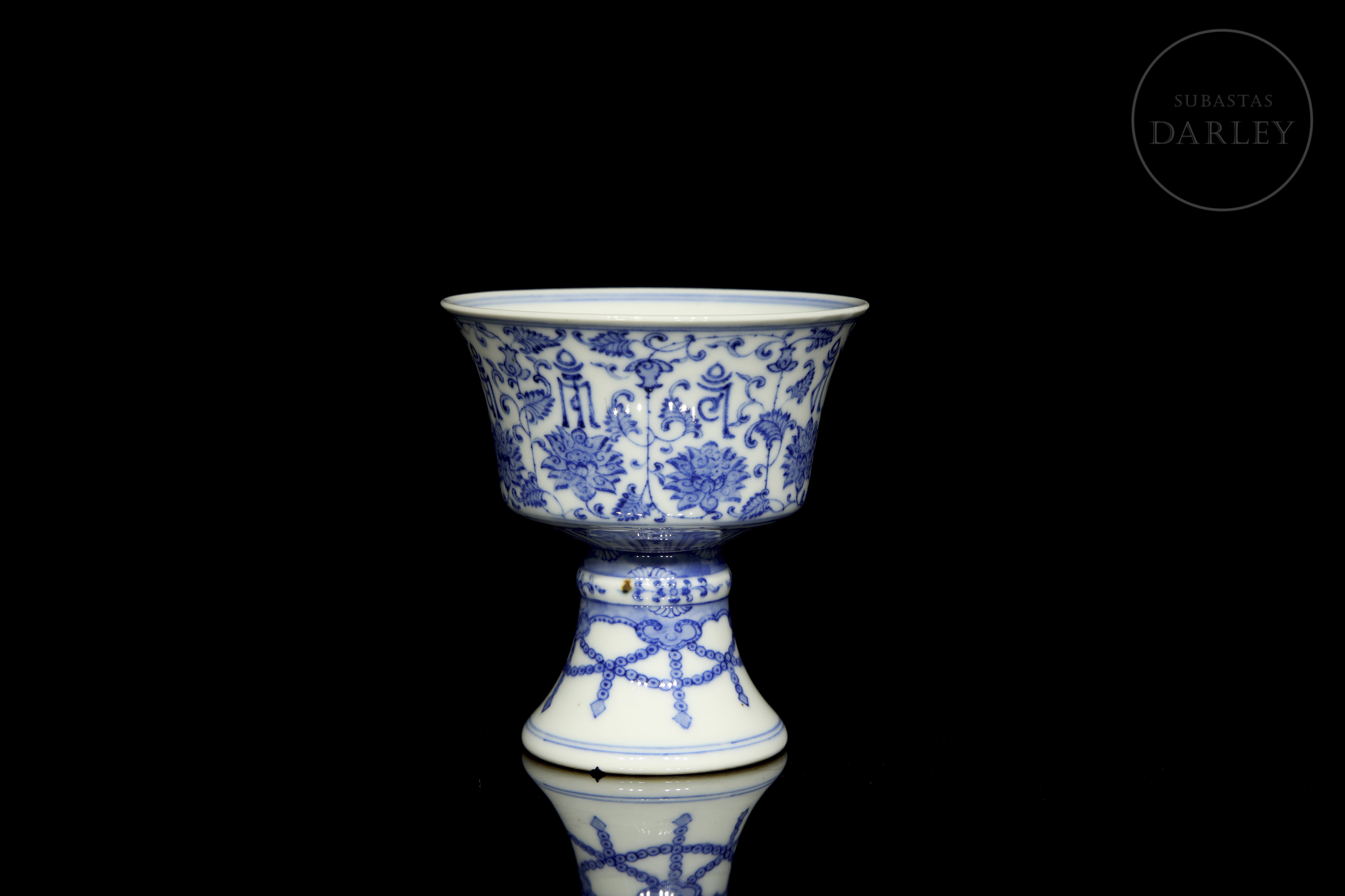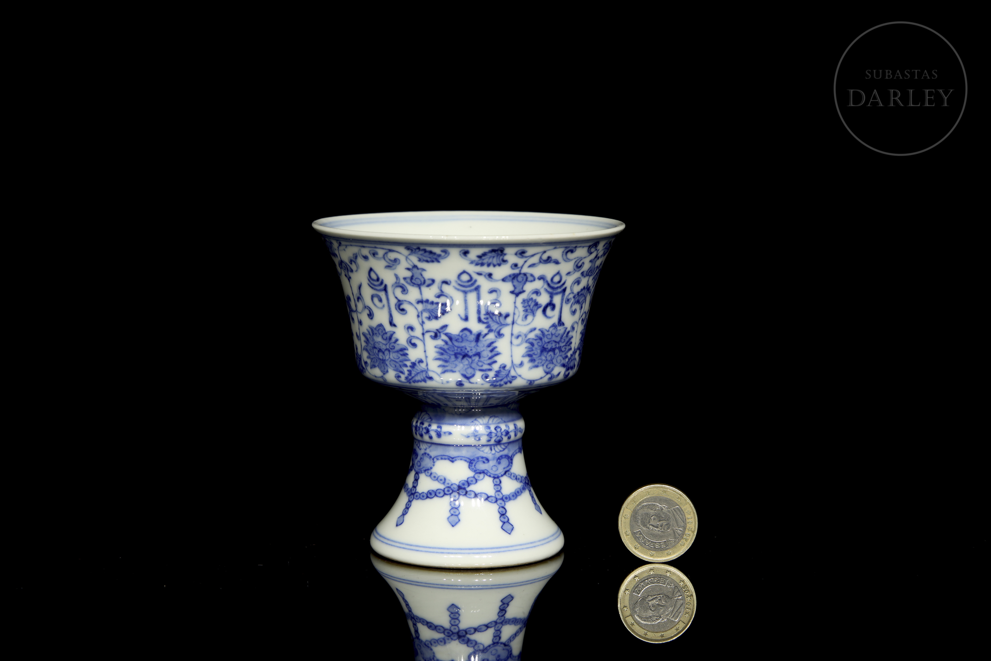 Pequeña copa de porcelana esmaltada en azul y blanco bajo vidriado. Posee una morfología de copa profunda con paredes acampanadas, asentada sobre un pie alto y esbelto de forma ligeramente bulbosa. Está decorada en el exterior con motivos de flor de loto, colgantes, ruyis y caracteres auspiciosos, mientras que el interior está esmaltado en blanco liso. En la base se dispone un sello bajo vidriado "大清嘉庆年制" en azul.