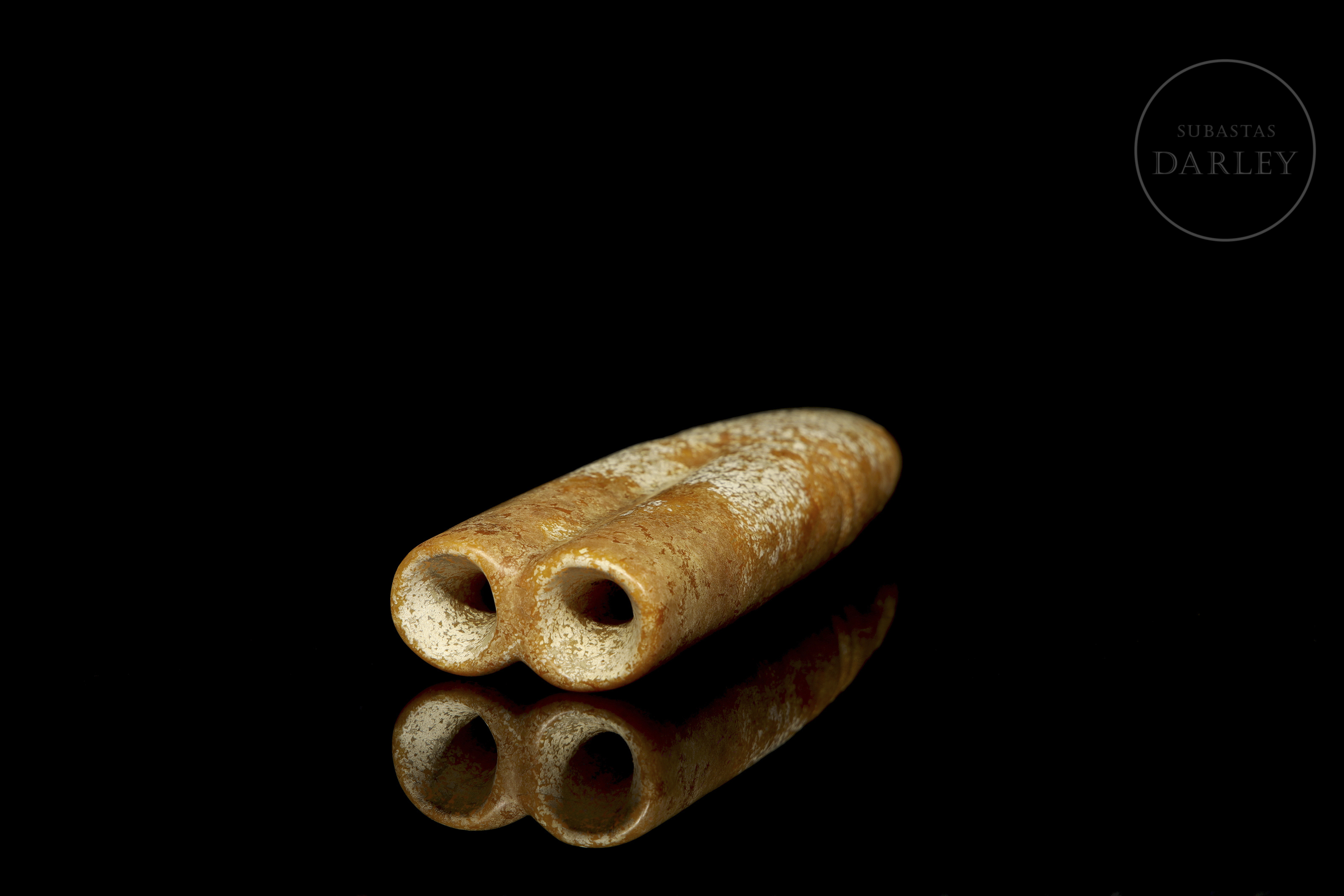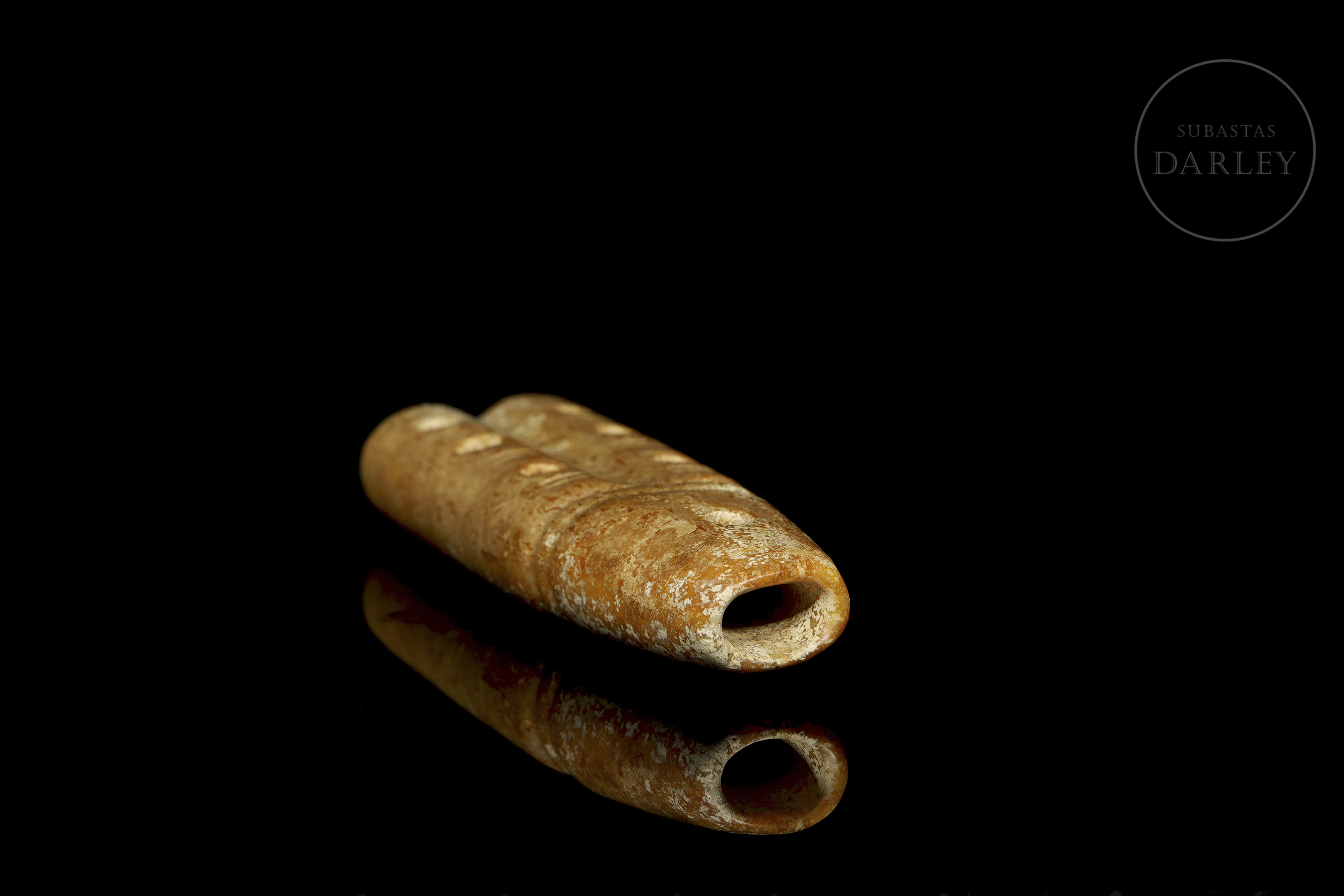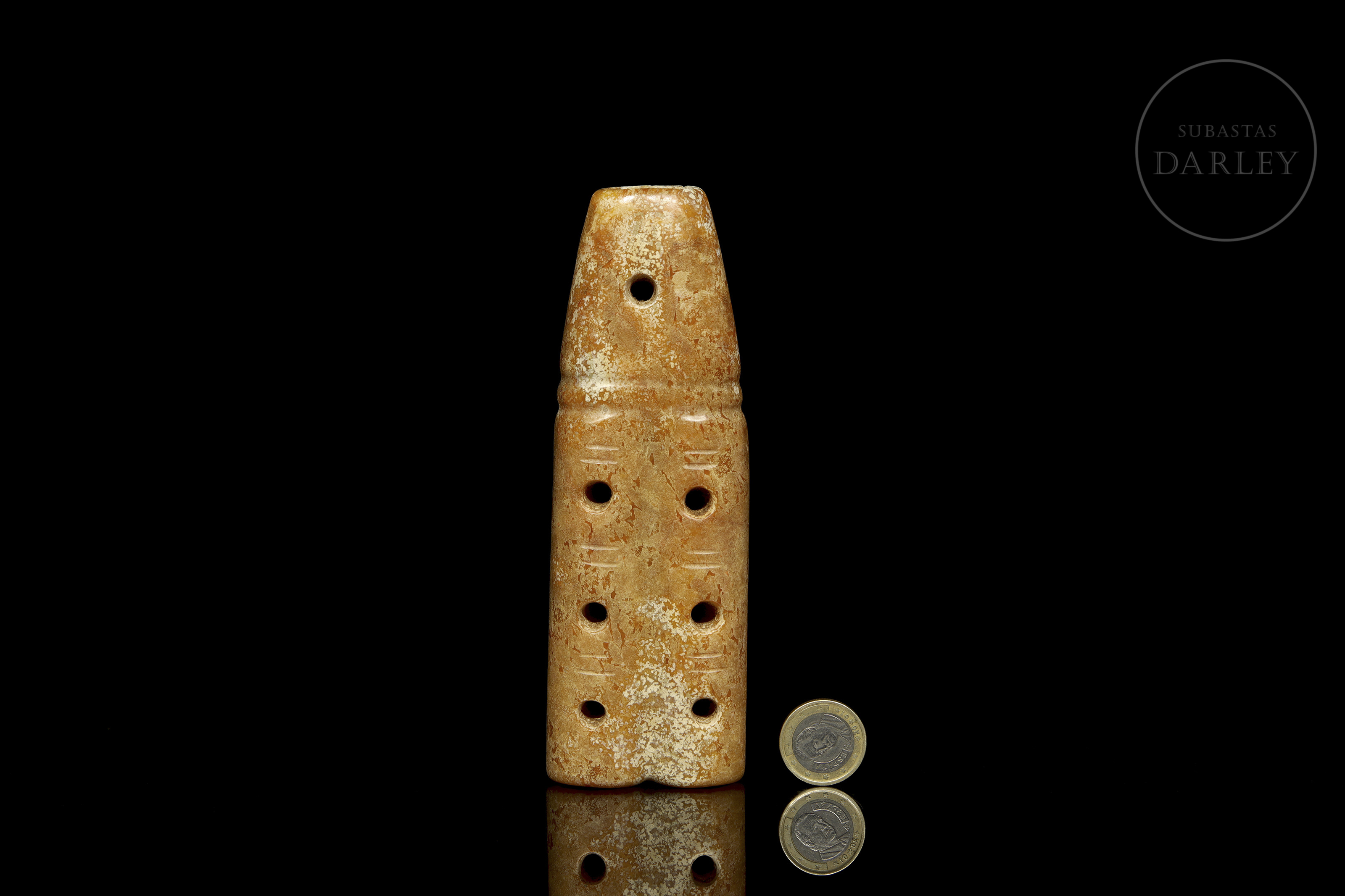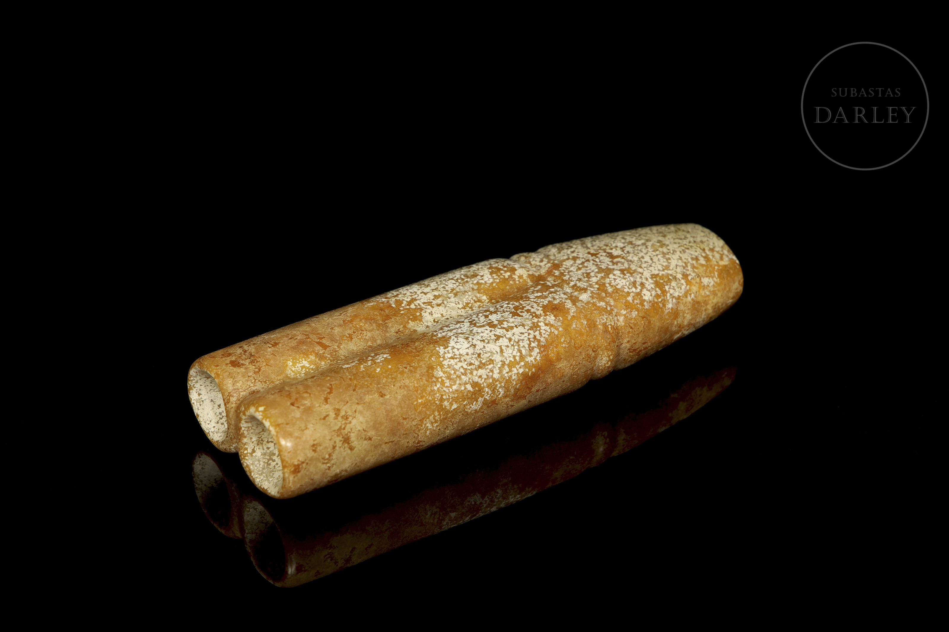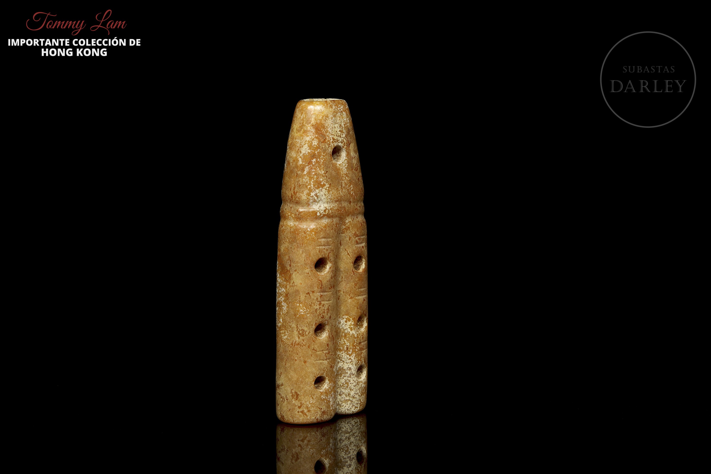 Pequeña flauta de jade tallado de color ámbar, con una marcada pátina en tonos ocres y rojizos. Muestra un cuerpo alargado de forma tubular doble, cónica en el extremo superior, rematada en la parte inferior por dos tubos huecos paralelos. Está decorada con dos líneas incisas horizontales que marcan la división de la pieza, además de múltiples perforaciones distribuidas verticalmente a lo largo del cuerpo (agujeros de digitación). Cultura Hongshan (4700 a.C. – 2900 a.C.).