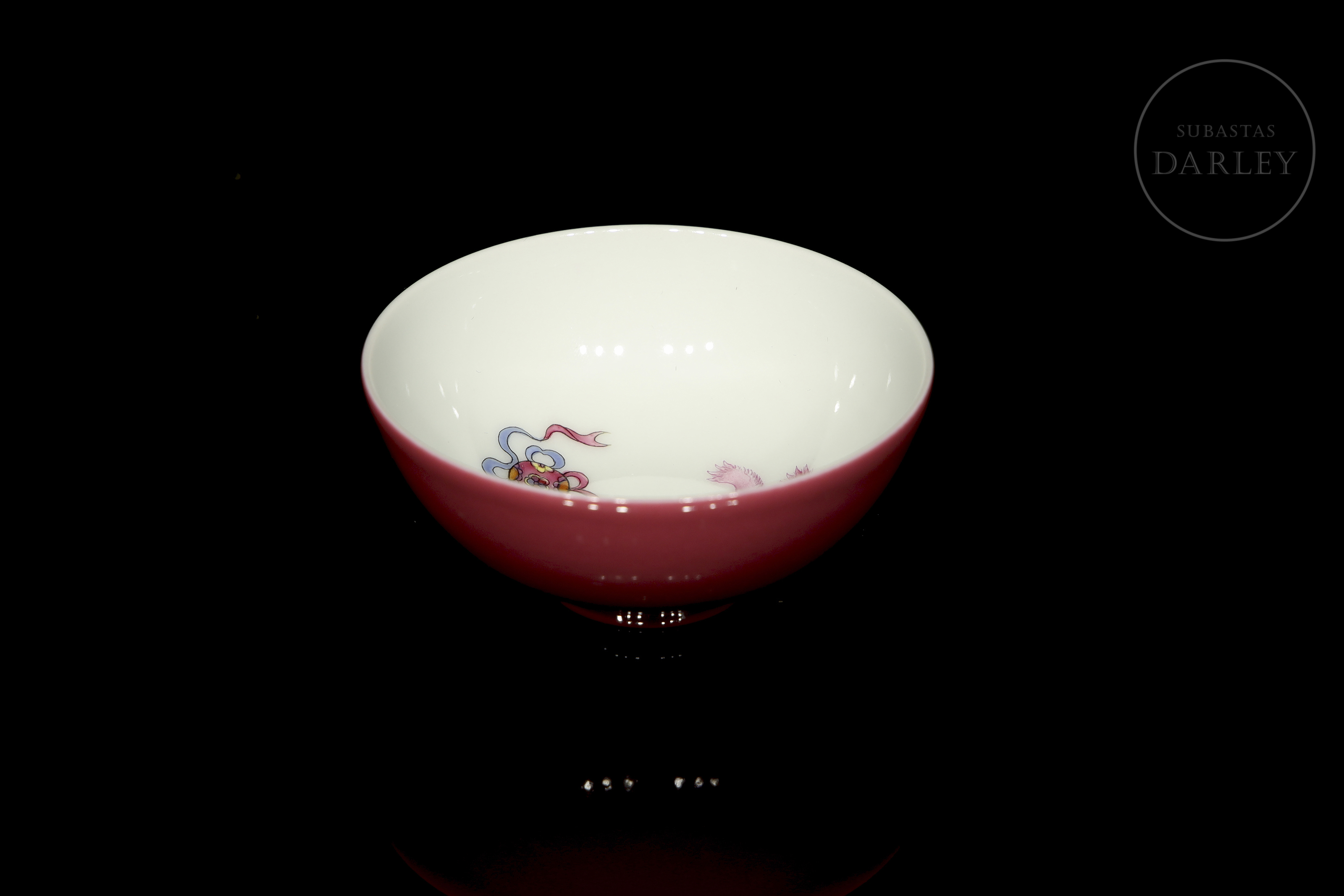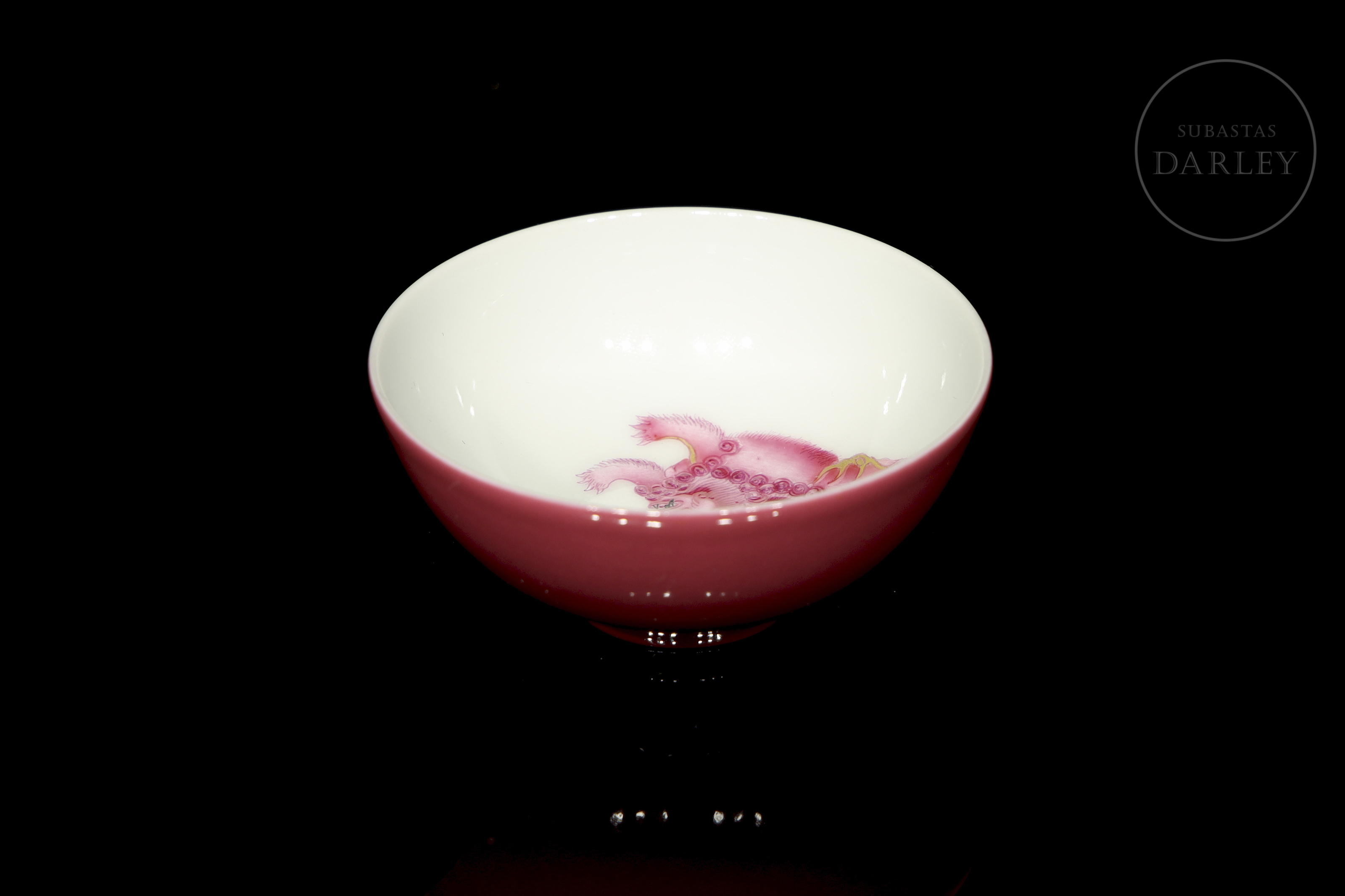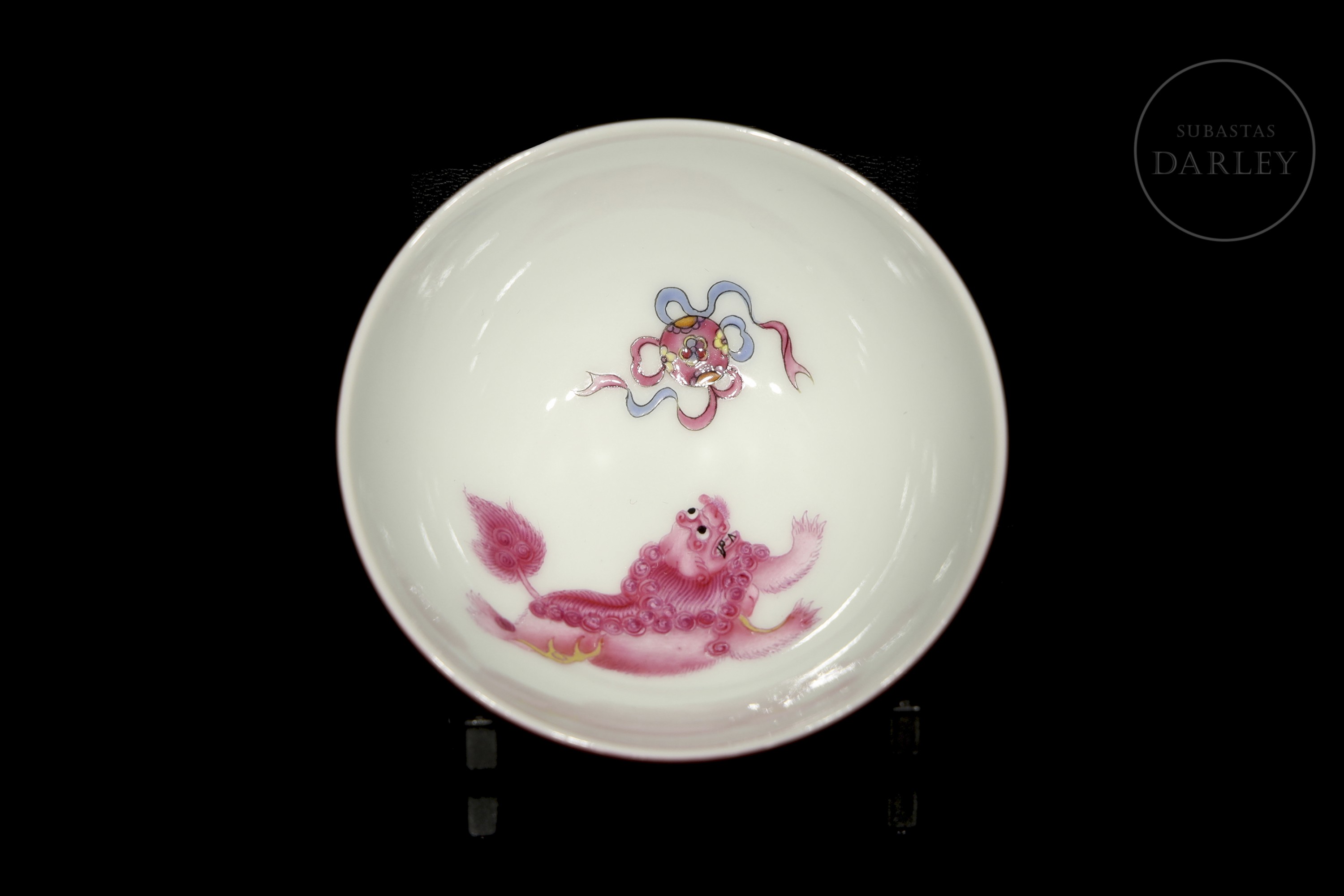 Porcelana esmaltada con decoración sobre vidriado en blanco y esmaltes "Familia Rosa". Posee un cuerpo circular y paredes acampanadas, asentado sobre un pie anular. Está decorada en su exterior con un fondo rosa vibrante, que contrasta con el interior blanco, adornado con el motivo de un león jugando con una bola. En la base se dispone un sello bajo vidriado "雍正年制" en azul.
