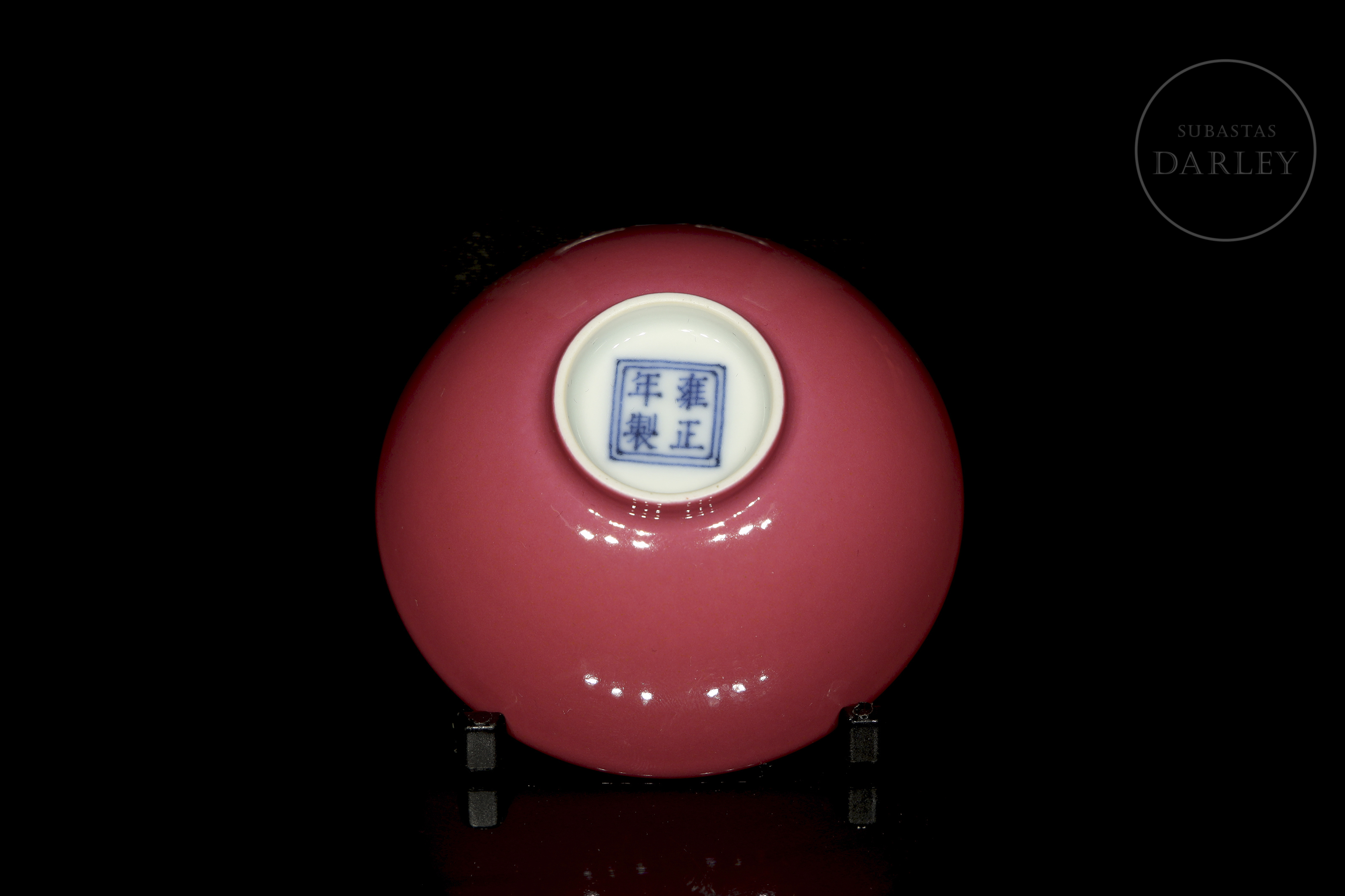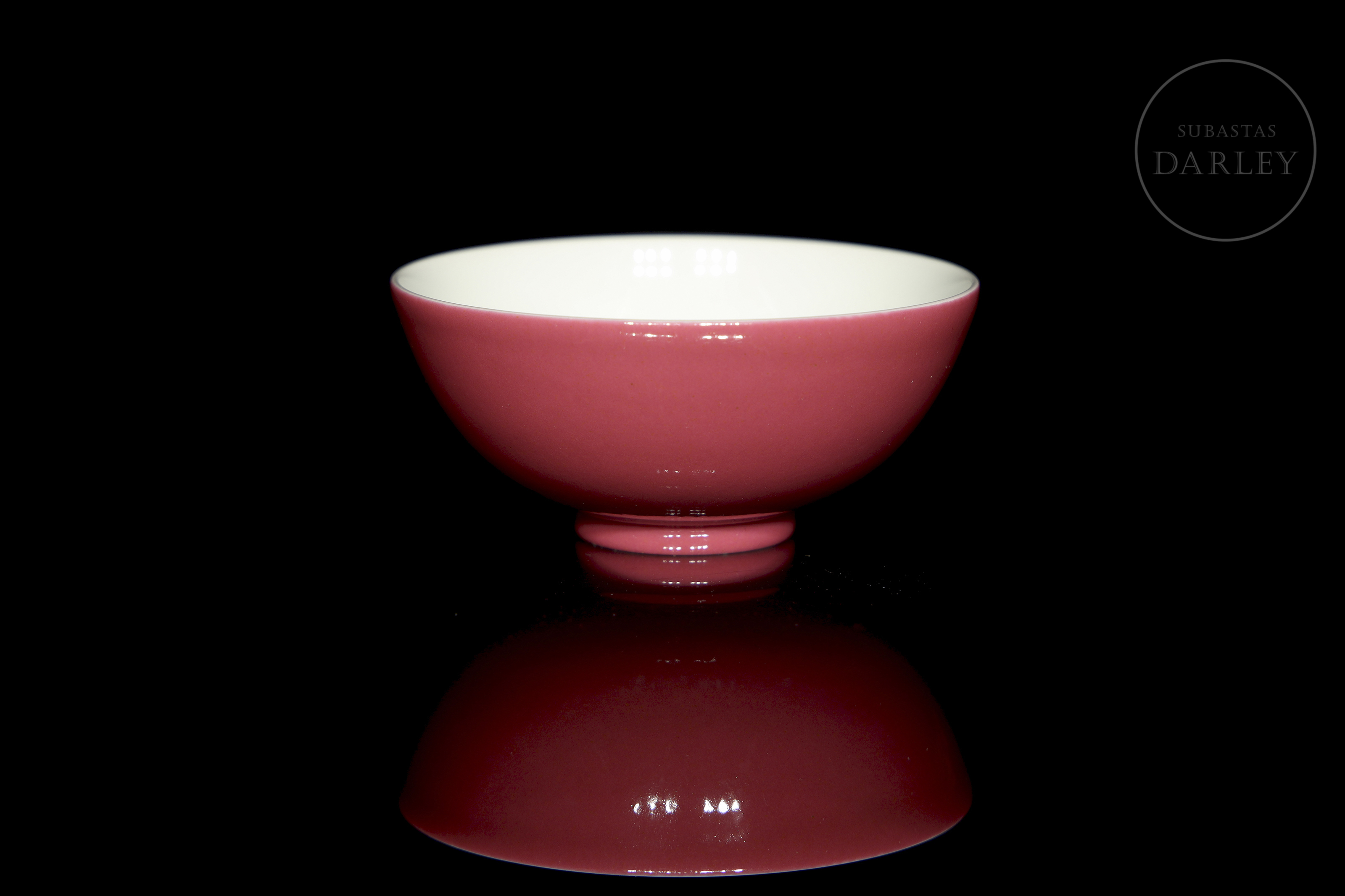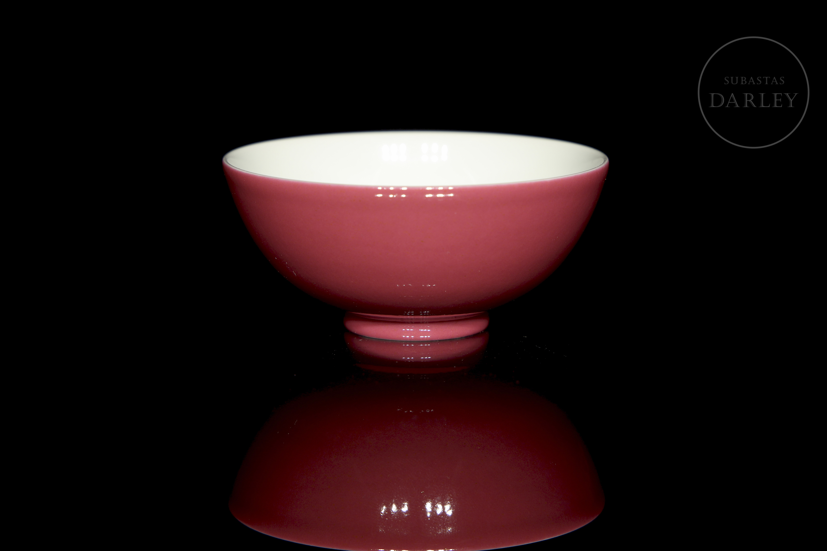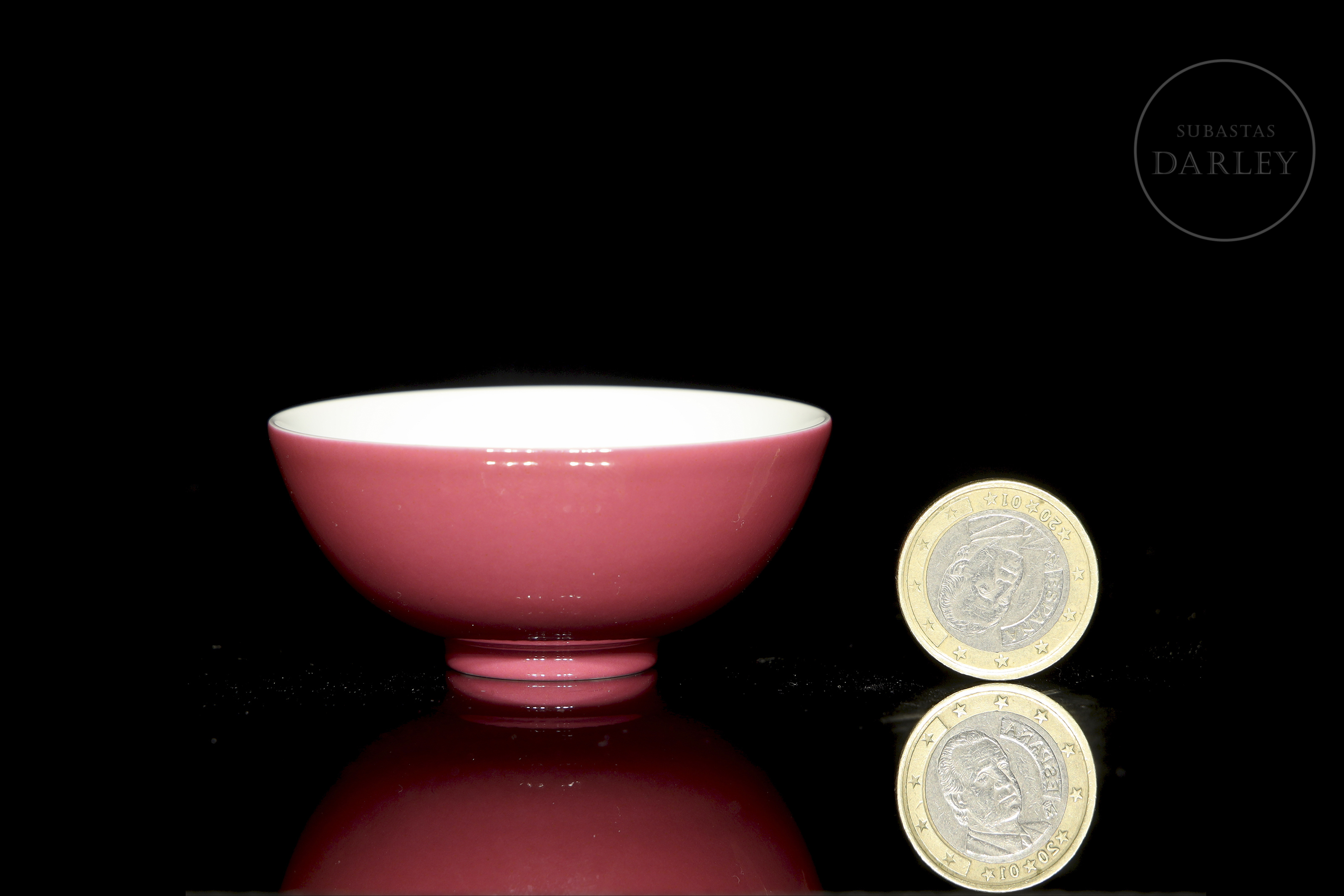 Porcelana esmaltada con decoración sobre vidriado en blanco y esmaltes "Familia Rosa". Posee un cuerpo circular y paredes acampanadas, asentado sobre un pie anular. Está decorada en su exterior con un fondo rosa vibrante, que contrasta con el interior blanco, adornado con el motivo de un león jugando con una bola. En la base se dispone un sello bajo vidriado "雍正年制" en azul.