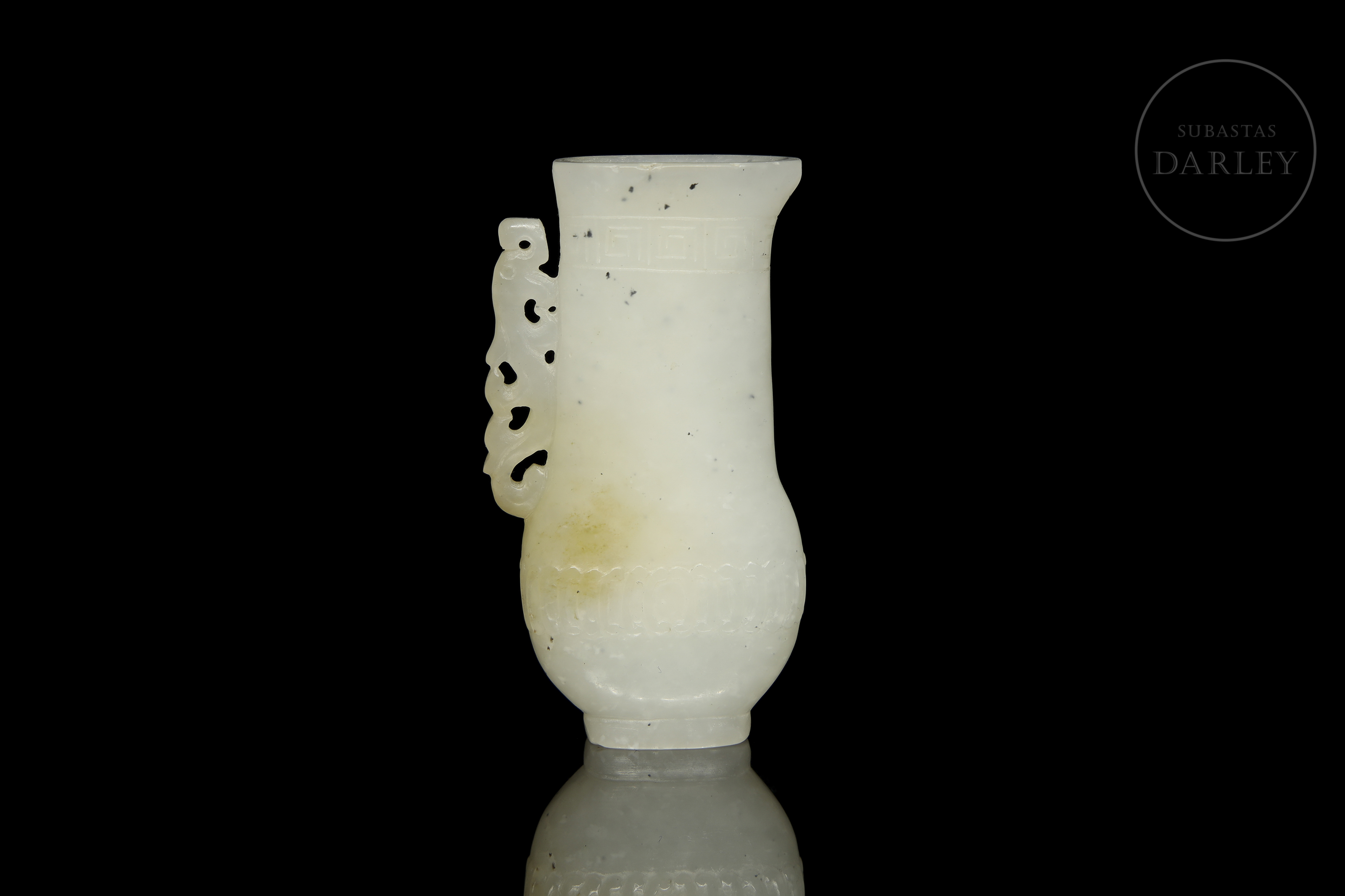 Jade blanco tallado con sutiles inclusiones oscuras. La obra presenta un formato inspirado en las antiguas vasijas rituales, con un cuerpo de perfil ovoide seguido de un esbelto cuello flanqueado por un asa calada y finalizado por una boca acampanada. La decoración muestra bandas decorativas de grecas incisas en el cuello y vientre. Dinastía Qing (1644–1911).