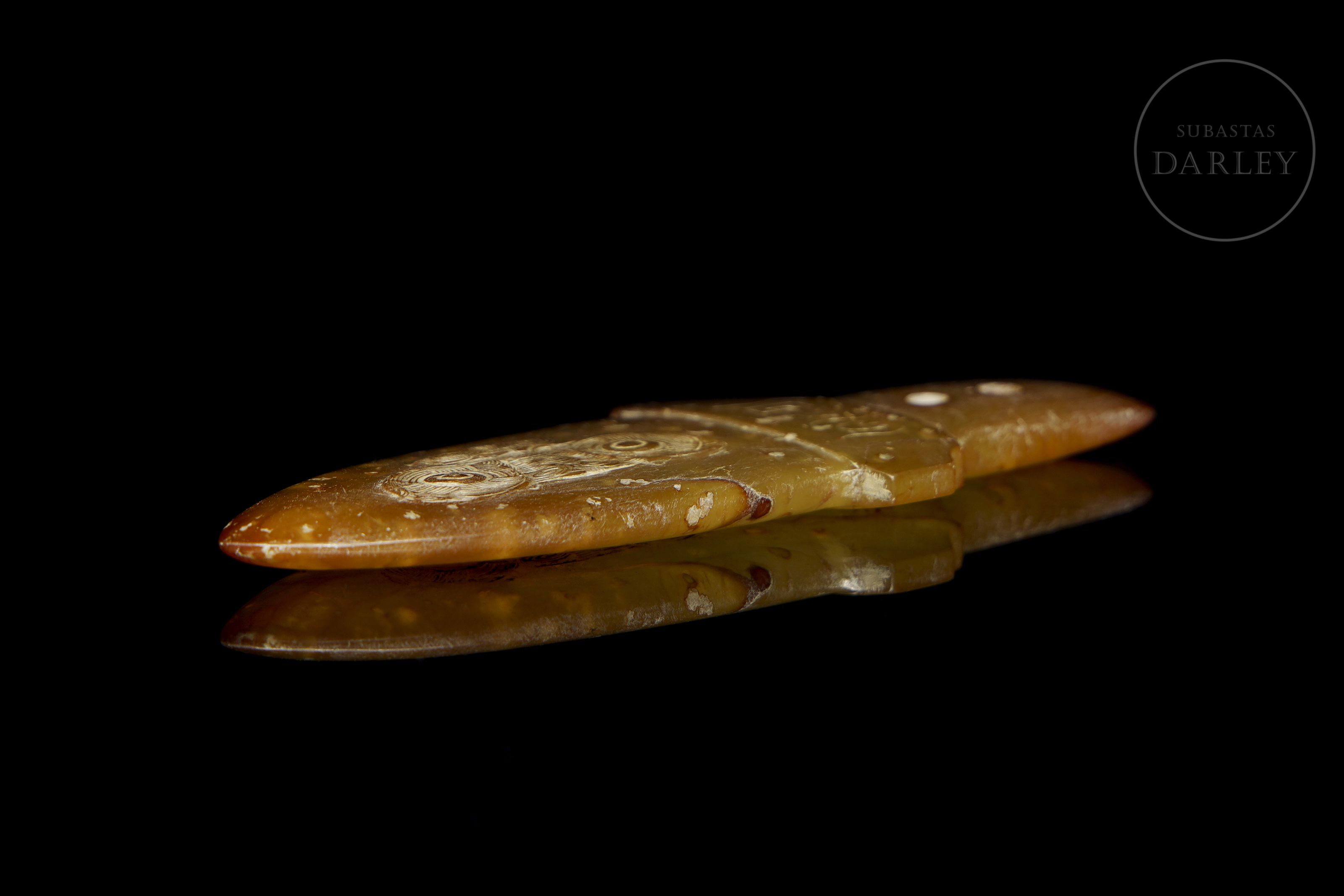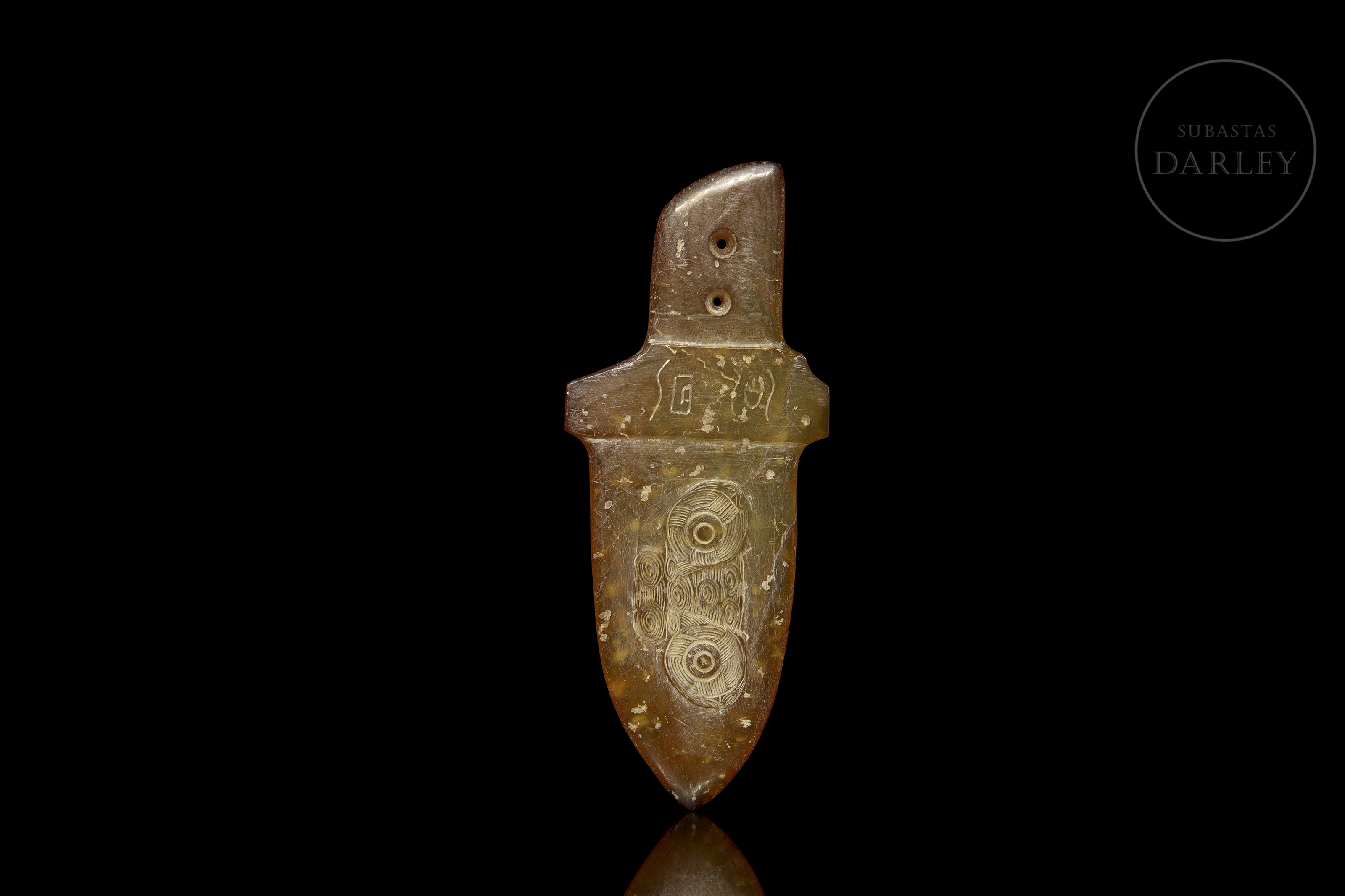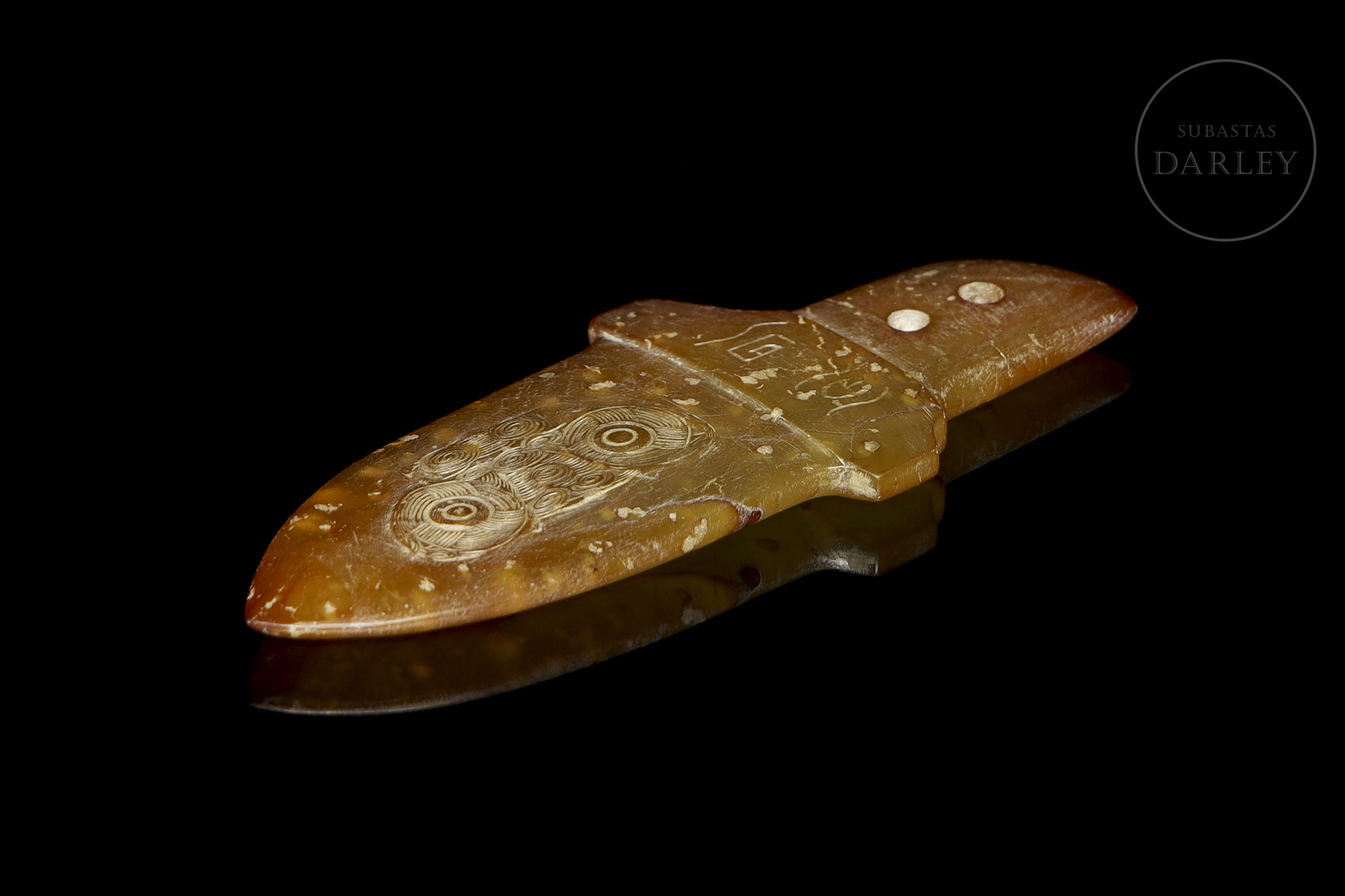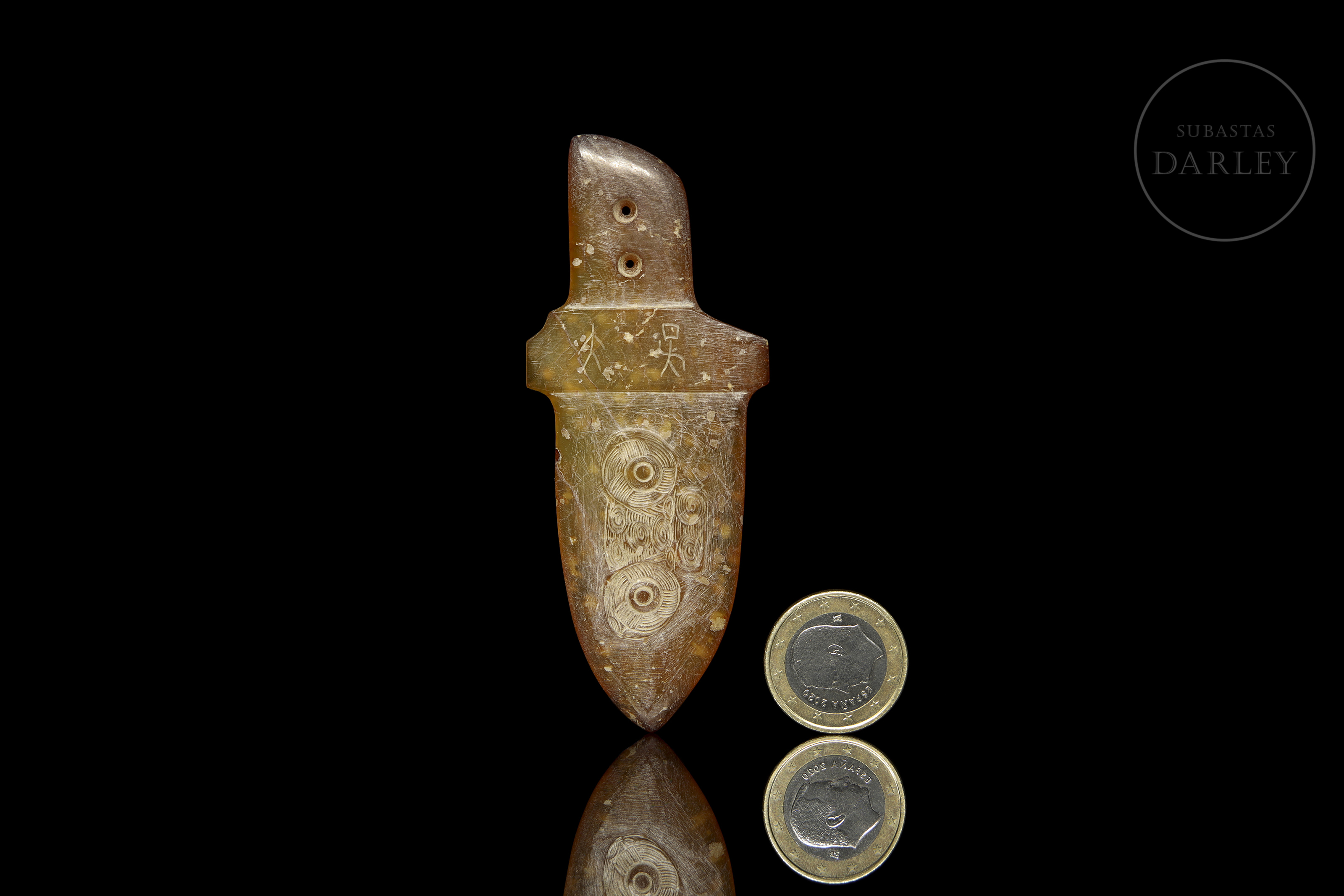 Pequeña placa de jade, tallada con la forma de un puñal ritual, de tono ocre ambarino con zonas rojizas. La hoja está decorada con finas incisiones que dibujan una máscara zoomorfa, con ojos circulares concéntricos y bandas de estrías finas. El mango presenta dos perforaciones cónicas para suspensión, y caracteres incisos esquemáticos. La pieza muestra pátina por antigüedad. Cultura Liangzhu (c. 3300-2300 a.C.) o posterior.