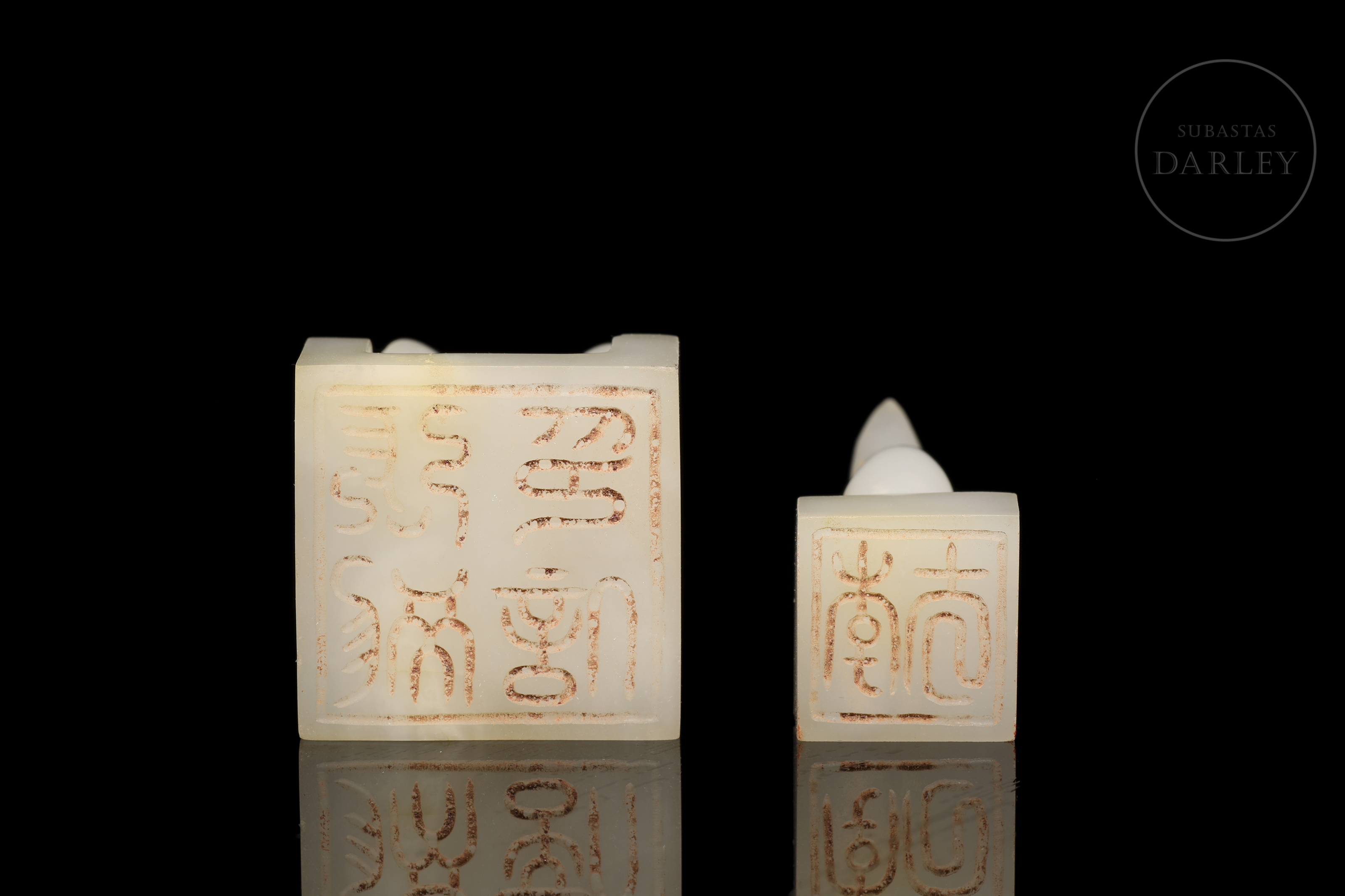 Pequeño sello de jade blanco compuesto por dos cuerpos que se unen formando un único sello de mayor tamaño.