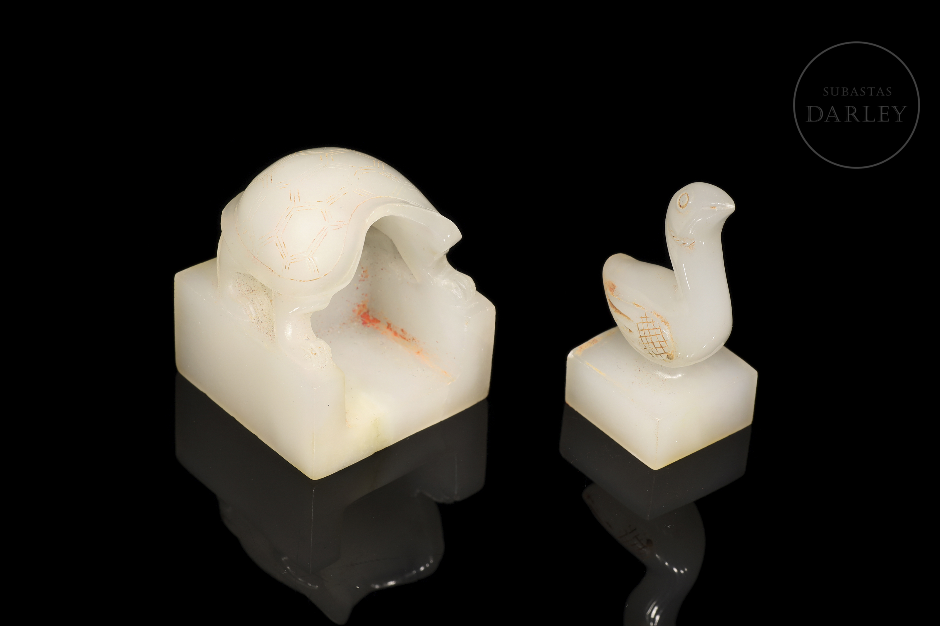 El sello de mayor tamaño tiene tallado en la parte superior el caparazón de una tortuga, que se asienta sobre sus cuatro patas. El interior de este caparazón se encuentra vacío, al igual que la propia estructura del sello, permitiendo así encajar una segunda pieza: un sello de menor tamaño que tiene tallado en su parte superior un ave realizada con gran detalle que muestra un pico, los ojos abiertos y las alas recogidas sobre el cuerpo.
