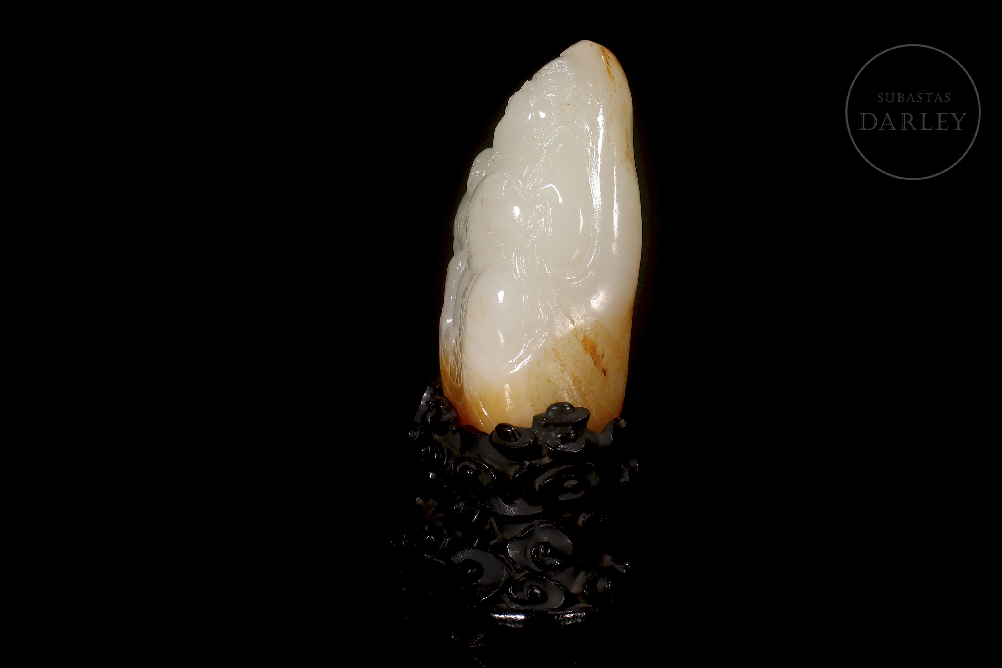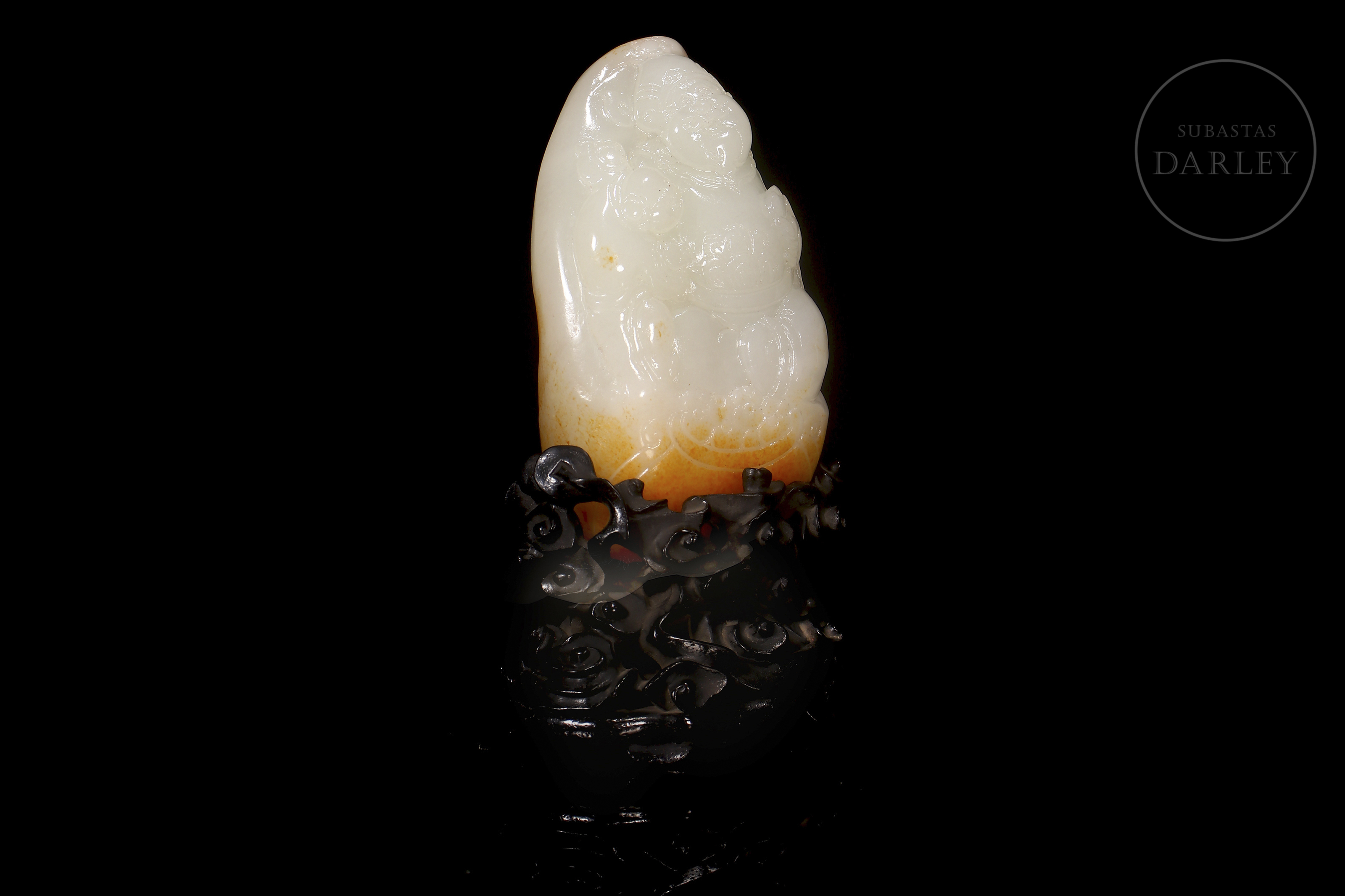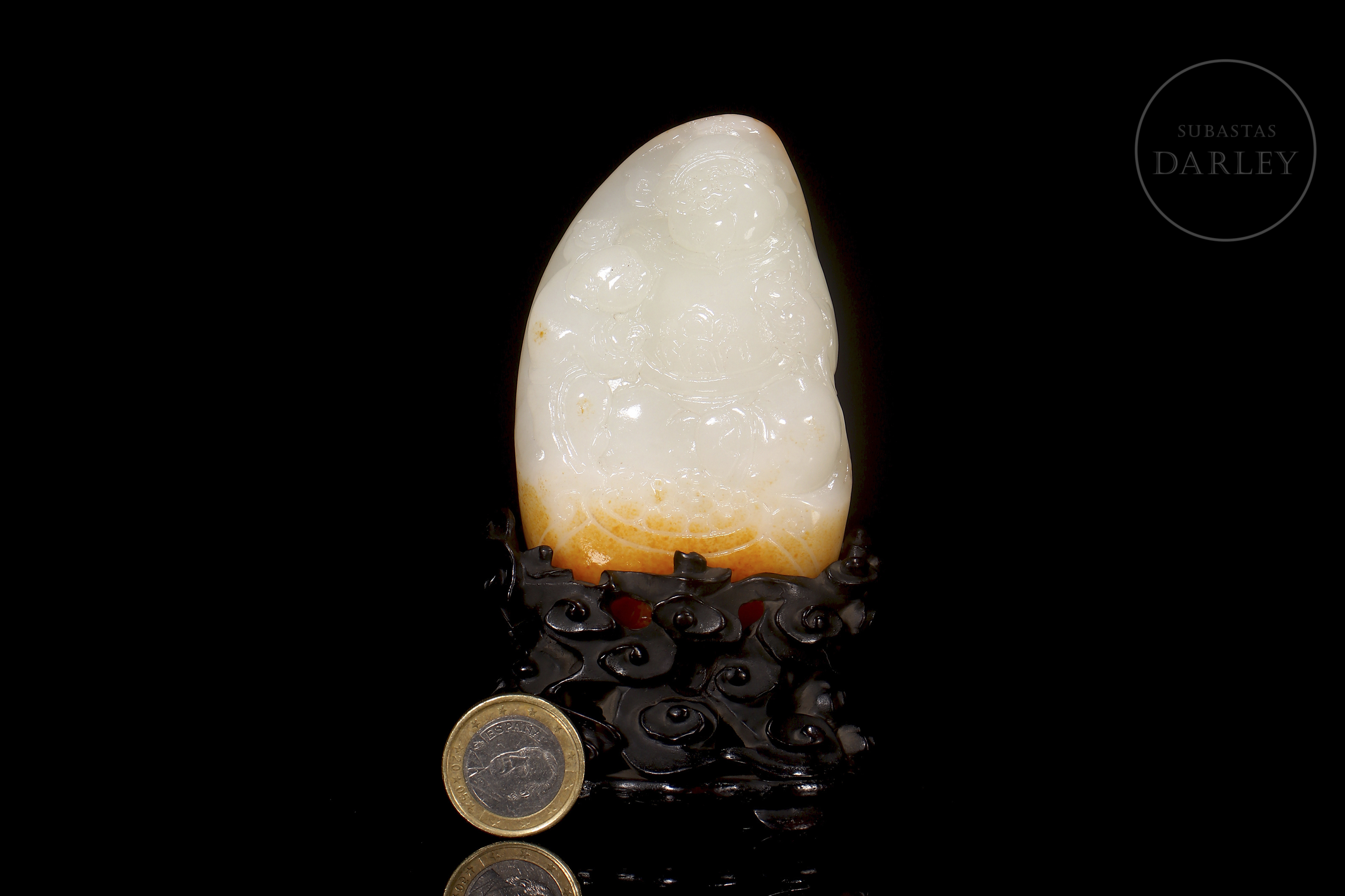 Canto de jade blanco con suaves vetas ocres en la base, tallado en relieve con la representación de un Buda sonriente en posición sedente, acompañado de un niño a su lado. Se presenta con un soporte tallado en madera oscura de motivo ondulante. Con caja a medida forrada en tela.