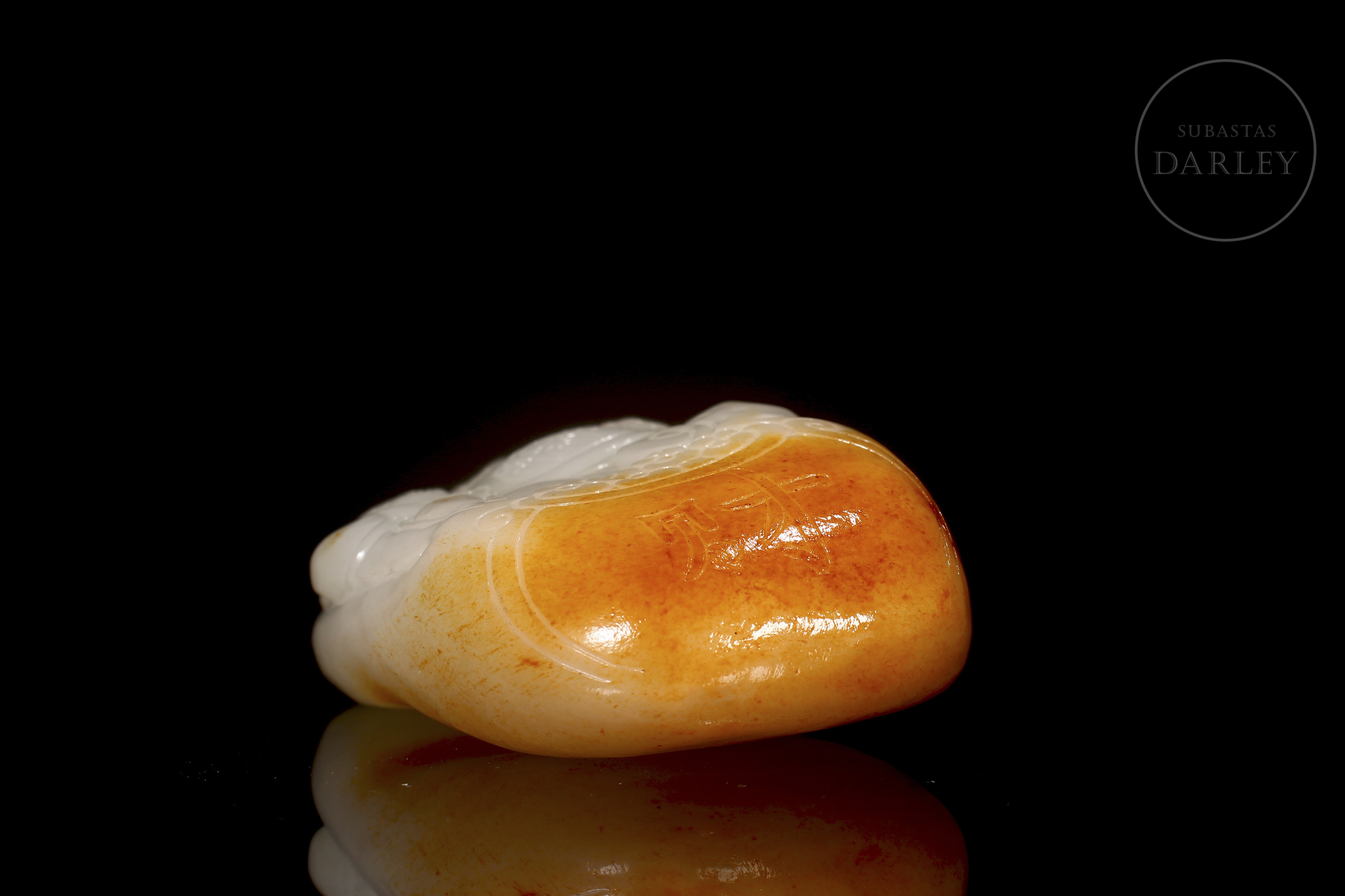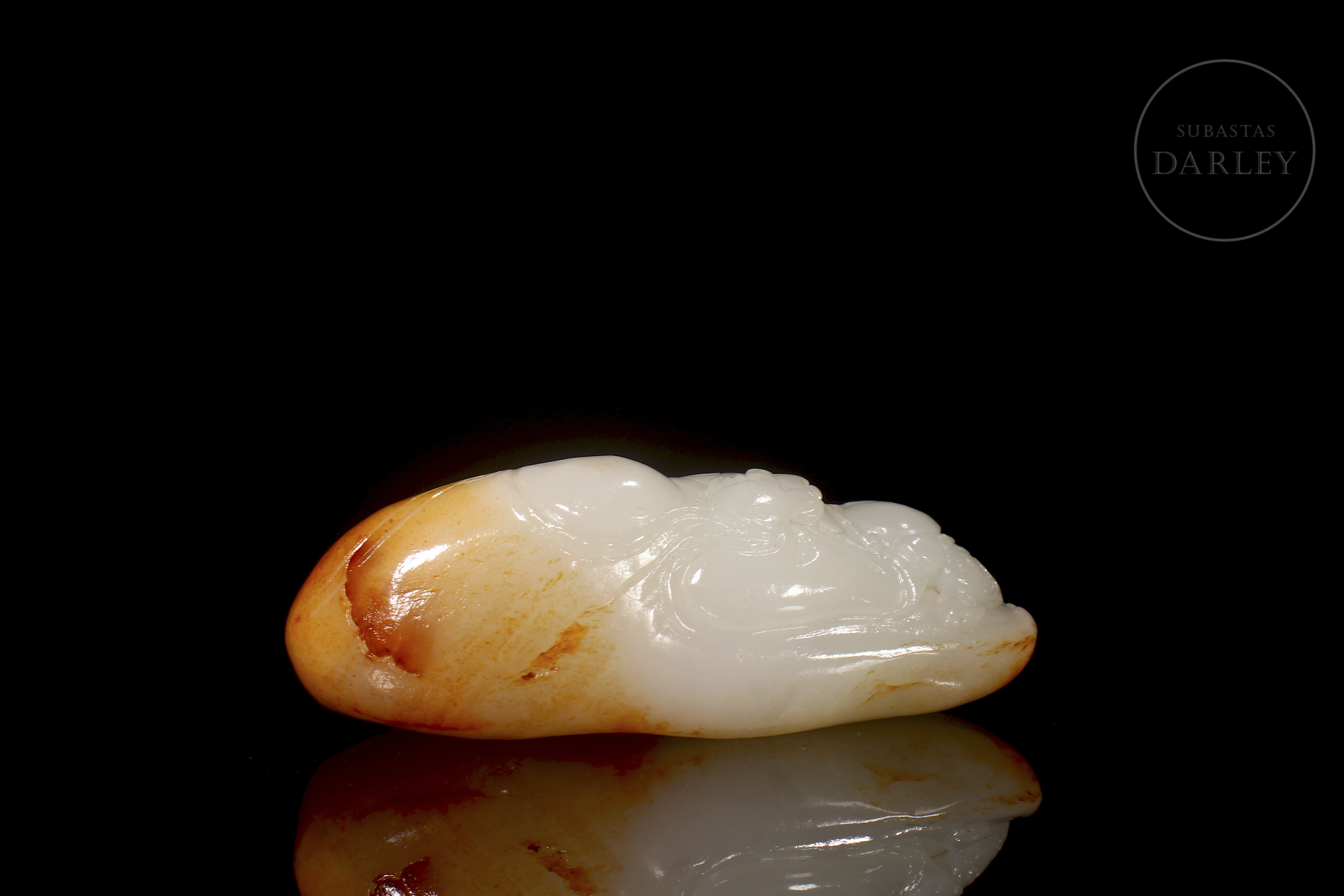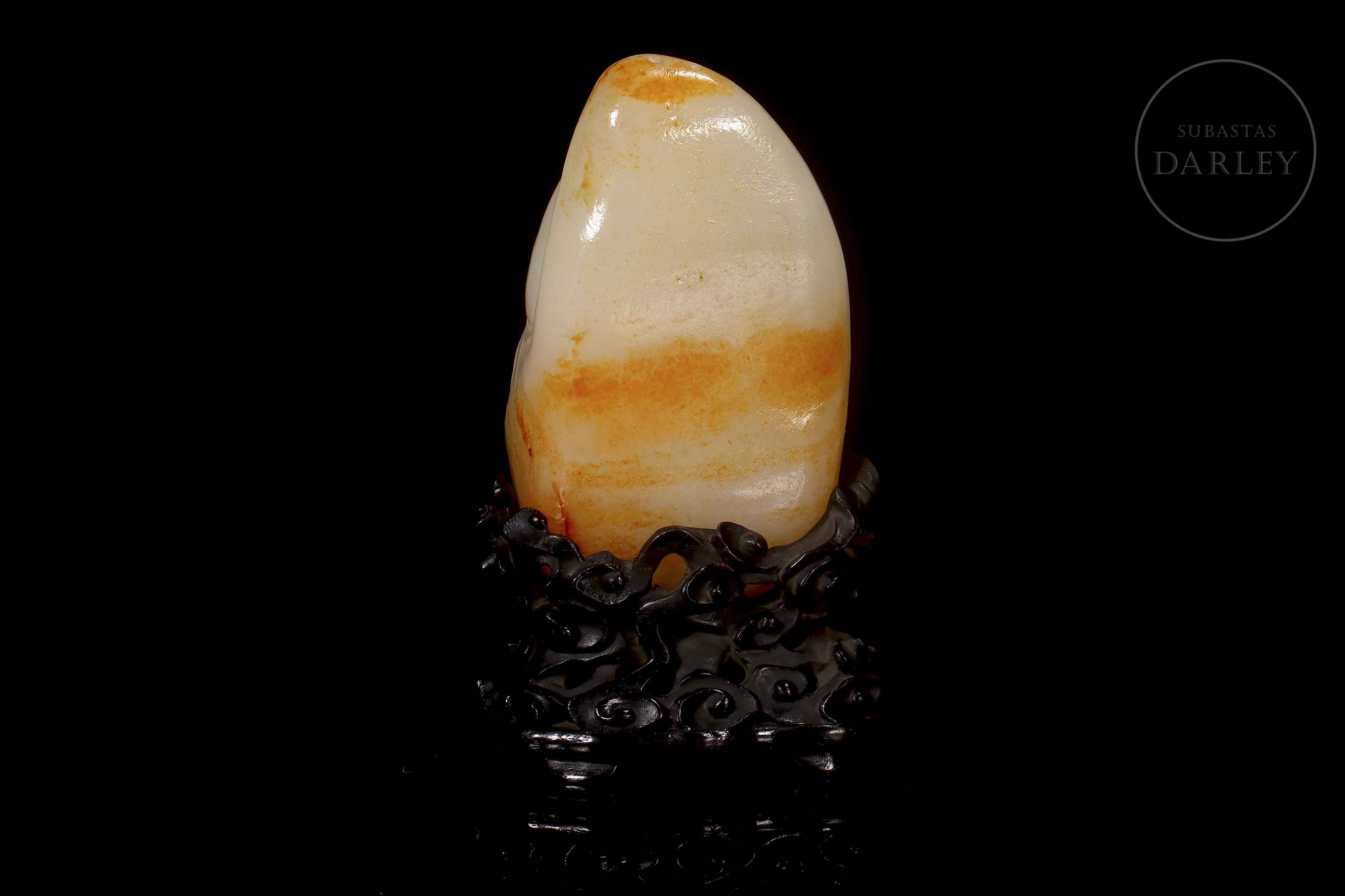Canto de jade blanco con suaves vetas ocres en la base, tallado en relieve con la representación de un Buda sonriente en posición sedente, acompañado de un niño a su lado. Se presenta con un soporte tallado en madera oscura de motivo ondulante. Con caja a medida forrada en tela.