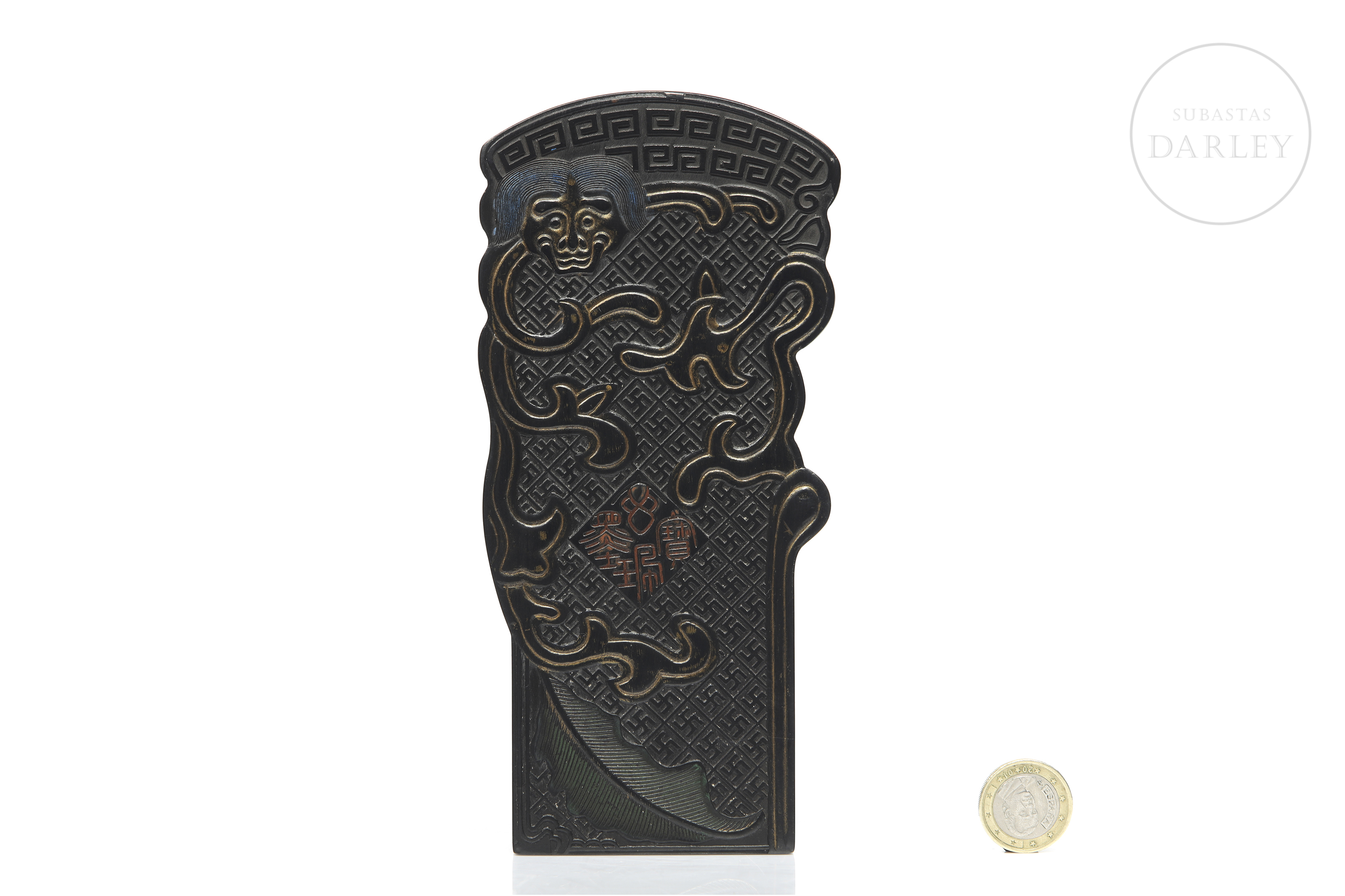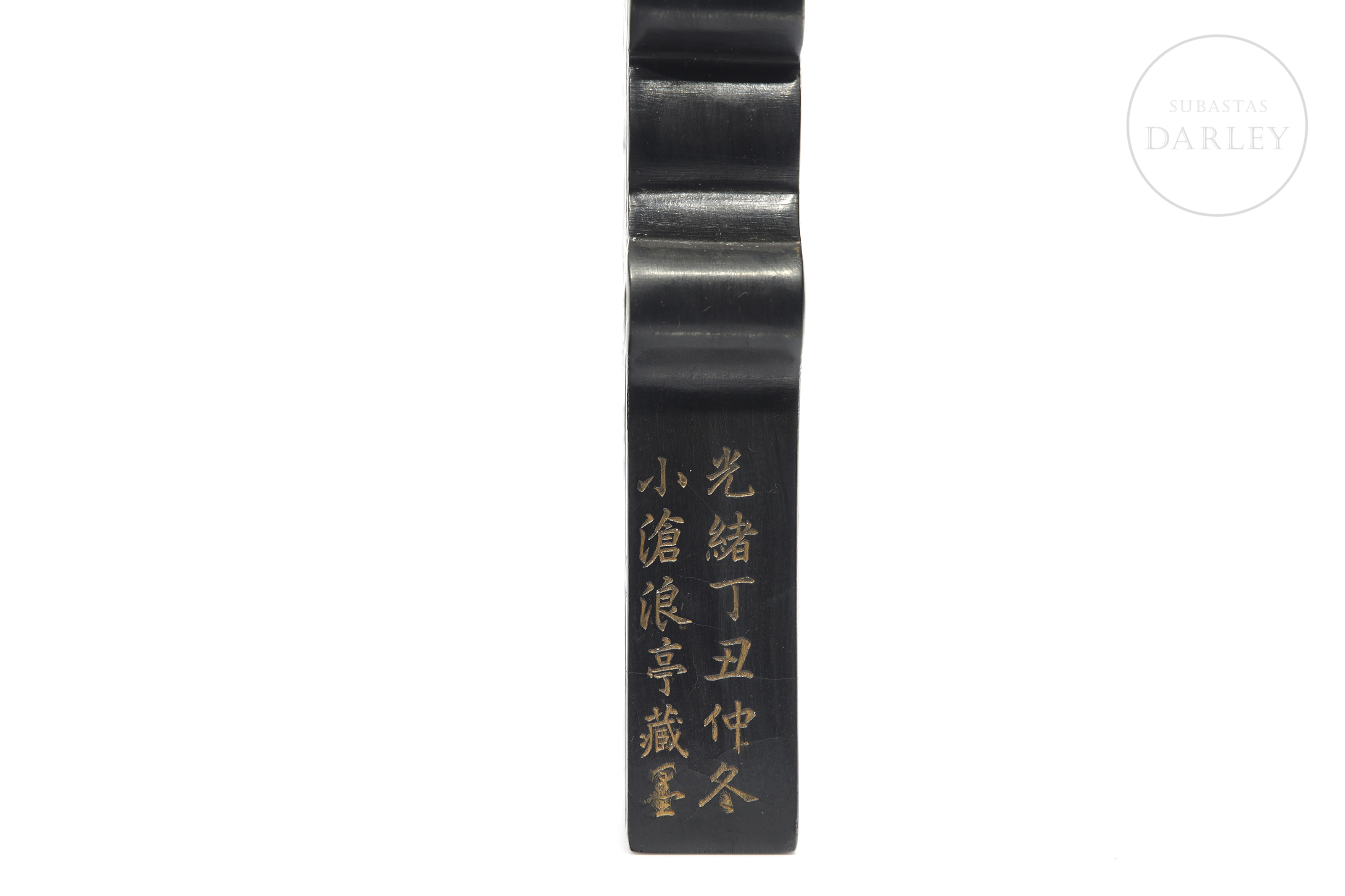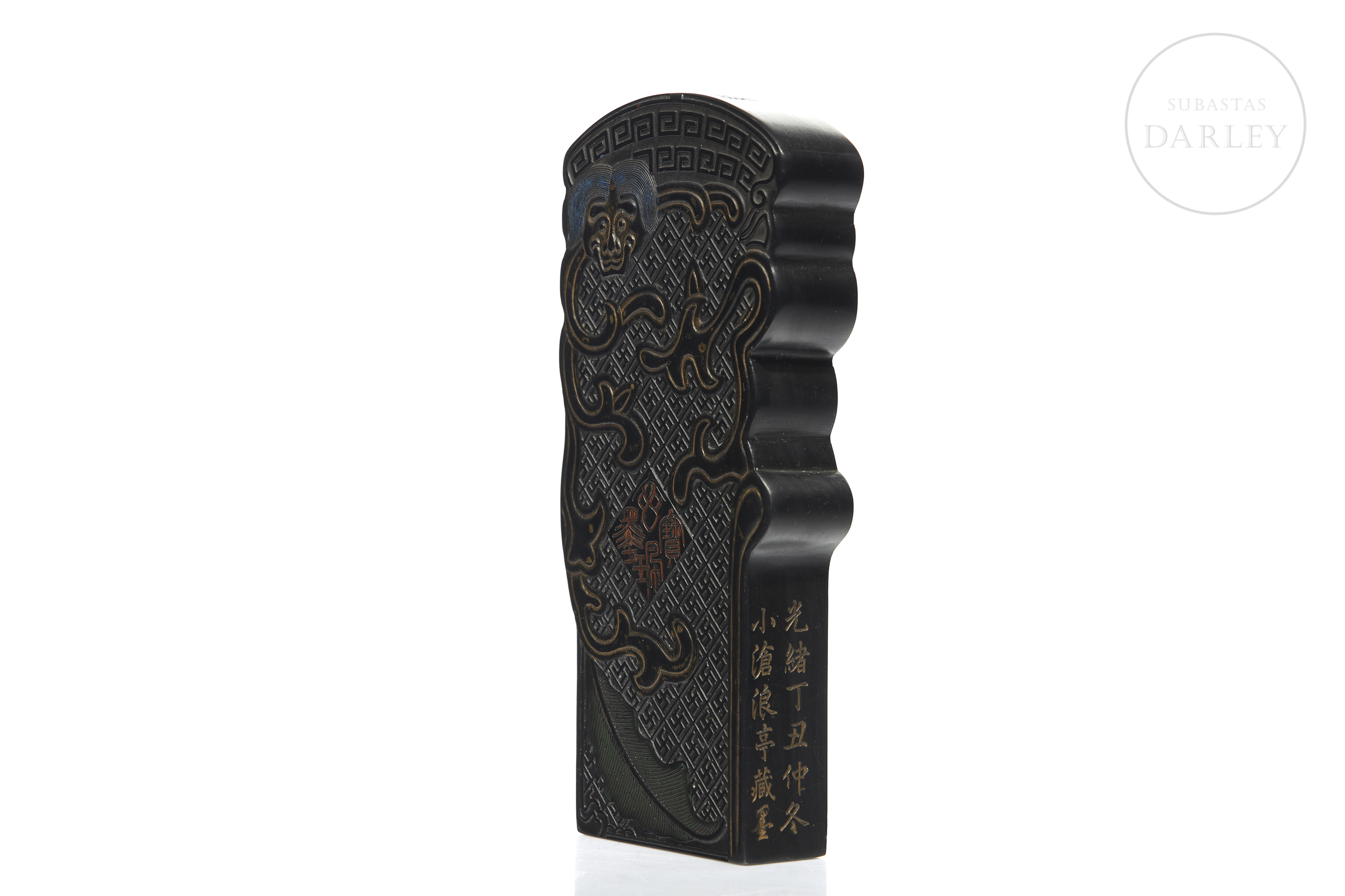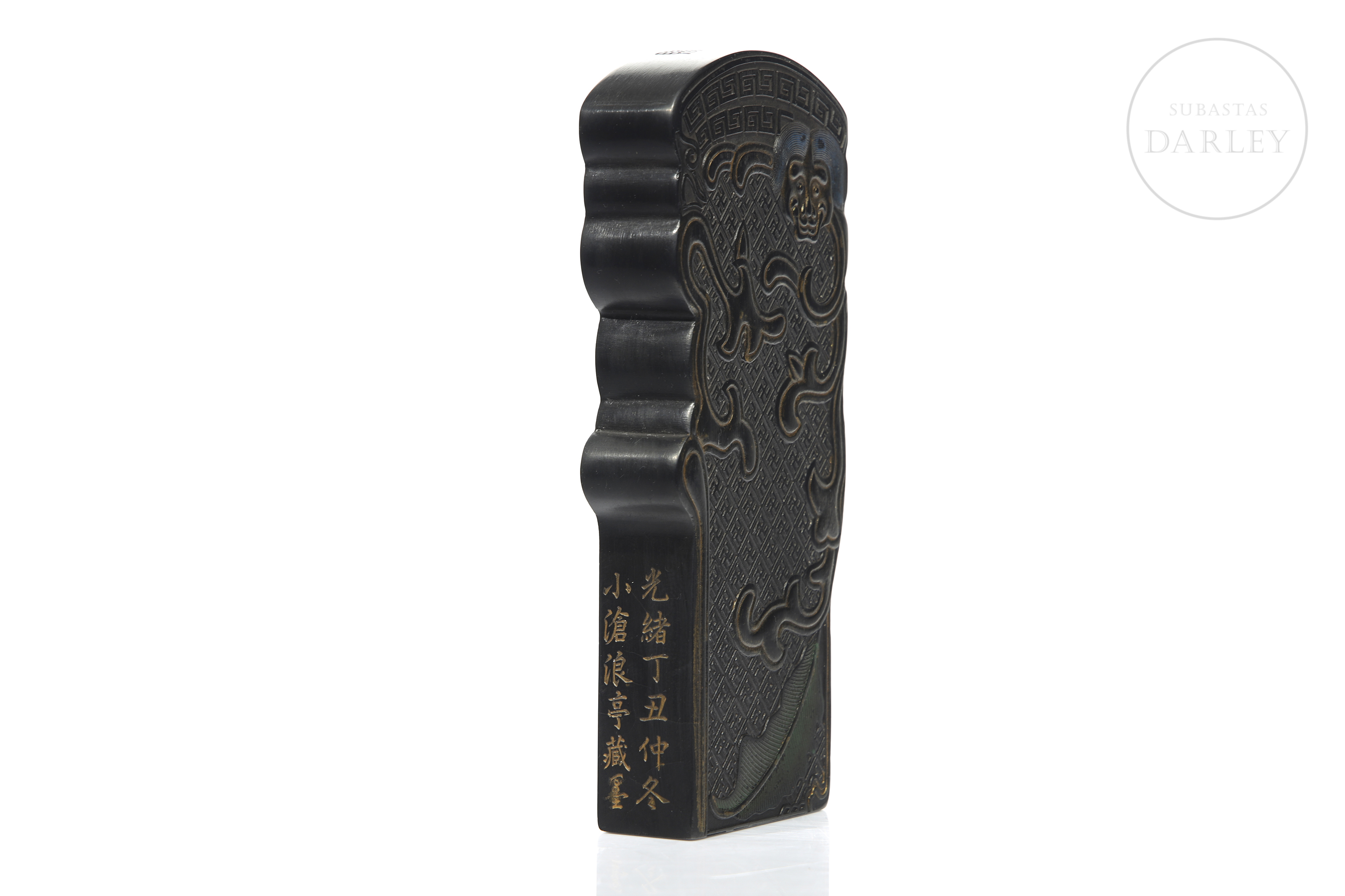 Pieza de tinta con forma rectangular y bordes recortados. Se encuentra decorada con relieves tallados, policromía y dorados. Los relieves muestran dragones estilo Han, cenefas de grecas, una cartela central con un sello en su interior y un fondo de rombos que rodean símbolos budistas. Presenta inscripciones talladas: "光緒丁丑仲冬 / 小滄浪亭藏墨" y "微州休城胡開文 / 按古法十萬杵造".