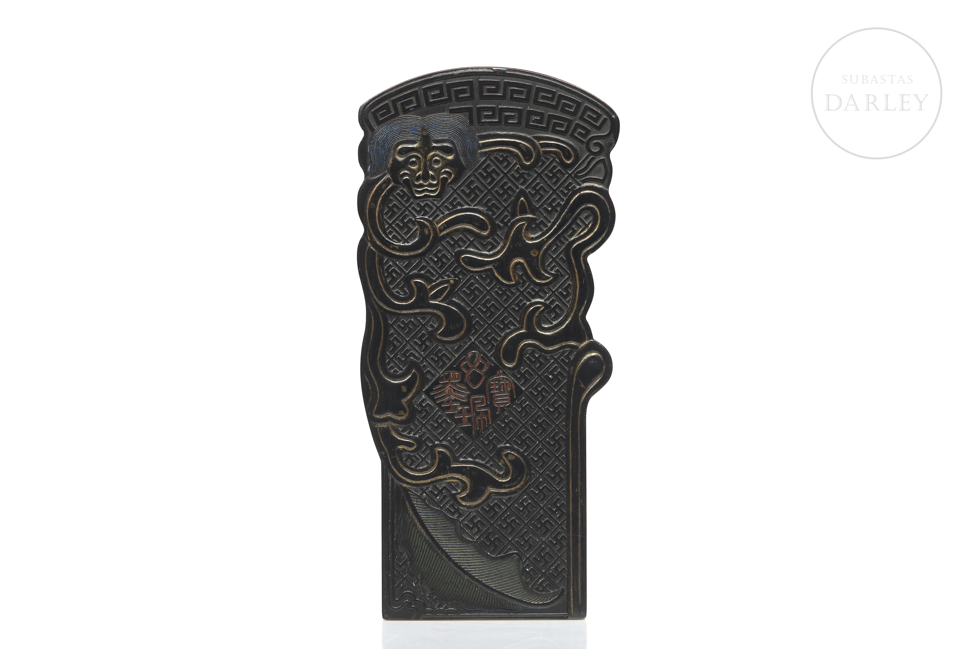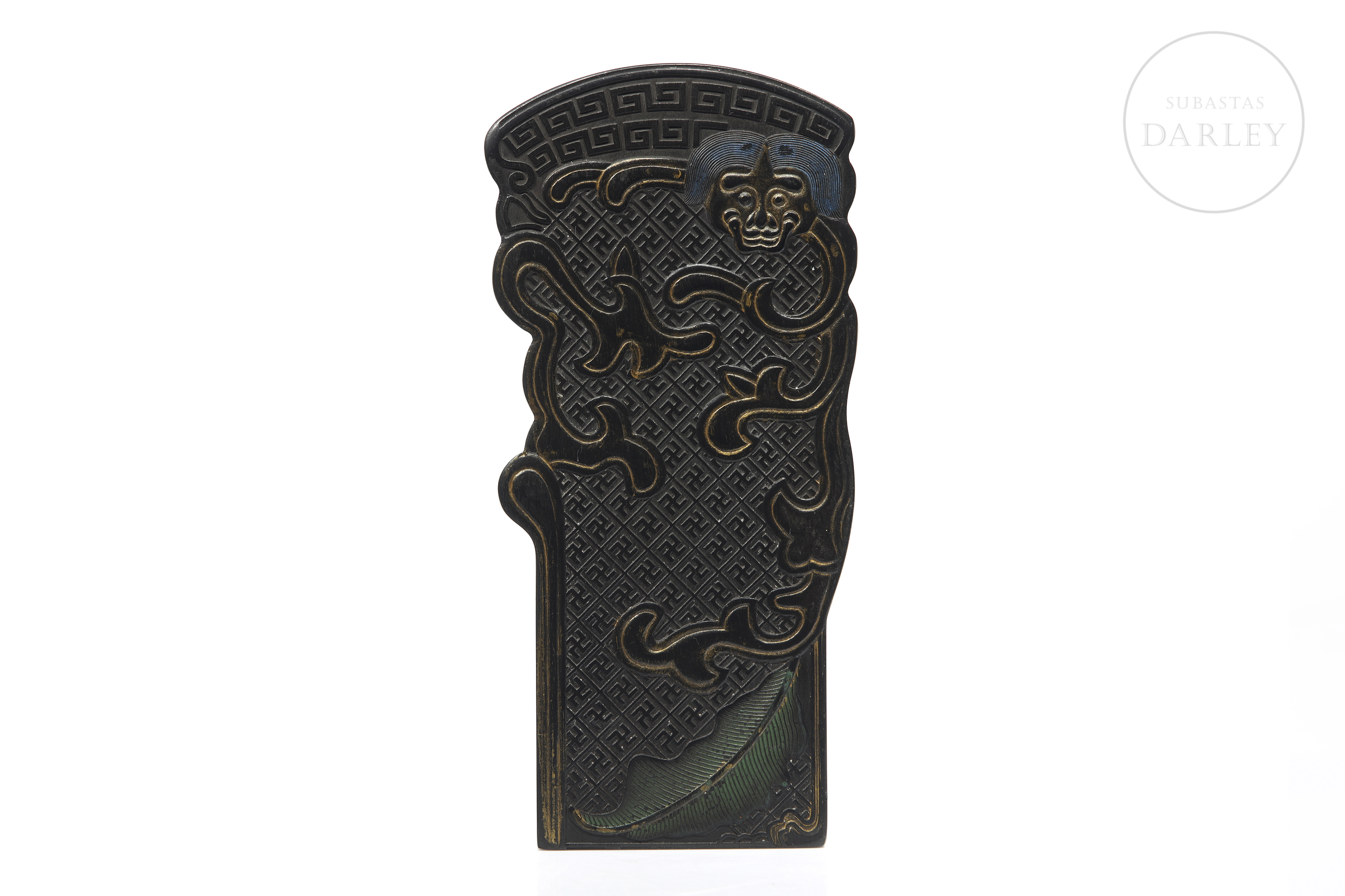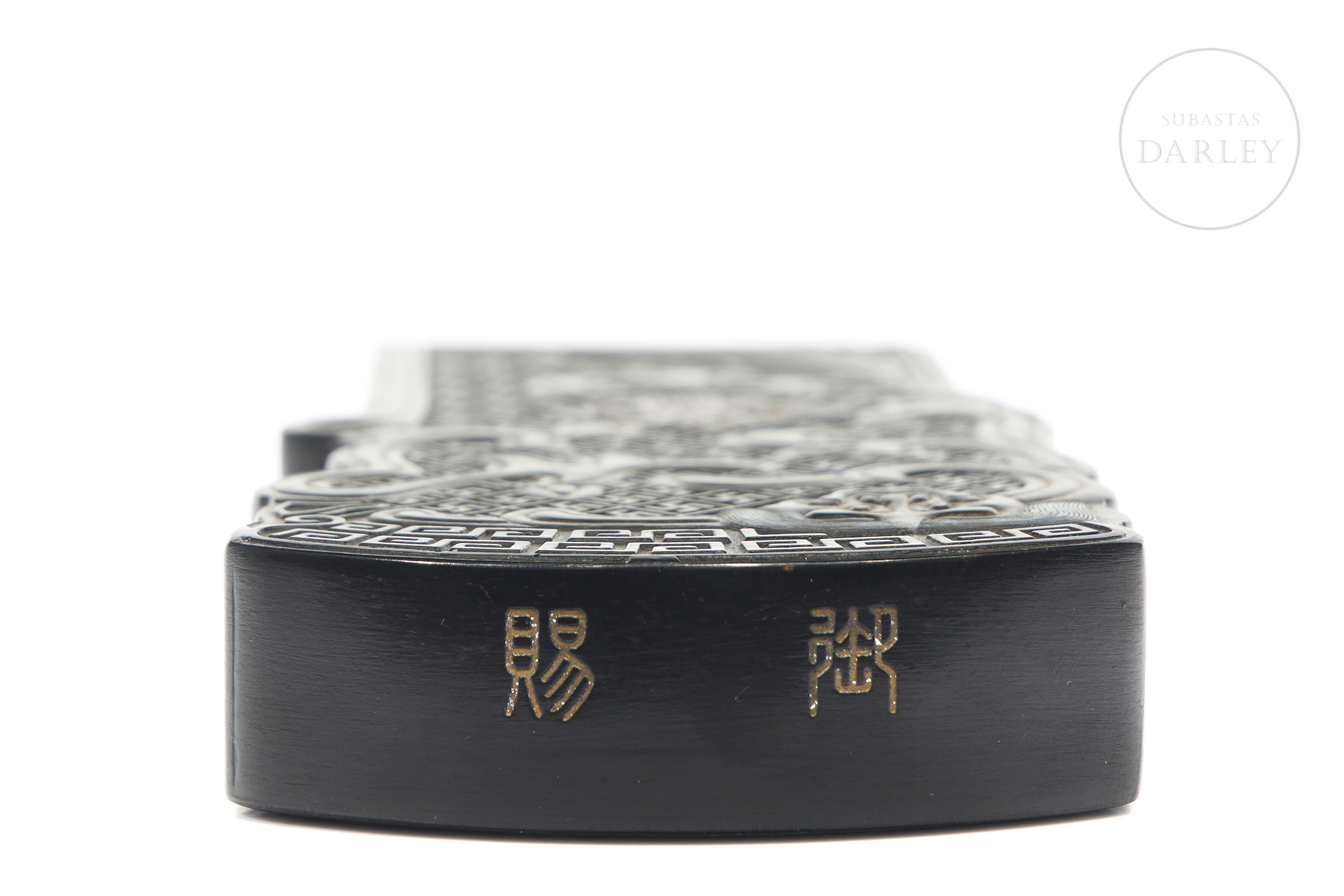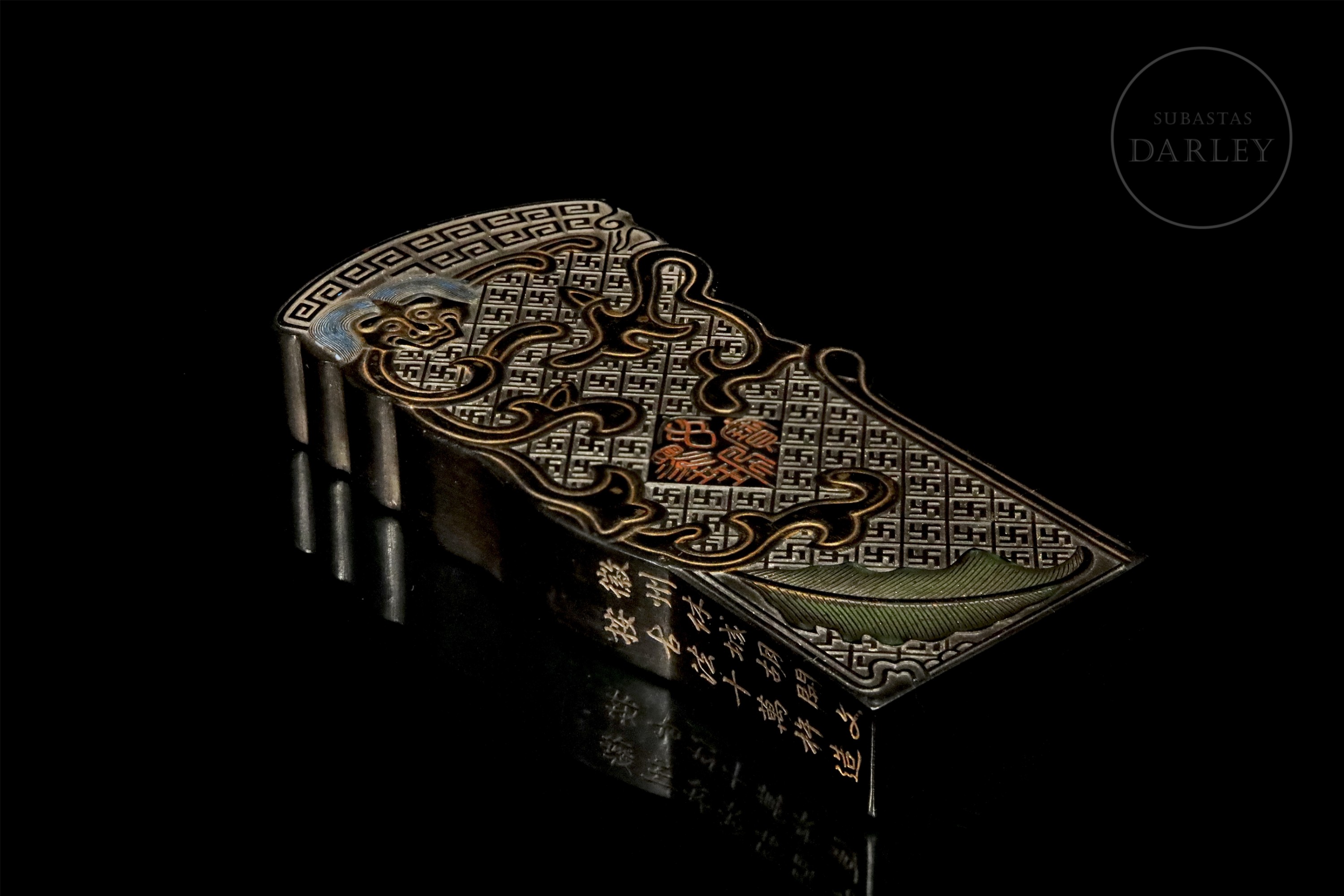 Pieza de tinta con forma rectangular y bordes recortados. Se encuentra decorada con relieves tallados, policromía y dorados. Los relieves muestran dragones estilo Han, cenefas de grecas, una cartela central con un sello en su interior y un fondo de rombos que rodean símbolos budistas. Presenta inscripciones talladas: "光緒丁丑仲冬 / 小滄浪亭藏墨" y "微州休城胡開文 / 按古法十萬杵造".