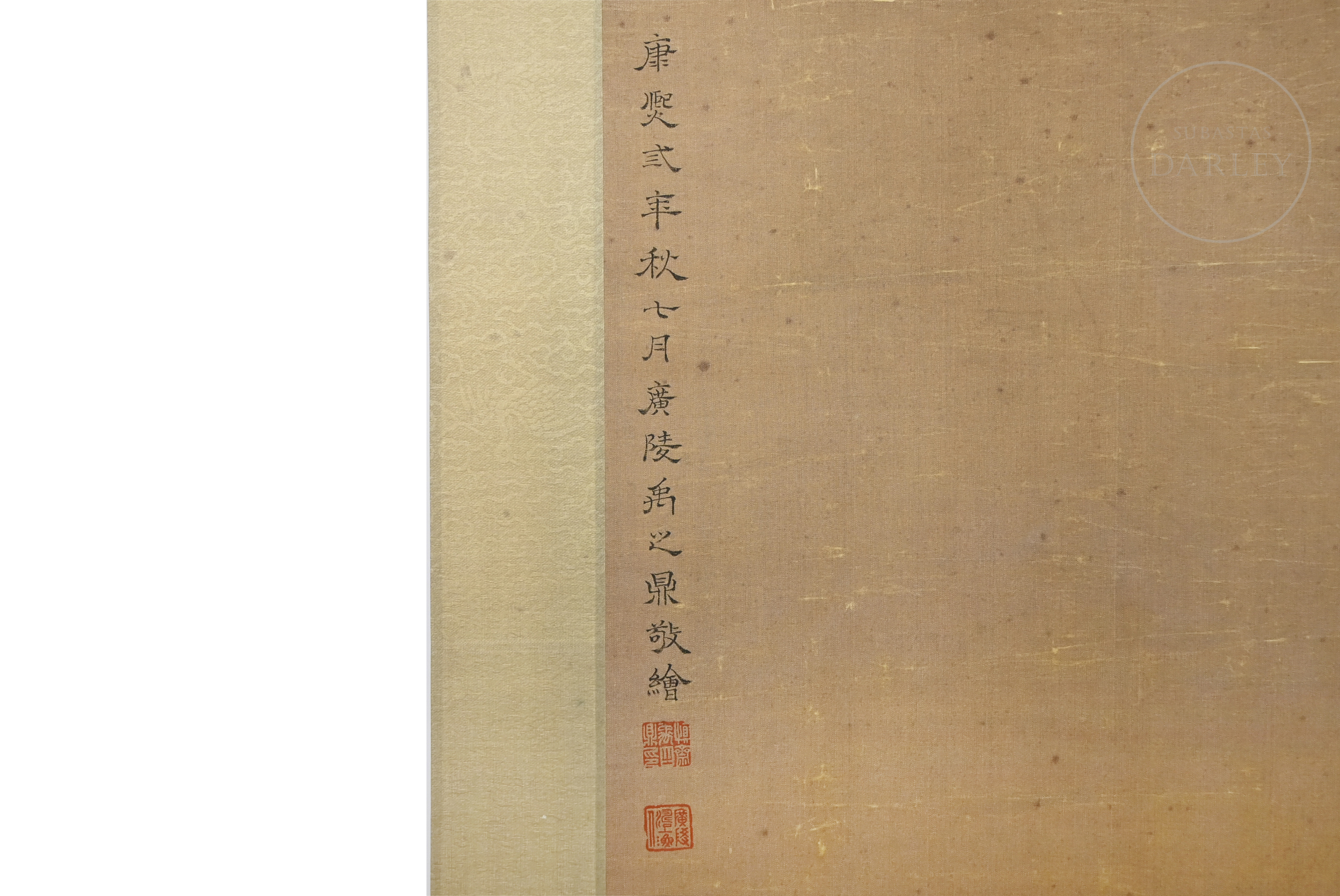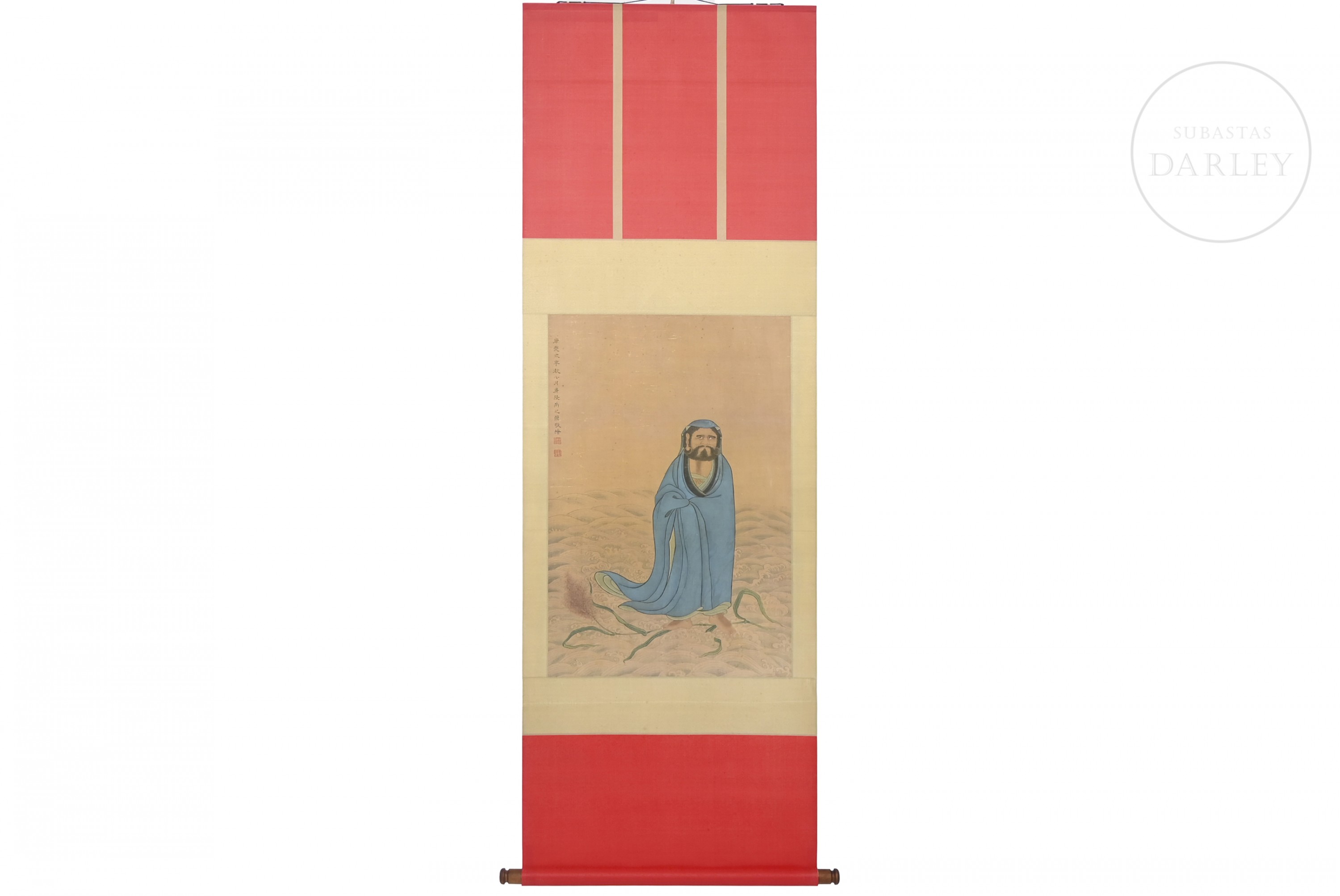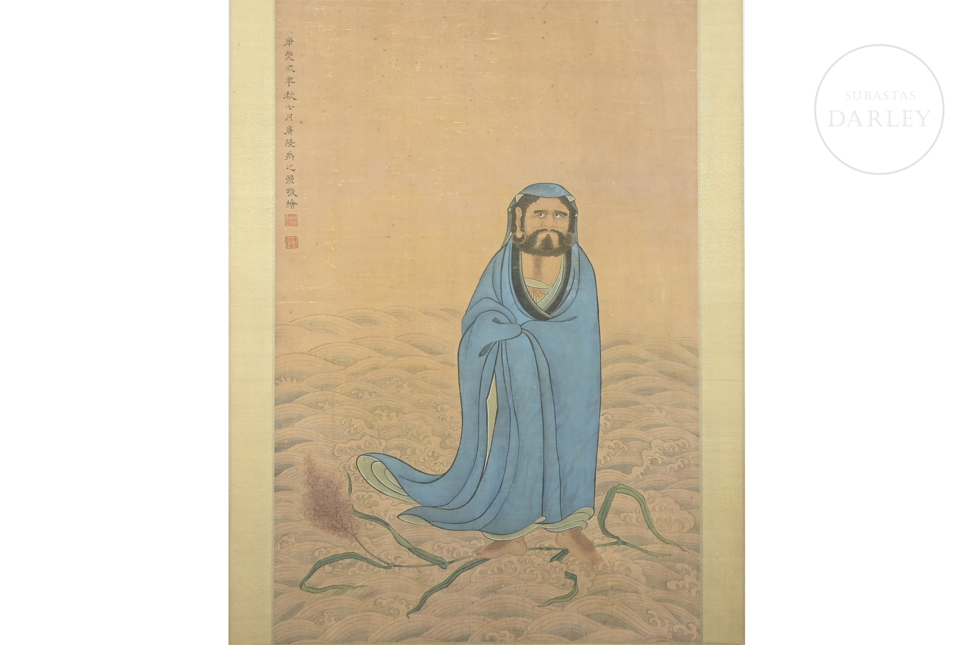 Pintura realizada en tinta y pigmentos sobre seda, dispuesta en un montaje de seda brocada en tonos rojos y crema. Representa a Bodhidharma, erguido sobre las olas del mar, con túnica azul y expresión solemne. En el lateral superior izquierdo se conserva la inscripción "康熙三年秋七月广陵禹之鼎敬绘", seguida de dos sellos en rojo: "慎斋禹之鼎印" y "广陵涛上渔人". Yu Zhiding (1647-1709).