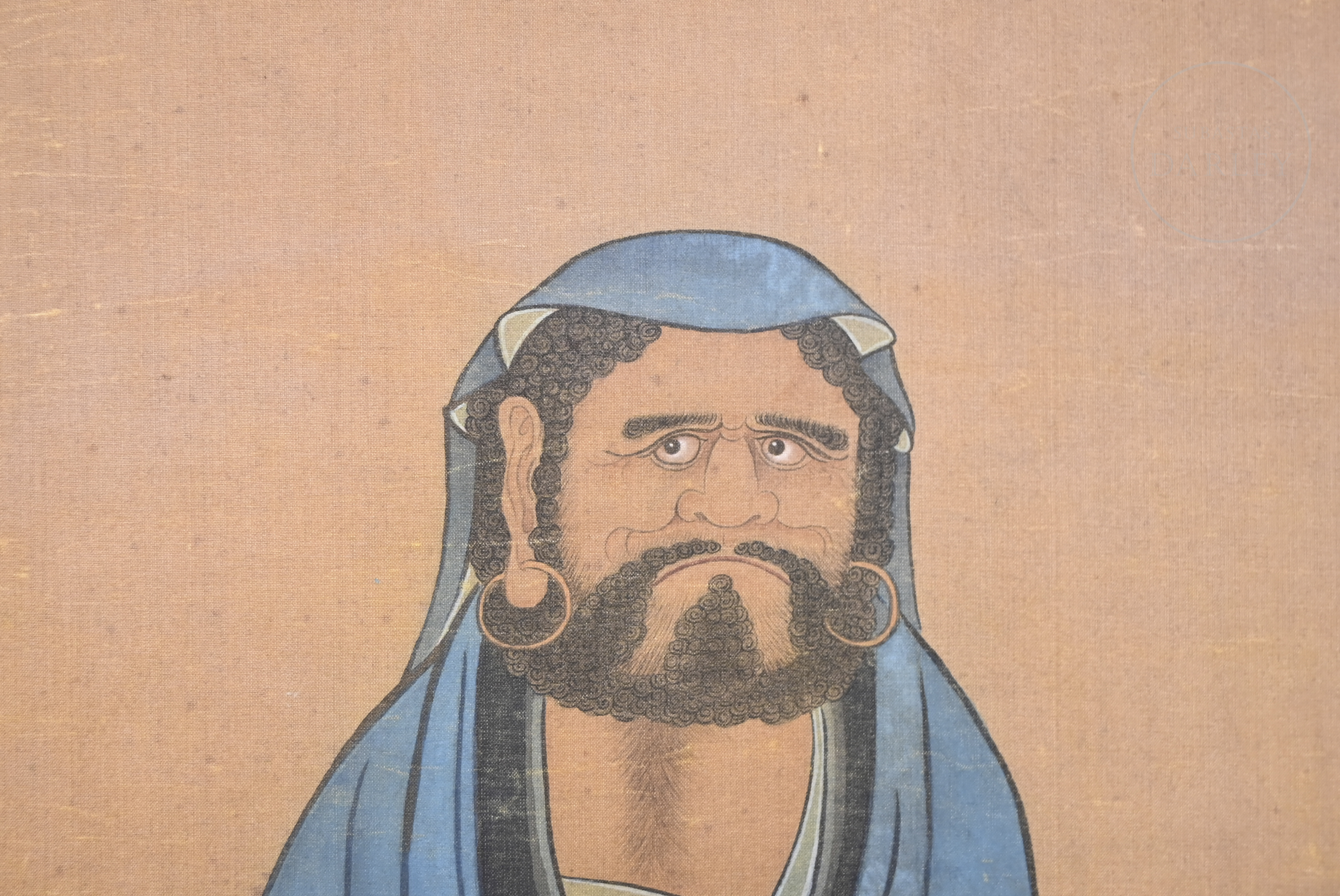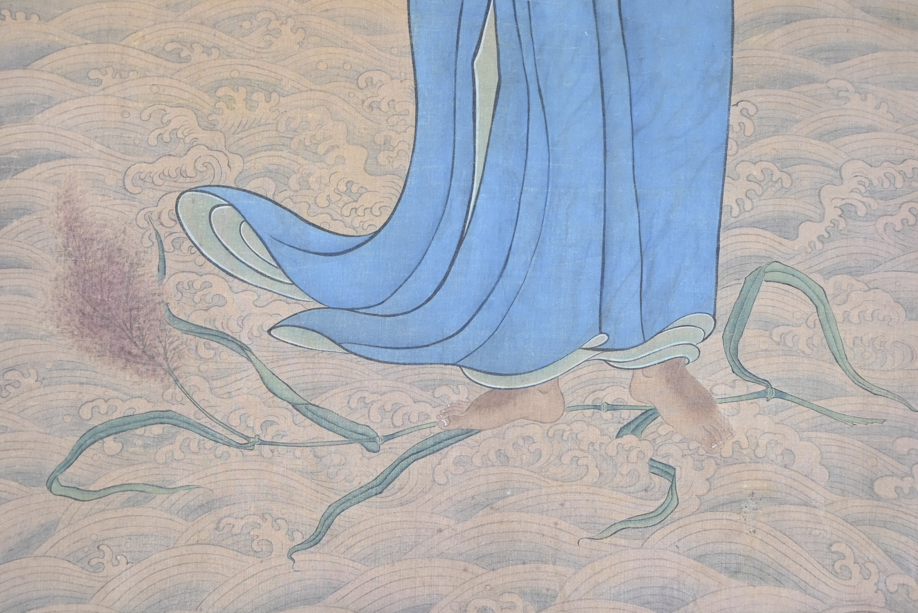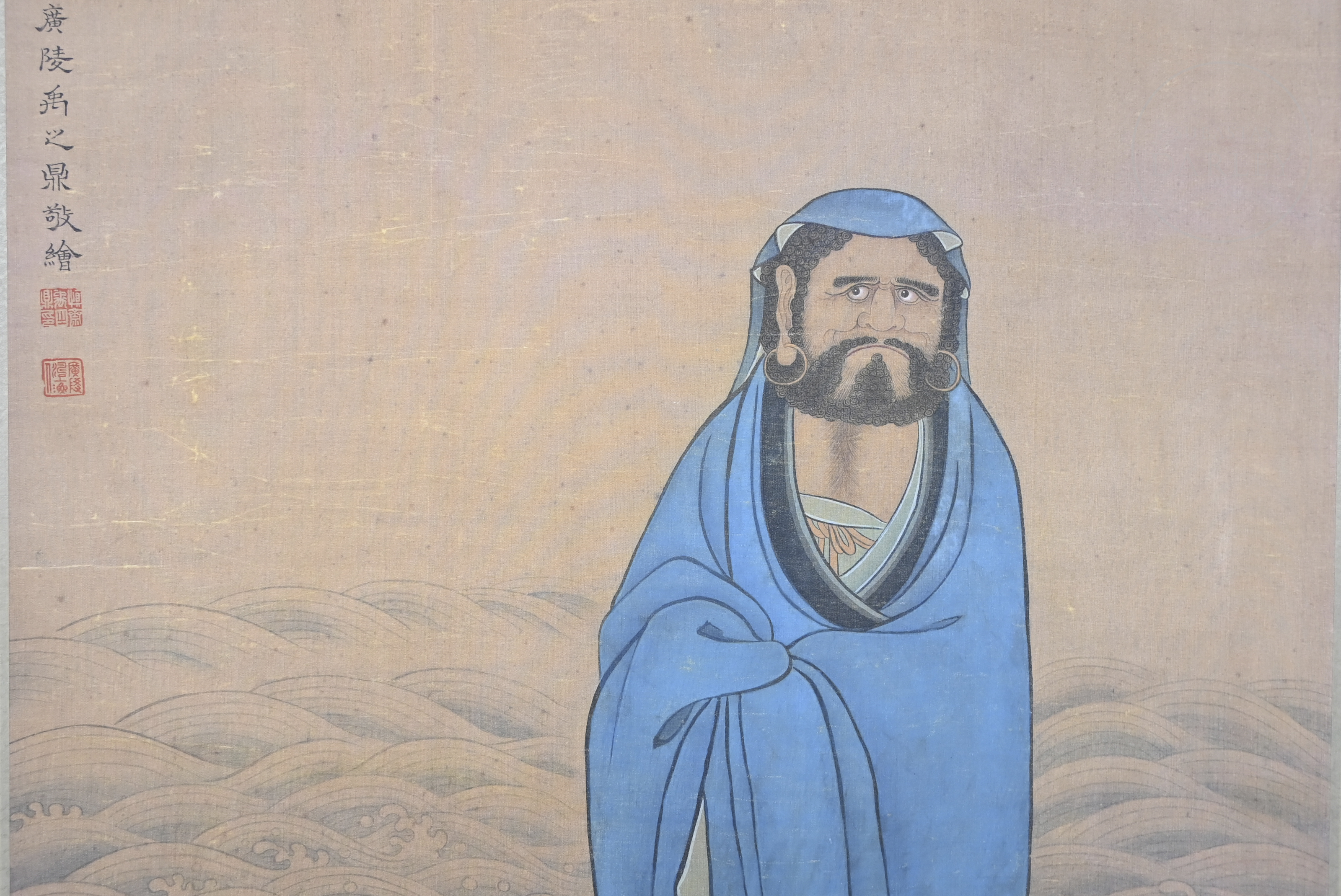 Pintura realizada en tinta y pigmentos sobre seda, dispuesta en un montaje de seda brocada en tonos rojos y crema. Representa a Bodhidharma, erguido sobre las olas del mar, con túnica azul y expresión solemne. En el lateral superior izquierdo se conserva la inscripción "康熙三年秋七月广陵禹之鼎敬绘", seguida de dos sellos en rojo: "慎斋禹之鼎印" y "广陵涛上渔人". Yu Zhiding (1647-1709).