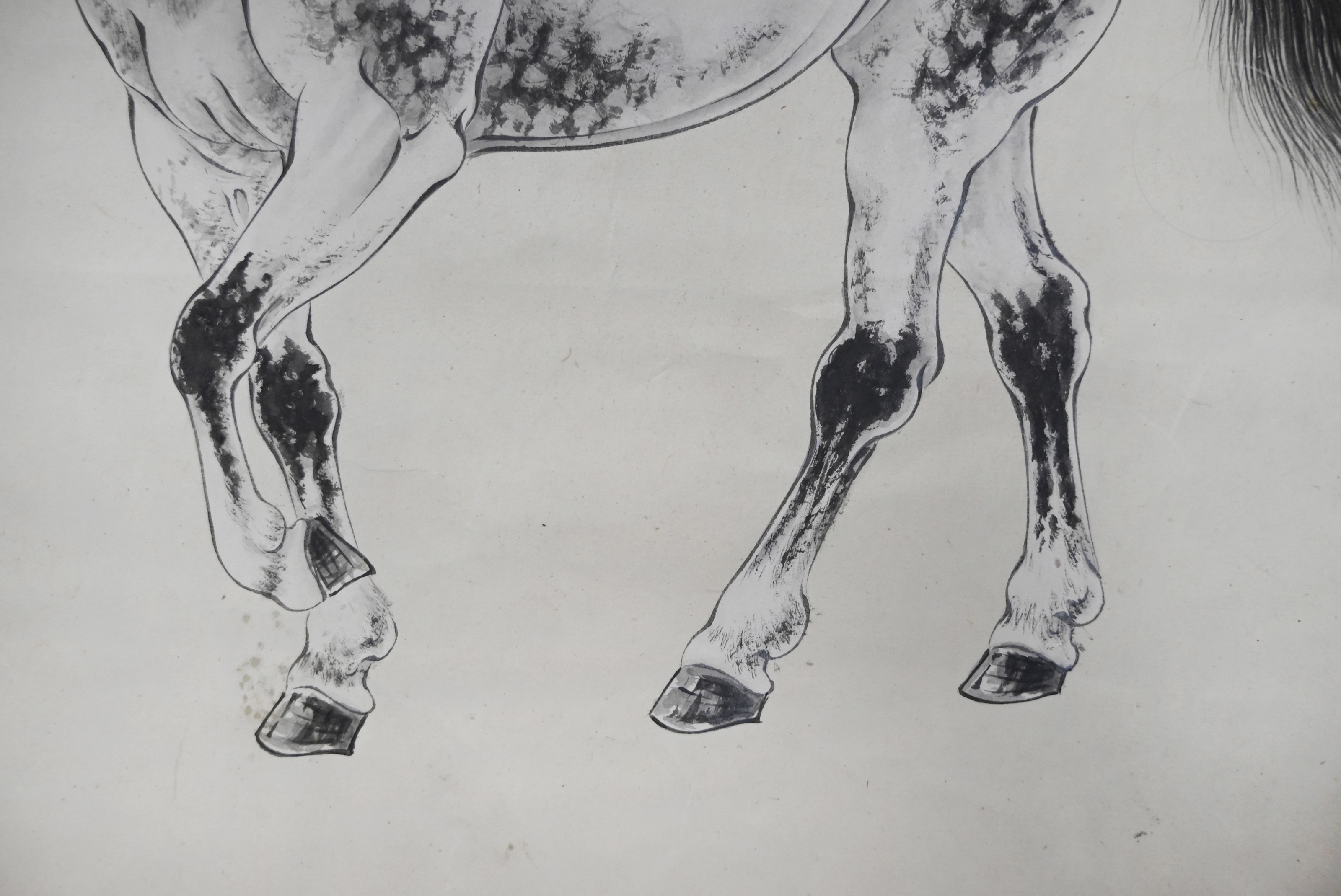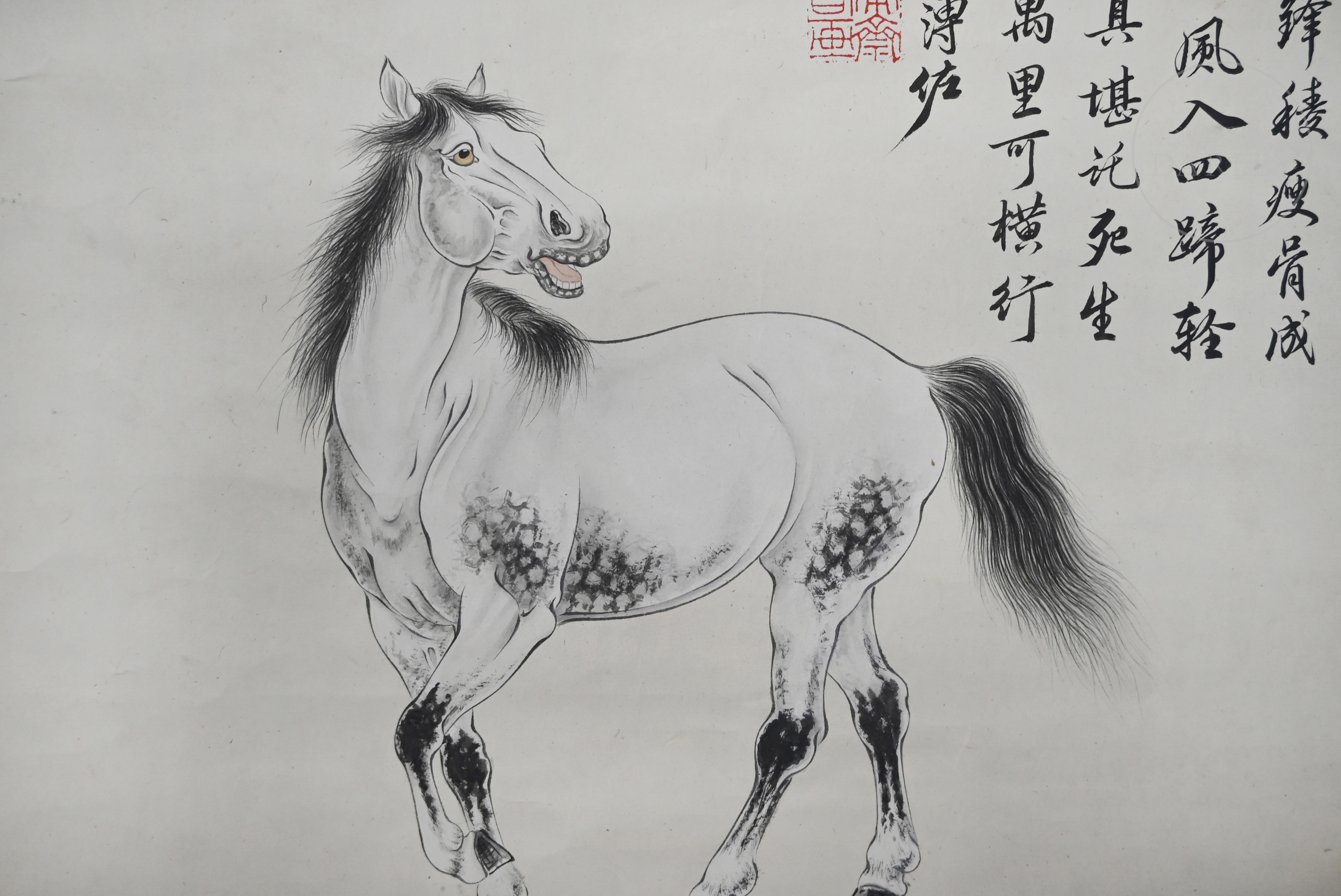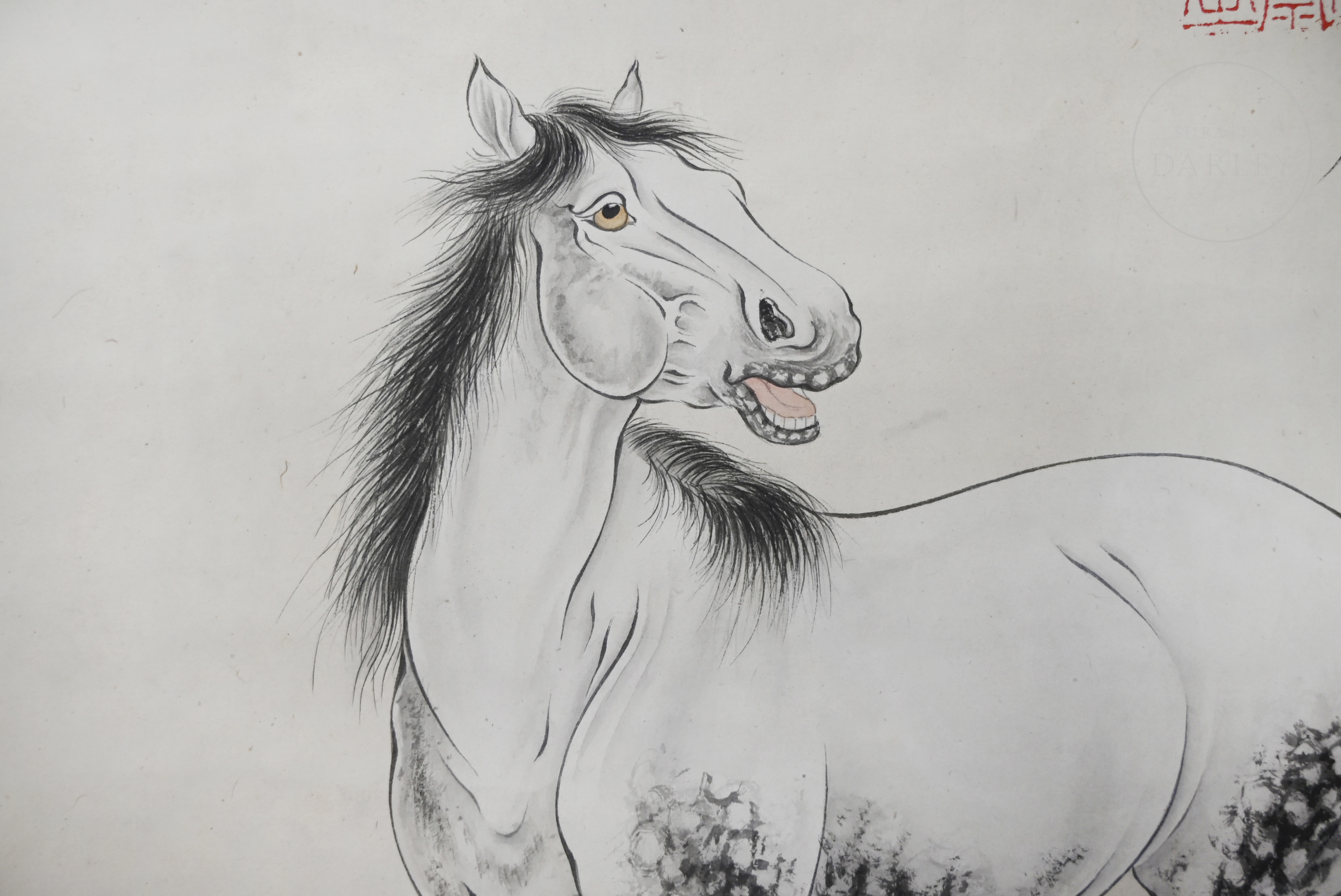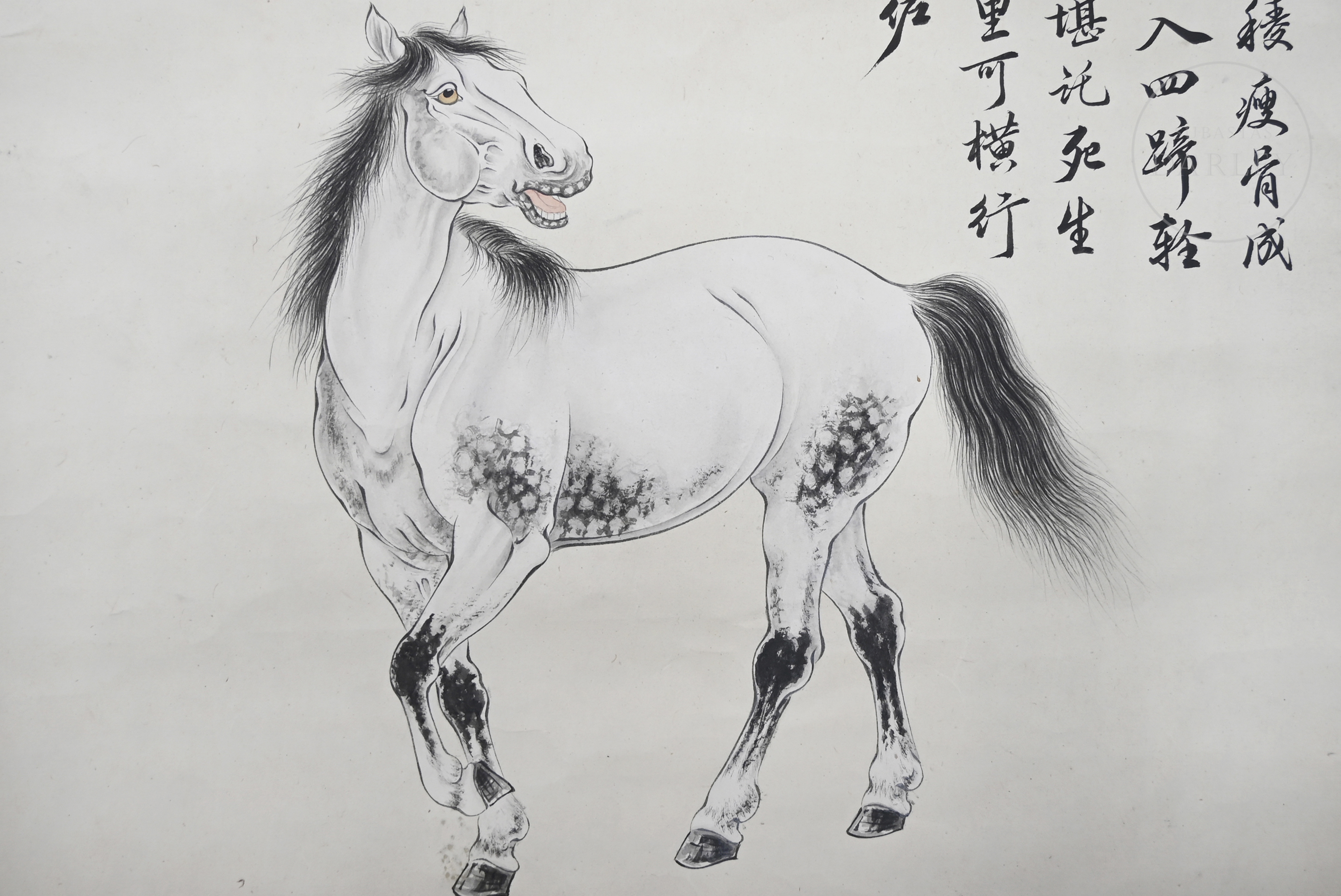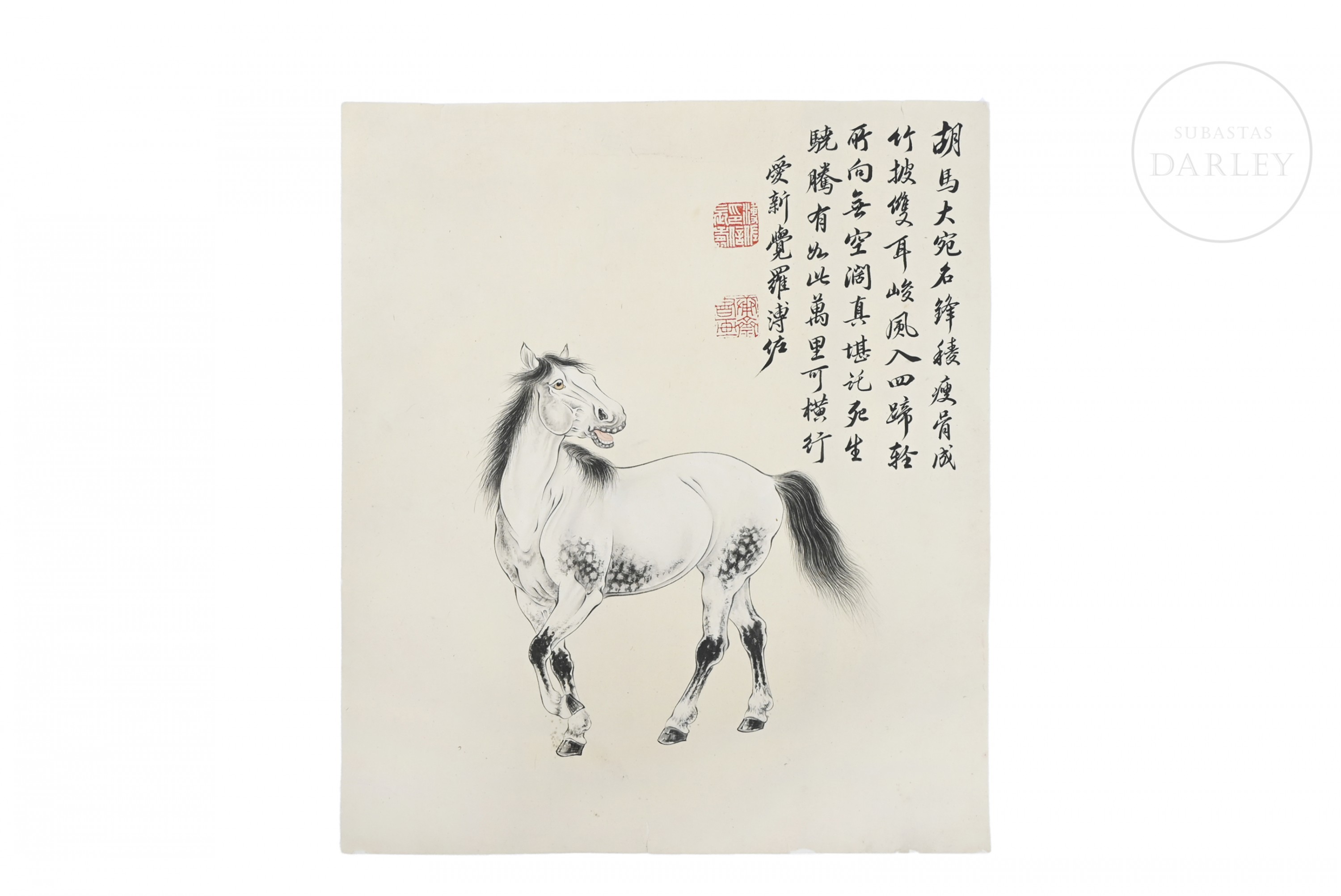 Pintura realizada en tinta y pigmentos sobre papel, representando un caballo blanco de crines negras, con la cabeza girada hacia un lado. A la derecha figura una inscripción poética con la firma "爱新觉罗溥佐", acompañada de dos sellos en rojo "溥佐印信长寿" y "庸斋书画". Pu Zuo (1918–2001).