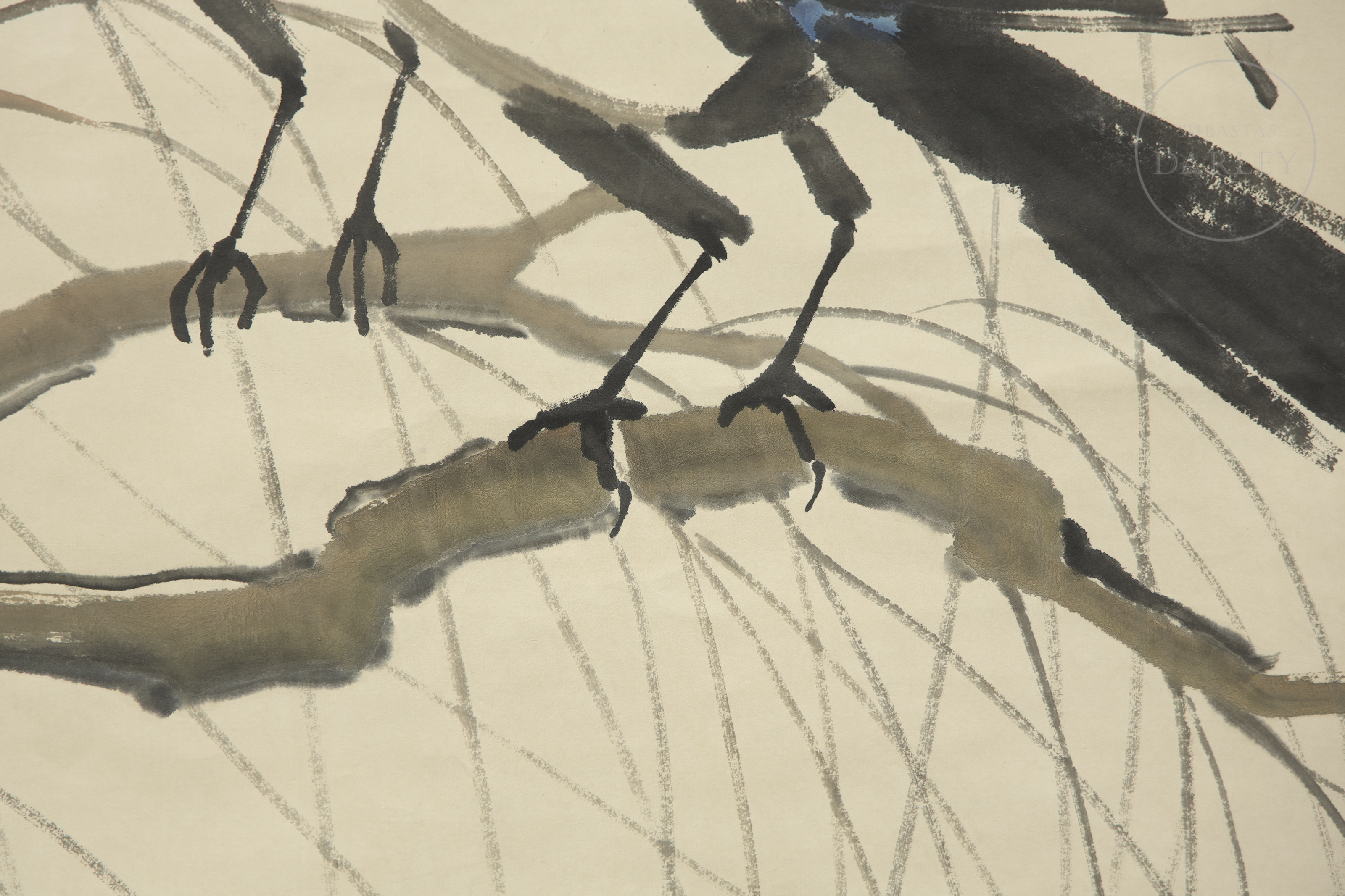 Tinta y pigmentos sobre papel. Muestra la imagen de una pequeña escena invernal, de ramas desnudas y retorcidas, sobre las que se posan dos cuervos que voltean la cabeza hacia un mismo punto. Firmado y sellado en el margen izquierdo "徐悲鸿".