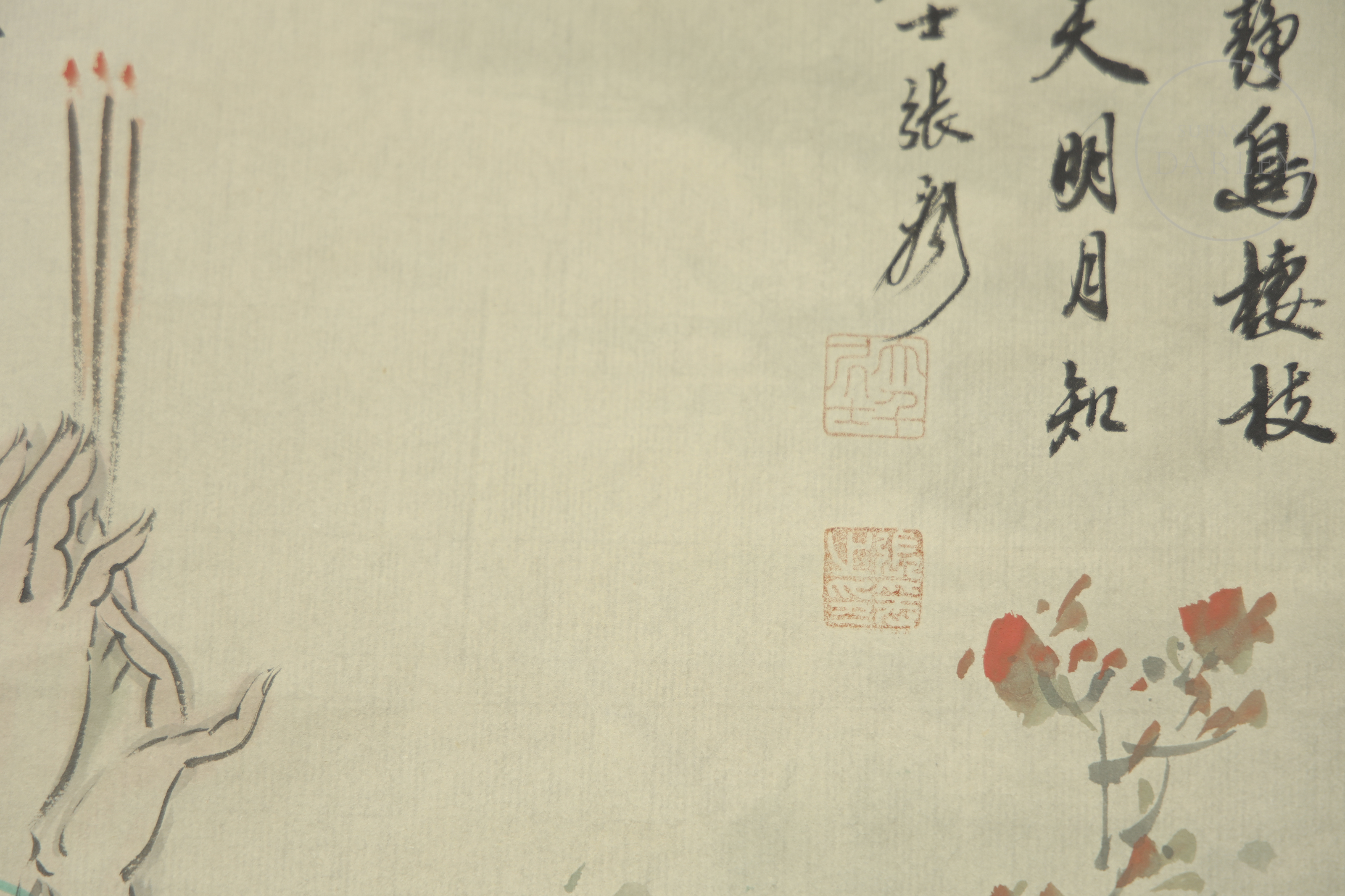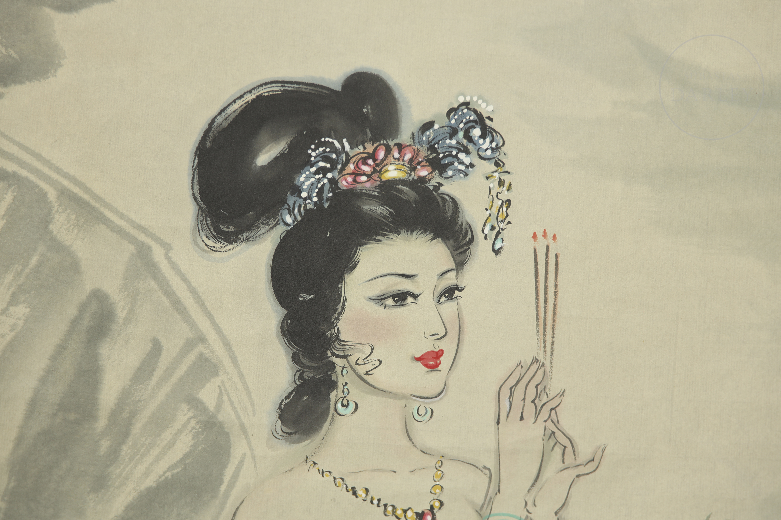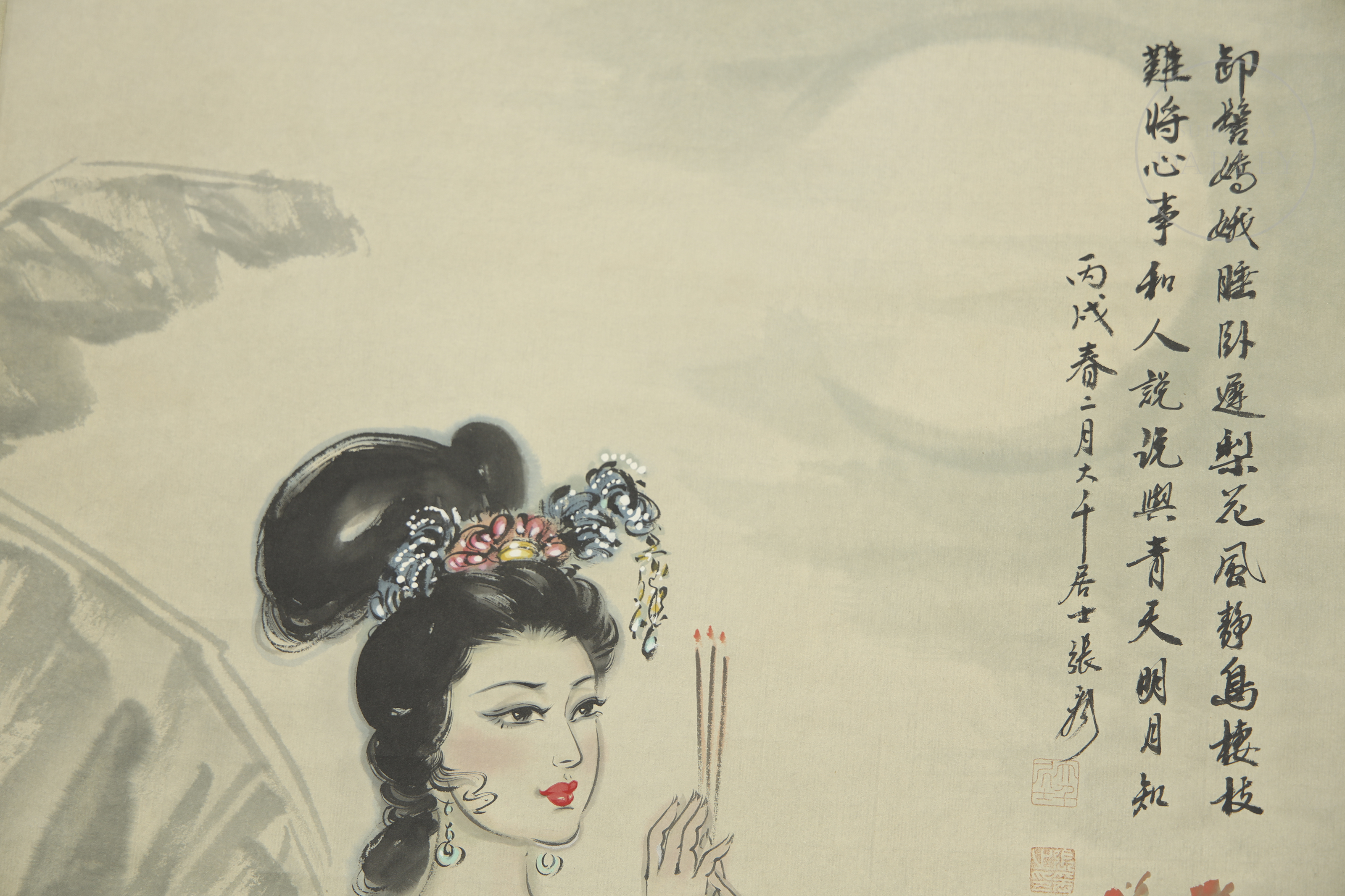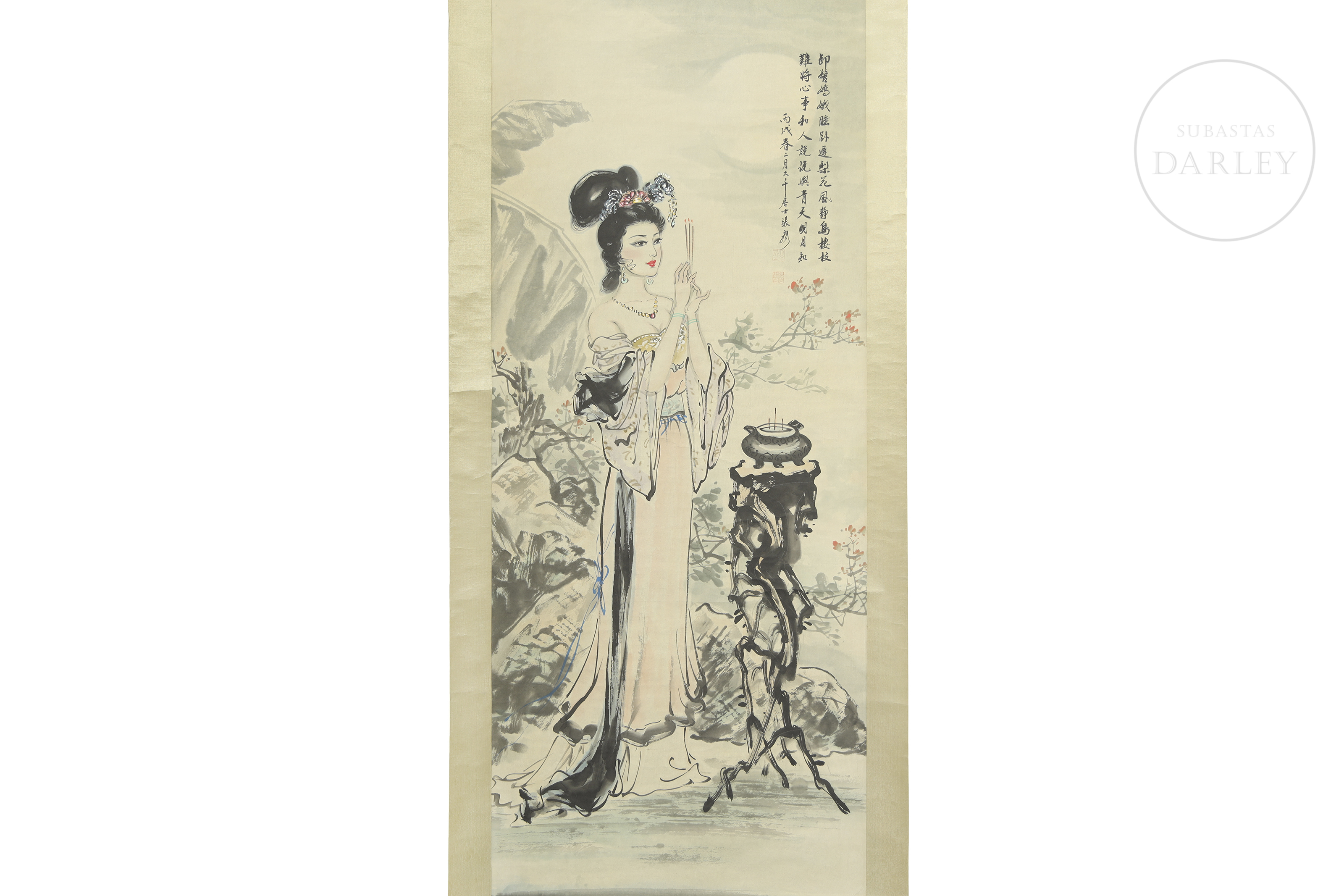 Pintura sobre pergamino, realizada con tinta y color sobre papel. Representa una elegante dama vestida con ropajes tradicionales, situada junto a un incensario de piedra y rodeada de un paisaje con montañas y ramas floridas. Con firma y sello " 张大千" en el margen superior derecho.
