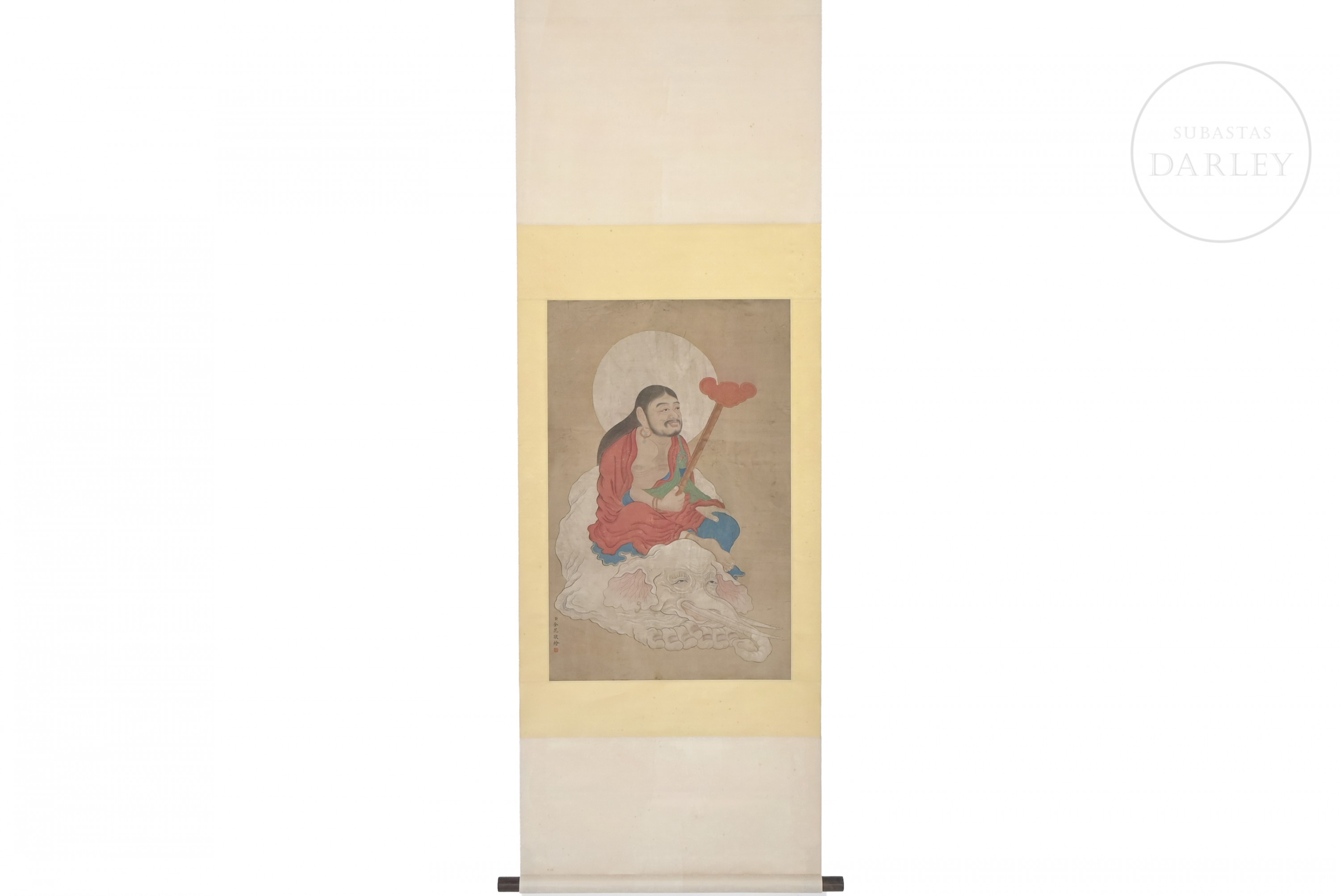 Pintura china “Deidad sobre elefante blanco”, con firma Jin Kun