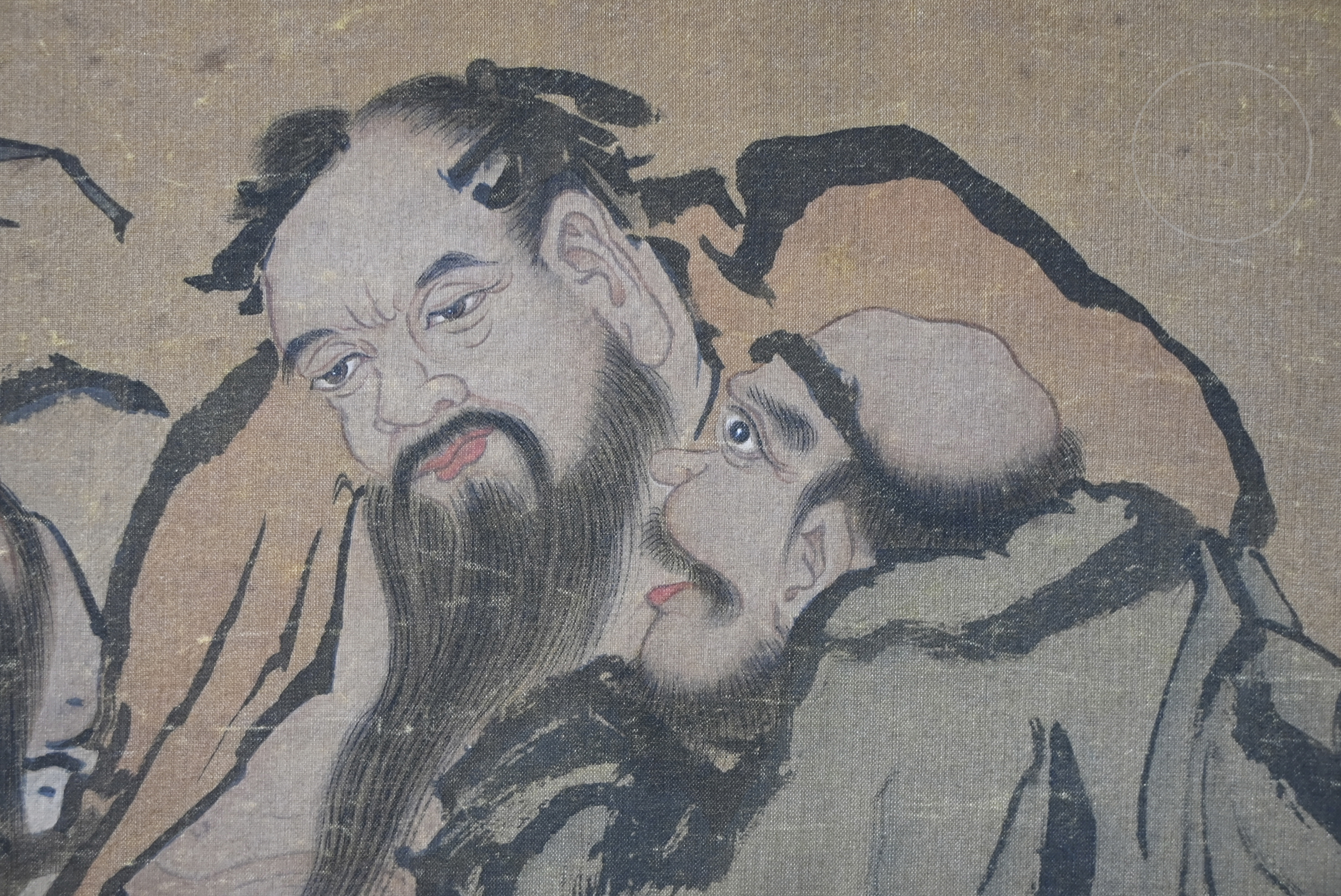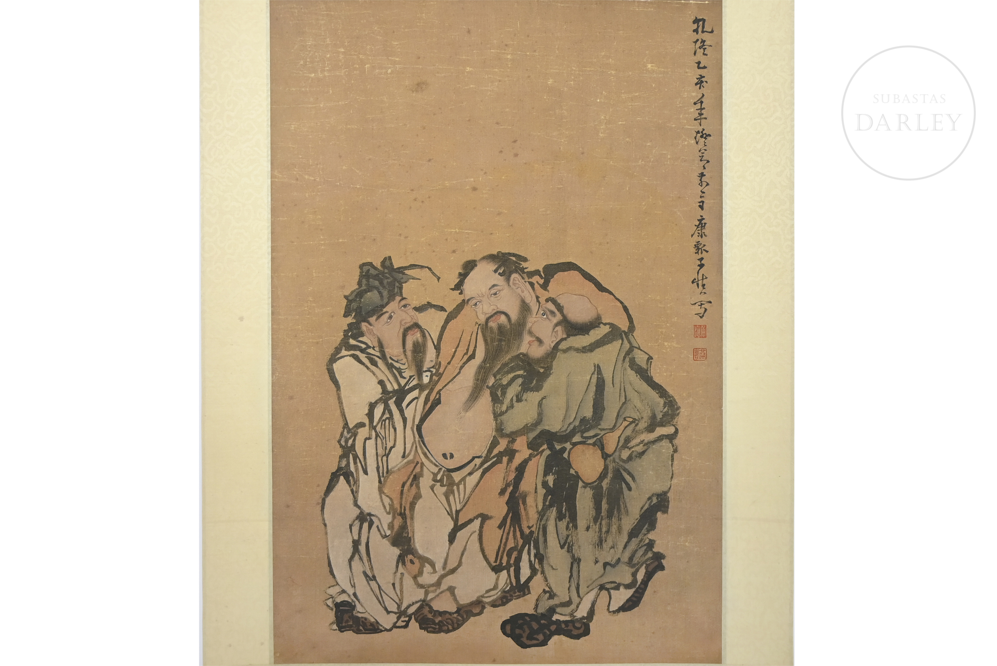 Pintura realizada en tinta y pigmentos sobre seda, montada en un marco de seda brocada. Representa a tres inmortales en actitud festiva, unidos en un gesto de camaradería, con túnicas de amplios pliegues. En el lateral derecho presenta la inscripción “乾隆乙亥年灯会会前二日瘿瓢子慎写”, seguida de dos sellos en rojo “黄慎” y “恭寿”. Huang Shen (1687–1772).