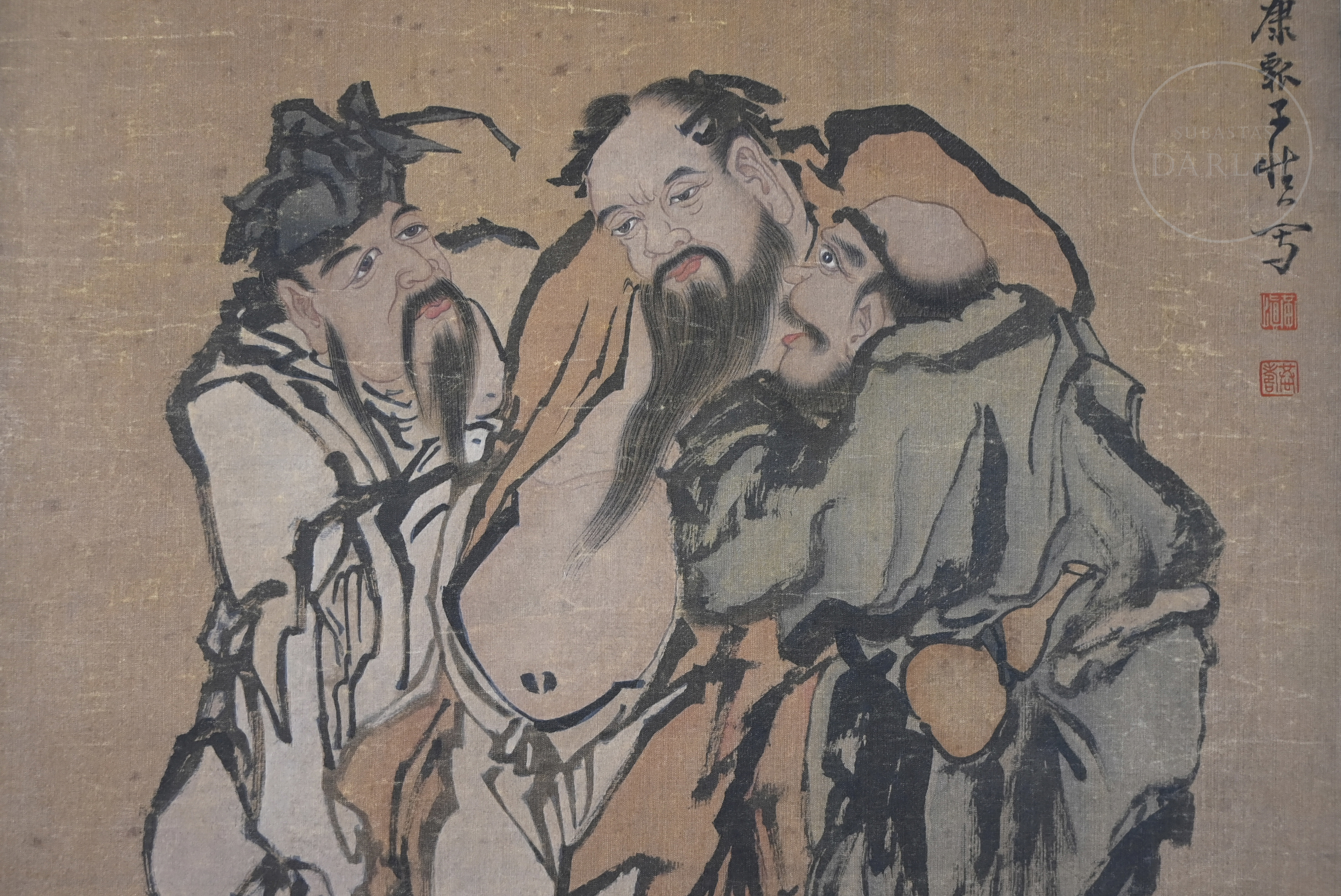 Pintura china “Tres inmortales”, con firma Huang Shen