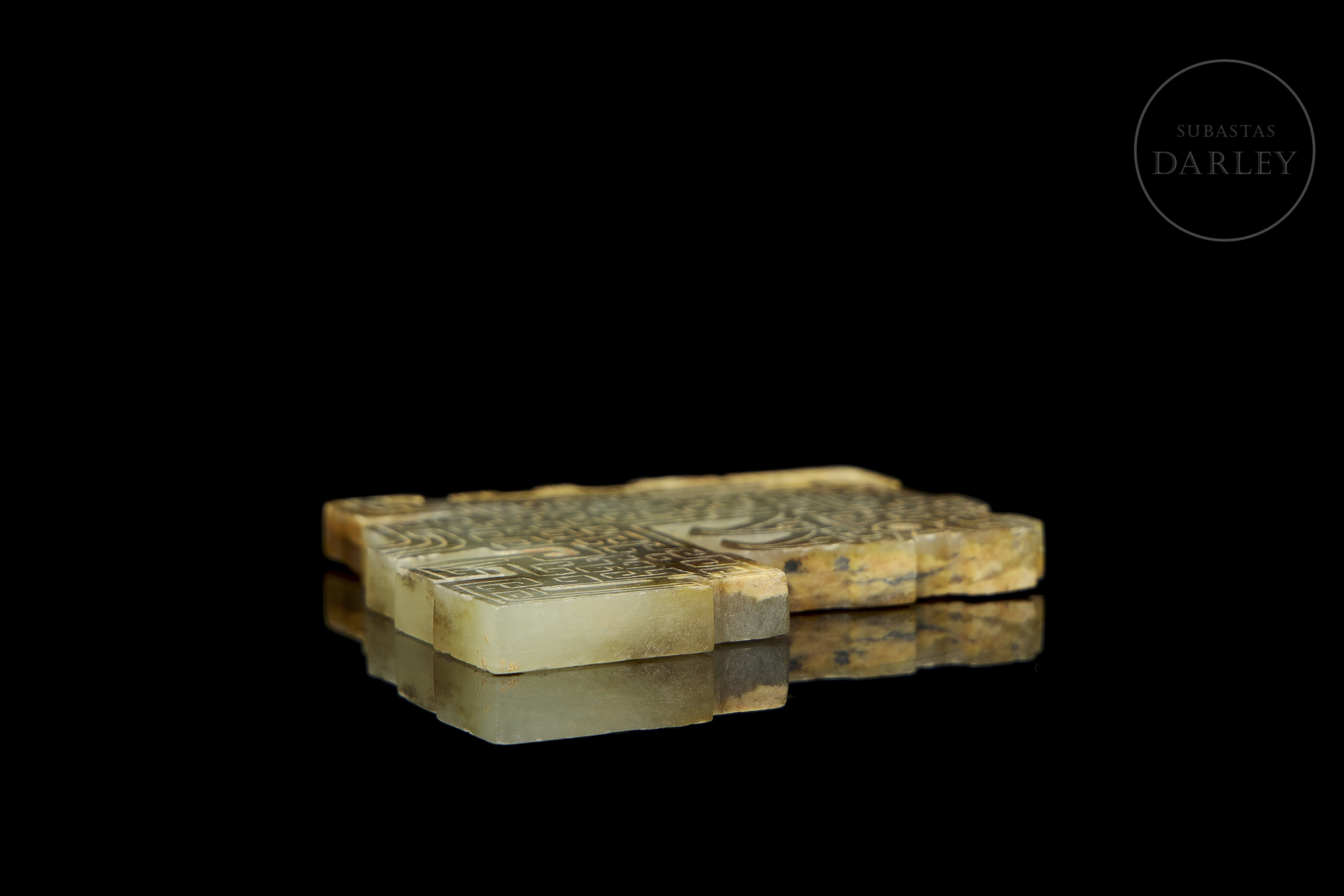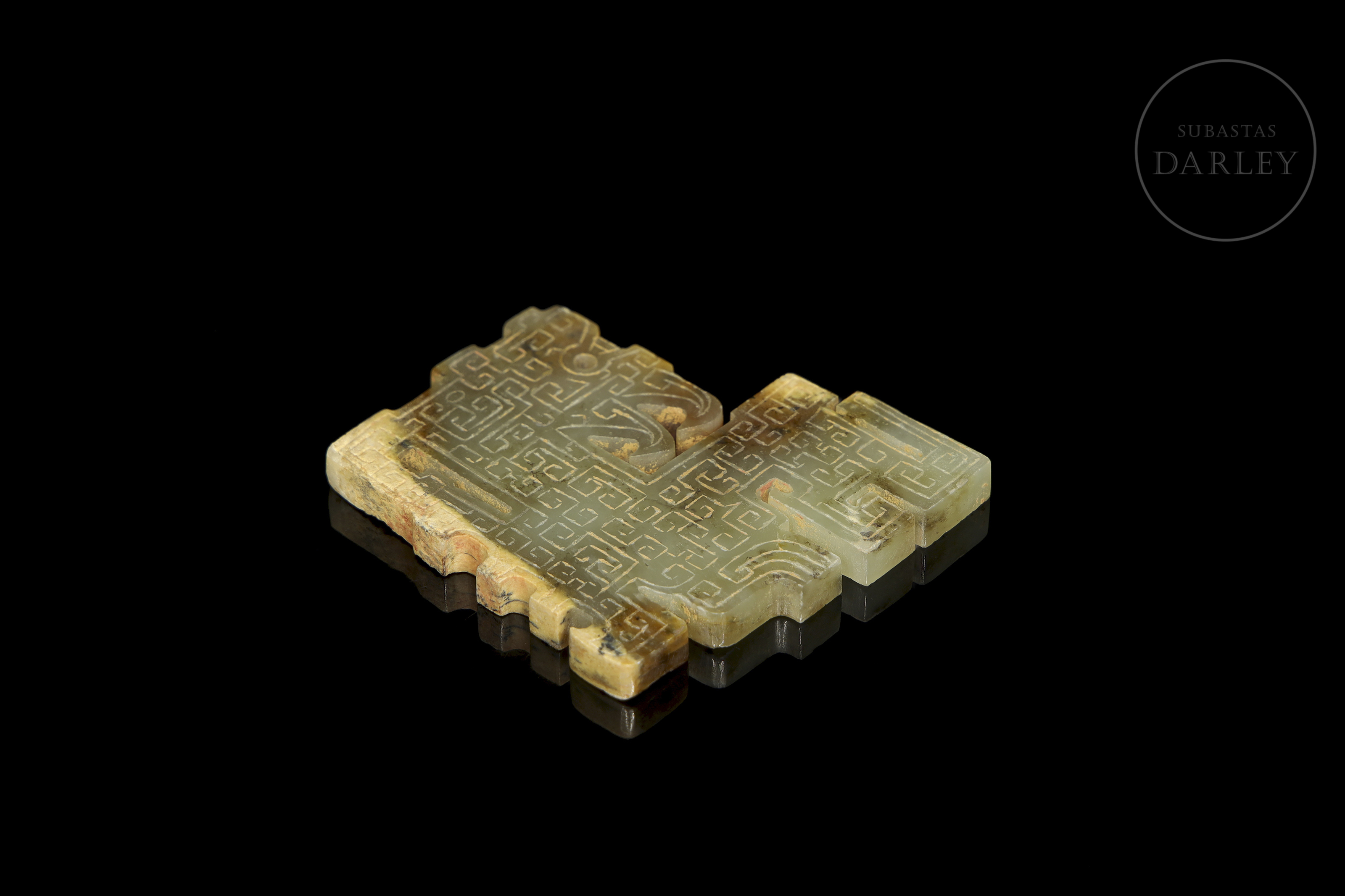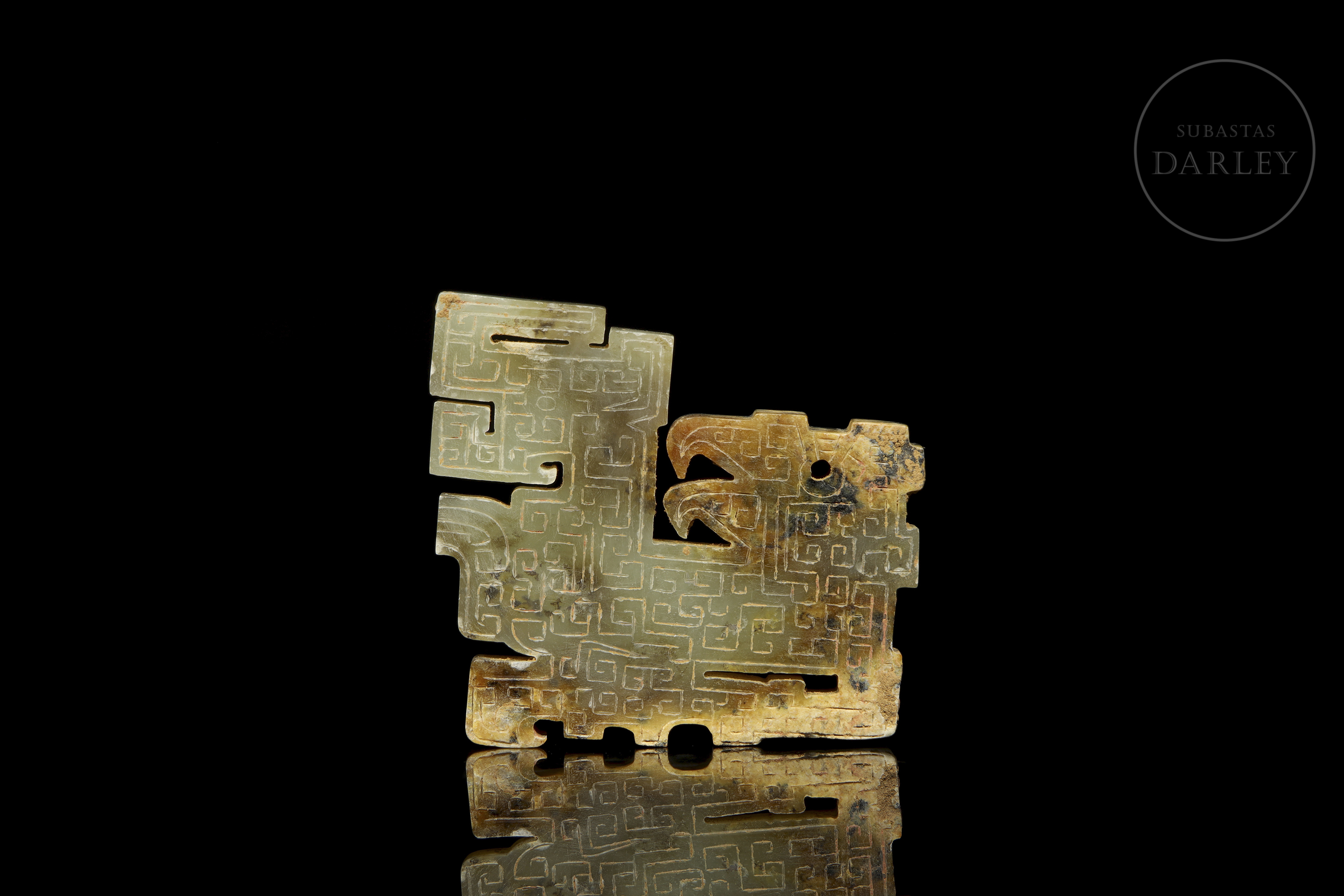 Jade de tonalidad amarillo verdosa con marcadas áreas de alteración mineral, ocre y marrón. La pieza presenta un formato de placa de diseño esquemático, que representa un ave mitológica de perfil. Destaca la profusa decoración en bajorrelieve que cubre ambas caras con un tupido patrón de motivos de espirales geométricas. El ejemplar exhibe marcas de erosión natural derivadas de su antigüedad. Dinastía Qin (221–206 a.C.) o posterior.