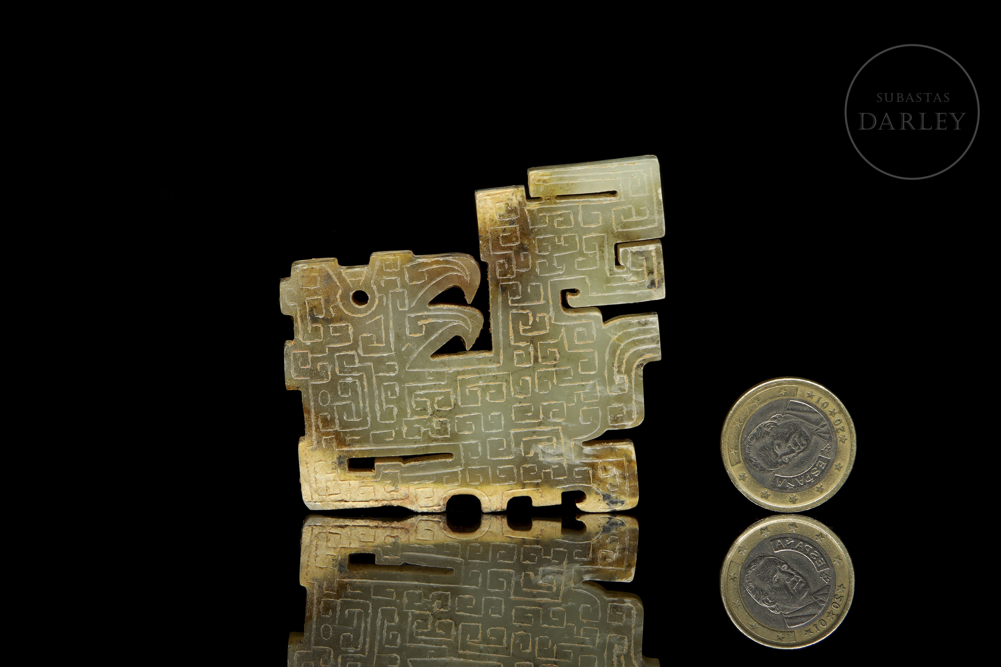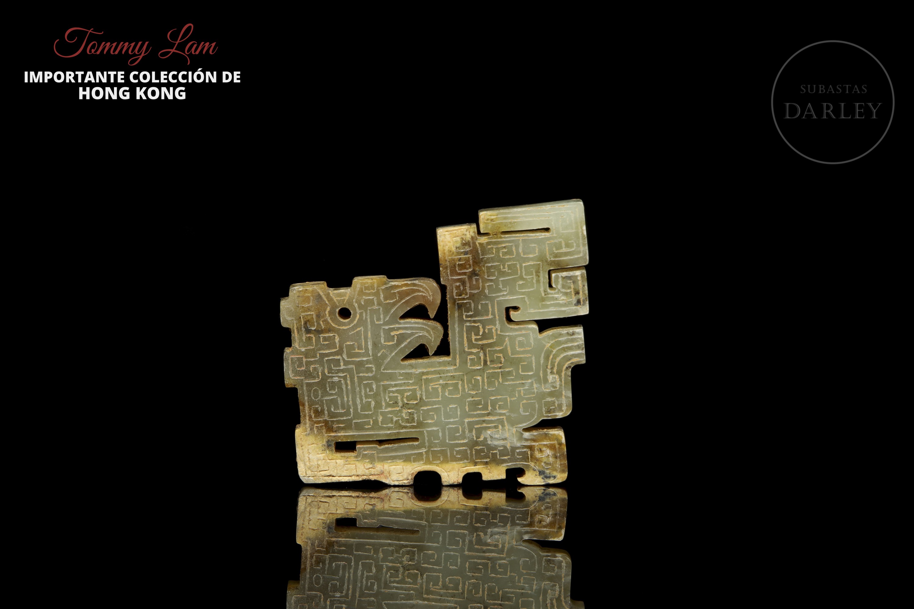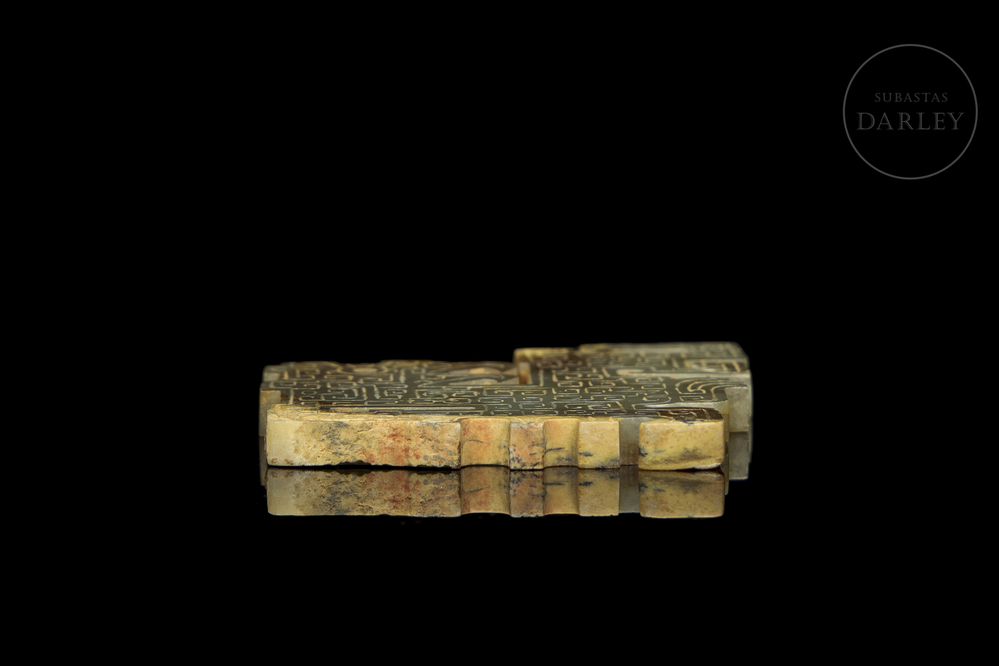 Jade de tonalidad amarillo verdosa con marcadas áreas de alteración mineral, ocre y marrón. La pieza presenta un formato de placa de diseño esquemático, que representa un ave mitológica de perfil. Destaca la profusa decoración en bajorrelieve que cubre ambas caras con un tupido patrón de motivos de espirales geométricas. El ejemplar exhibe marcas de erosión natural derivadas de su antigüedad. Dinastía Qin (221–206 a.C.) o posterior.