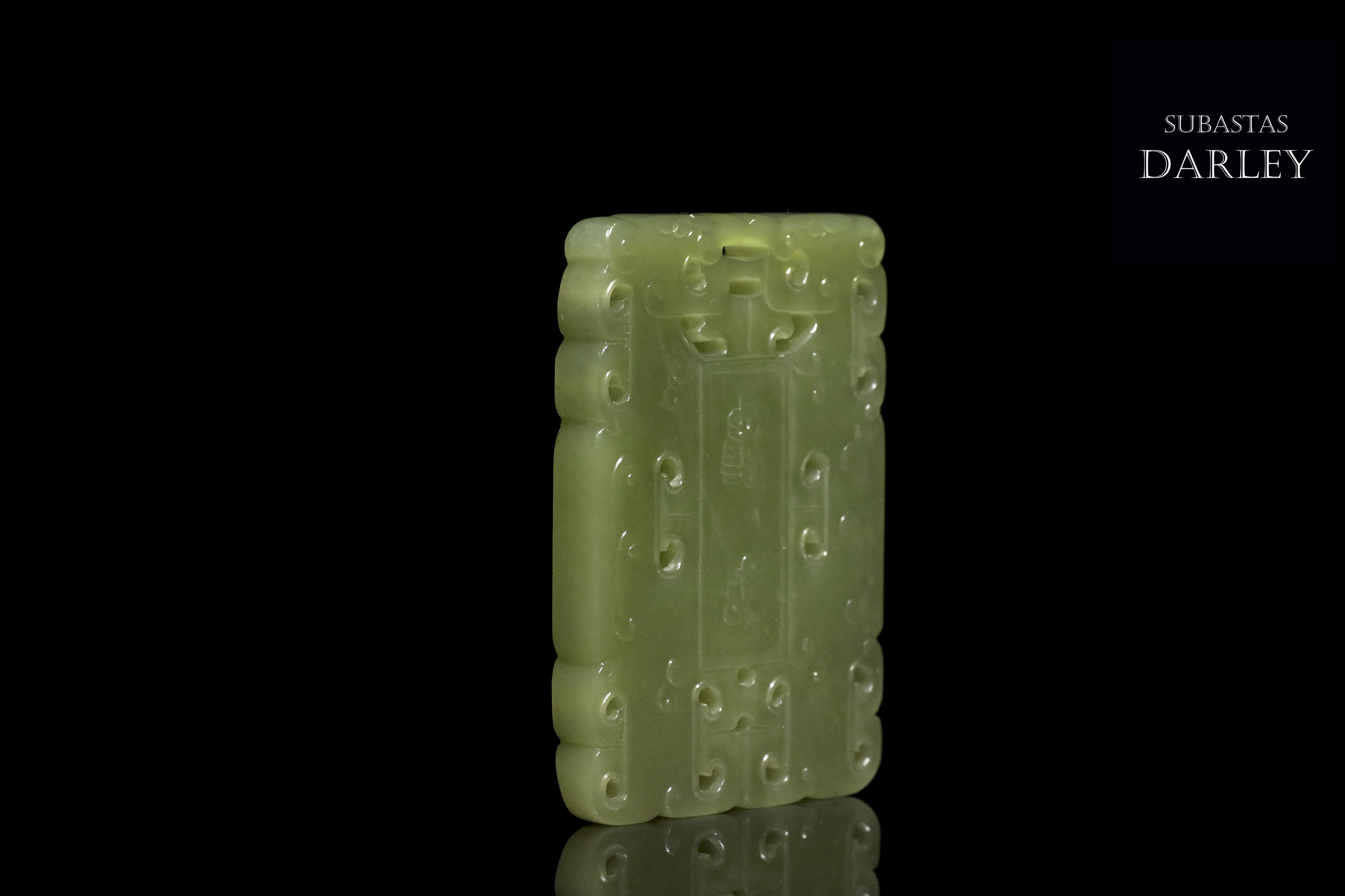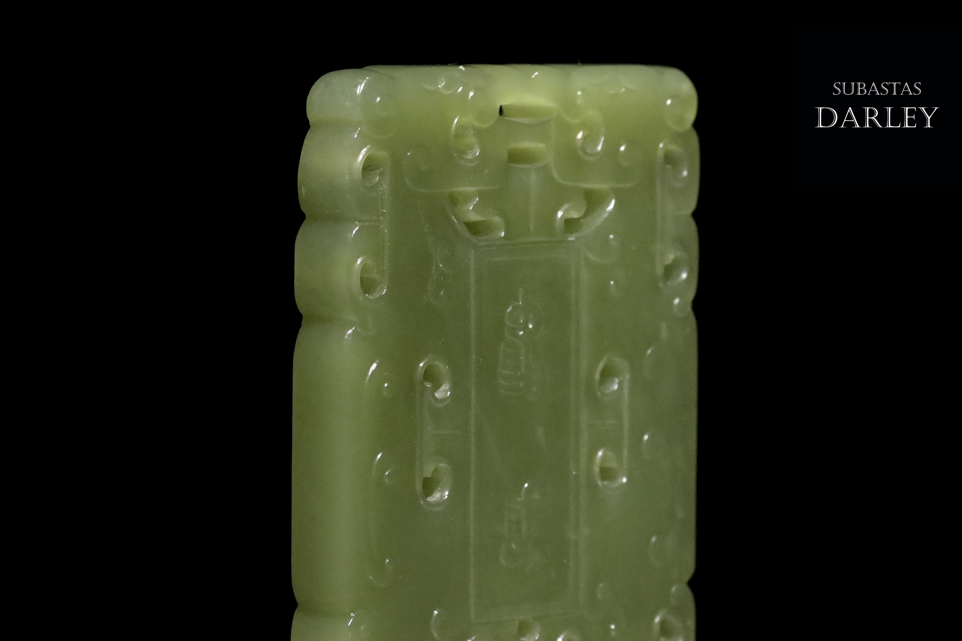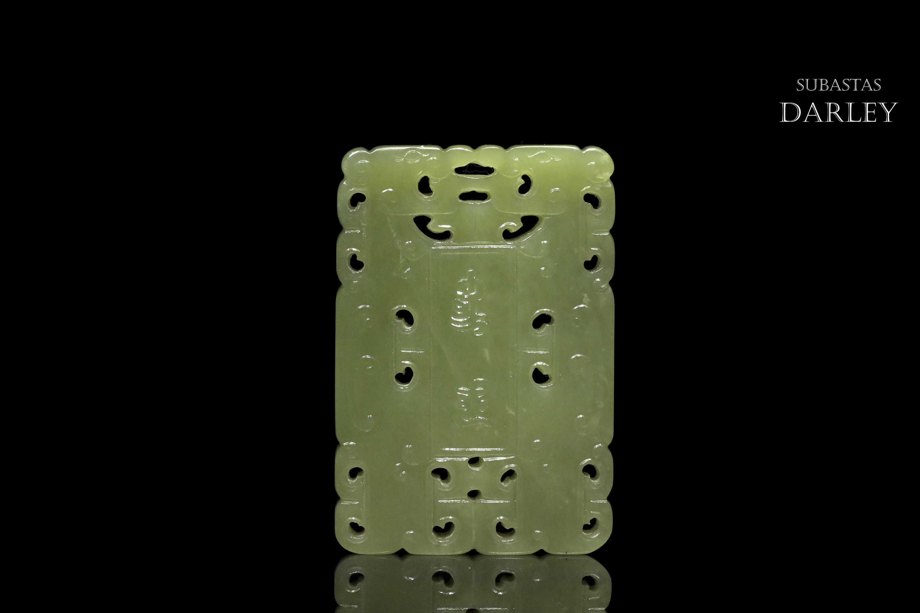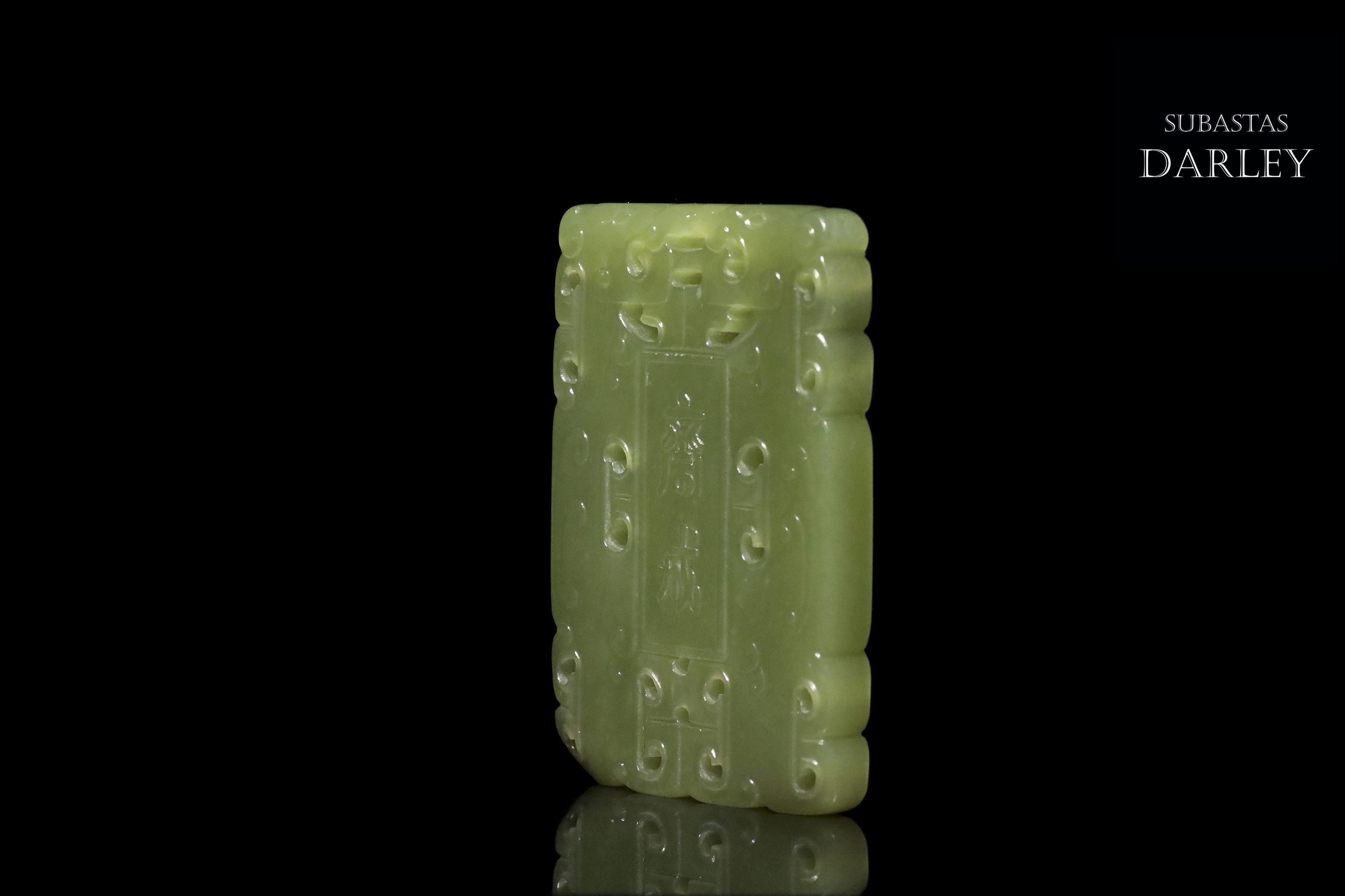 Placa de jade de Hetian tallado, de hermoso color amarillo 黃玉 (Huáng yù). Posee una forma rectangular y plana, donde dos bestias arcaicas flanquean los bordes. Adornada con detalles meticulosos realizados mediante relieve y calado. Muestra en el centro, una cartela rectangular con caracteres escritos con distintas grafías.