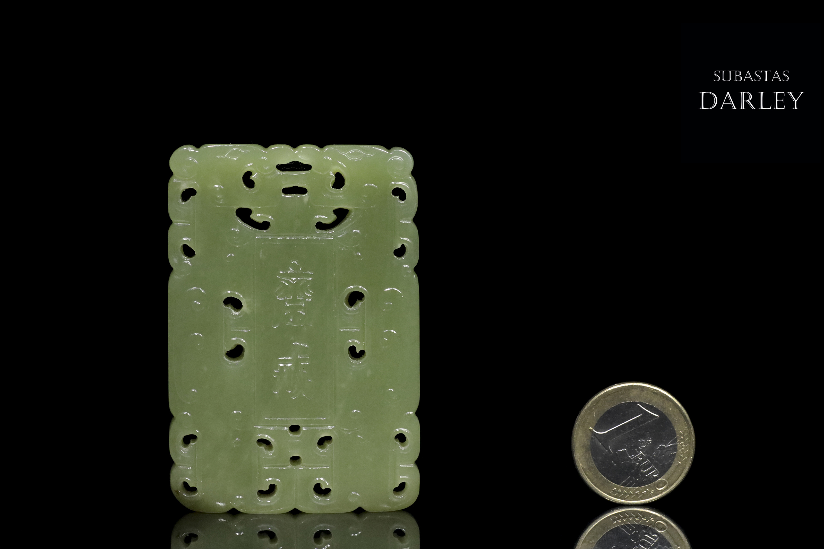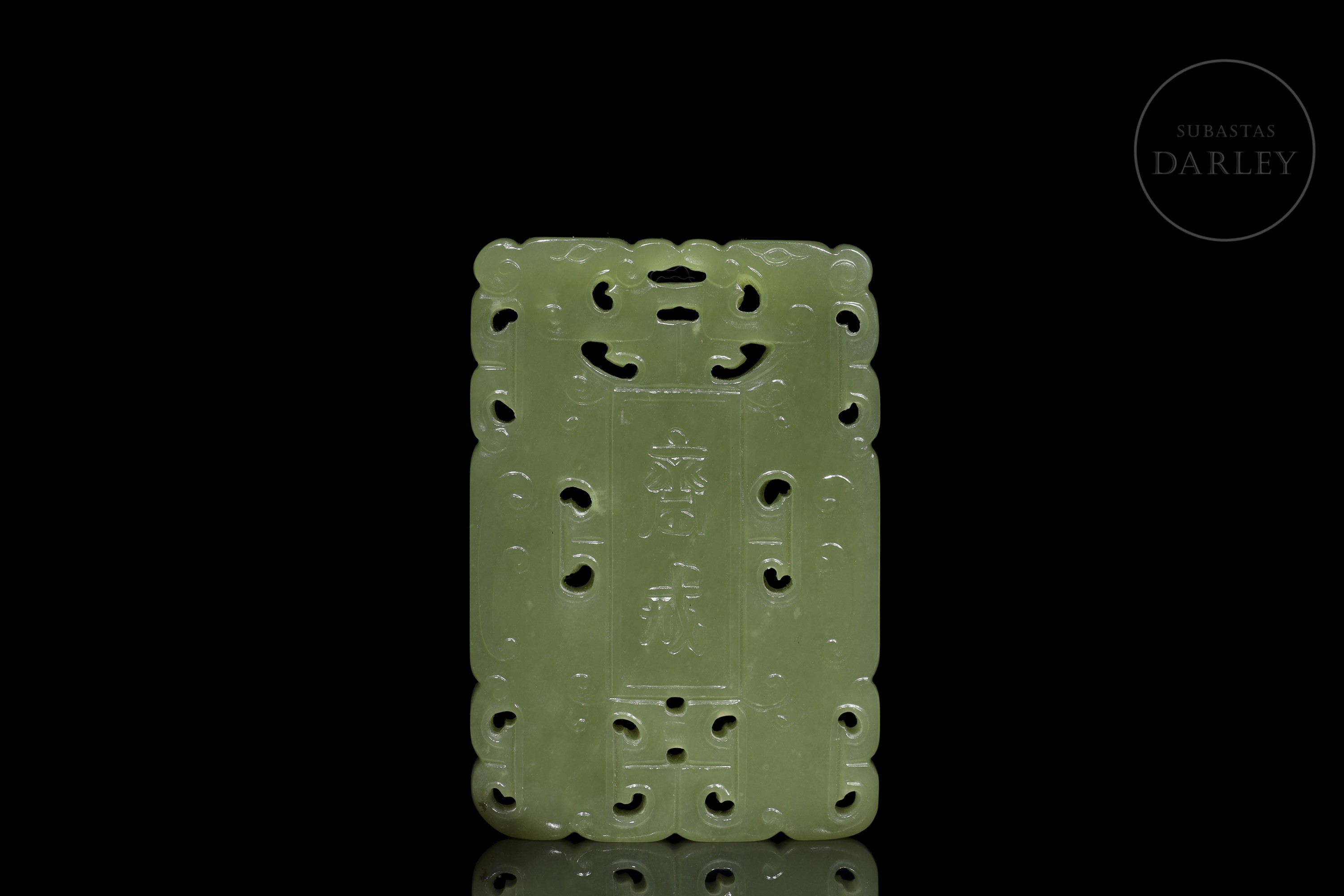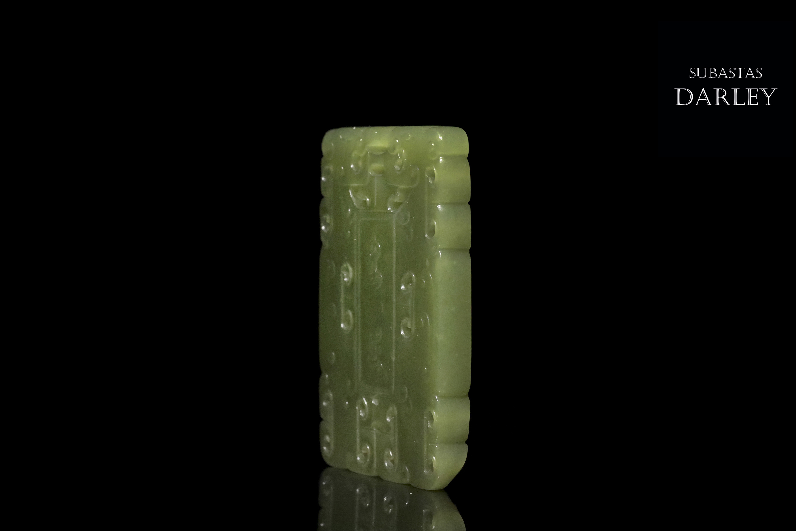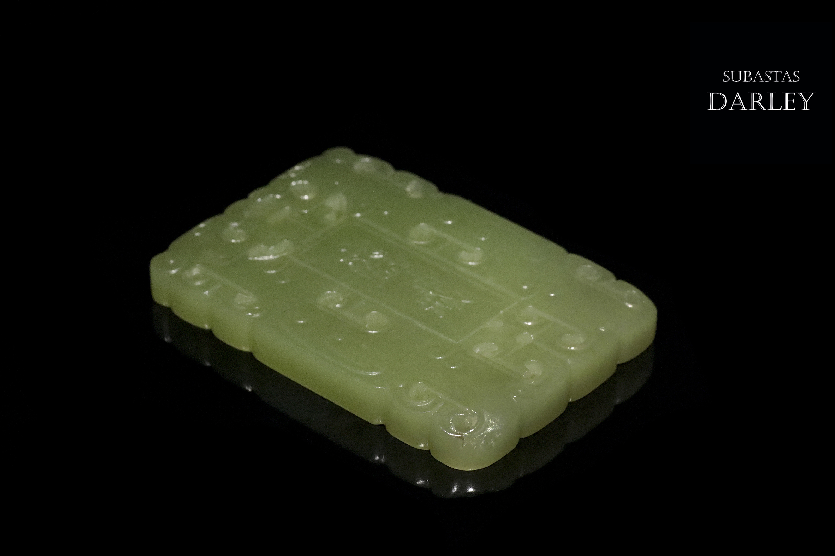 Placa de jade de Hetian tallado, de hermoso color amarillo 黃玉 (Huáng yù). Posee una forma rectangular y plana, donde dos bestias arcaicas flanquean los bordes. Adornada con detalles meticulosos realizados mediante relieve y calado. Muestra en el centro, una cartela rectangular con caracteres escritos con distintas grafías.