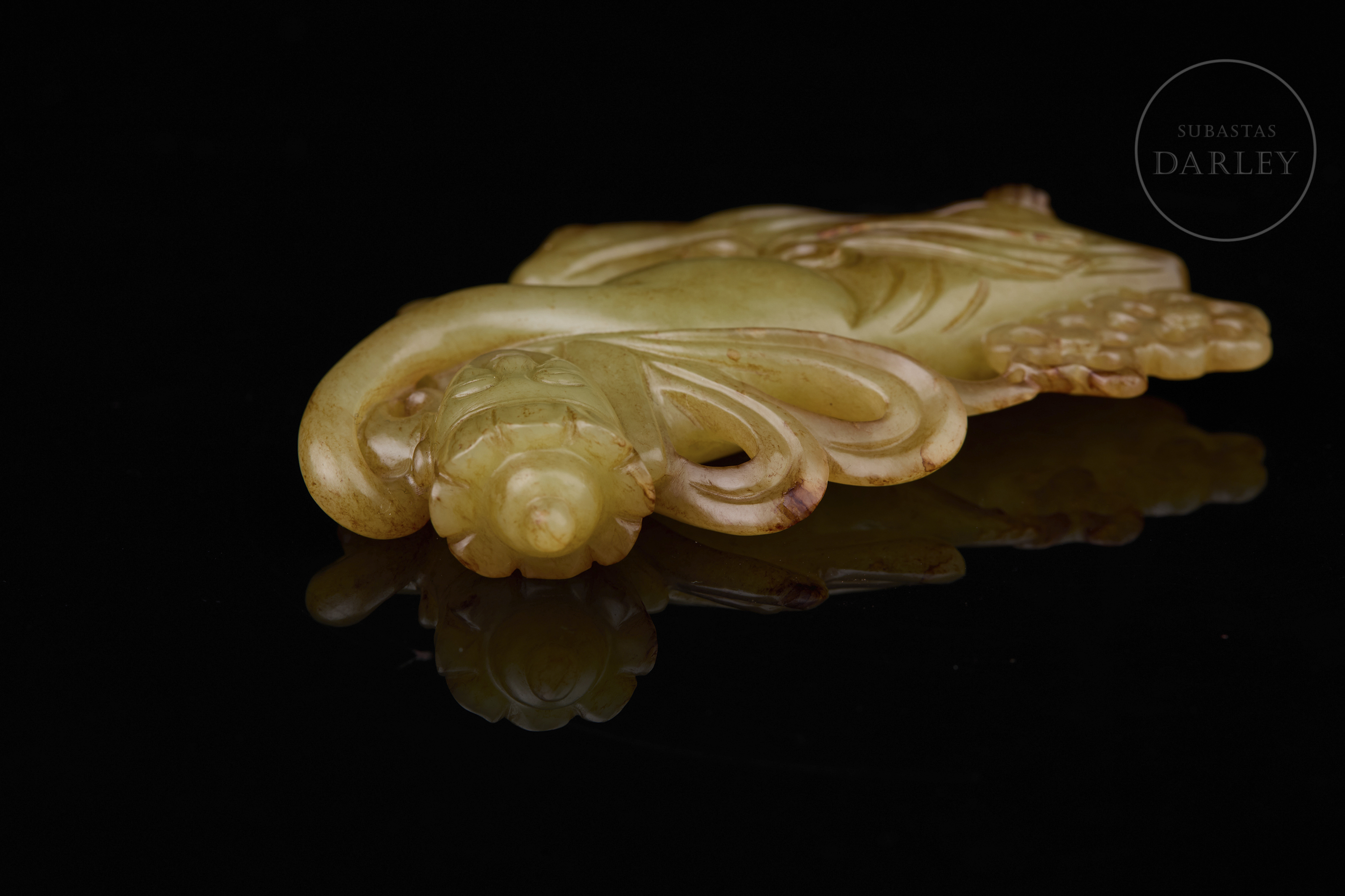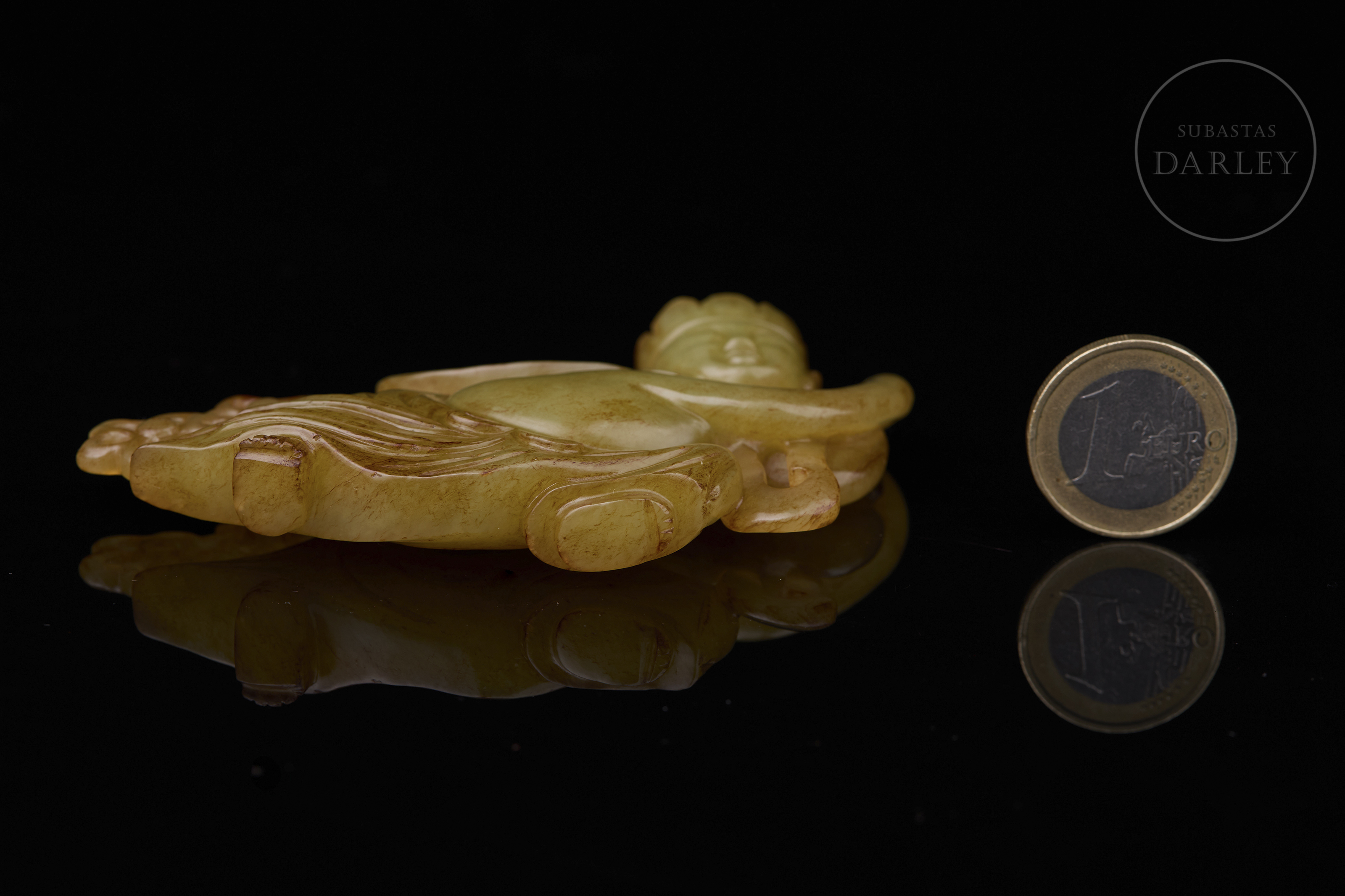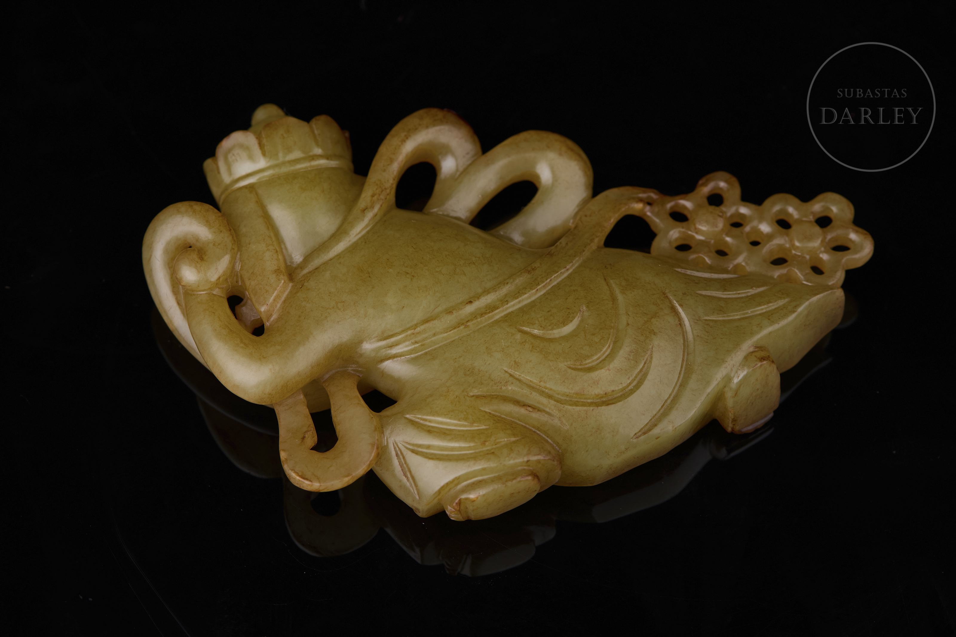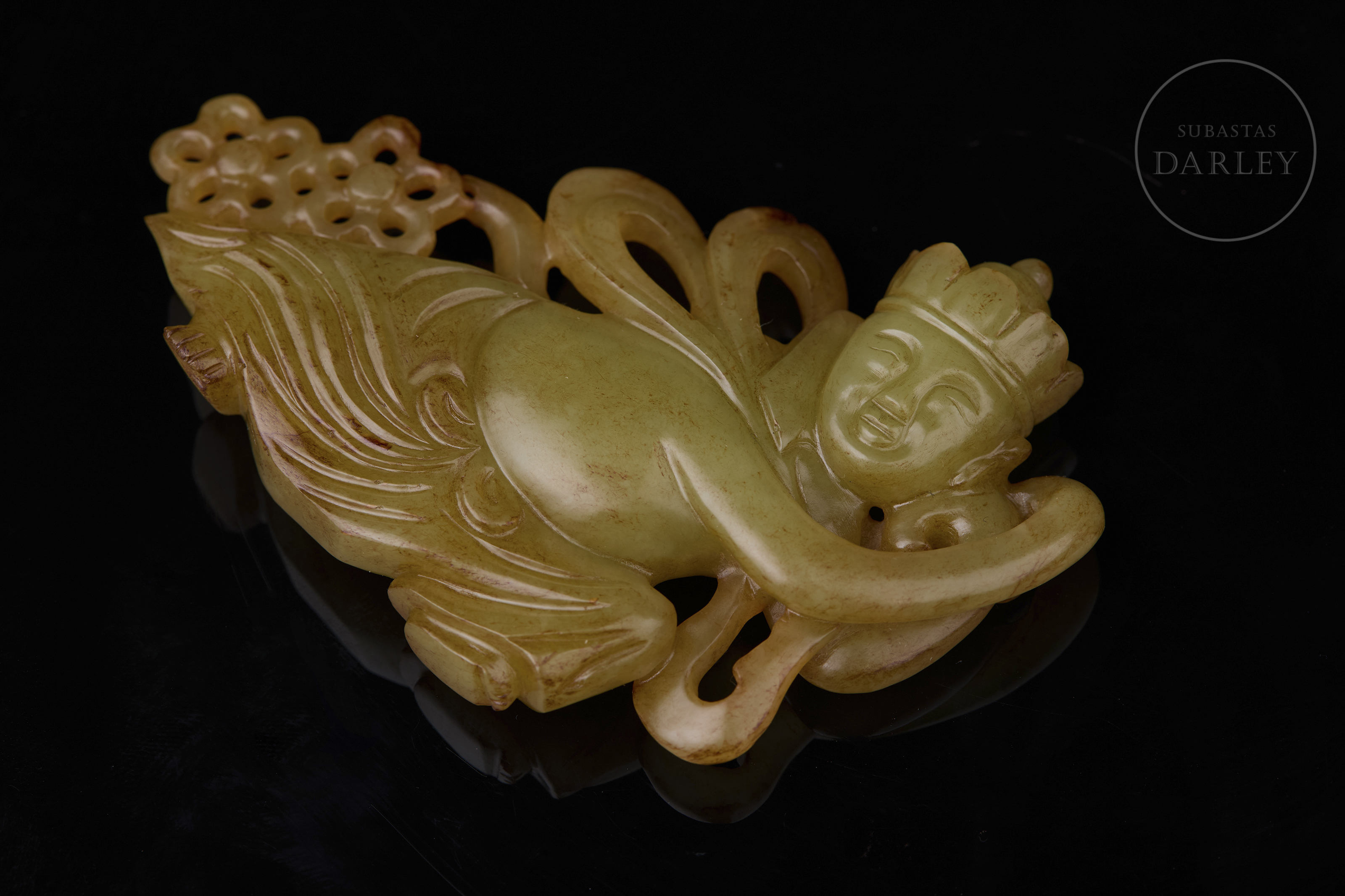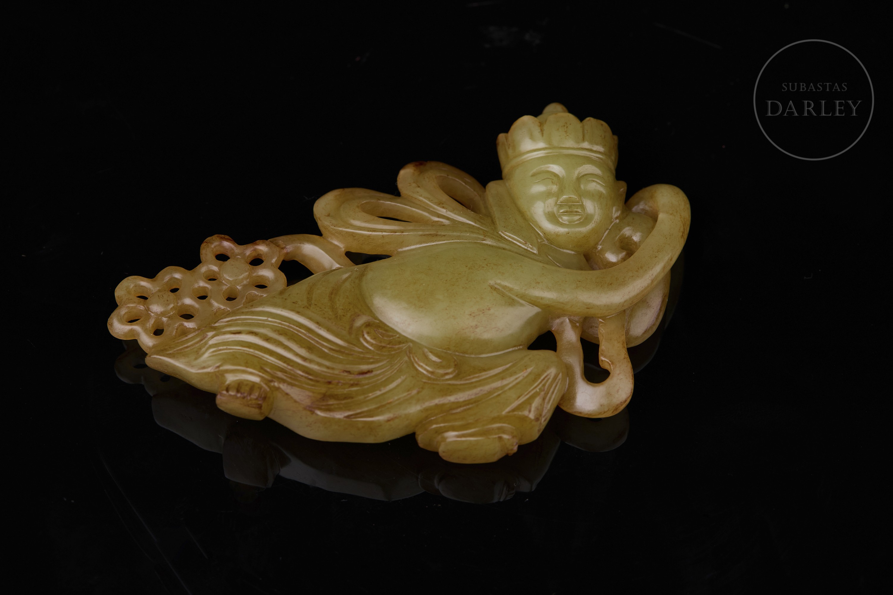 Placa de jade tallado de color amarillo con ligeras vetas rojizas. La placa, ancha y plana de contorno irregular y detalles calados, muestra la figura de un Inmortal, de aspecto etéreo, ataviado con fluidas túnicas y acompañado de dos pequeñas flores. Dinastía Qing (1644-1912).