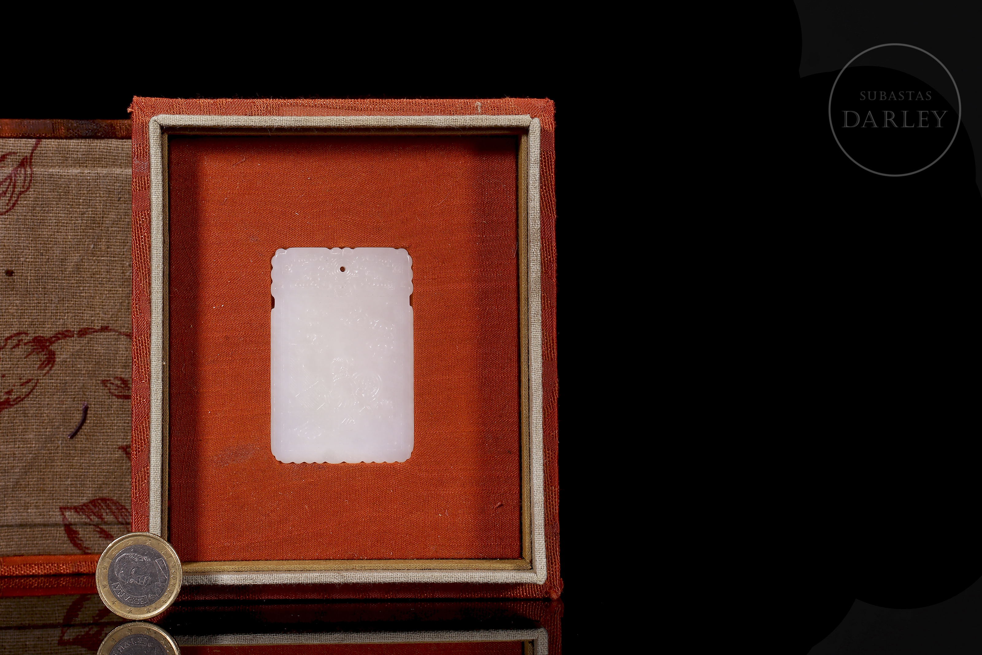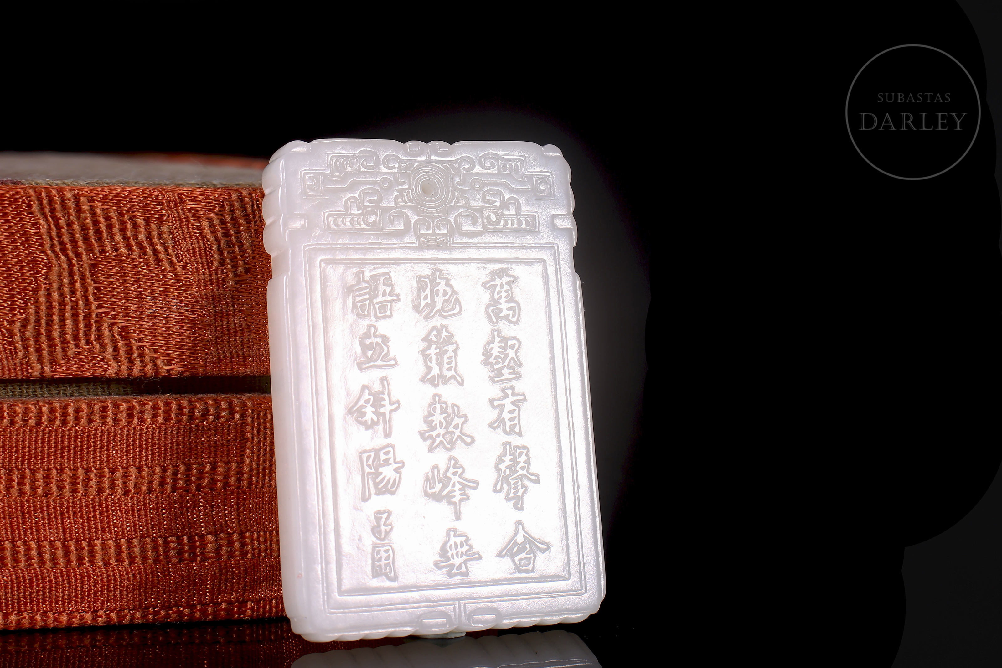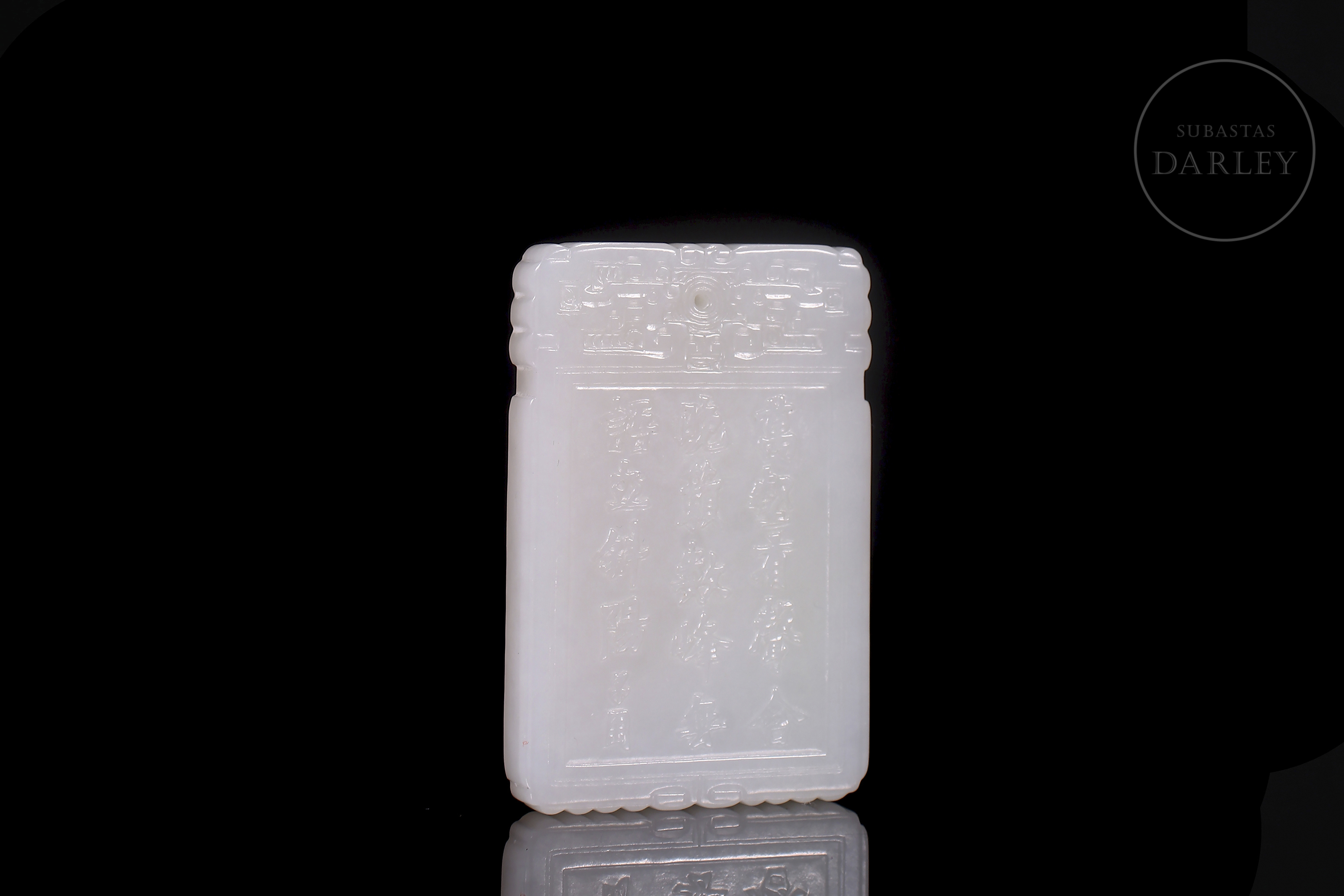 Placa tallada de jade blanco de Hetian, de forma rectangular y plana, con bordes superior e inferior tallados en un patrón de ondas. La decoración se divide en las dos caras: el anverso muestra una escena con una dama tejiendo en un telar, tallada en bajo relieve. El reverso presenta un poema de caligrafía fina, atribuido a Zigang "子冈". Con caja forrada a medida. Dinastía Qing (1644–1912).