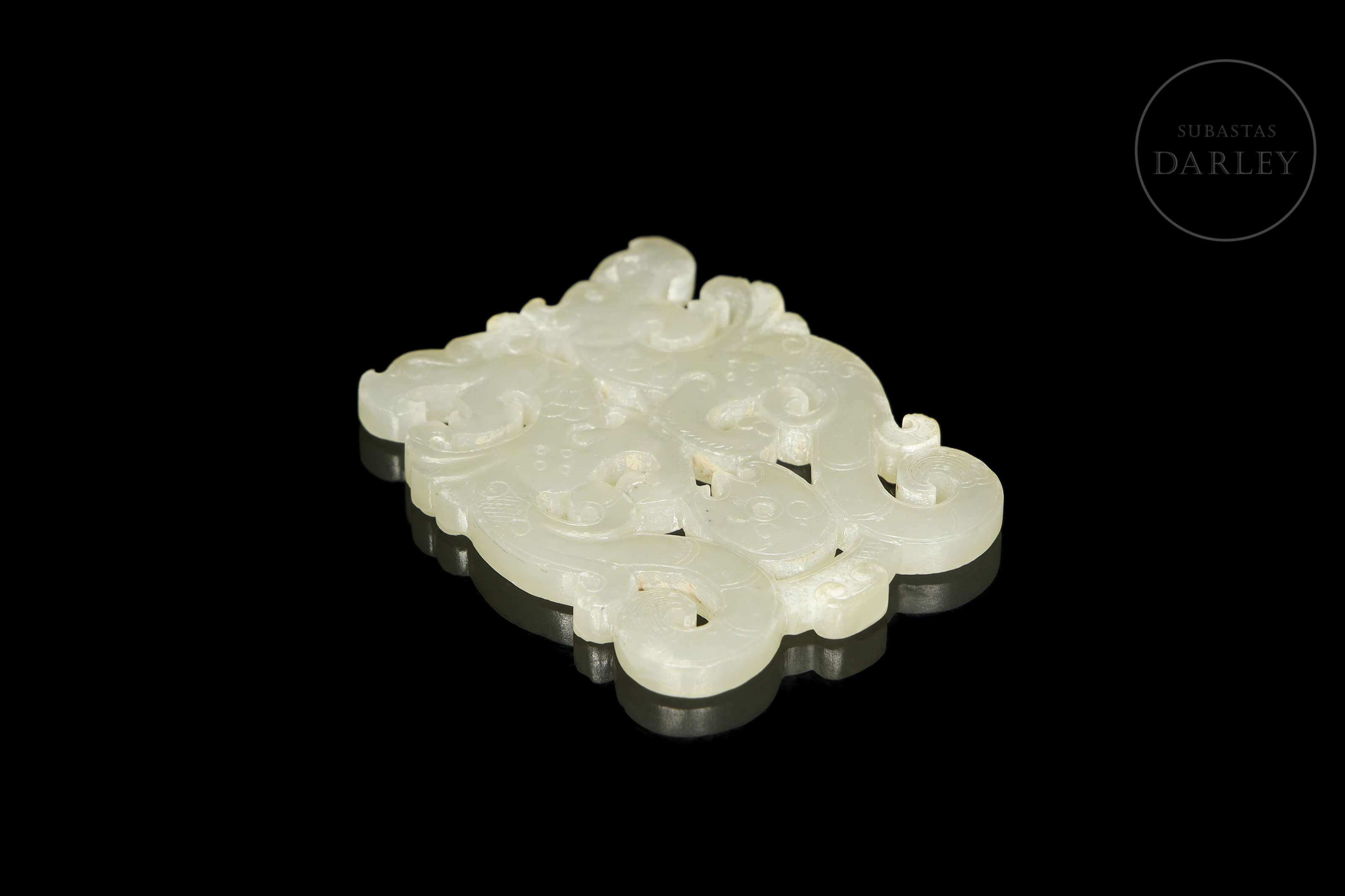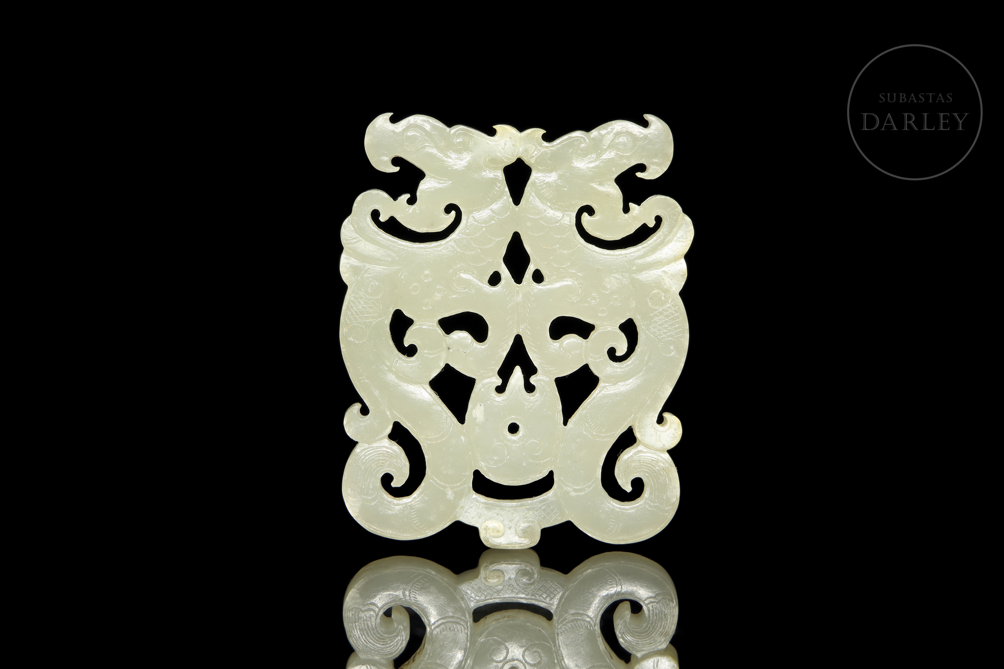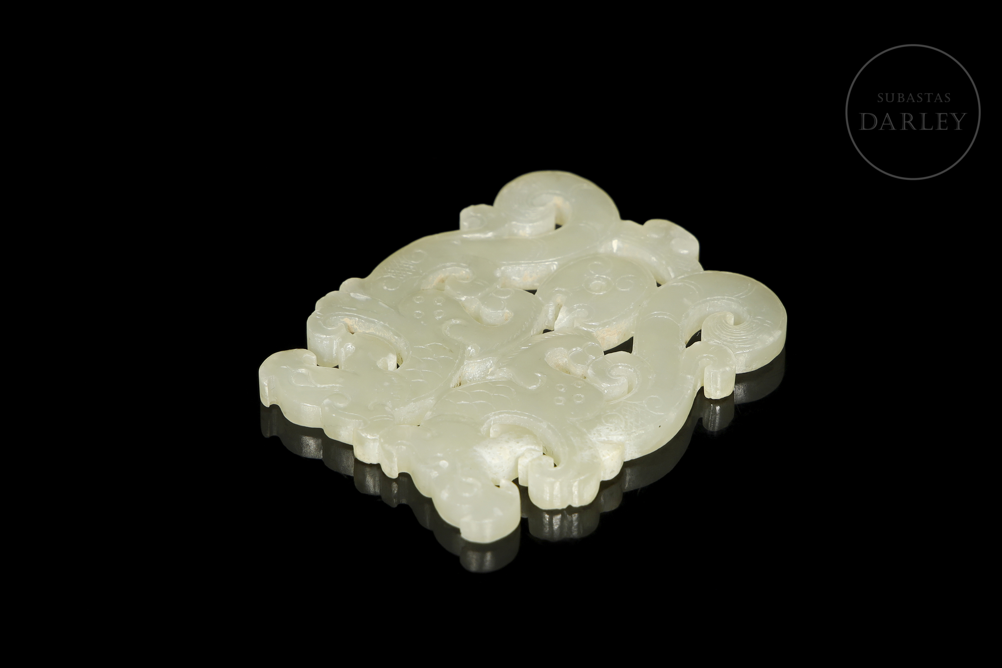 Colgante tallado y calado en jade de color blanco cremoso. La pieza representa dos dragones de estilo arcaico, con el cuerpo contorsionado en una elegante forma de "S" dispuestos de forma opuesta, uniéndose a la altura de la espalda y las patas. La superficie está finamente detallada con incisiones que simulan las escamas, el pelaje y las afiladas garras.