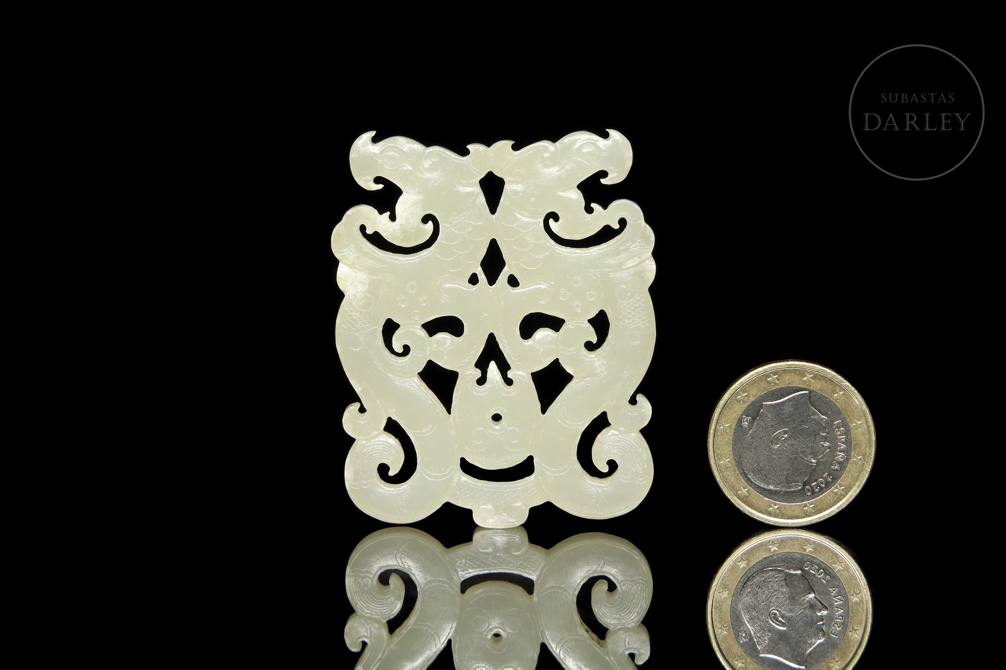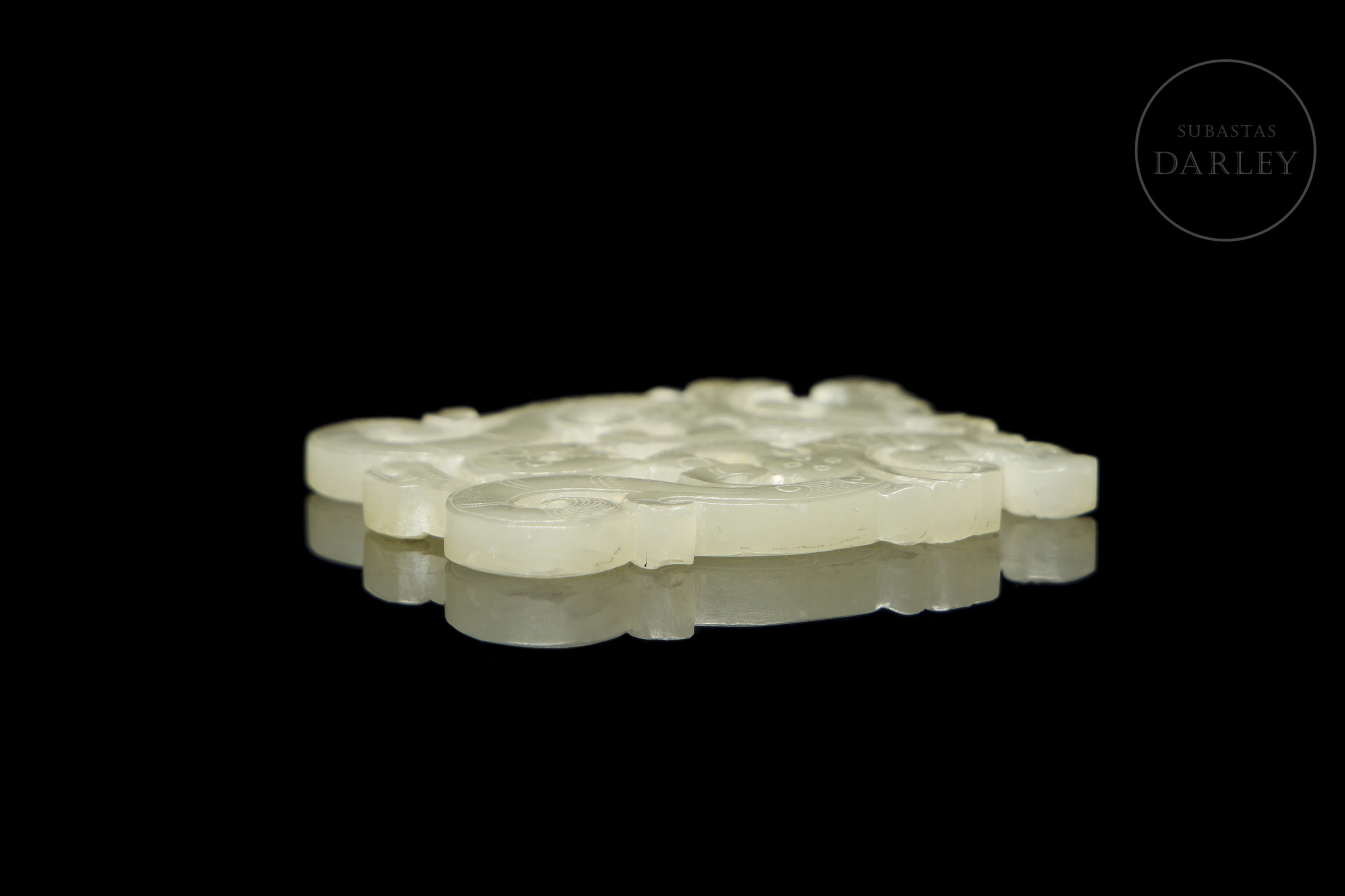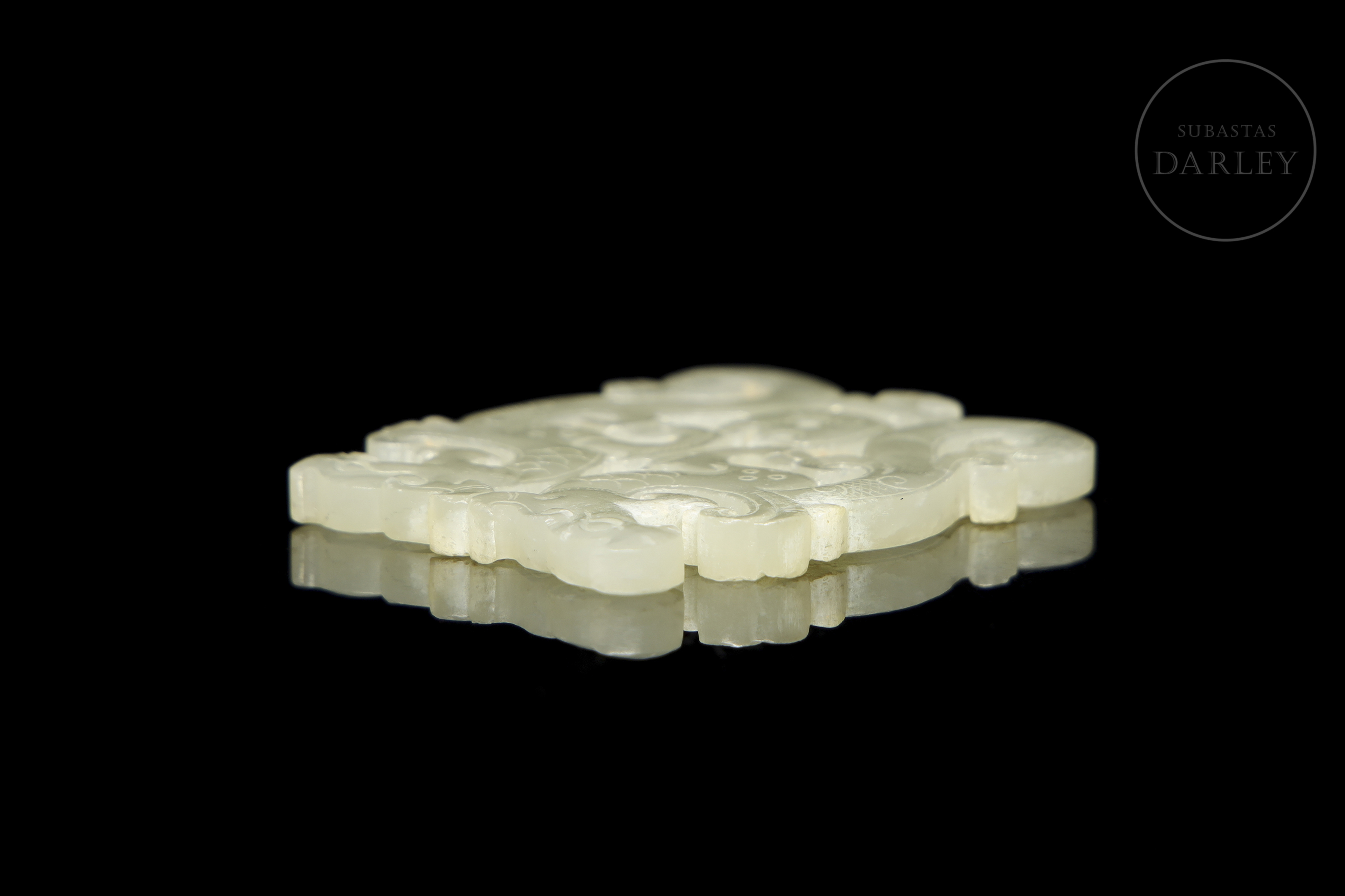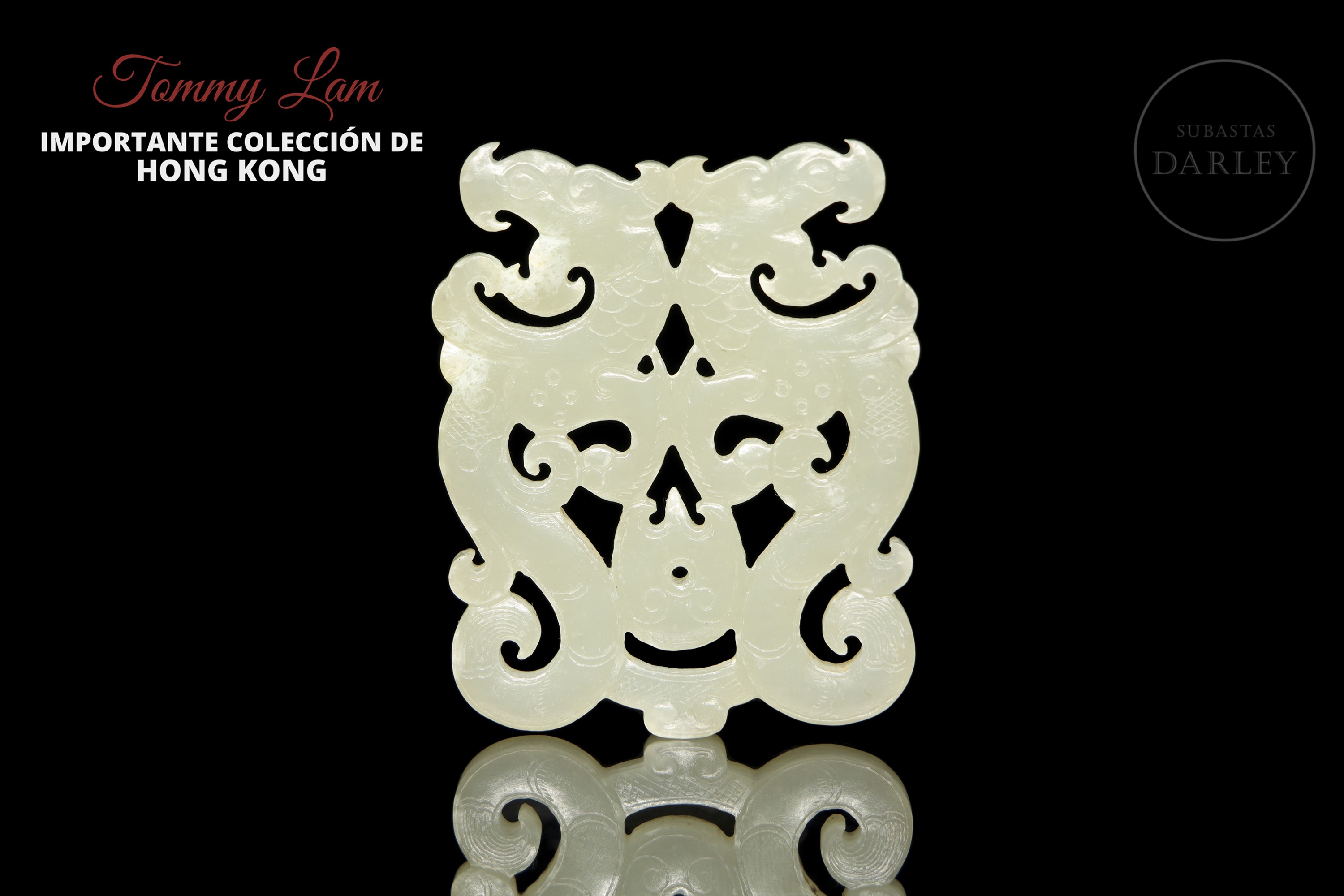 Colgante tallado y calado en jade de color blanco cremoso. La pieza representa dos dragones de estilo arcaico, con el cuerpo contorsionado en una elegante forma de "S" dispuestos de forma opuesta, uniéndose a la altura de la espalda y las patas. La superficie está finamente detallada con incisiones que simulan las escamas, el pelaje y las afiladas garras.