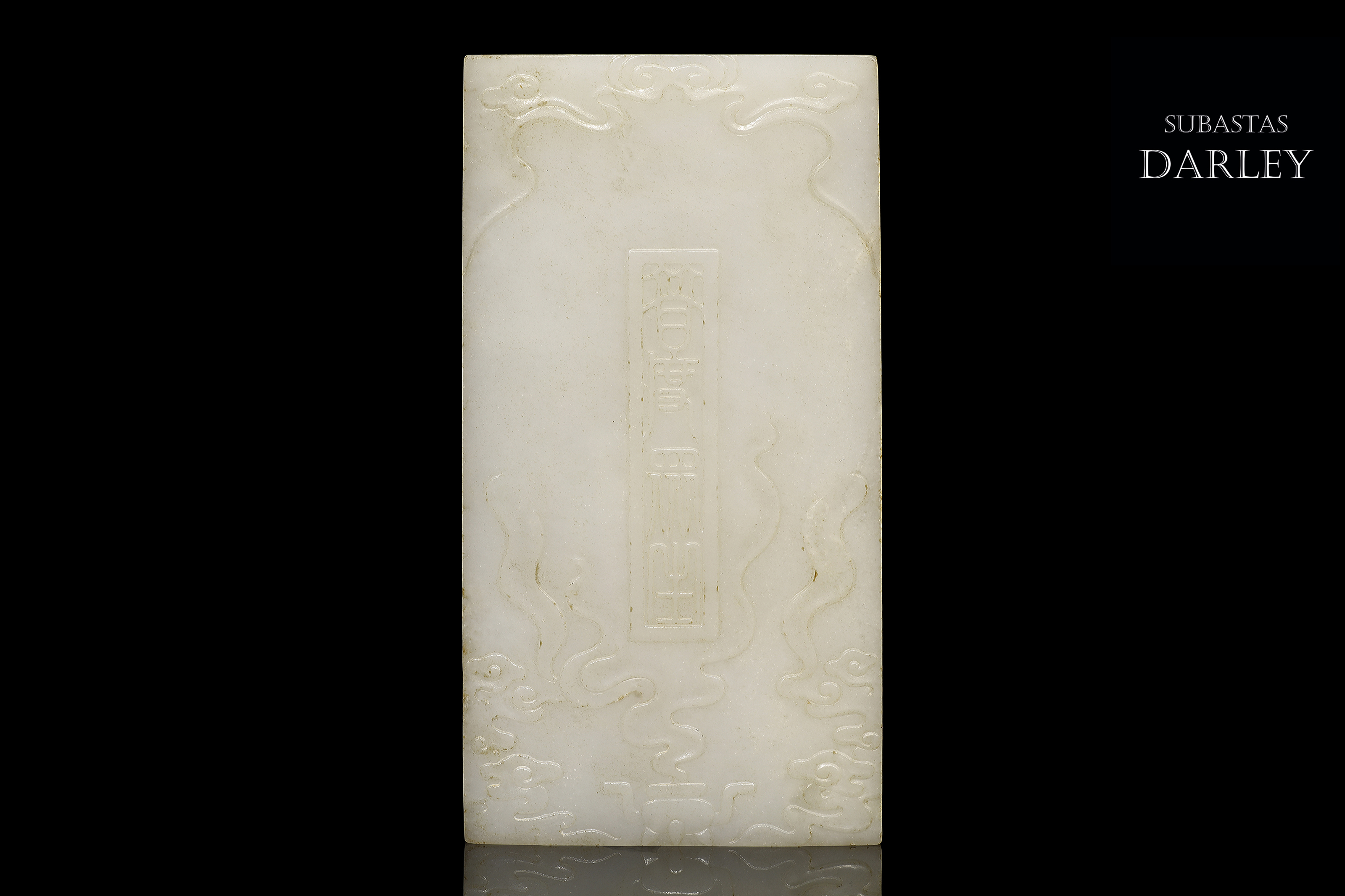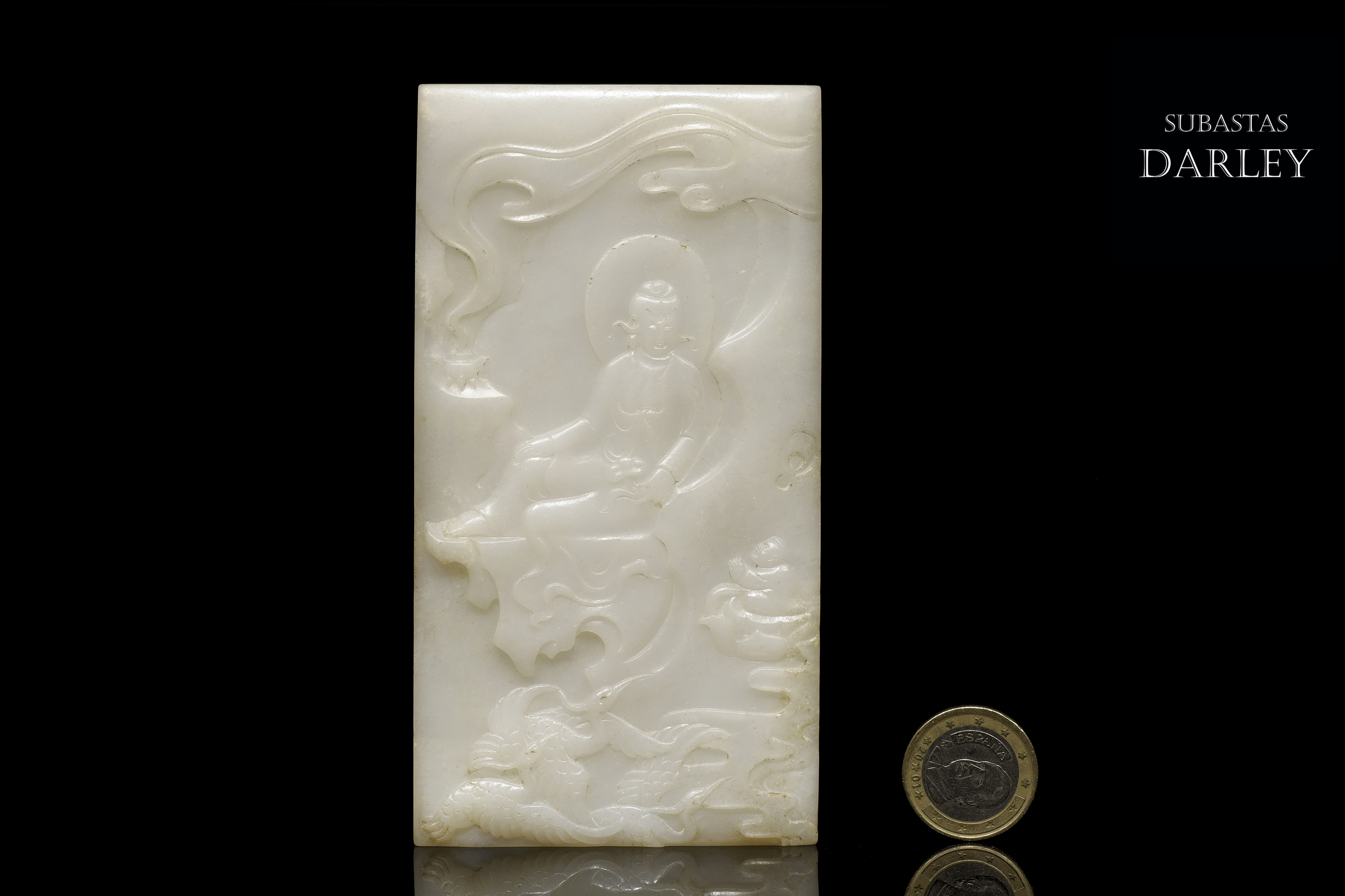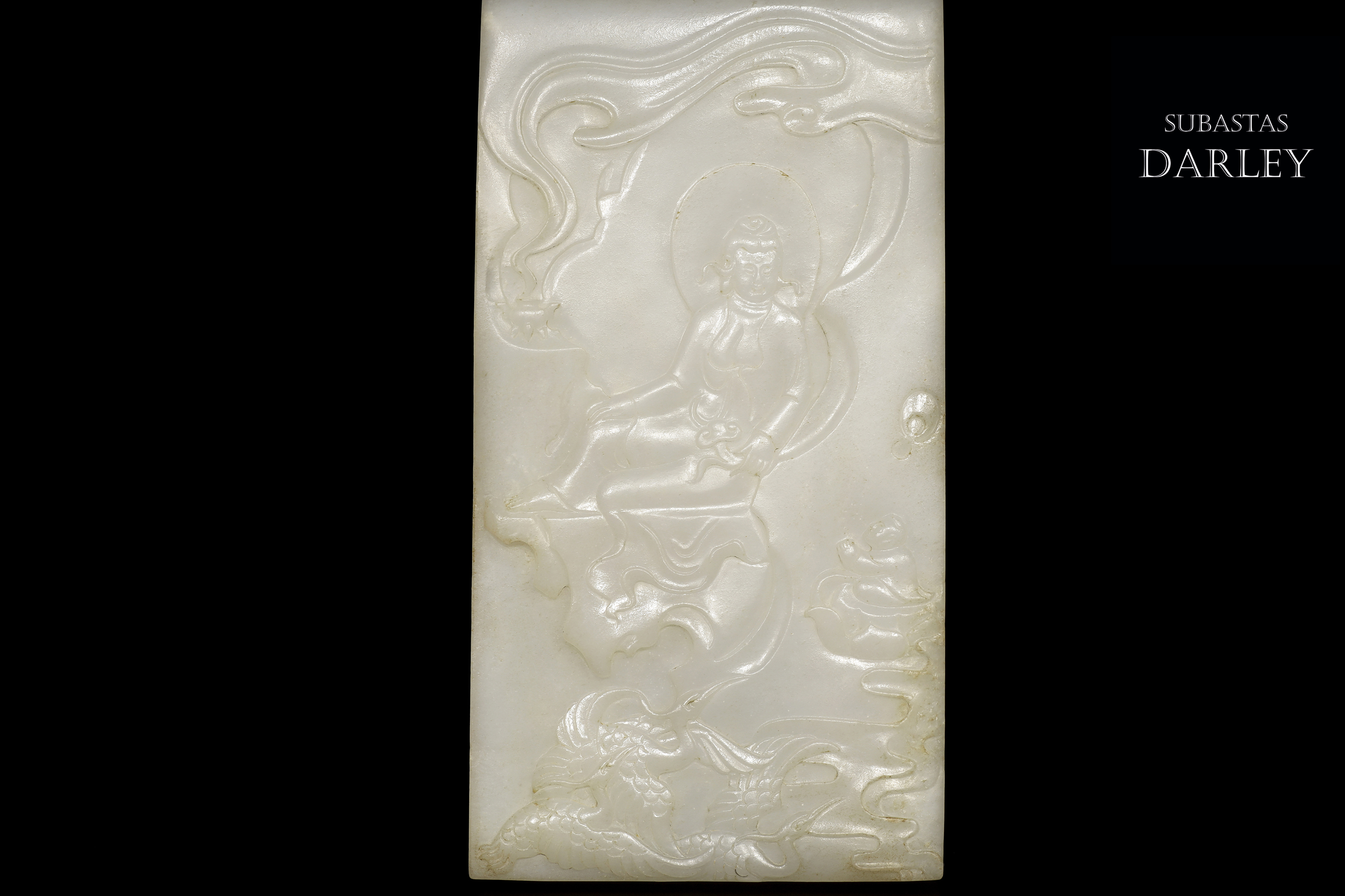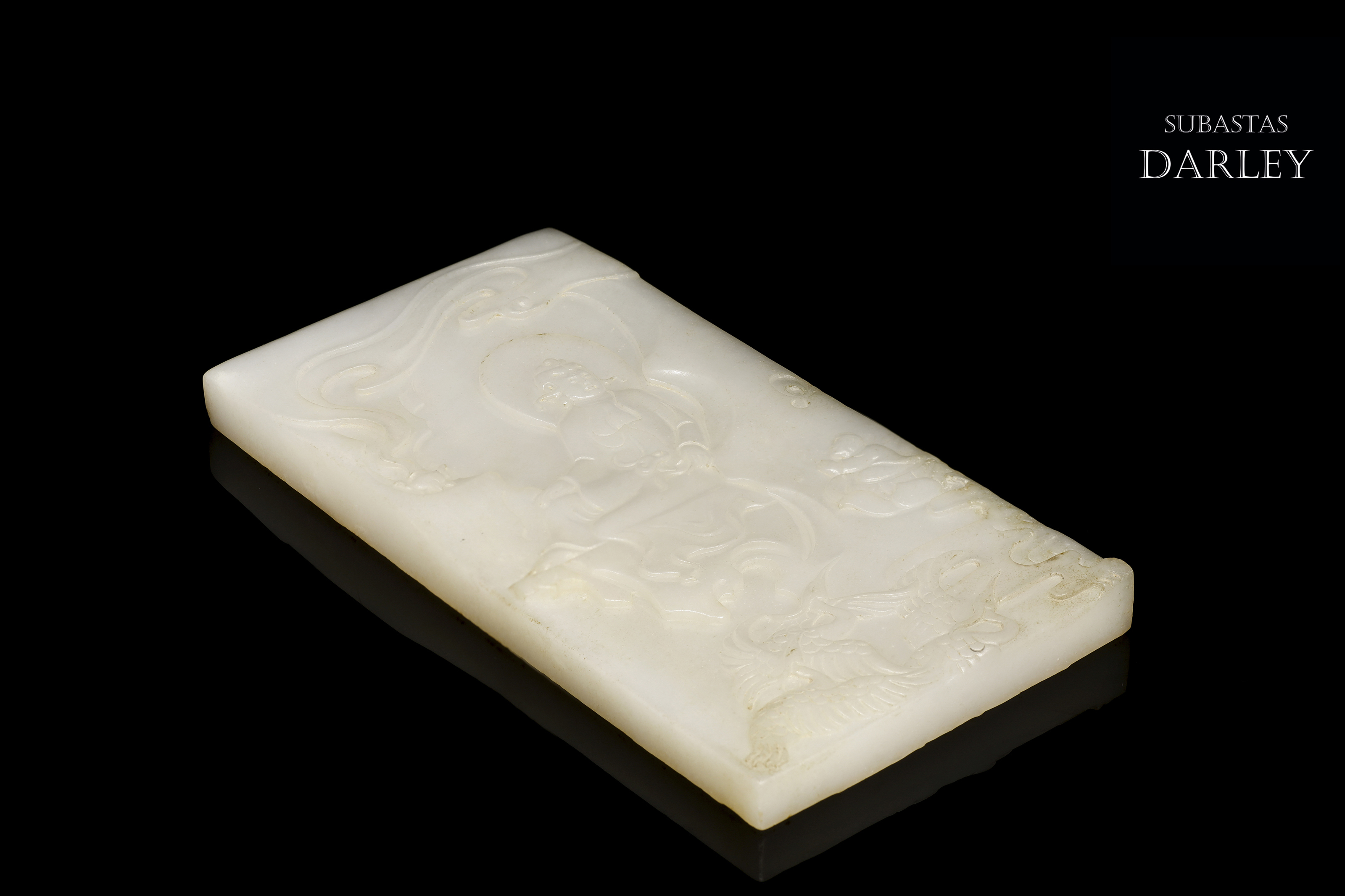 Jade blanco tallado minuciosamente por ambos lados. La forma es rectangular, con esquinas cuadradas, y representa, por un lado, un relieve de un niño adorado a la diosa Guanyin, y, por otro, una cartela con caracteres rodeada de nubes. Cabe destacar la finura y detalles de la talla. En muy buen estado para la antigüedad.