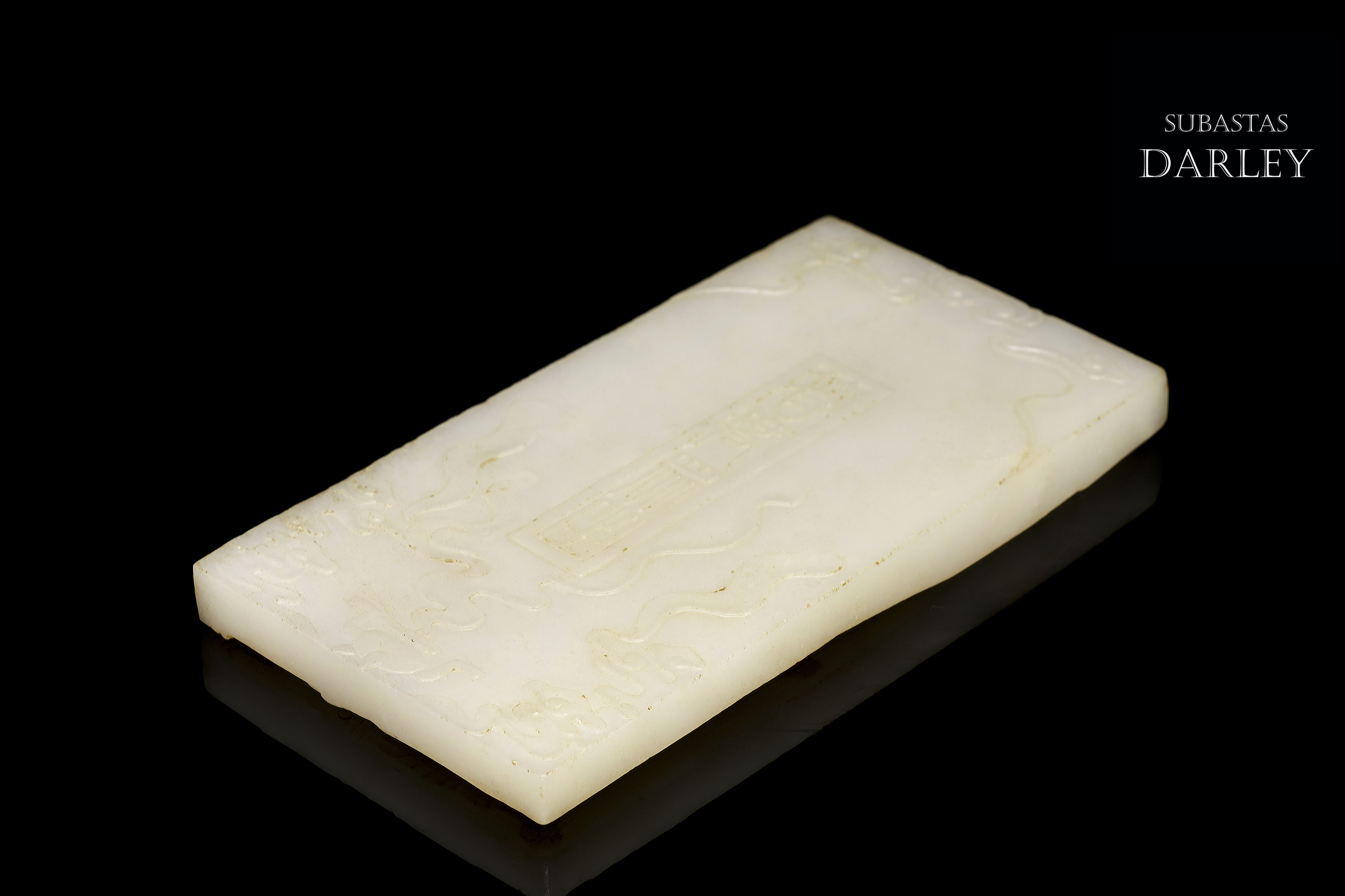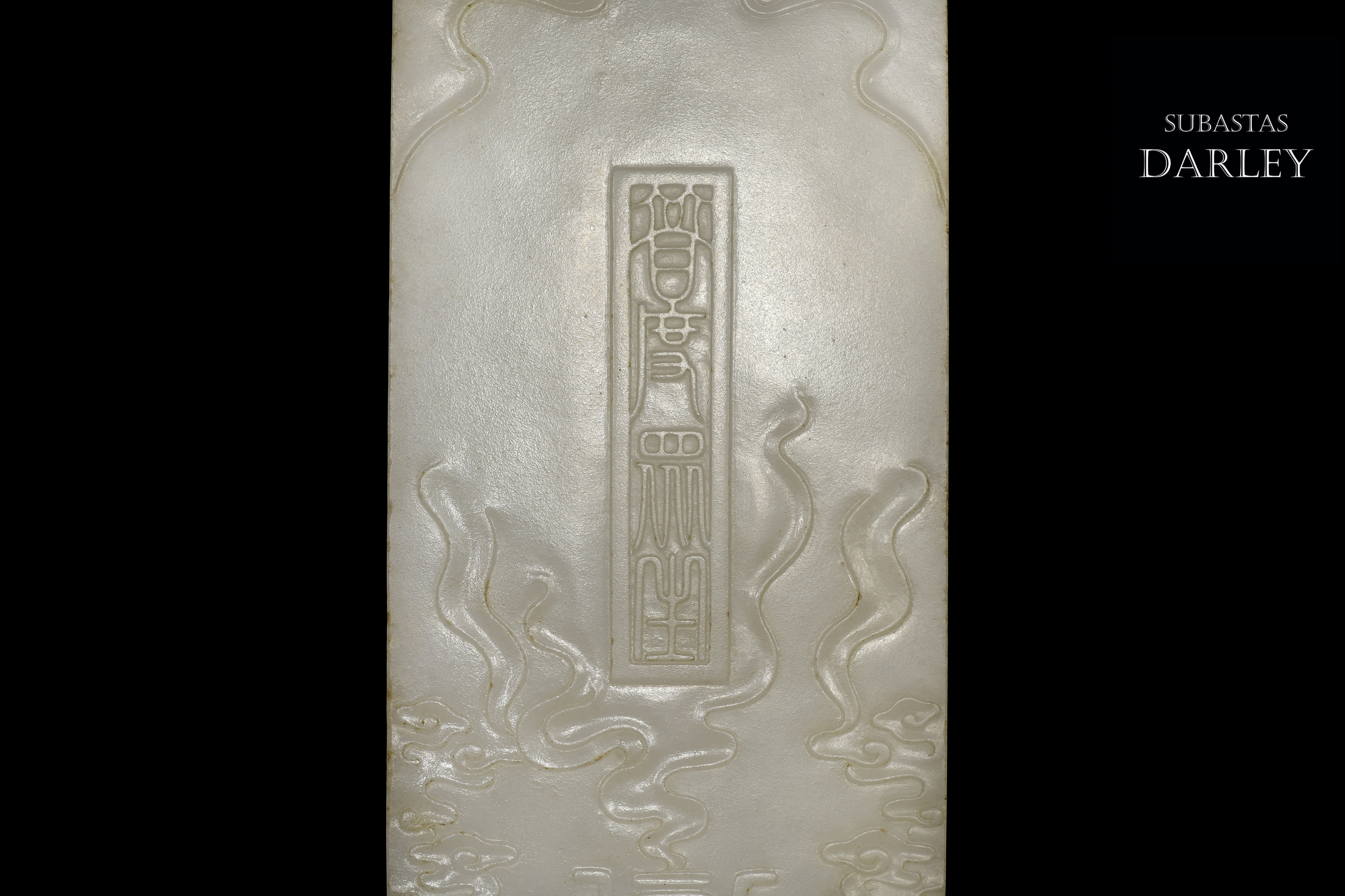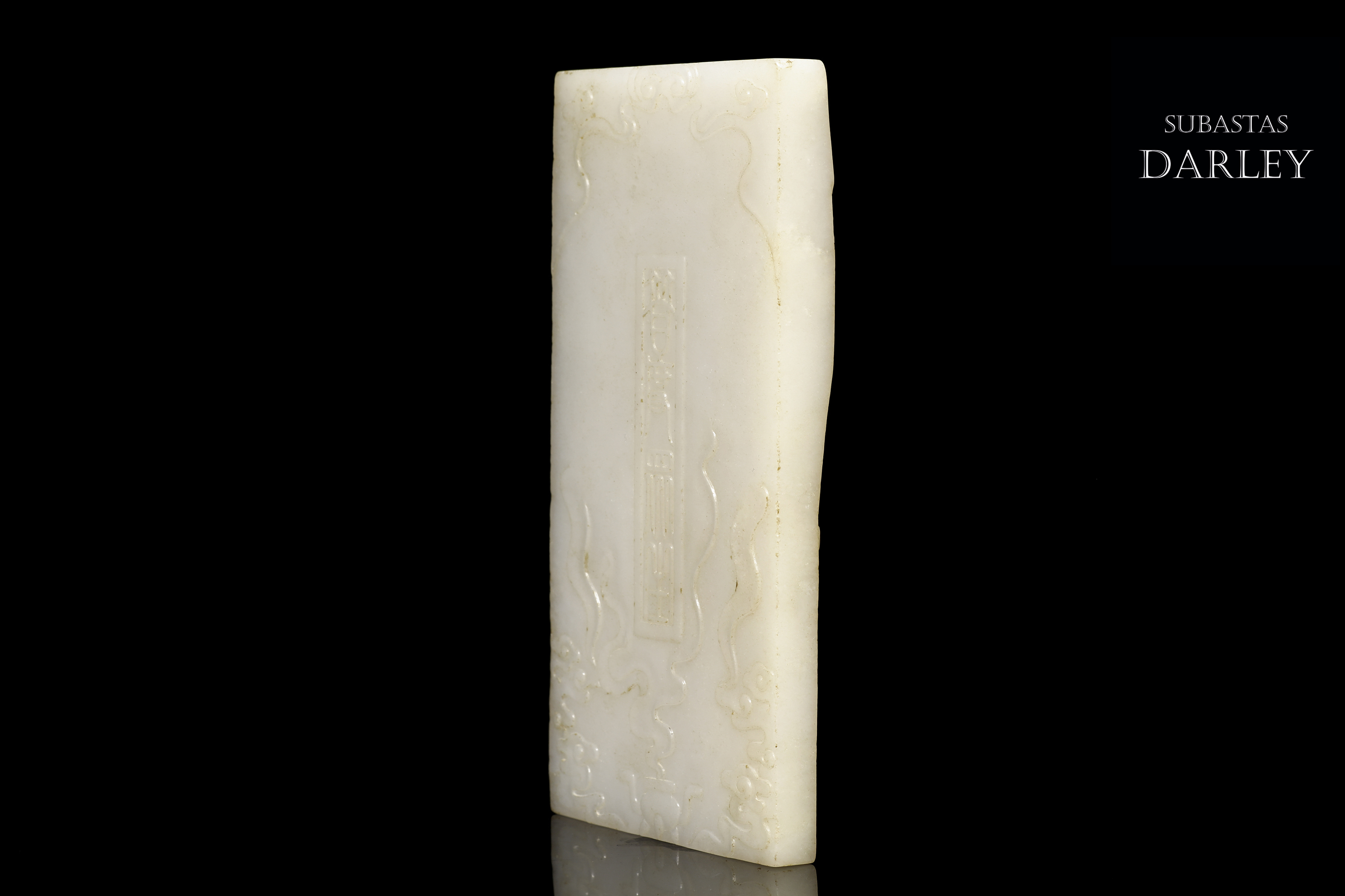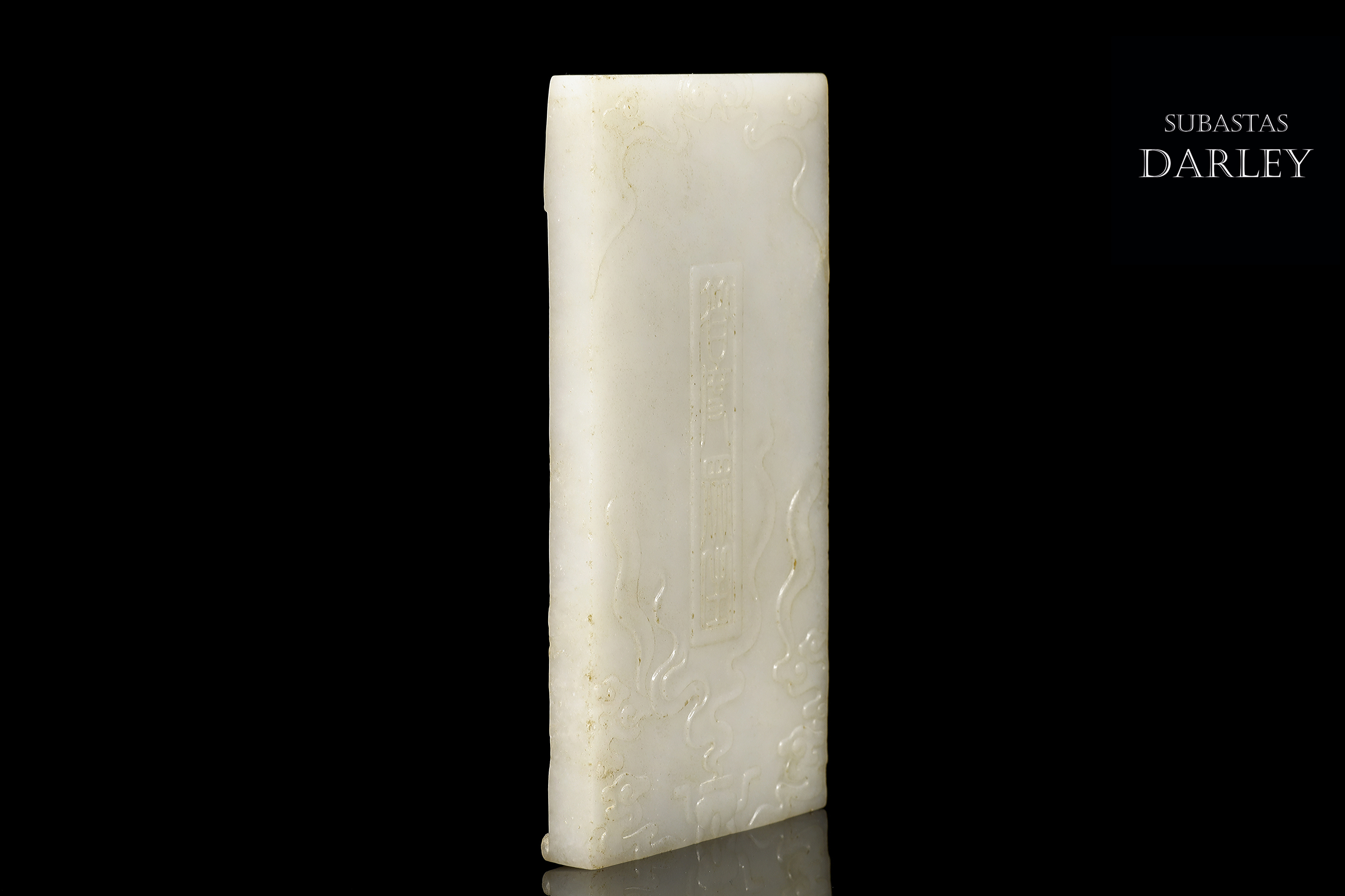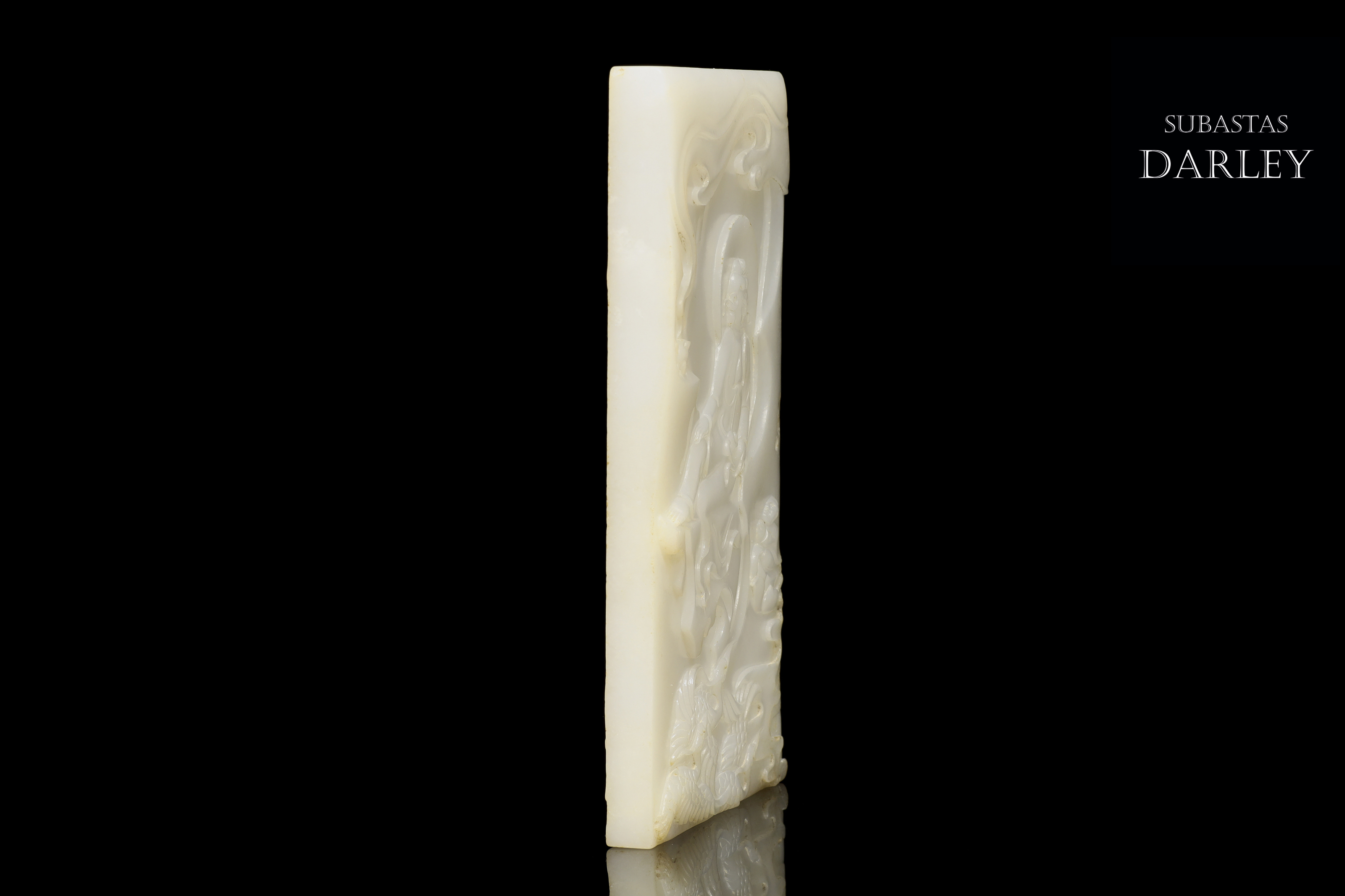Jade blanco tallado minuciosamente por ambos lados. La forma es rectangular, con esquinas cuadradas, y representa, por un lado, un relieve de un niño adorado a la diosa Guanyin, y, por otro, una cartela con caracteres rodeada de nubes. Cabe destacar la finura y detalles de la talla. En muy buen estado para la antigüedad.