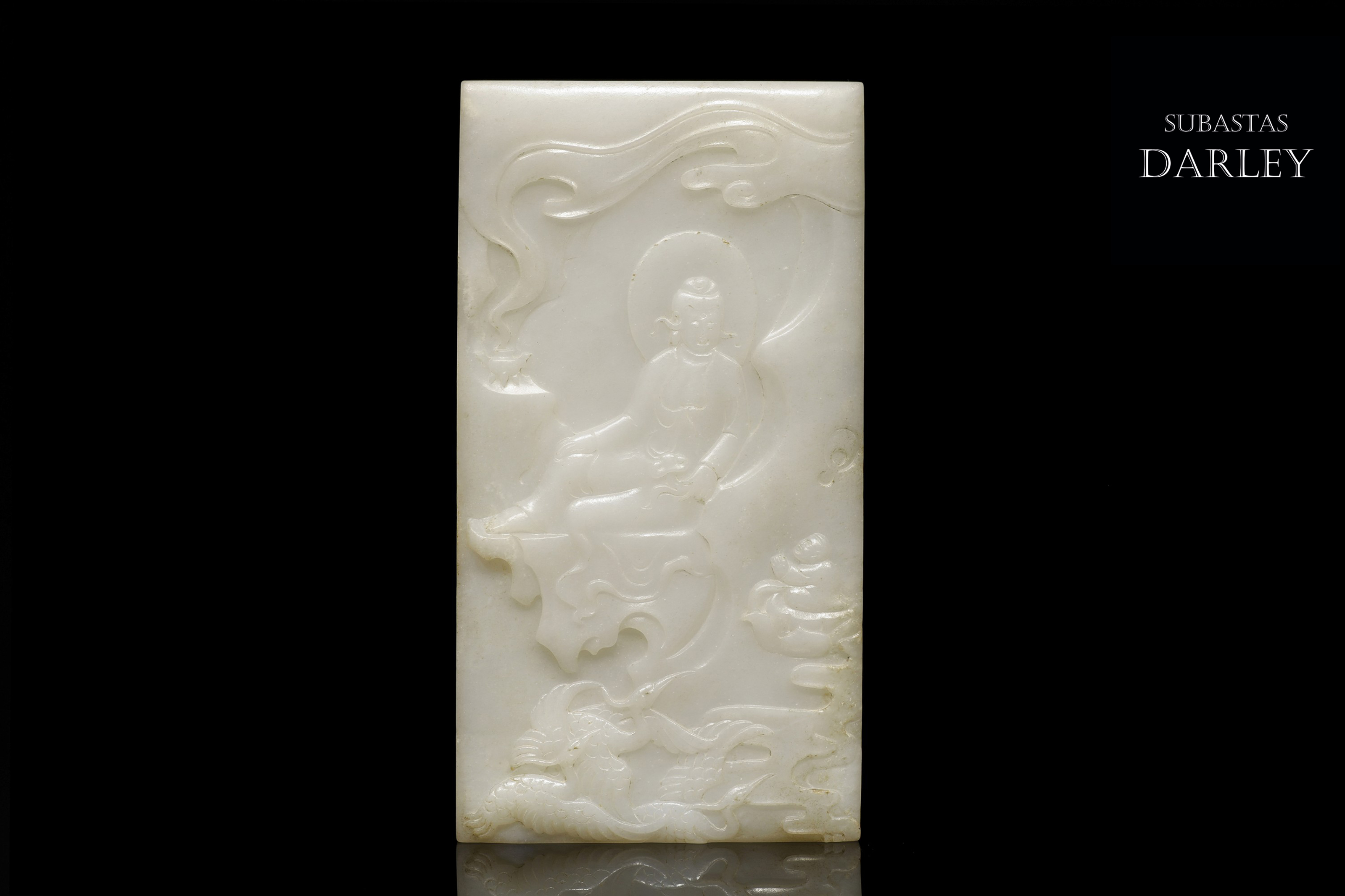 Placa de jade blanco "Niño y Guanyin", dinastía Qing