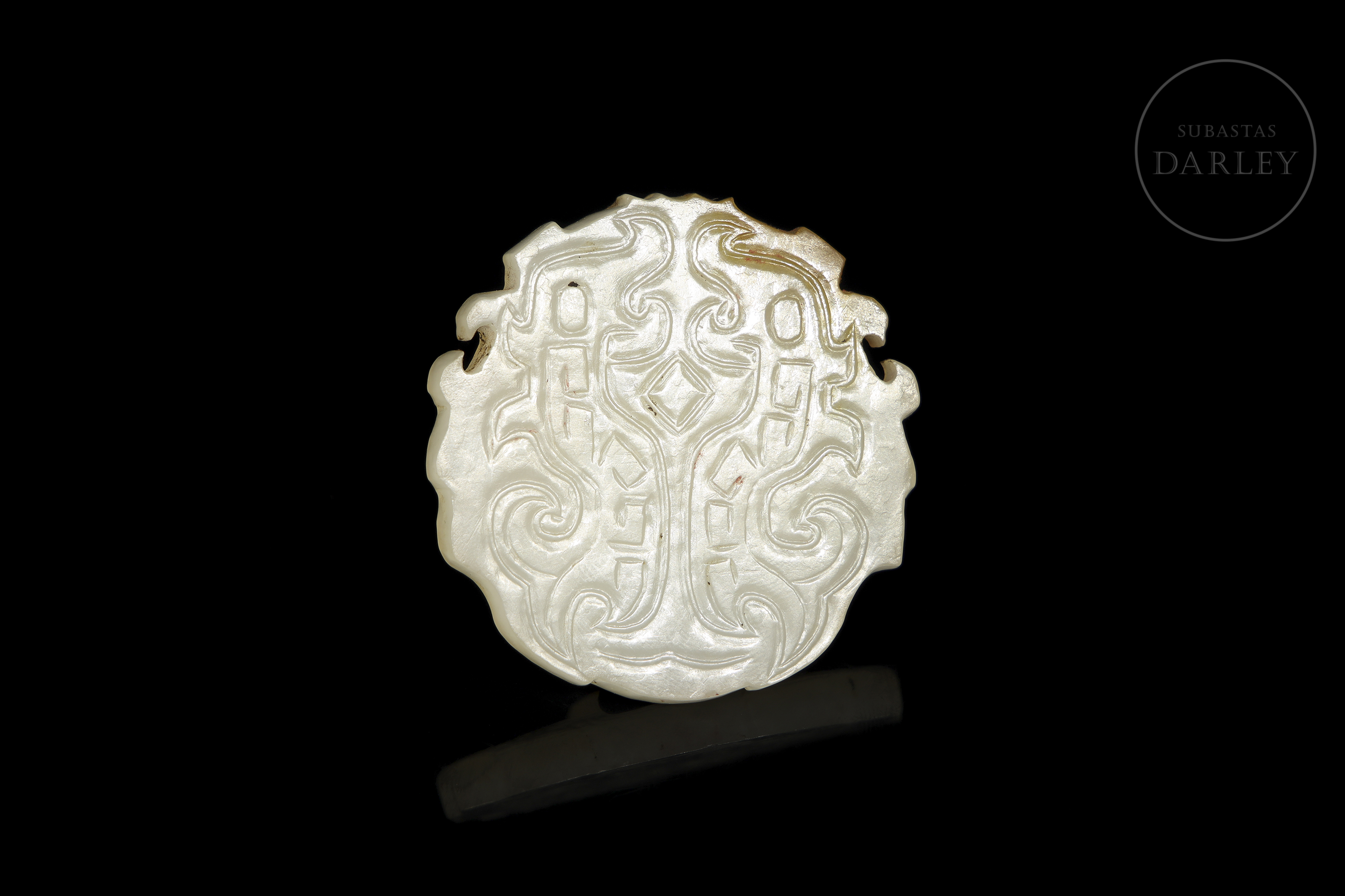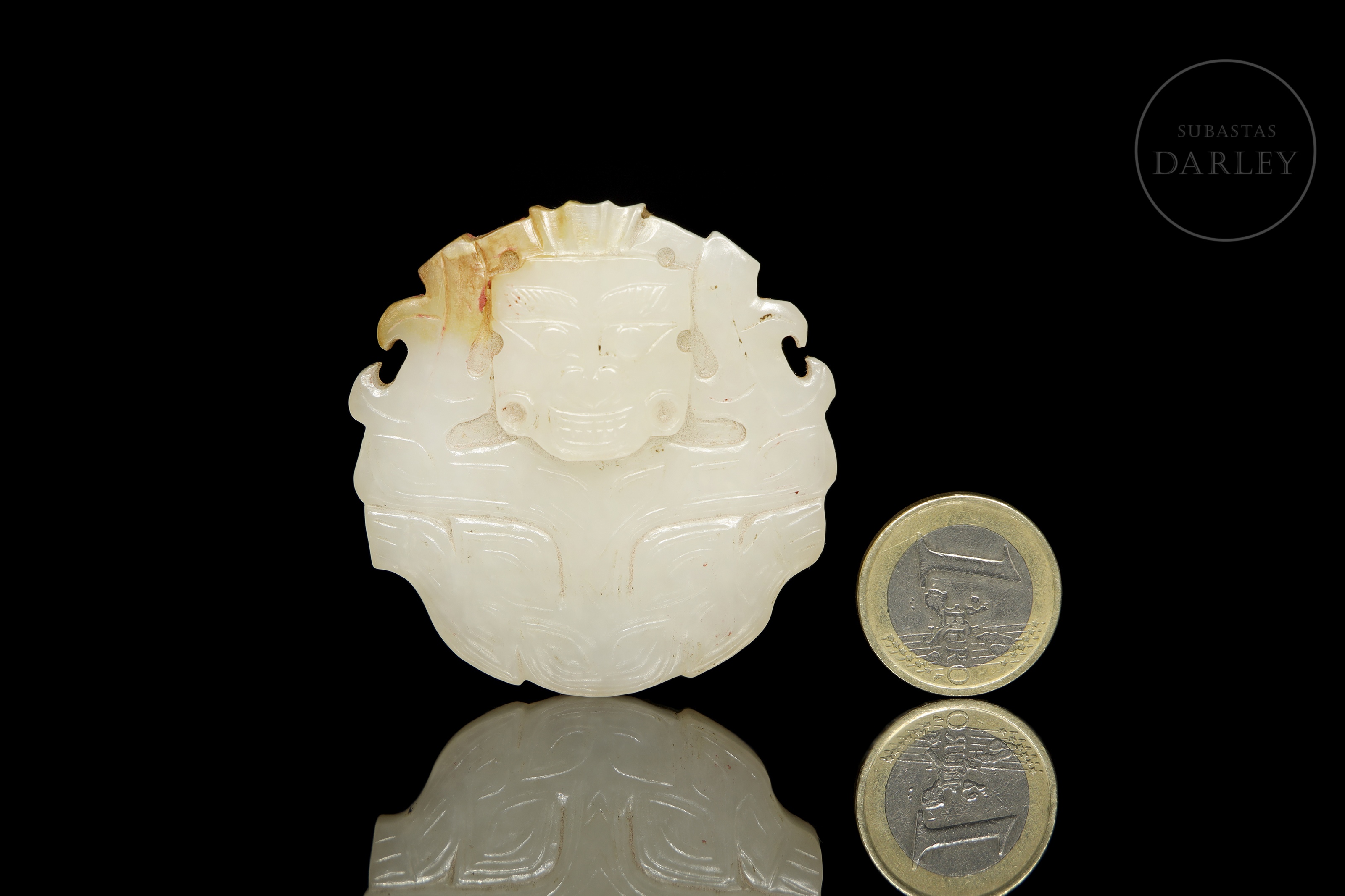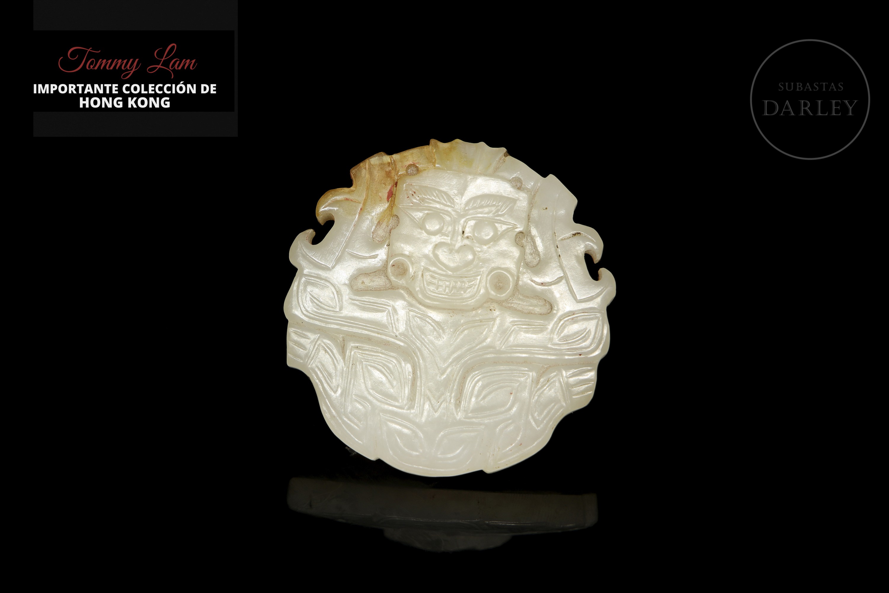 Jade de tono blanco con áreas de tonalidad ocre. La pieza presenta un formato circular, decorado en su anverso con la representación de una máscara taotie sobre la que se dispone el rostro de una deidad de amplia sonrisa, con ojos profundos, nariz ancha y cejas prominentes. El reverso está adornado con motivos arcaicos. Dinastía Shang (aprox. 1600–1046 a.C.) o posterior.