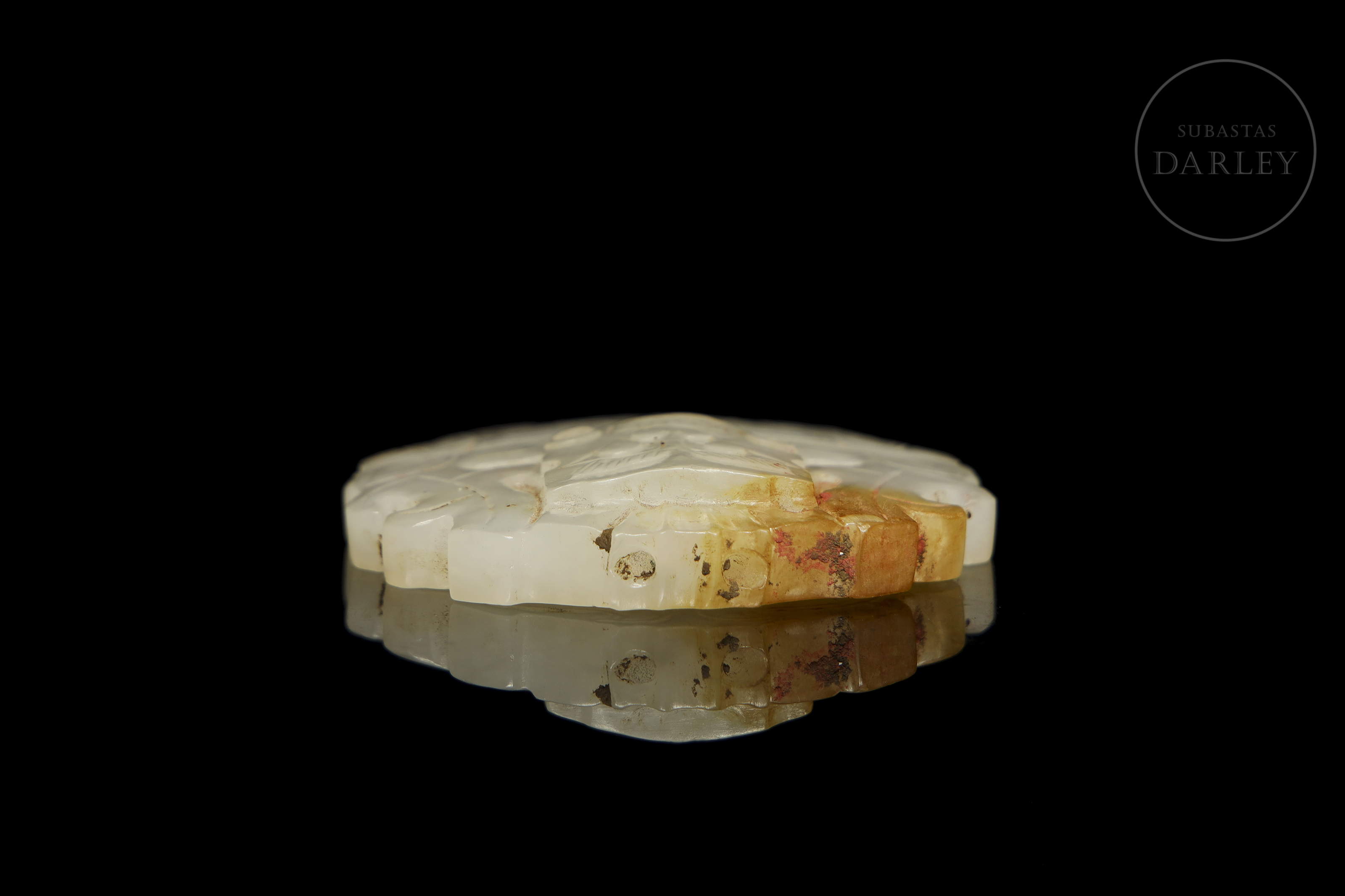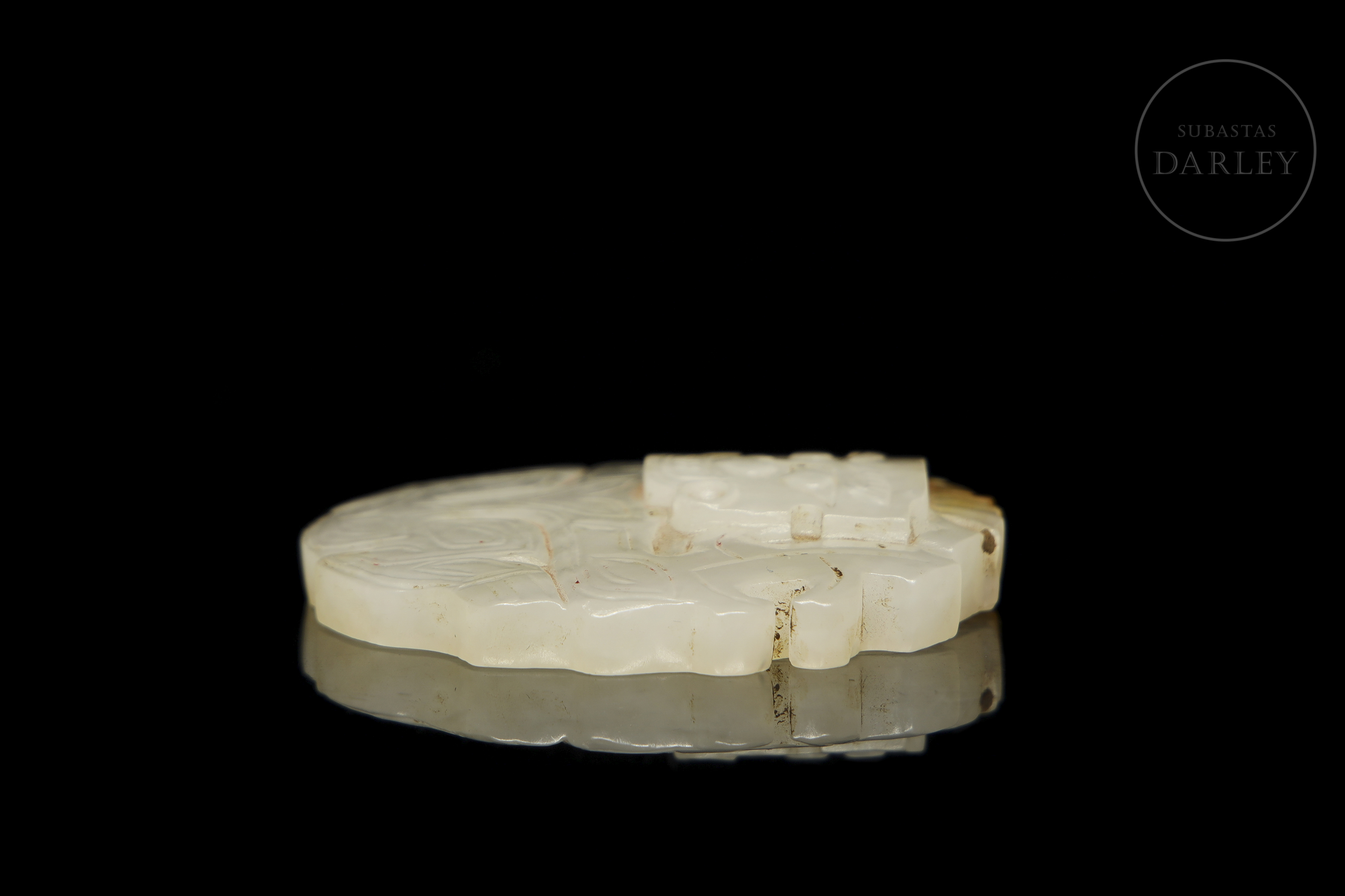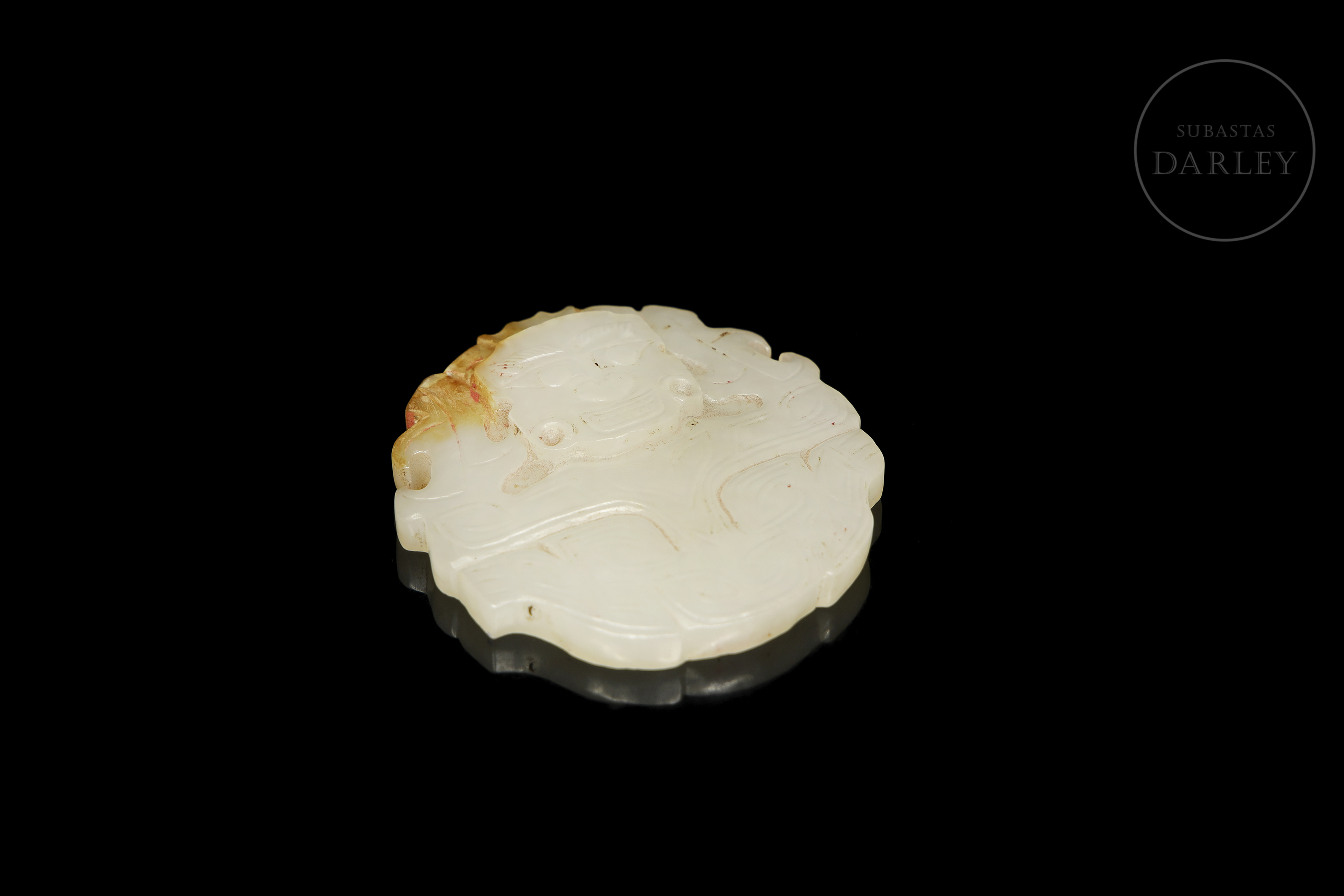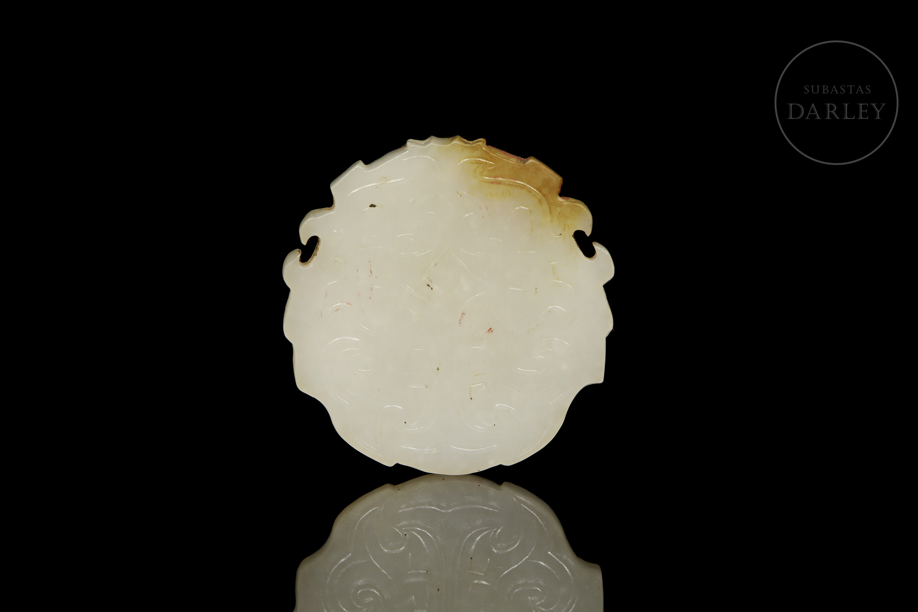Jade de tono blanco con áreas de tonalidad ocre. La pieza presenta un formato circular, decorado en su anverso con la representación de una máscara taotie sobre la que se dispone el rostro de una deidad de amplia sonrisa, con ojos profundos, nariz ancha y cejas prominentes. El reverso está adornado con motivos arcaicos. Dinastía Shang (aprox. 1600–1046 a.C.) o posterior.