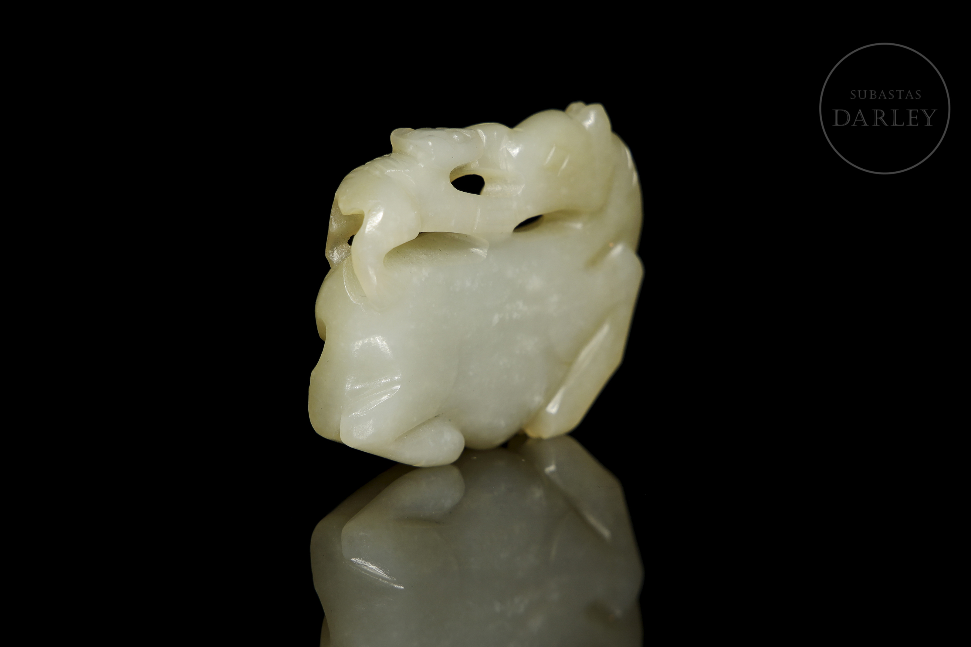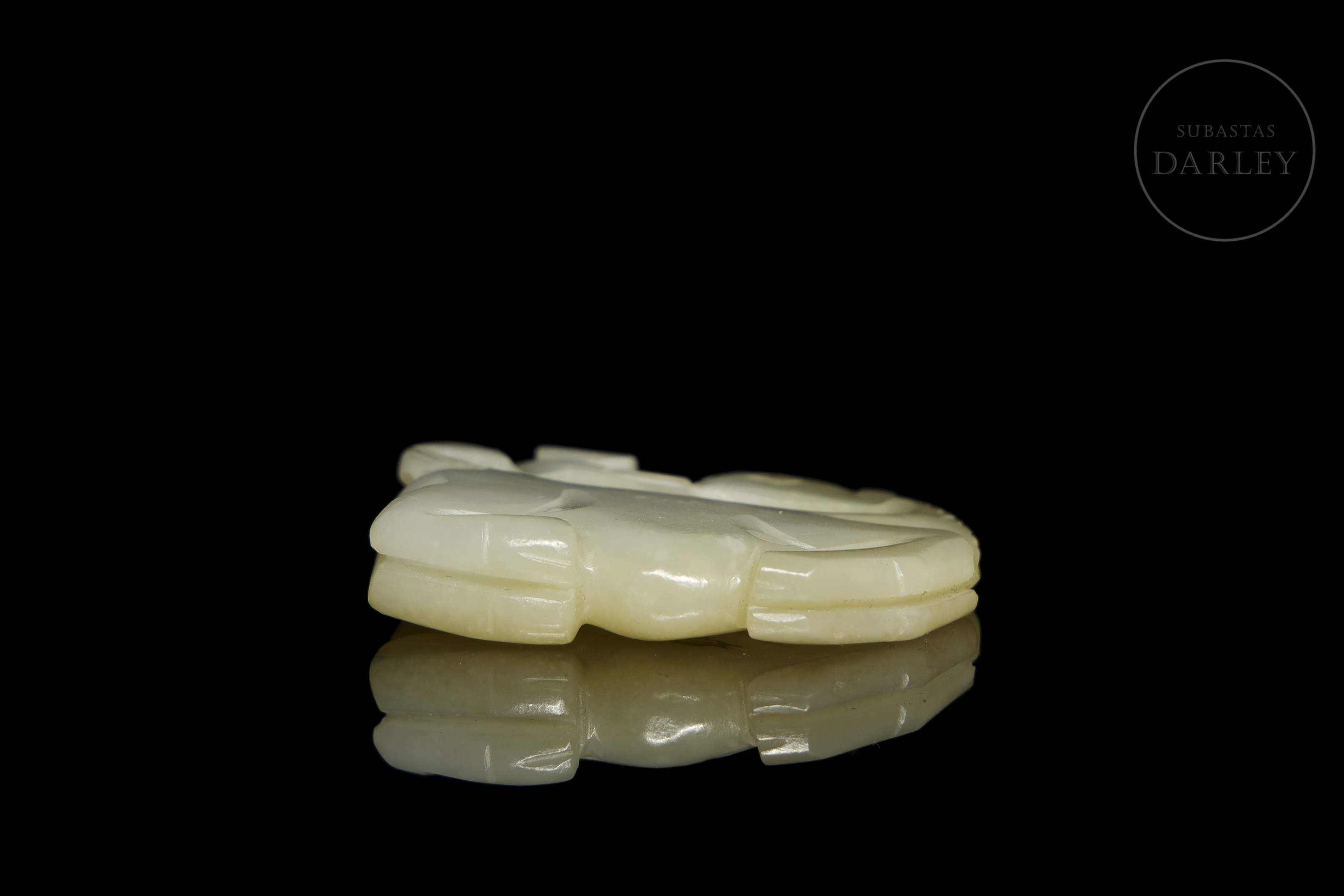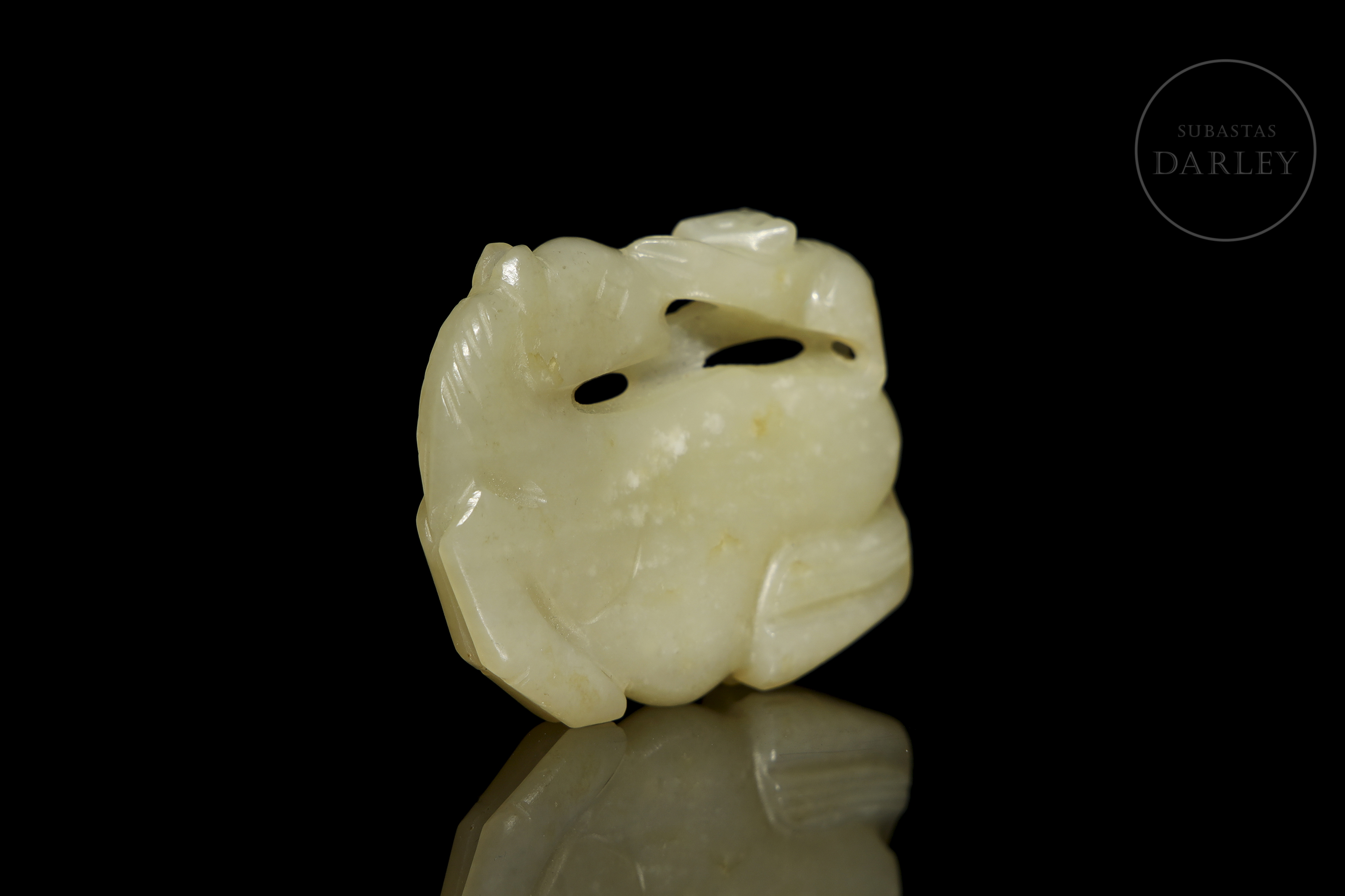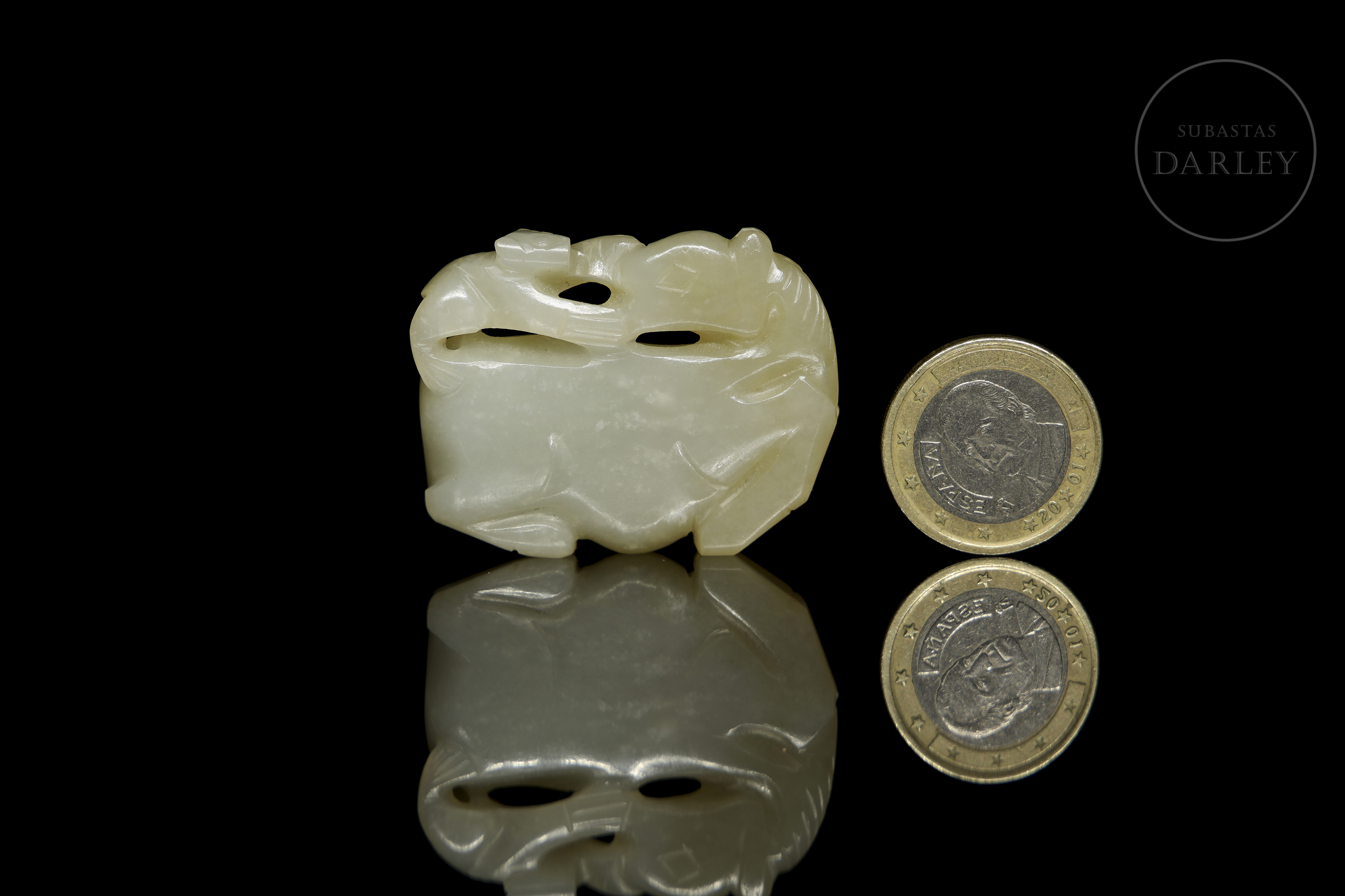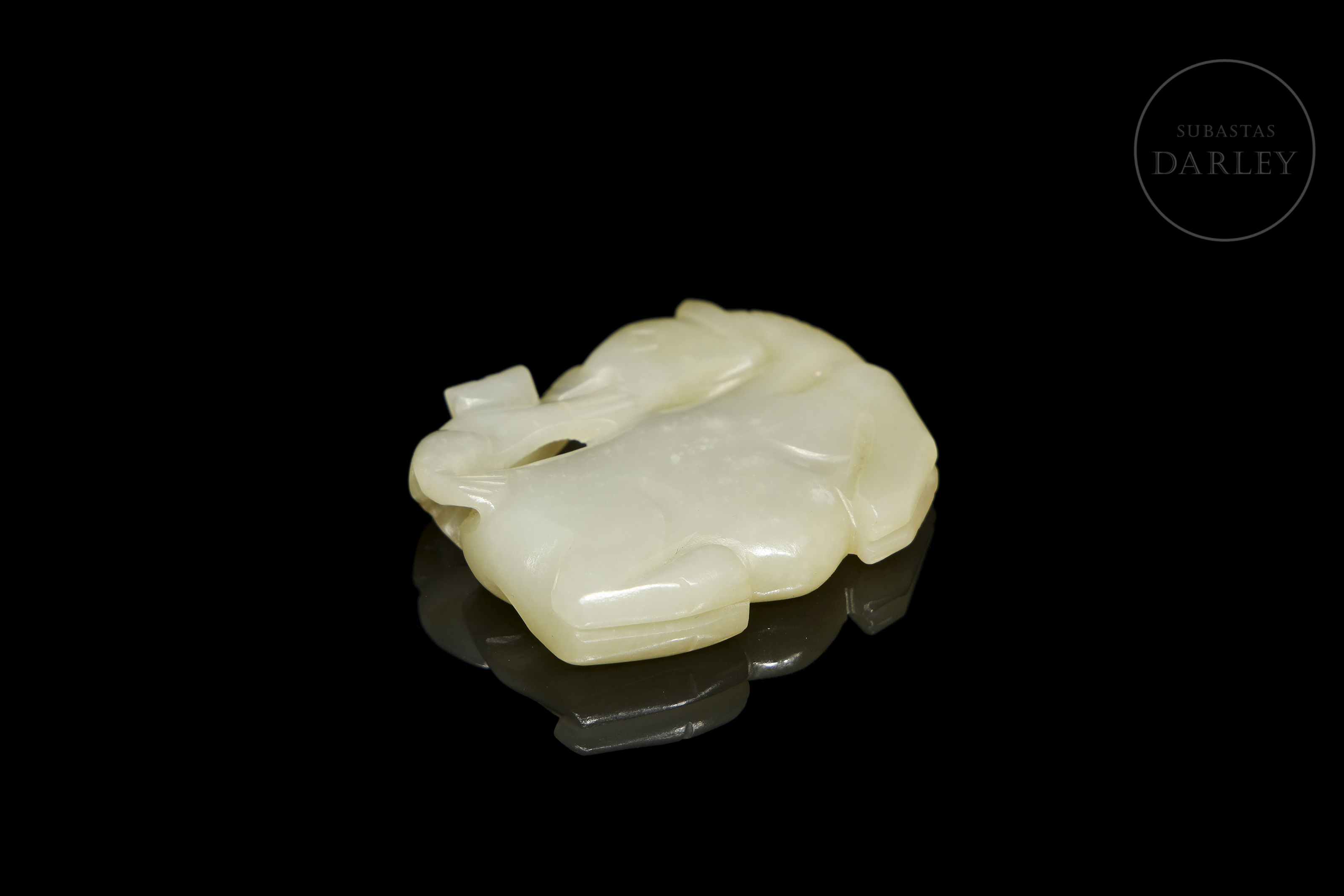 Jade blanco con sutiles áreas de tonalidad ocre. La pieza presenta un formato de placa calada y plana con la representación de un caballo recostado que vuelve la cabeza hacia su lomo, donde se dispone un pequeño mono en actitud dinámica. Dinastía Qing (1644–1912).