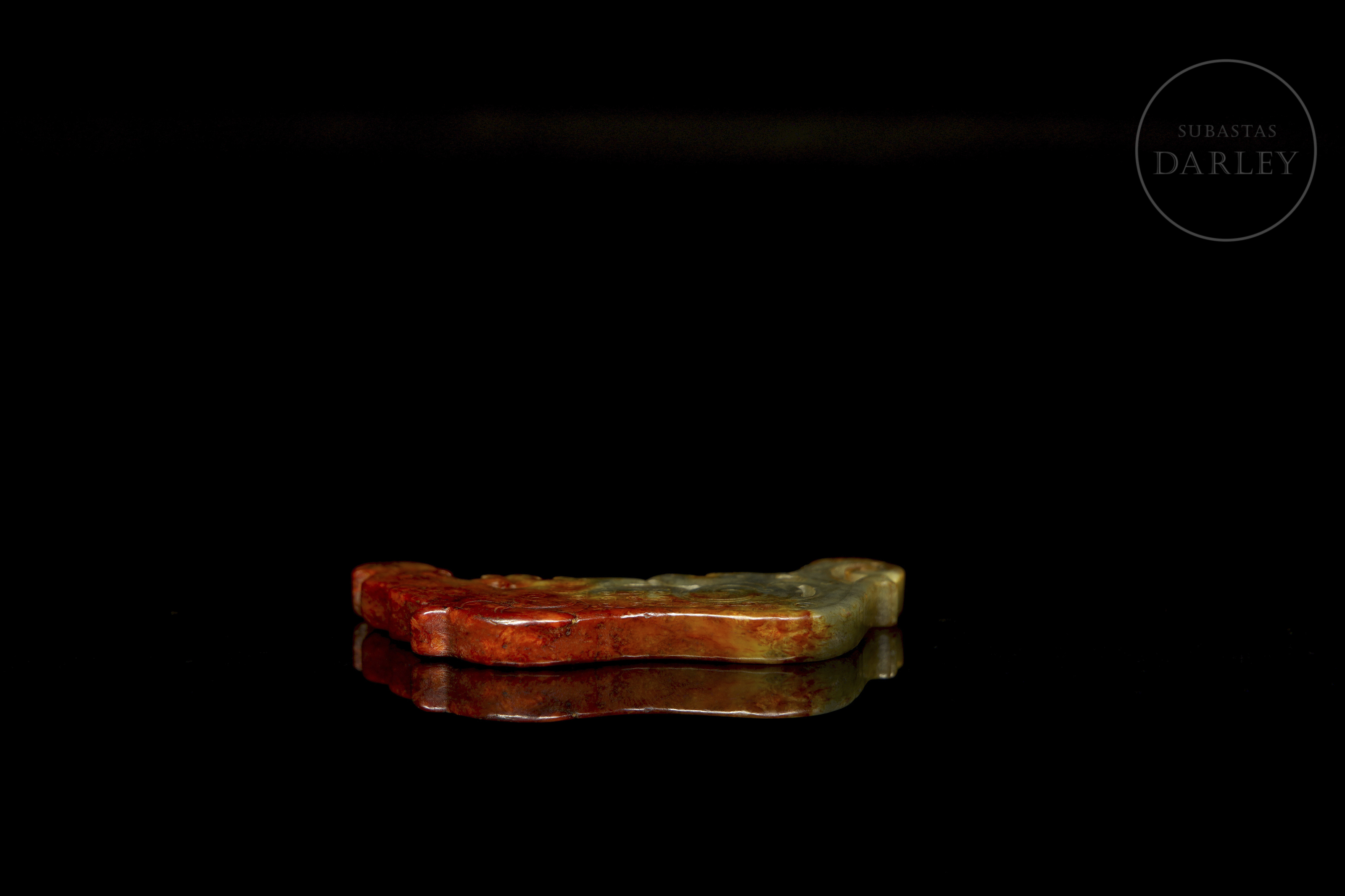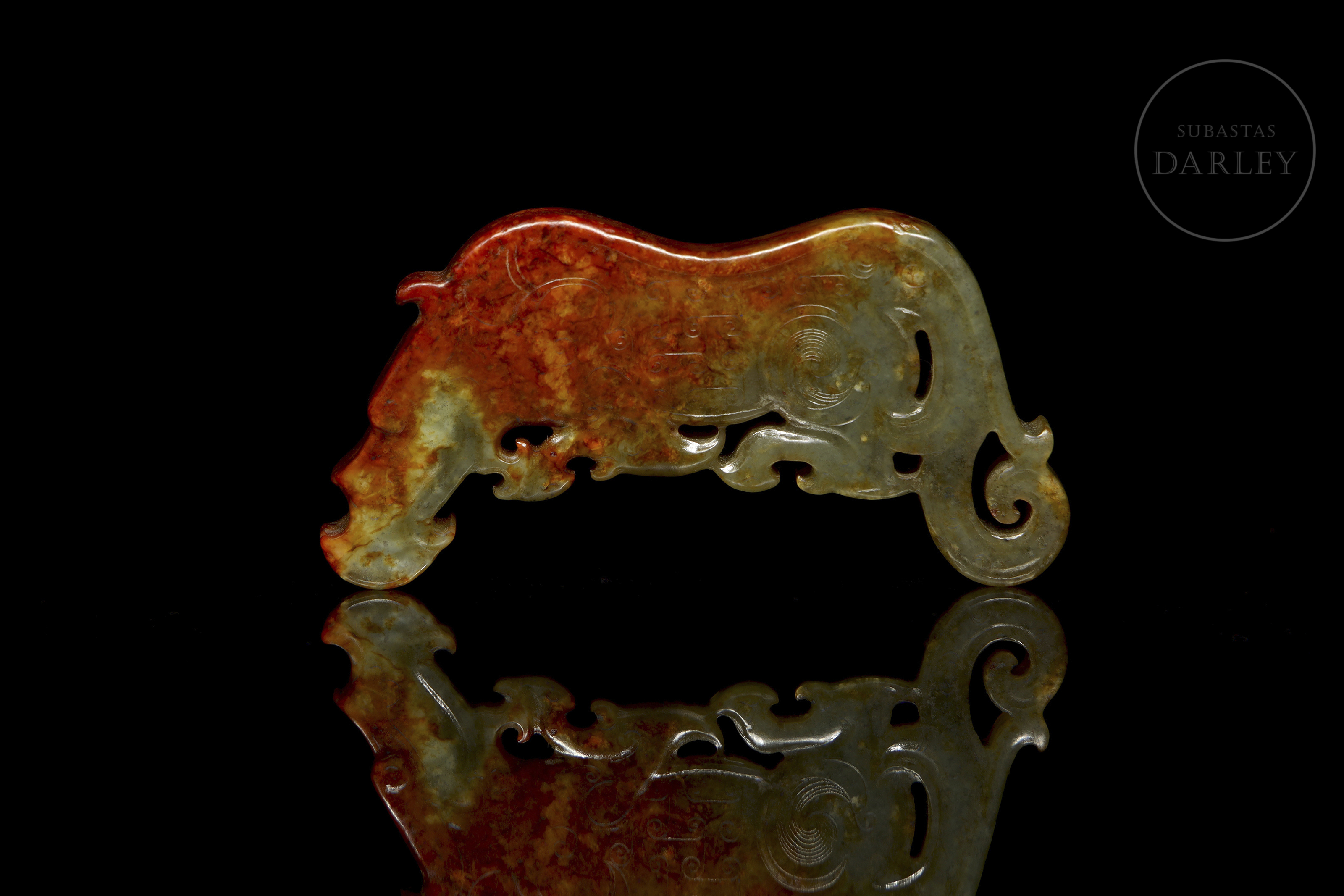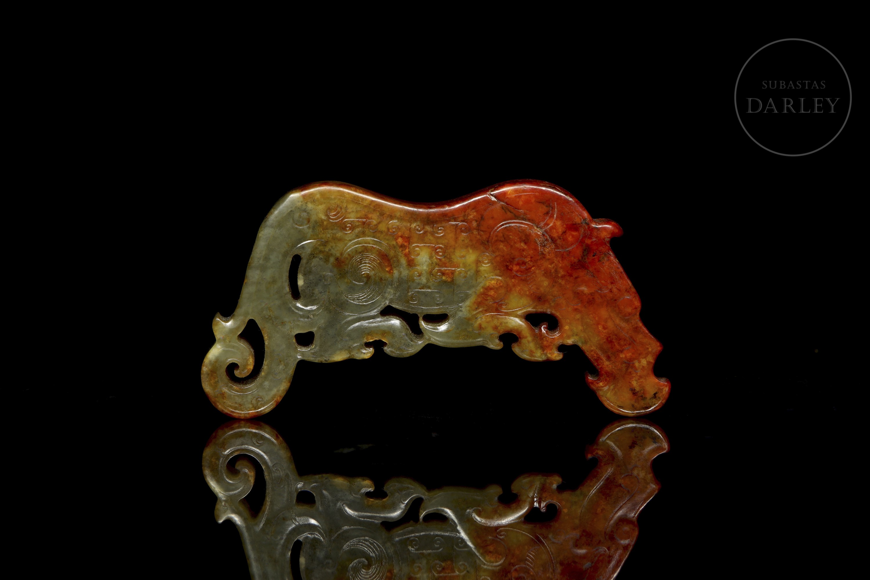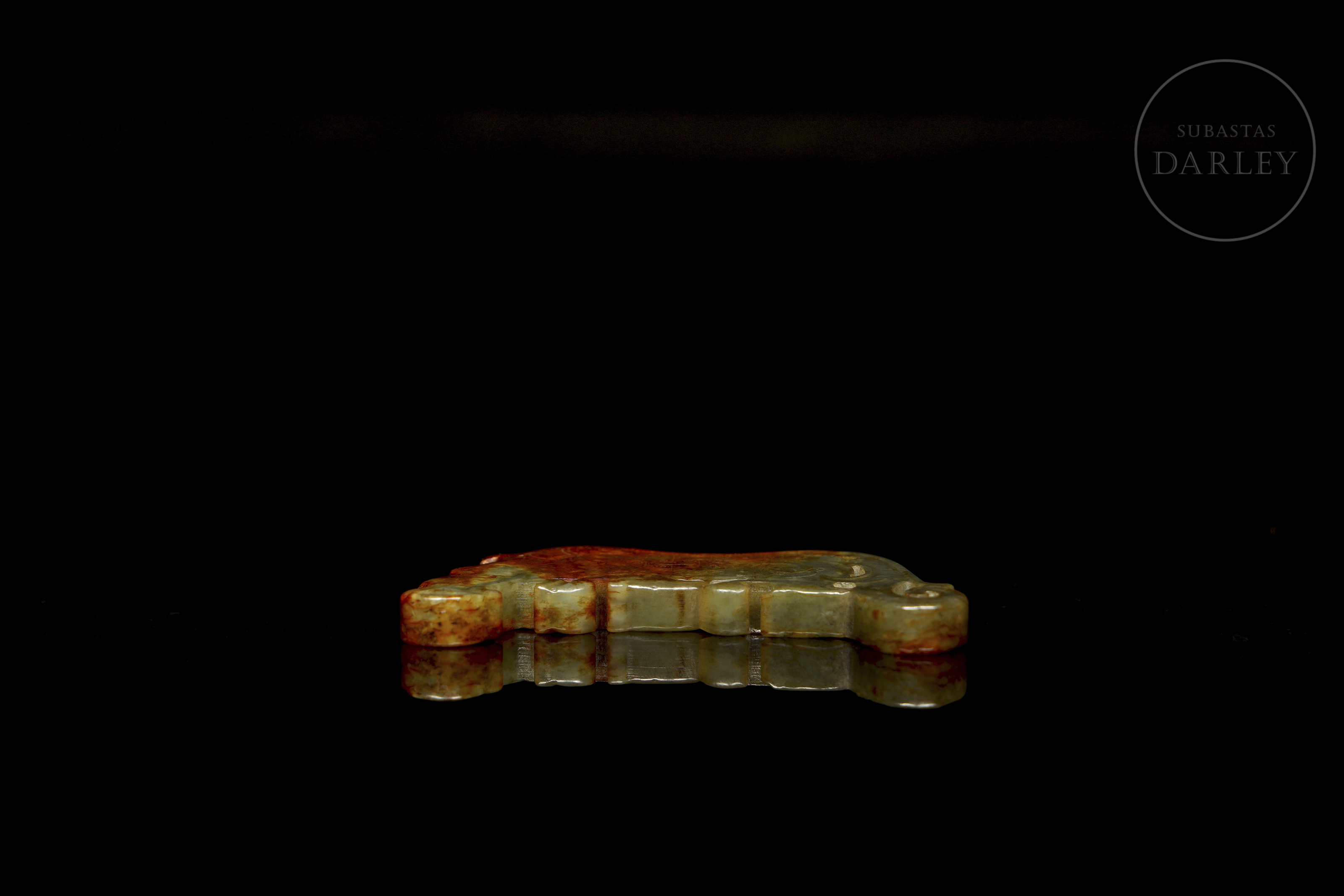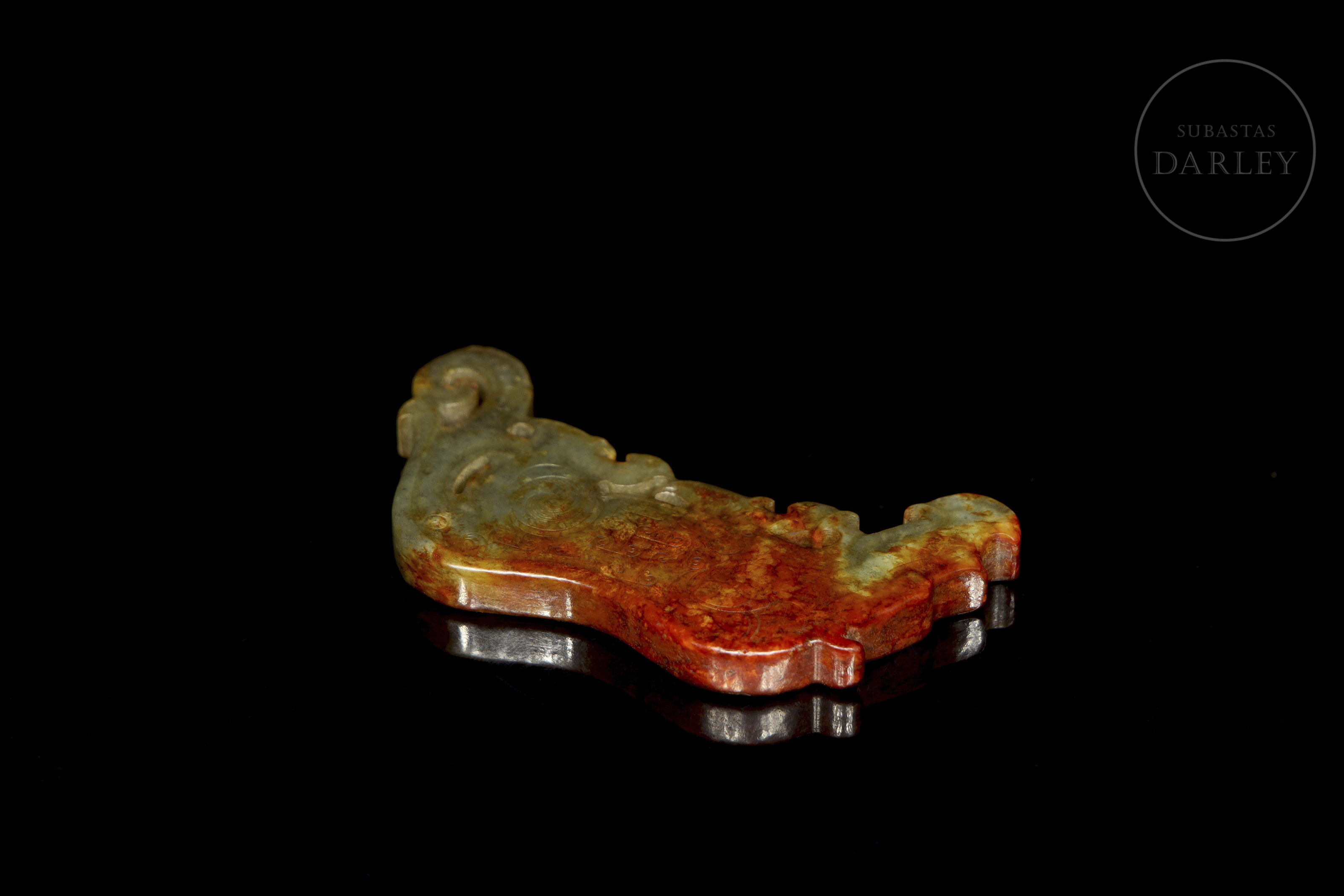 Pieza ornamental de jade tallada en un formato plano que representa un dragón arcaico. La superficie está adornada con relieves de volutas y finas líneas incisas que conforman un dragón arcaico. La piedra exhibe un tono verde, con áreas de alteración en color marrón óxido.