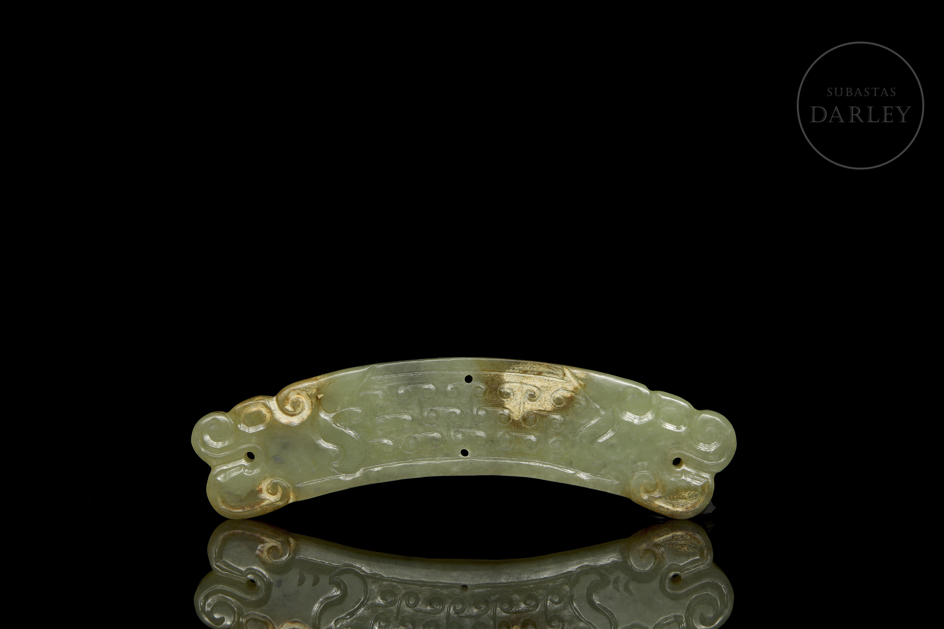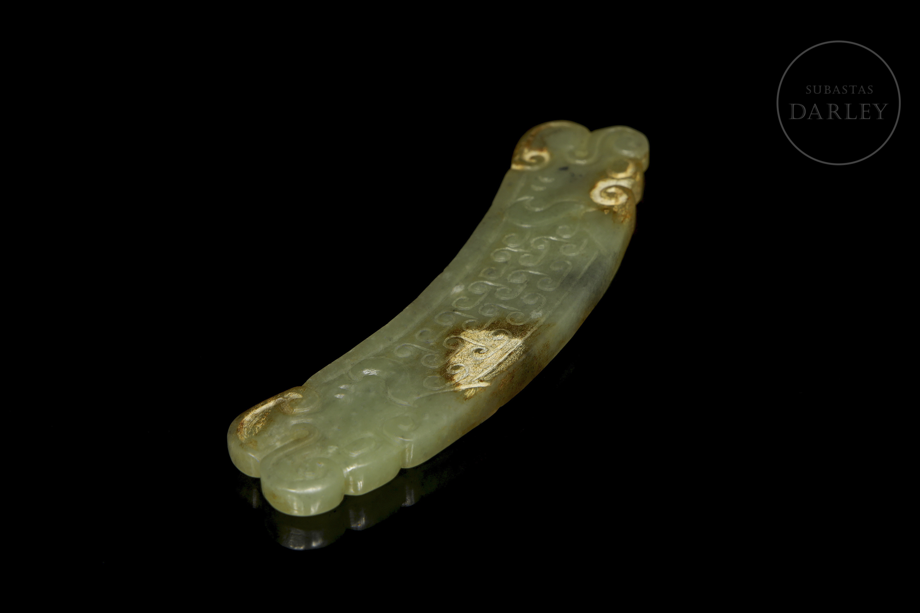 Placa de jade de perfil plano y delgado que conforma un cuerpo arqueado. La superficie está decorada con motivos de espirales y dragones arcaicos. El jade es de tono verde pálido con amplias zonas de calcificación blanquecina.