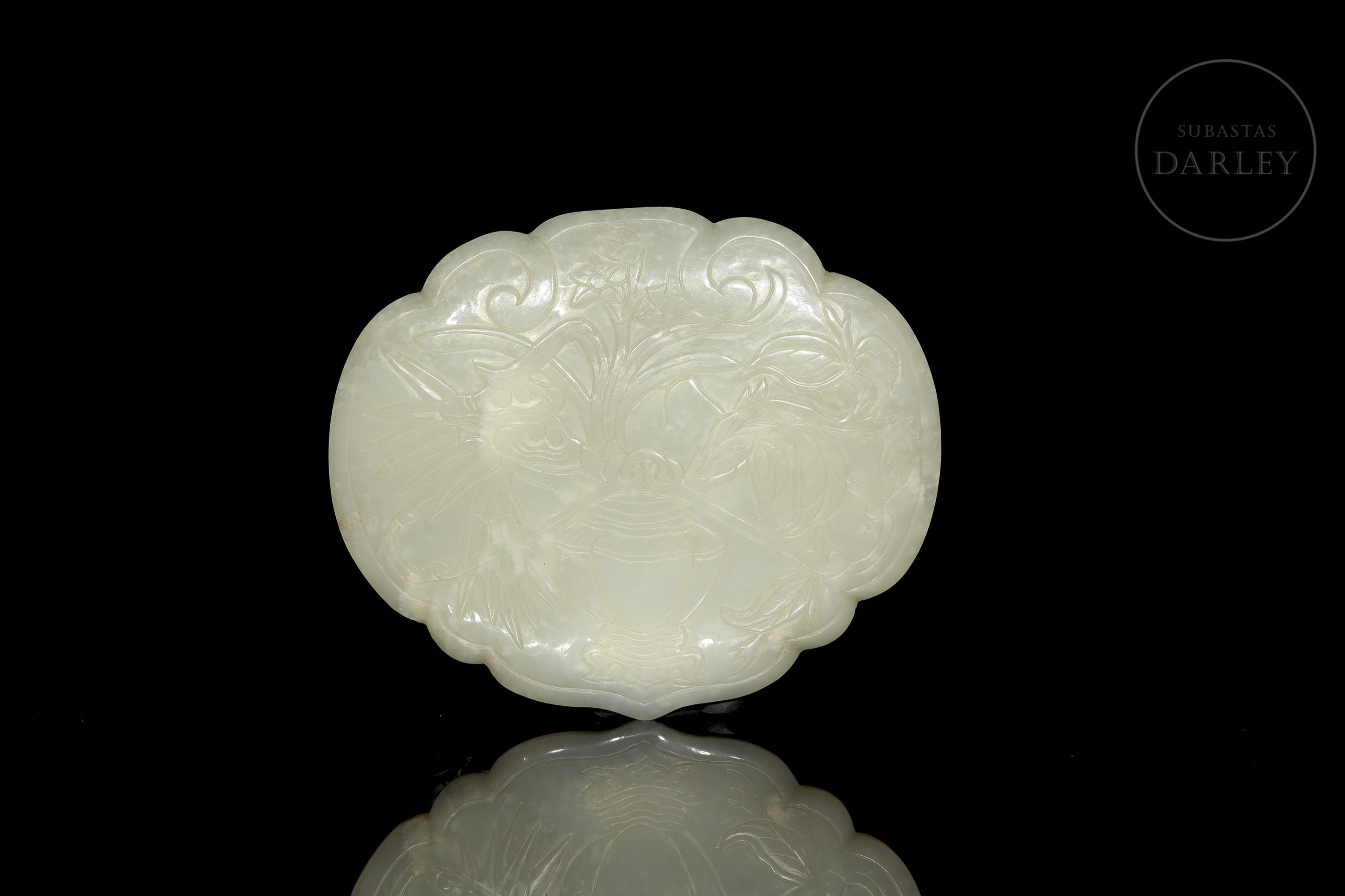 Placa de jade de forma oblonga y plana, con el contorno lobulado en forma de una flor. El color es un blanco cremoso. La decoración muestra un jarrón central con grandes lotos, ramas y lingzhis, todo ello realizado mediante incisión. Dinastía Qing (1644–1912).