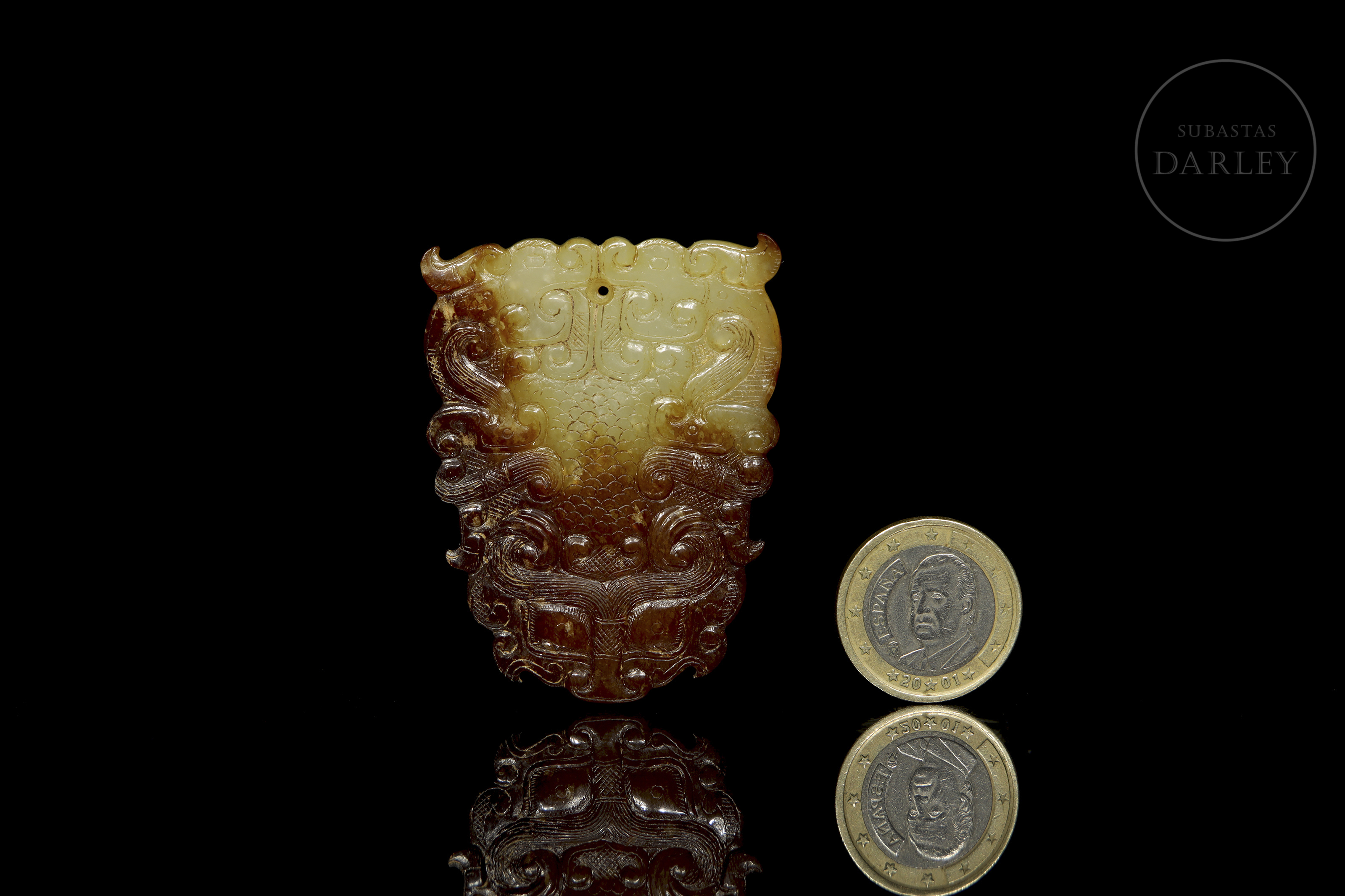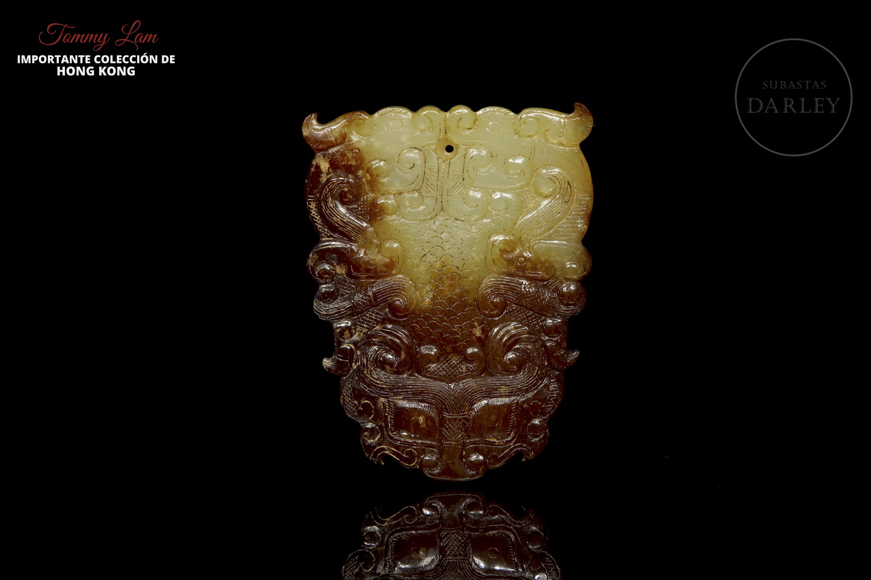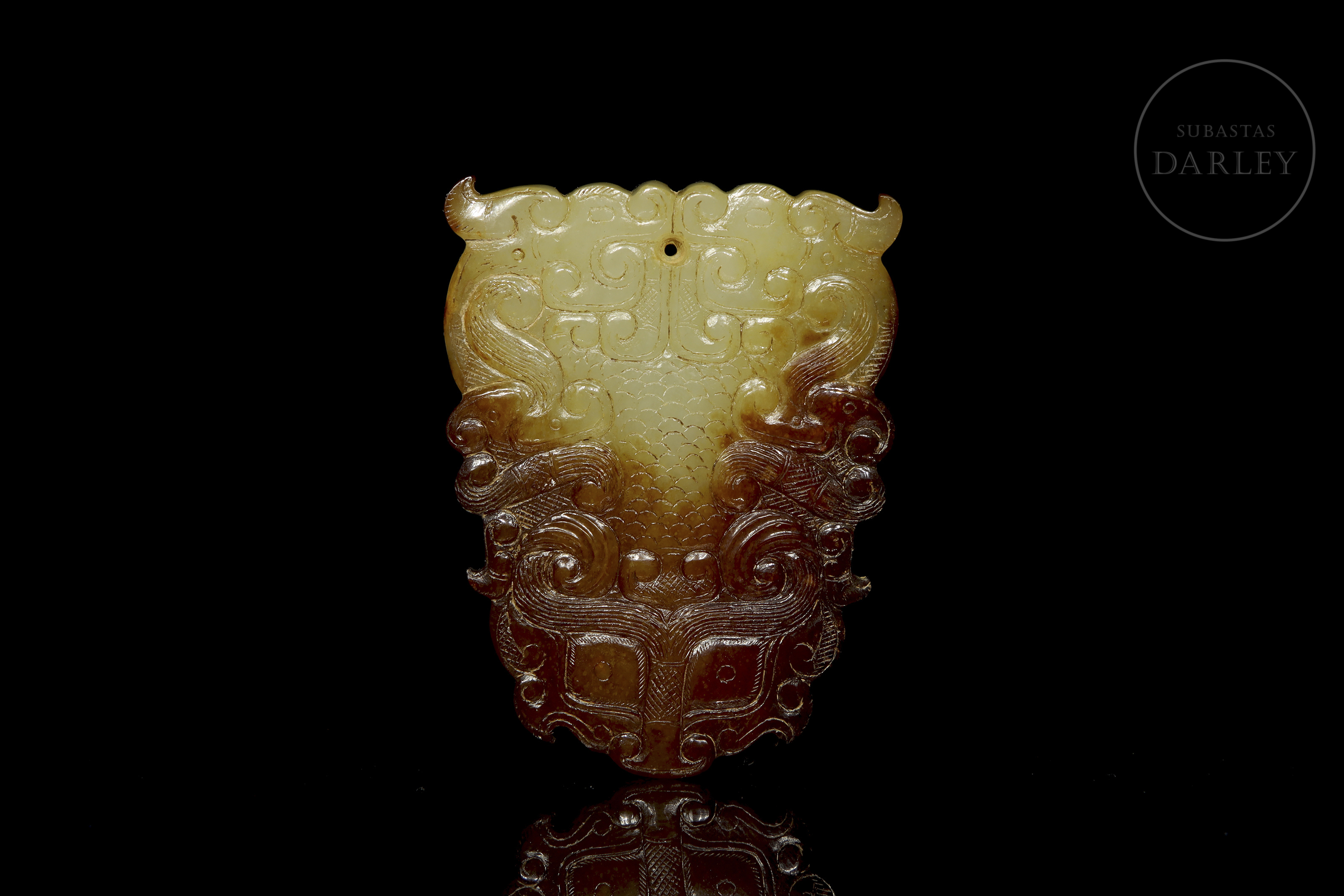 Placa ornamental tallada en jade, de silueta sinuosa que forma una máscara taotie (饕餮) estilizada, característica del arte arcaico tardío. La máscara está tallada en bajo relieve y resuelta con volutas y líneas fluidas. El jade es de un tono amarillo con áreas de alteración o pátina de color café. Periodo Reinos Combatientes (475-221 a.C.).