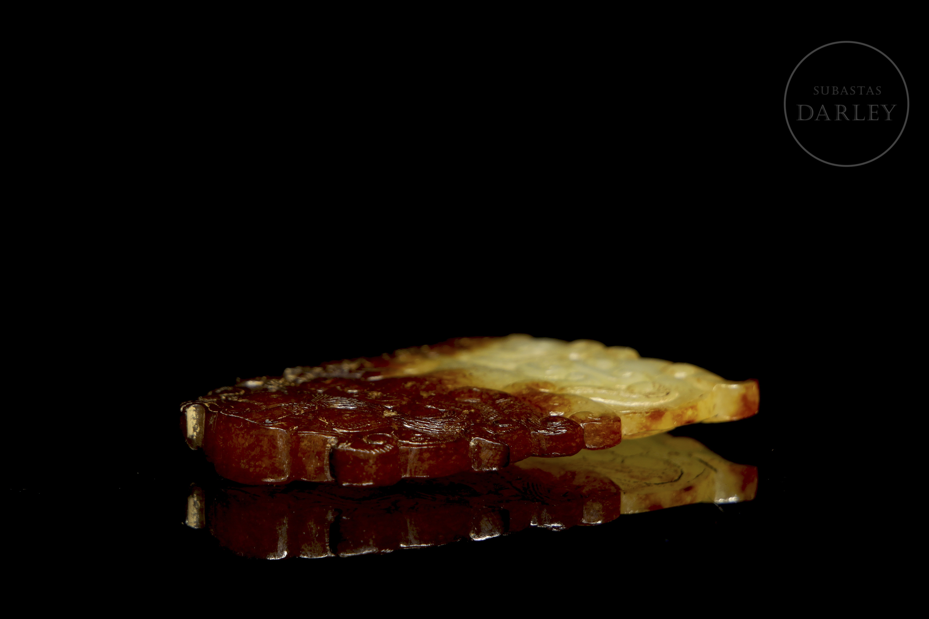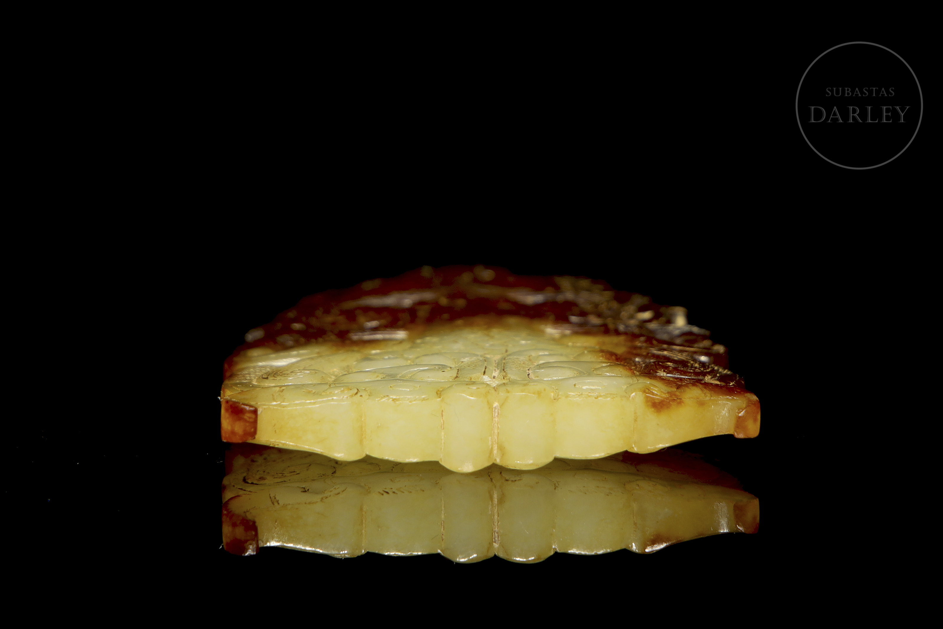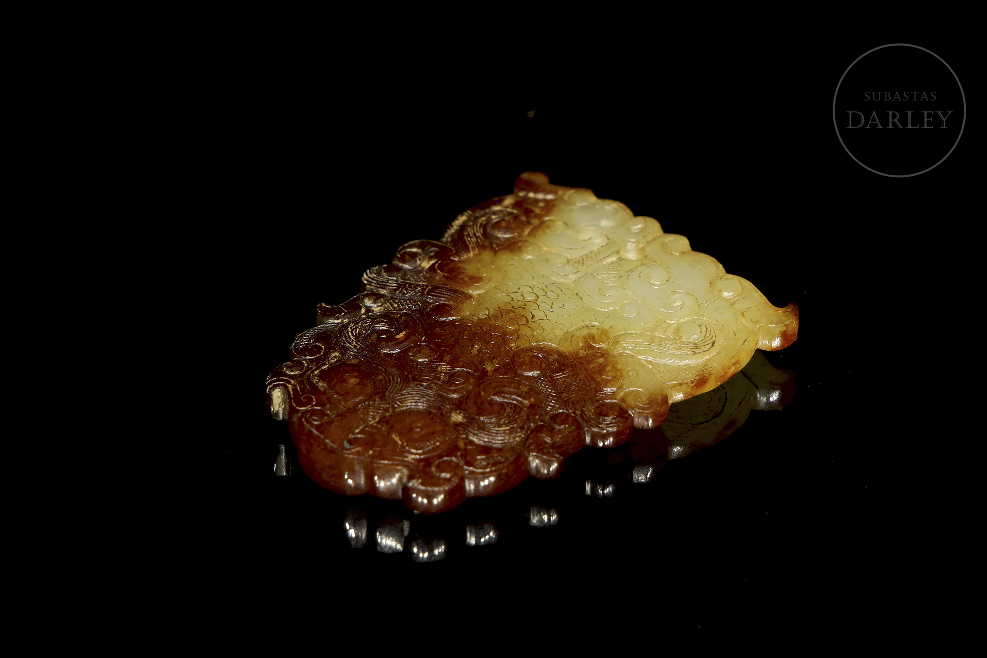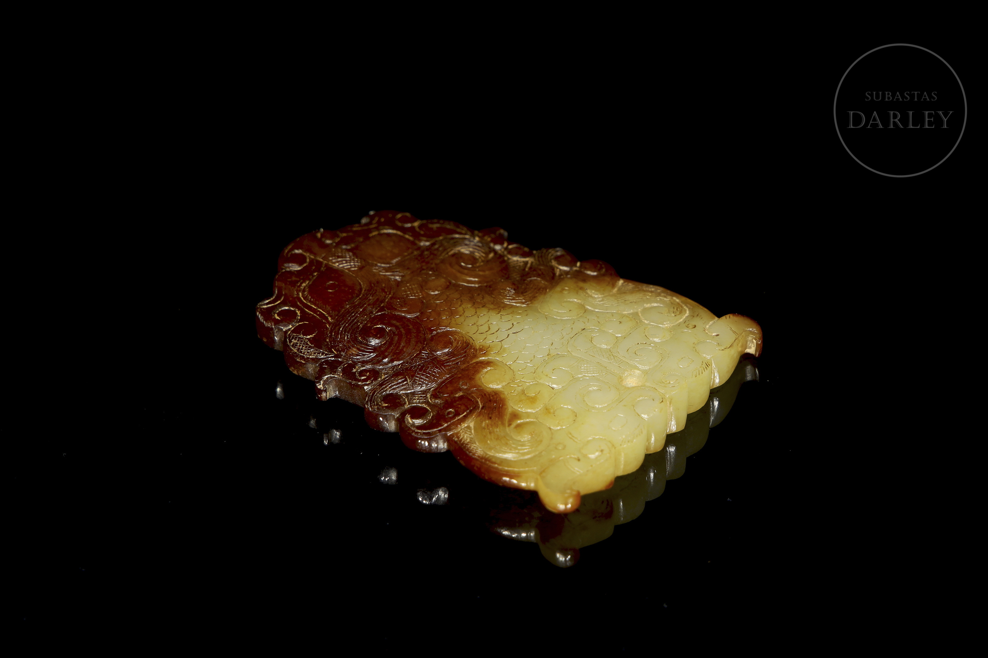 Placa ornamental tallada en jade, de silueta sinuosa que forma una máscara taotie (饕餮) estilizada, característica del arte arcaico tardío. La máscara está tallada en bajo relieve y resuelta con volutas y líneas fluidas. El jade es de un tono amarillo con áreas de alteración o pátina de color café. Periodo Reinos Combatientes (475-221 a.C.).